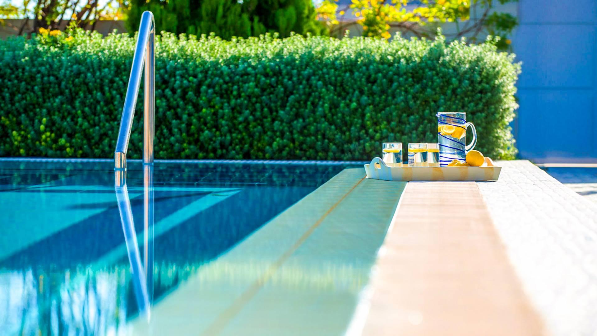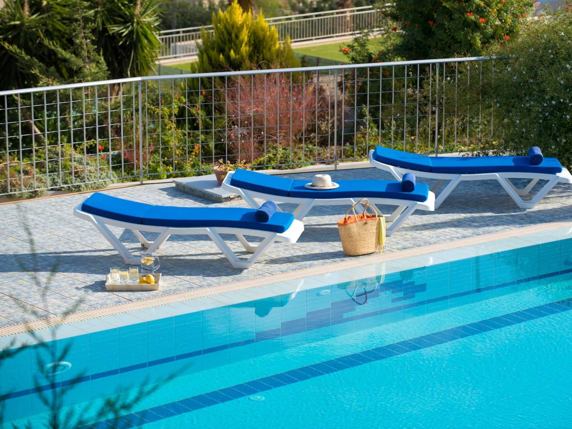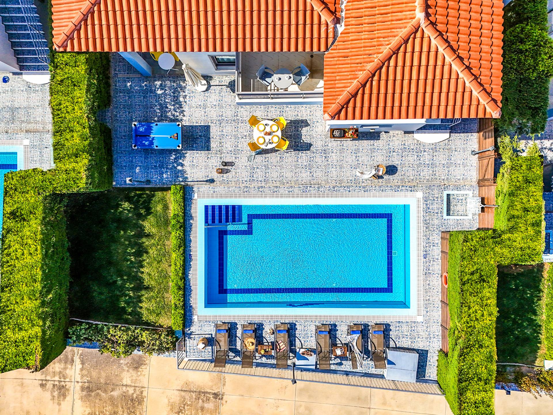 - Spacious terrace, sun loungers, and shaded seating area