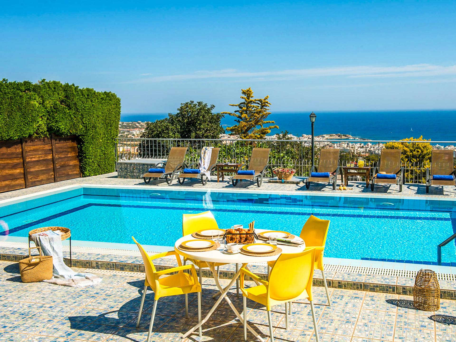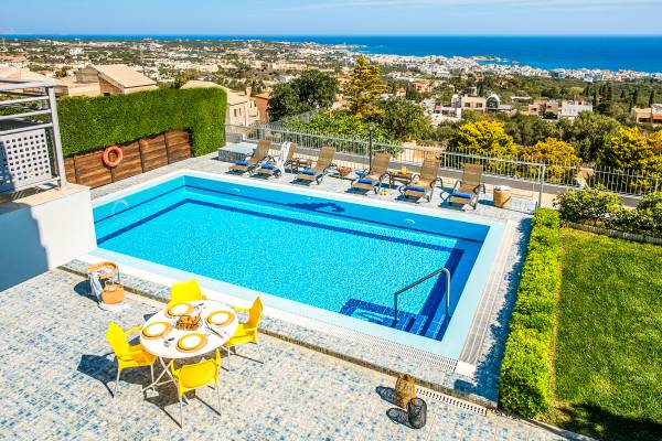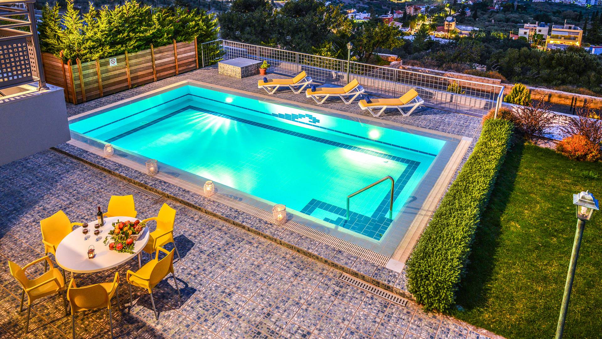 Gelbe Villa bei Elio Villas Hersonissos – Erleben Sie den ultimativen Sommerurlaub in dieser Villa auf einem Hügel in Hersonissos, wo atemberaubende Ausblicke auf die Ägäis auf mühelosen Stil treffen. Perfekt für Familien und Gruppen, nur wenige Minuten vom lebhaften Hersonissos und Kretas berühmtesten Stränden und Attraktionen entfernt.