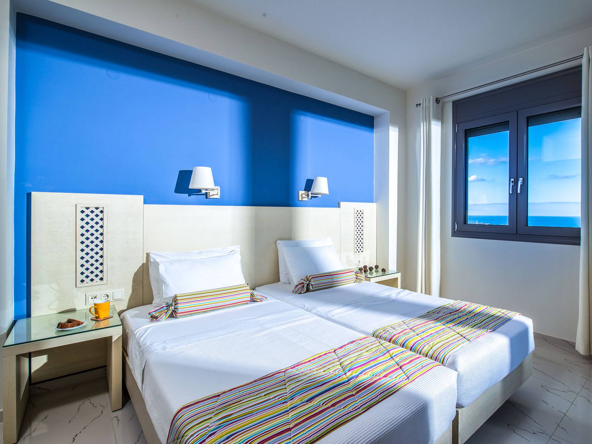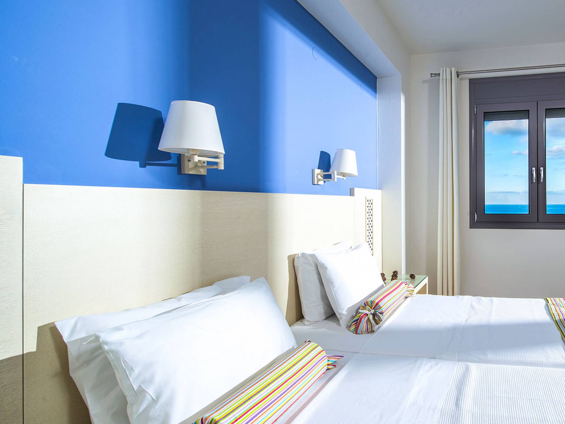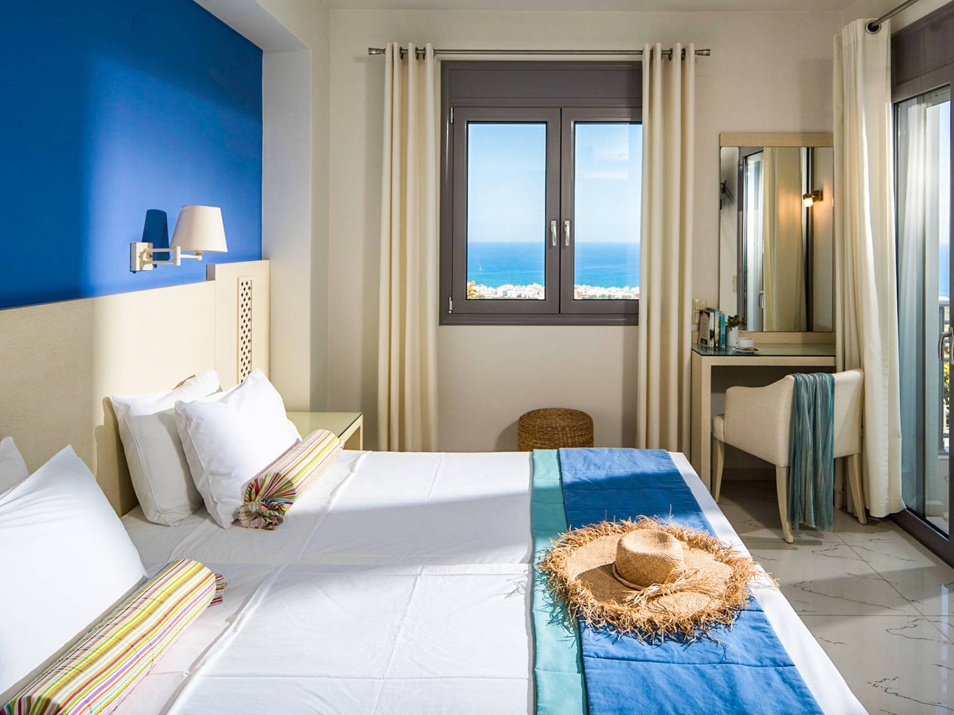 - Bedroom 2 with two single beds (or king) and private balcony with sea view
