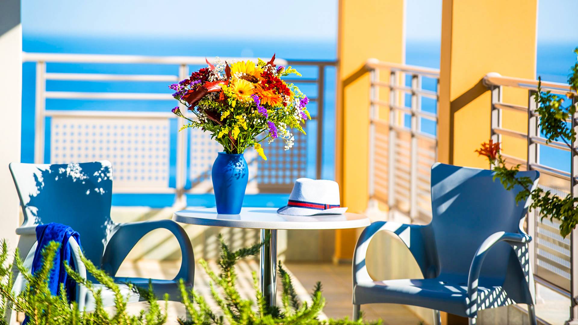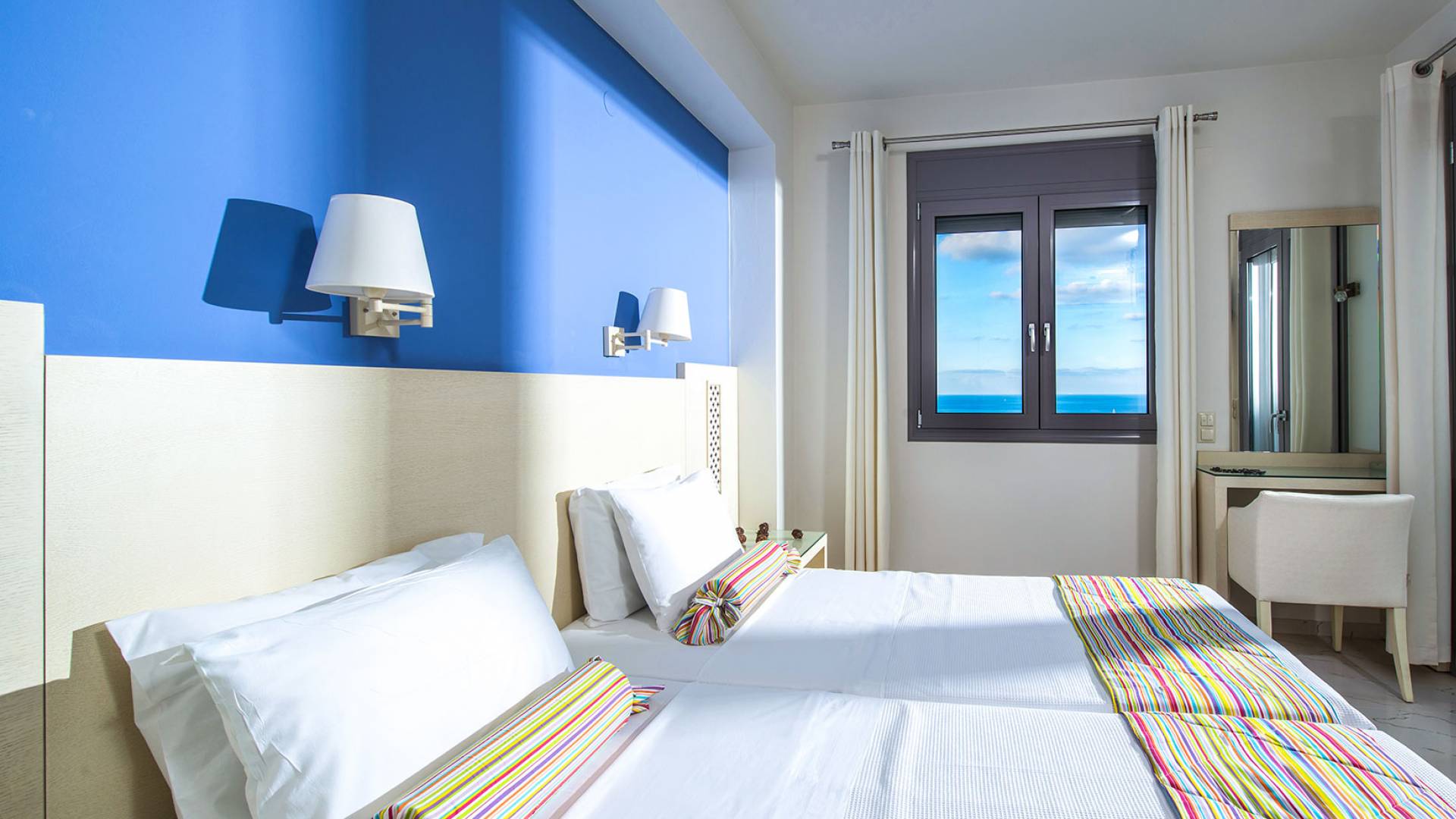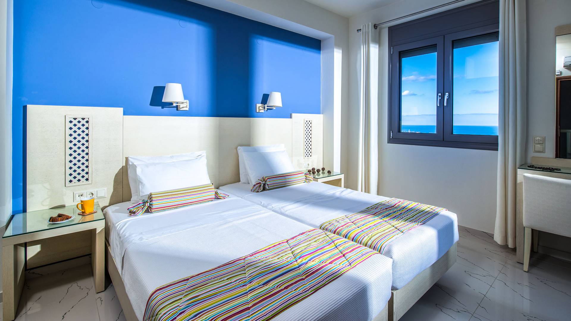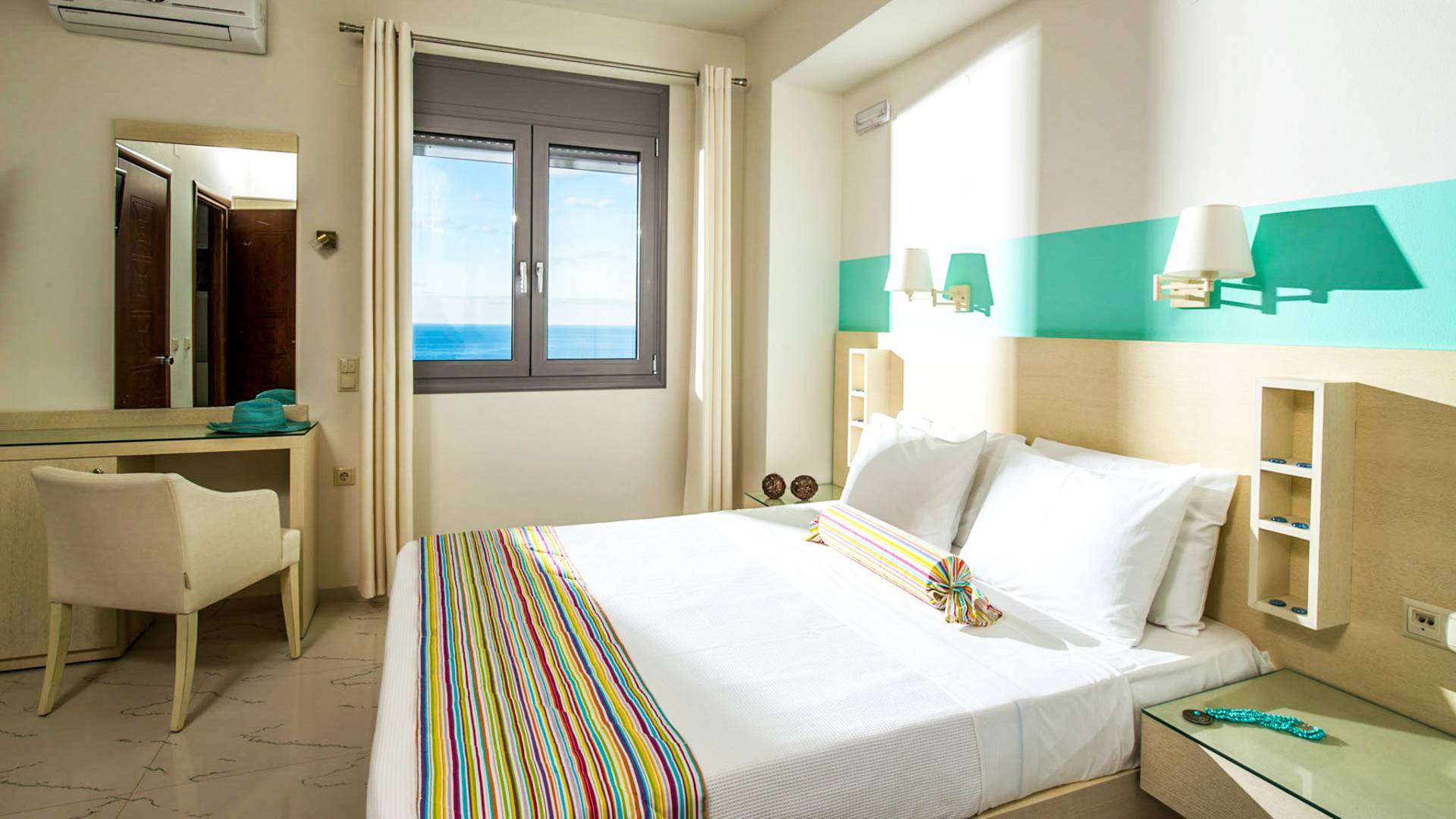 - Bedroom 2 with two single beds (or king) and private balcony with sea view