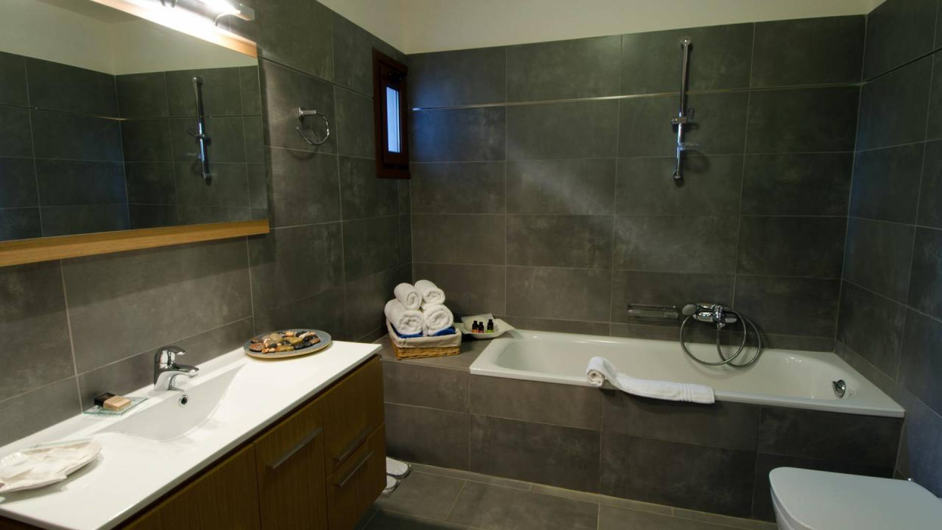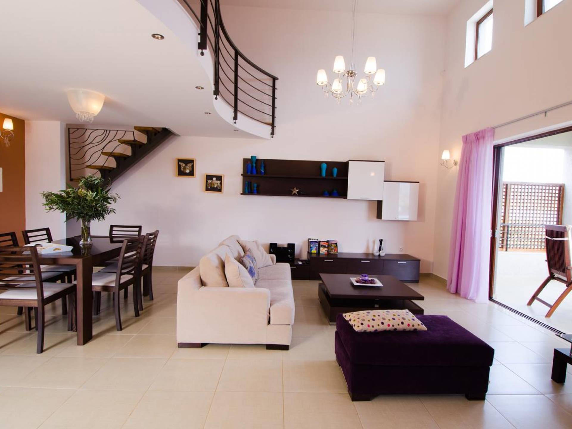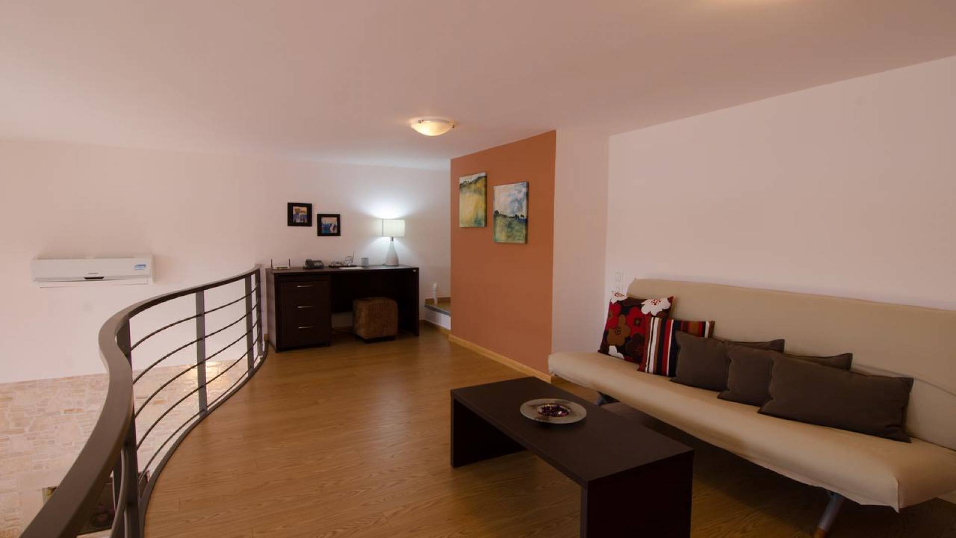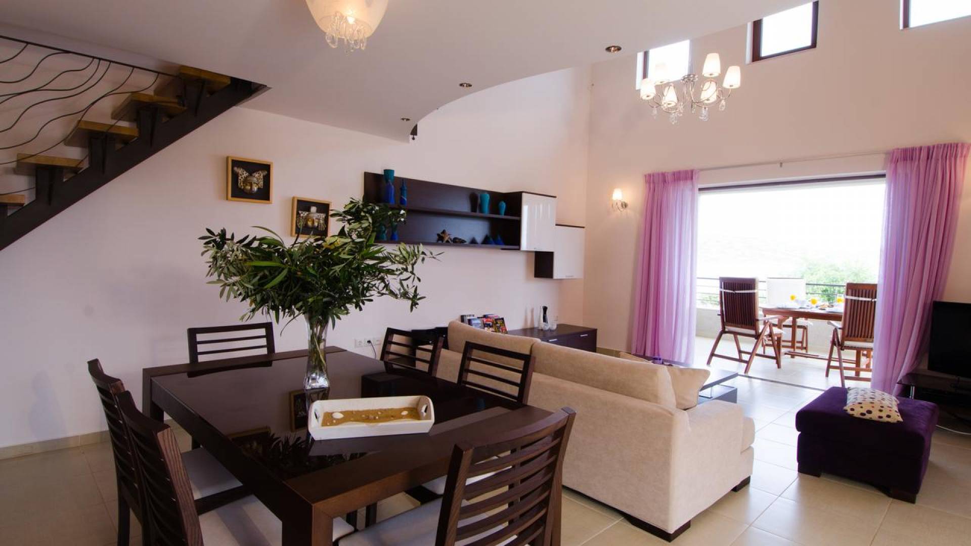 Im ersten Stock gibt es ein Schlafzimmer mit Doppelbett, Kleiderschrank, autonomer Klimaanlage, ebenerdigem Fernseher, Balkon mit Meerblick, luxuriöses Badezimmer mit Hydromassage, komplett ausgestattete Küche mit Elektrogeräten, Wohnzimmer mit bequemer Couch und Sessel, Sat-TV 37΄, DVD, Echo-System, autonome Klimaanlage, Wireless-Netzwerk für den Internetzugang, Veranda mit Außen-Esszimmer mit Meerblick. Die interne Skala des Wohnzimmers führt zu einem schönen Loft mit einer bequemen Couch, die zu einem Bett für eine weitere Person werden kann, und einem Esszimmer mit Kamin. Der erste Stock ist durch eine interne Marmortreppe mit dem zweiten Stock verbunden.