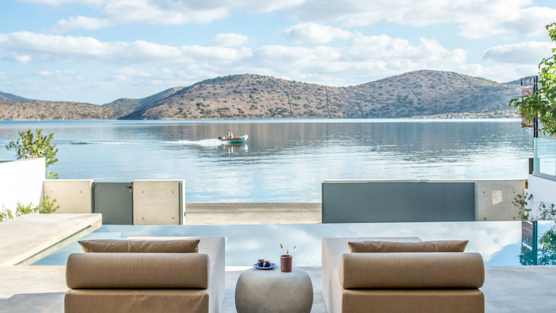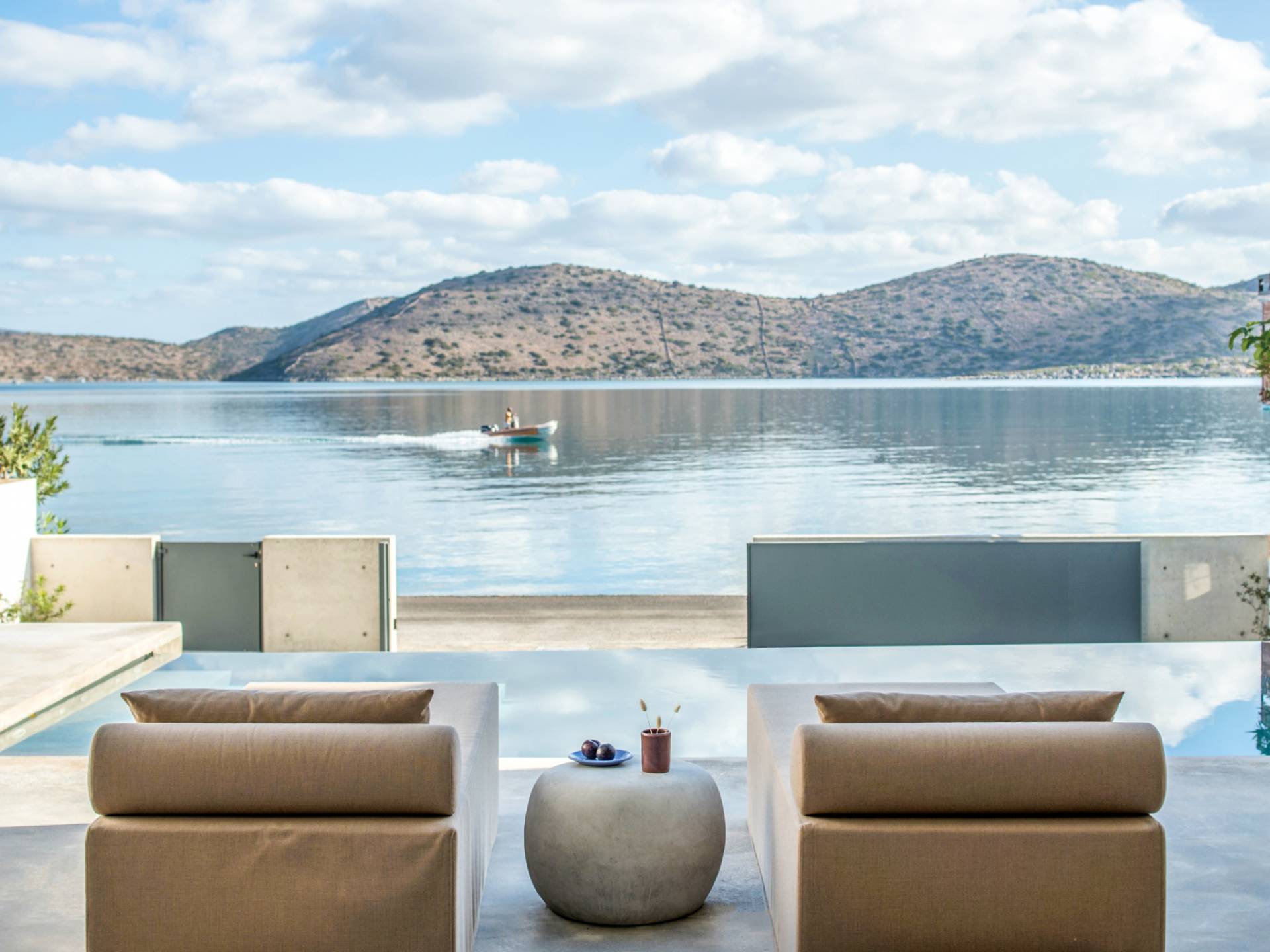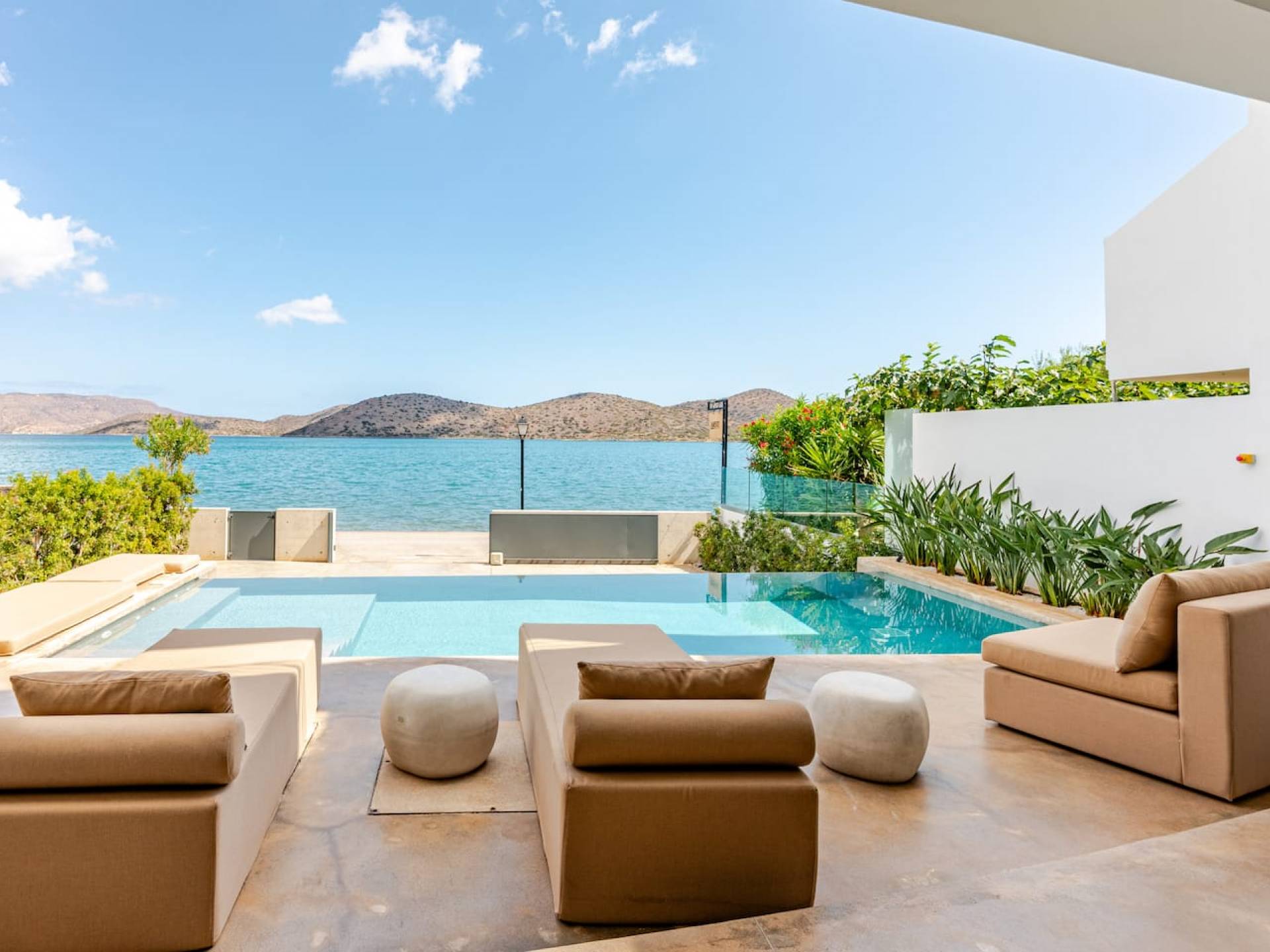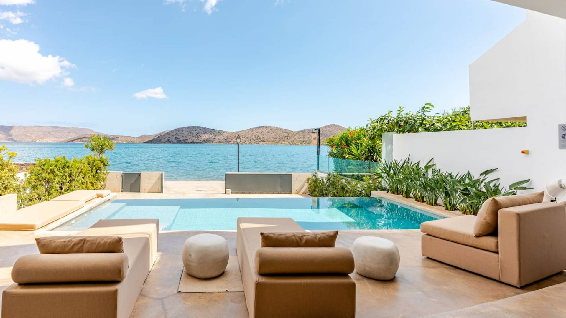 Die natürliche Schönheit der Umgebung ist beeindruckend – umgeben von sanften Hügeln und Olivenhainen bietet Elounda atemberaubende Ausblicke auf die Mirabello-Bucht, besonders stimmungsvoll bei Sonnenaufgang oder Sonnenuntergang – am besten zu genießen von der Terrasse Ihrer Villa.