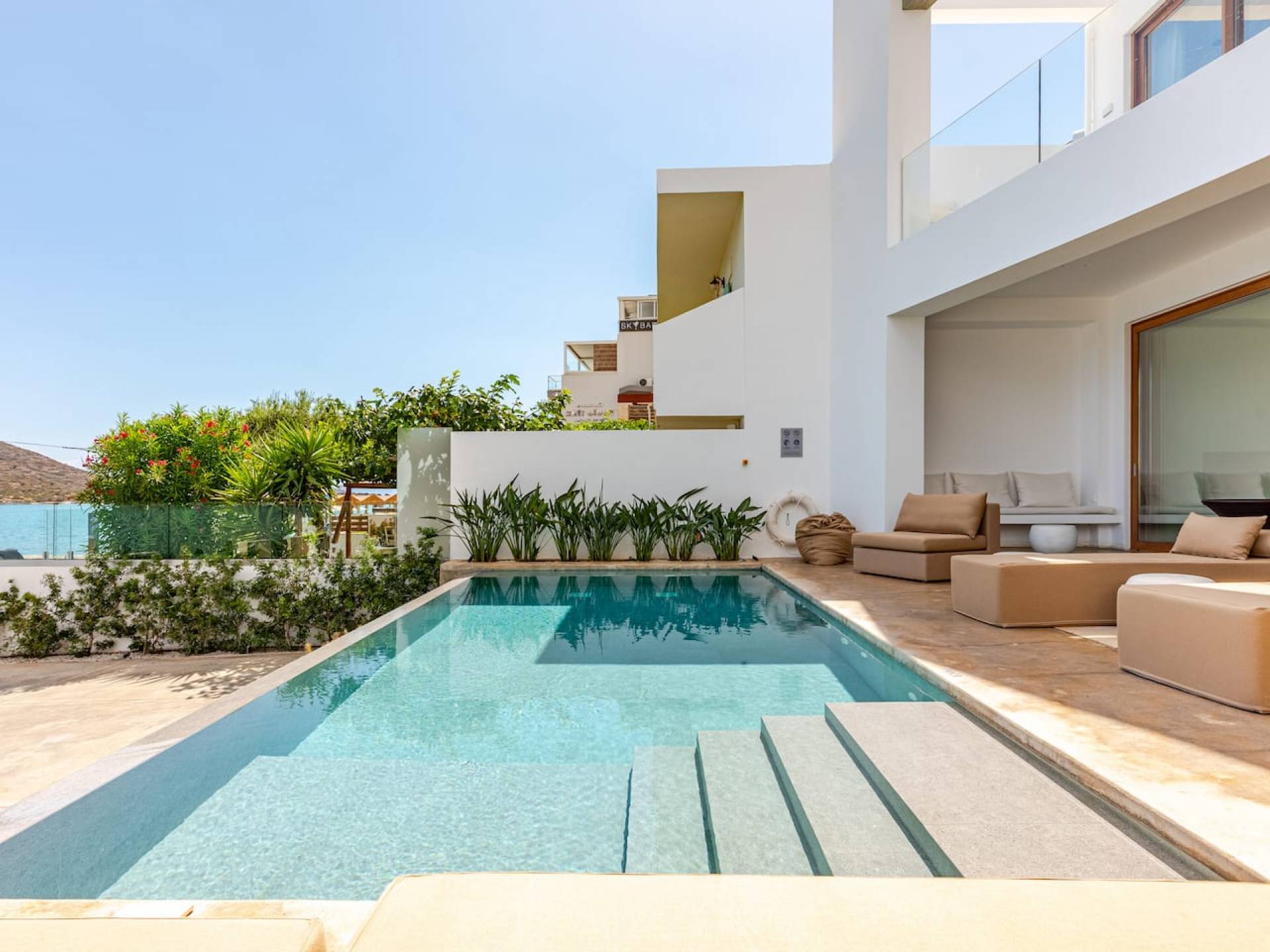 Die Mimaze Villa ist in ihrer Architektur und ihrem Stil ikonisch und steht für luxuriöse Liebe zum Detail und ist bereit, unvergessliche Momente während Ihres Aufenthalts zu genießen. Nur 20 Meter vom Strand und 700 Meter vom Zentrum von Elounda mit seinen Bars, Restaurants und Geschäften entfernt, die Sie genießen können, ist es perfekt für jeden geeignet.