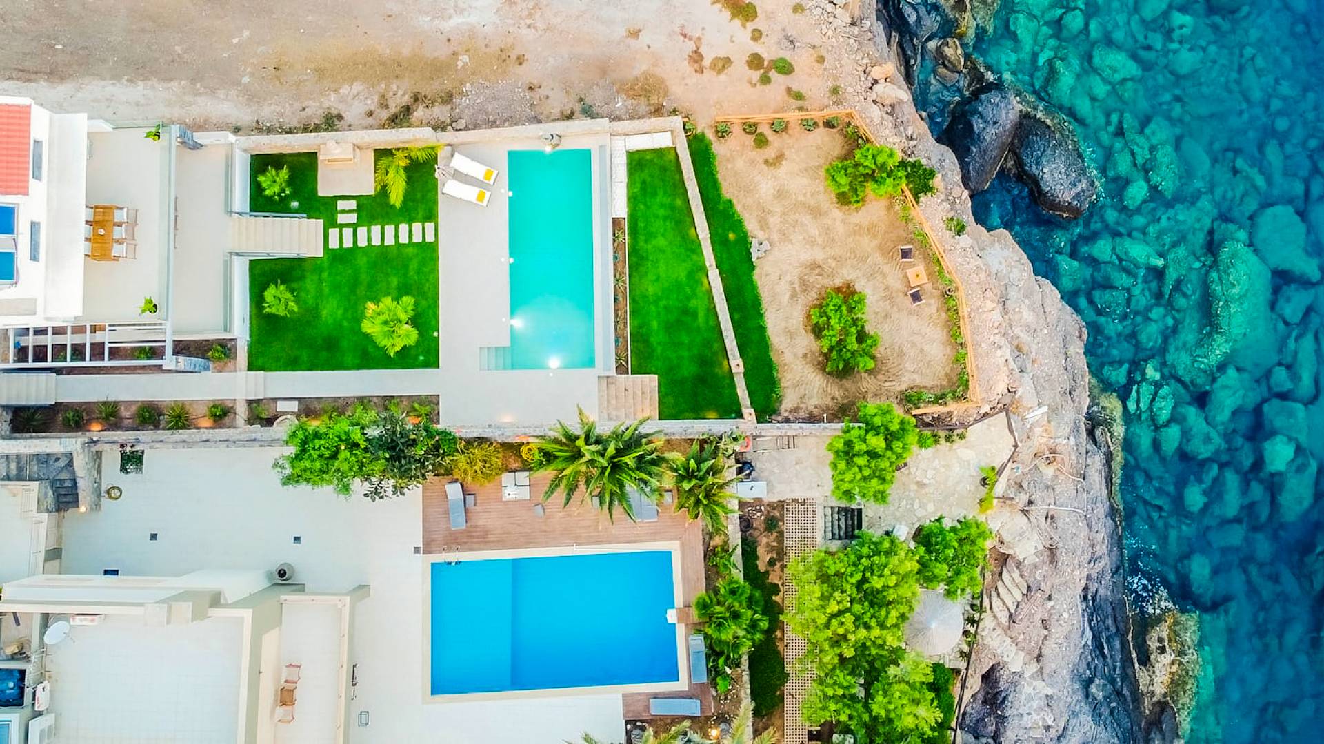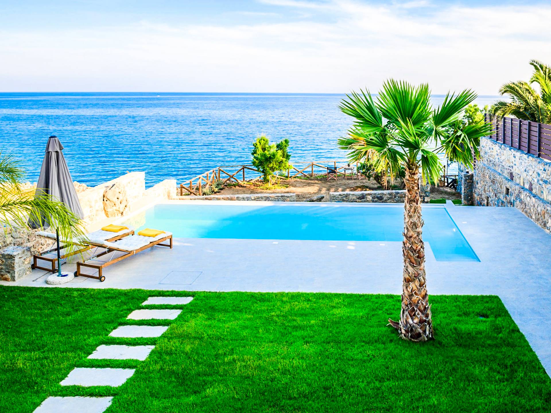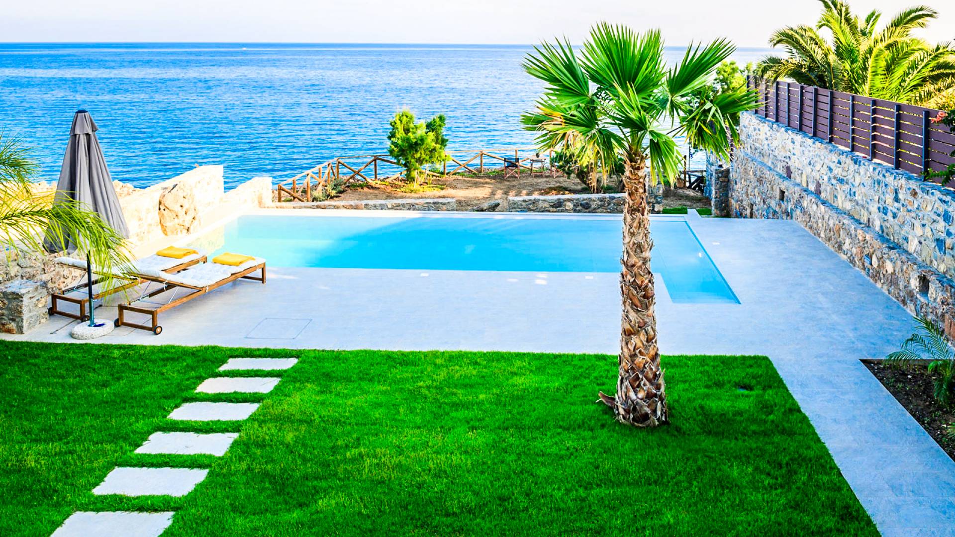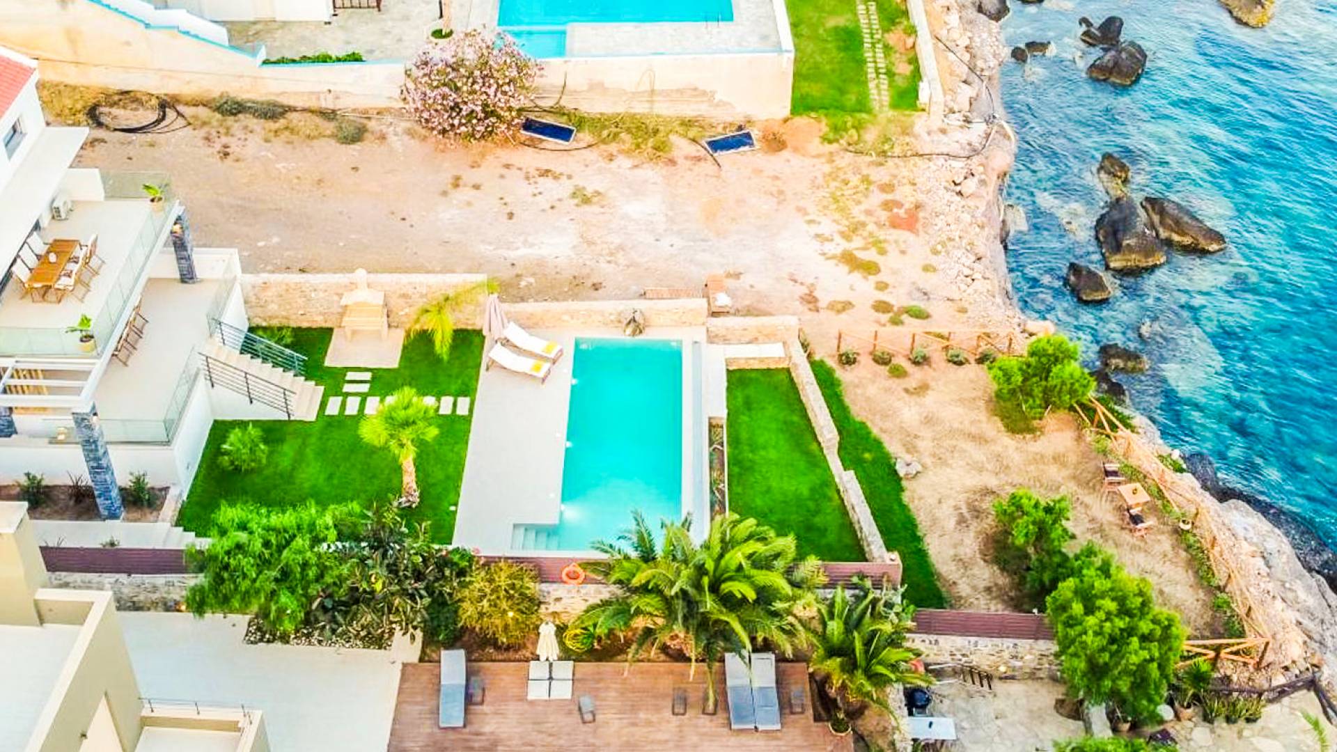 Seafront Villa Seano Crete offers a seafront private pool with salty water, 8 sun loungers, 4 umbrellas and marble tables at the outer space. A fully equipped barbecue is also provided. Internet access is available throughout at the whole area. It’s worth admiring olive trees, banana trees, arecastrum and robellini palm trees planted there. In addition you encounter small cactuses, the unique therapeutic aloe vera plants and feel the wonderful smell of various flowers such as the evening primroses, the carnations and strelitzia augusta known as white bird of heaven. At the end of the courtyard, there is access to two rocky beaches, one on your left and one on your right. There you can enjoy your stay at the unique sea of Crete and dive into the crystal clear waters of our island.