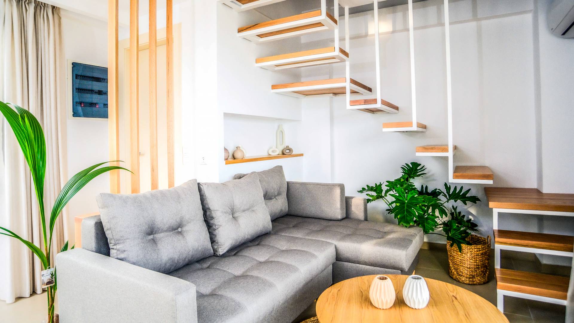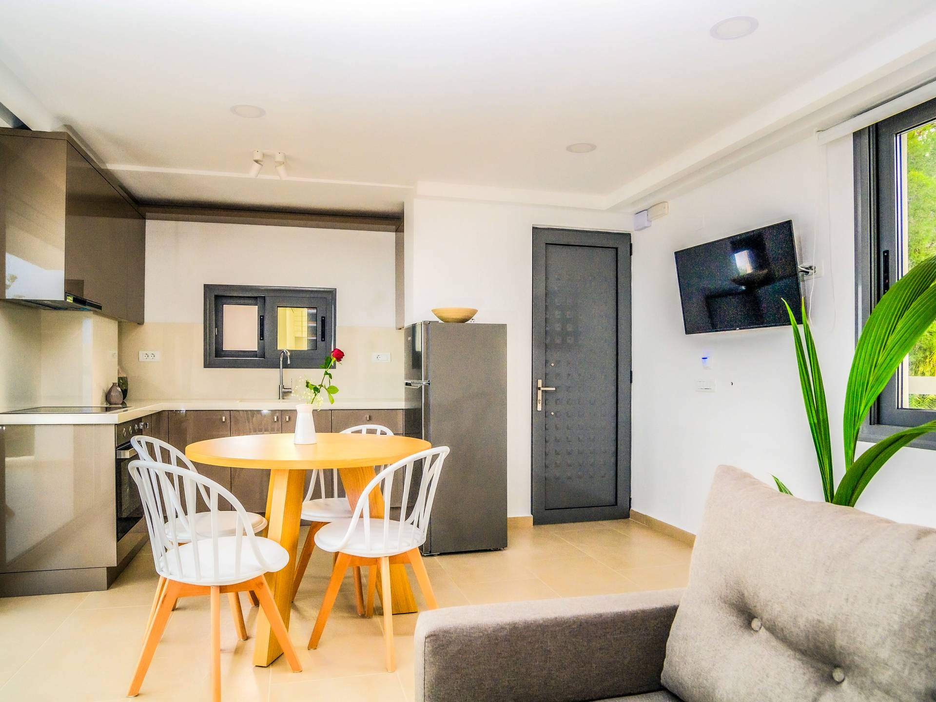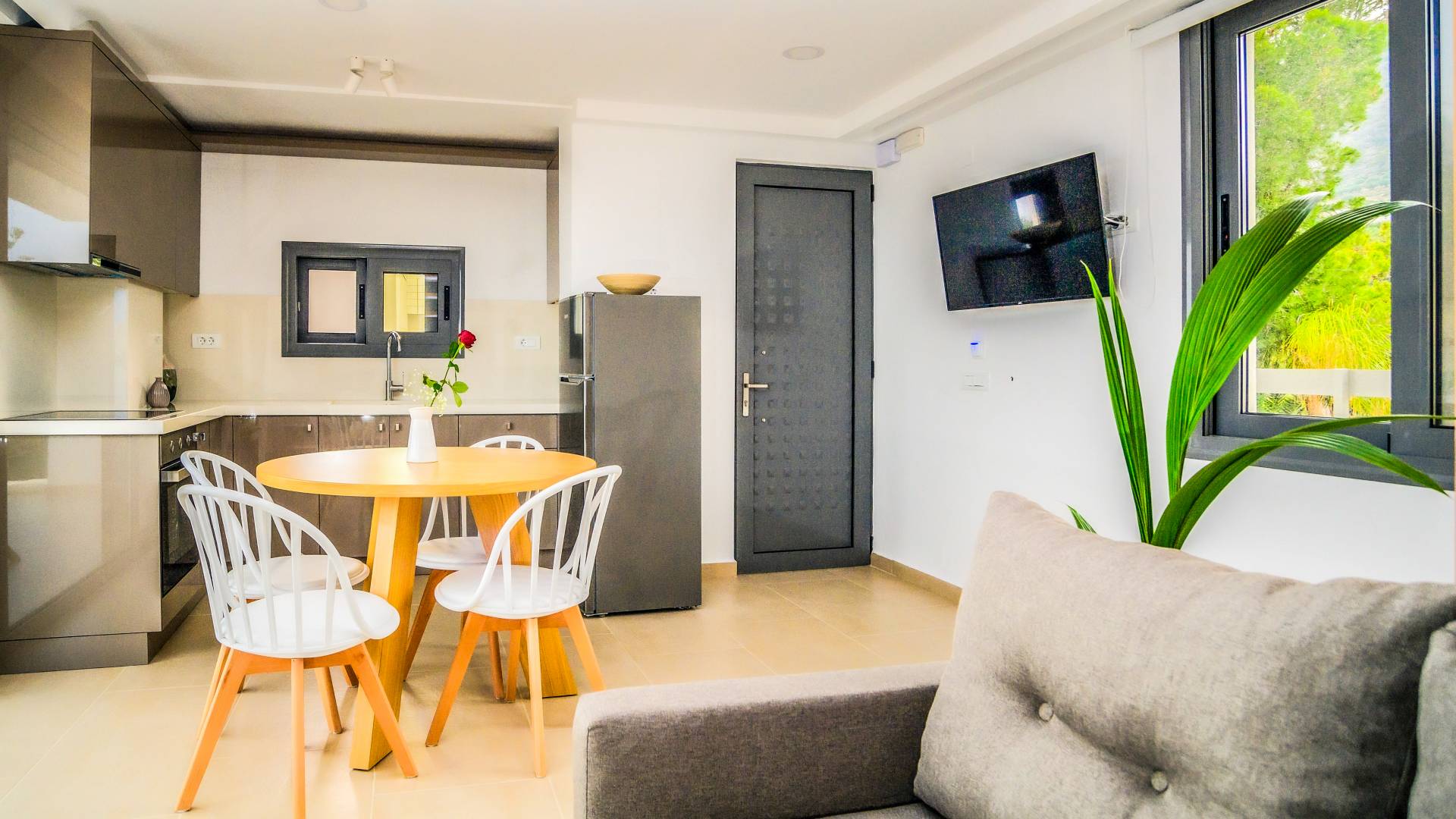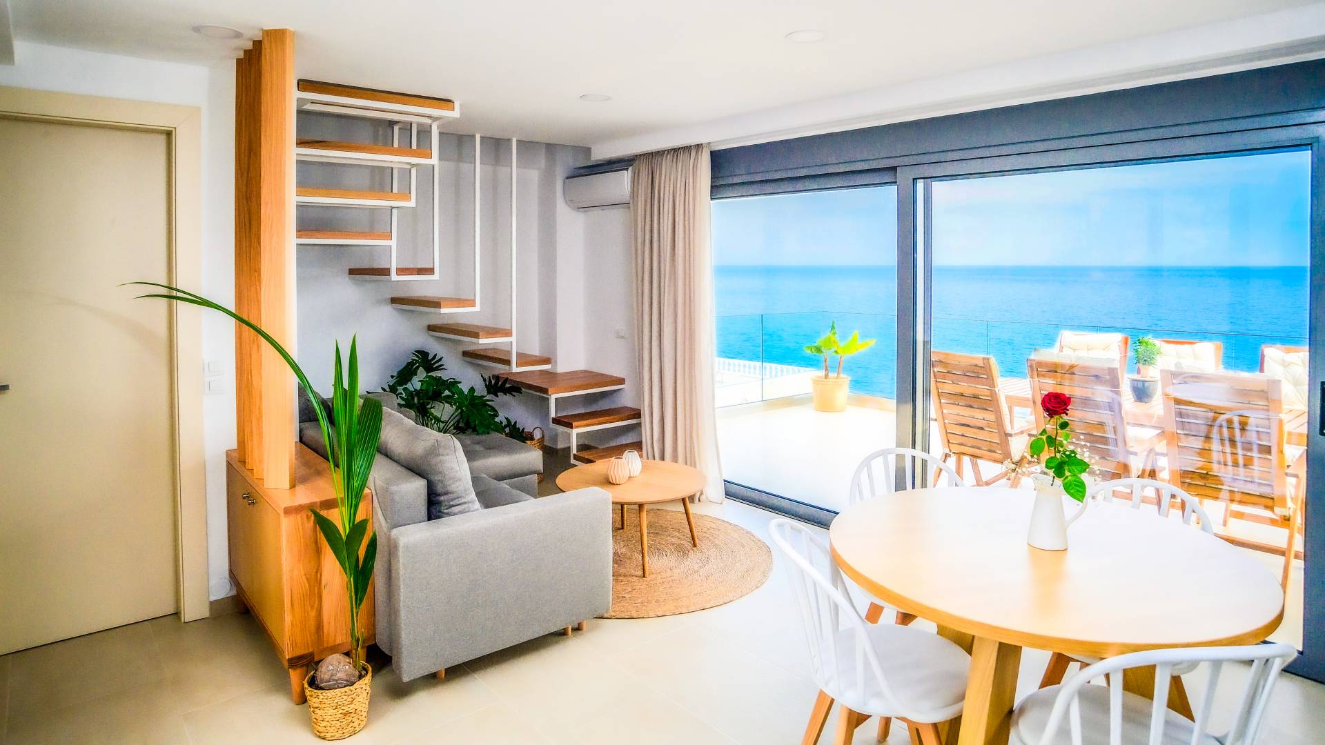 Moving to the second level we see a sea view open plan area with a sofa corner bed, a TV, a dining table, a fully-equipped kitchen and a WC. An internal staircase leads to the lower floor (level 1), described above. In front of the main room there is another sea view dining table on the outside large veranda and a small staircase leading to the private courtyard and the private pool area.