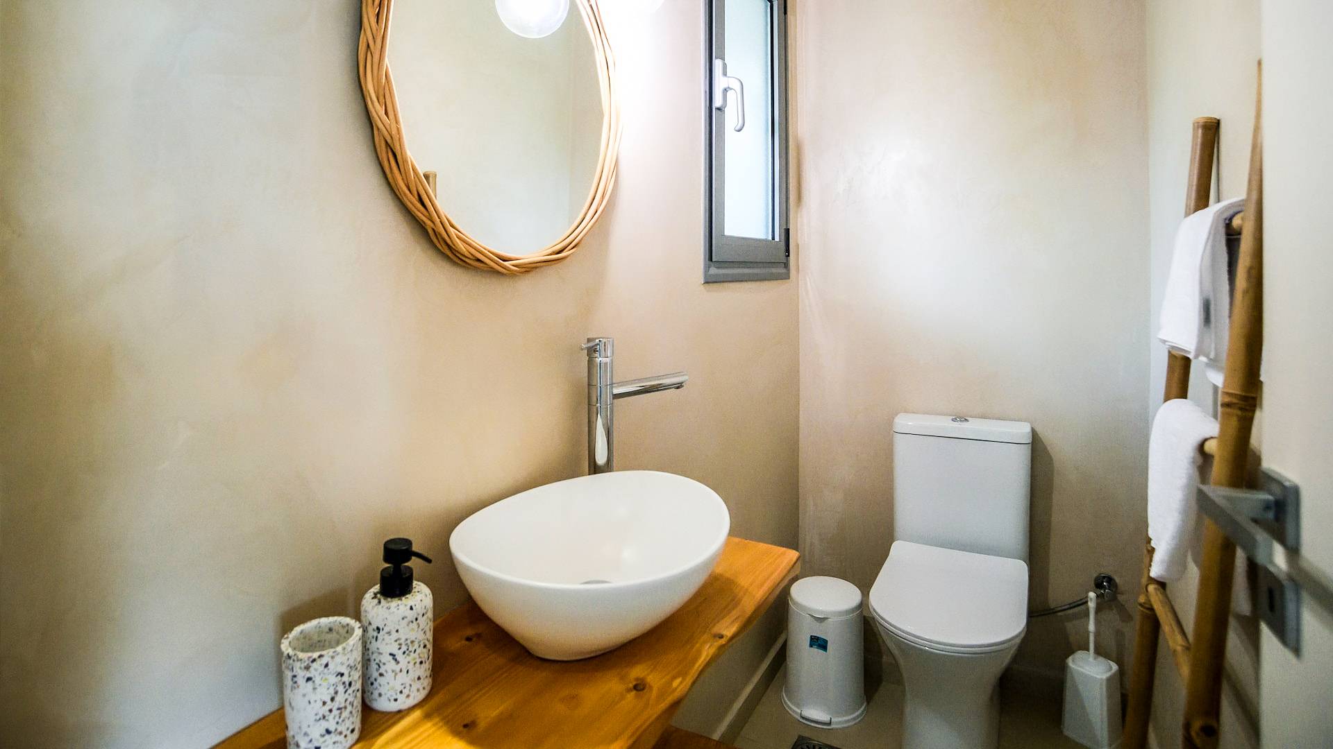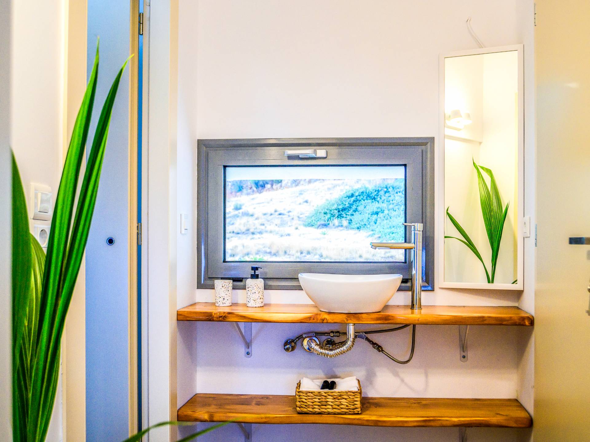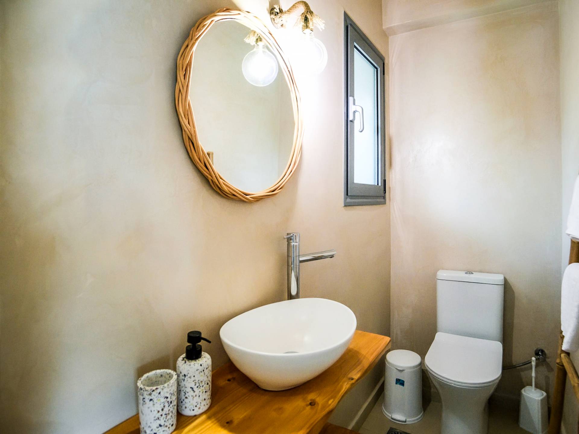 An outdoor staircase at the north/back side of the building leads to the two upper floors of the villa (level 3 & 4). At level 3 there are a second open plan living room area, a fully-equipped kitchen, a sofa-bed, a dining table, a TV and a bathroom with a shower is provided there too. At that point you probably find the most interesting part of the house. A large balcony with another dining table ideal for a nice meal is also waiting for you there. The view from this spot is magnificent during the day but even more at night when the moon rises from the sea horizon.