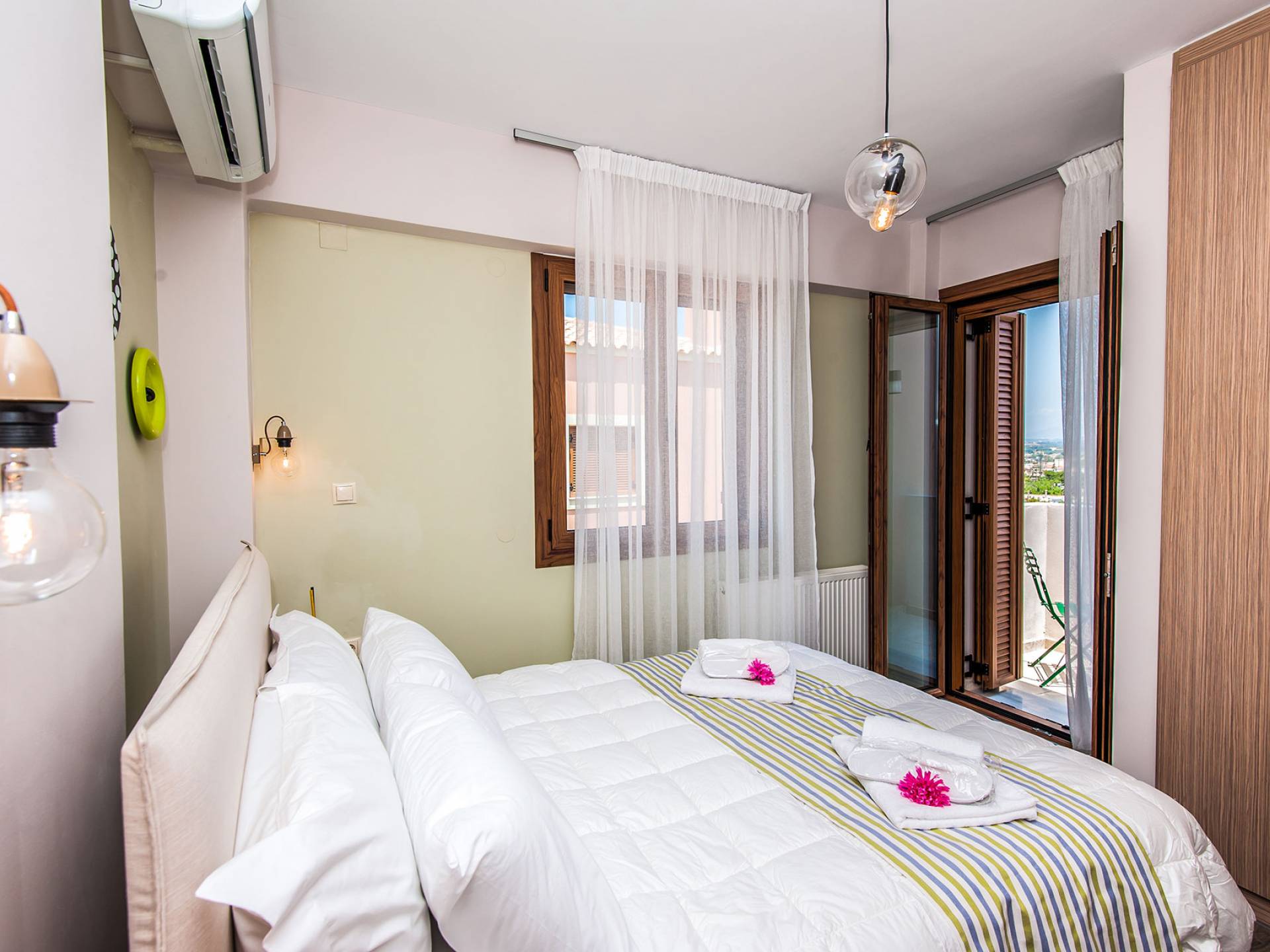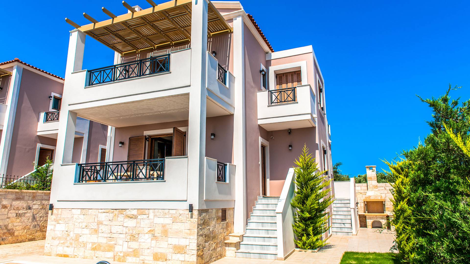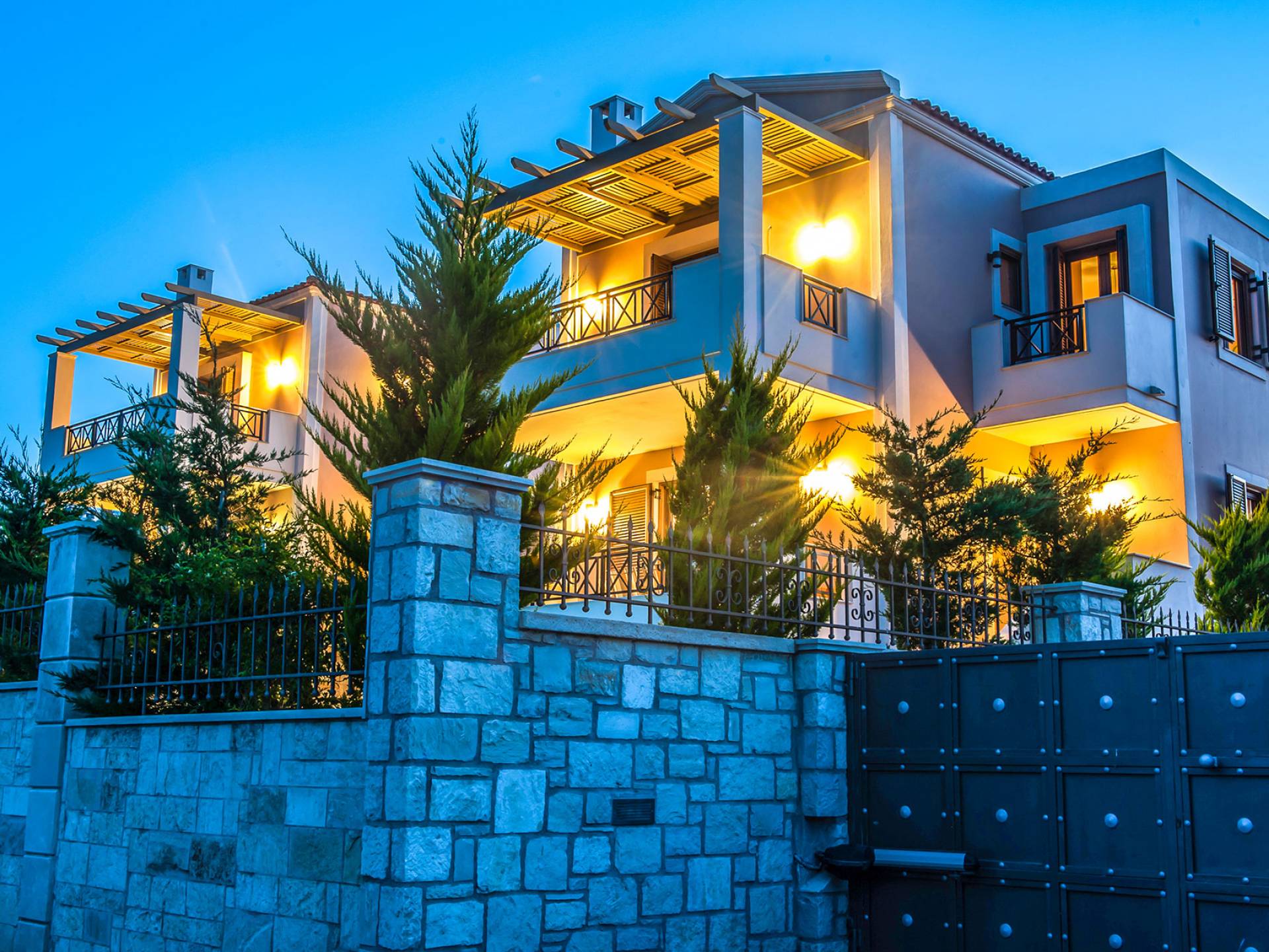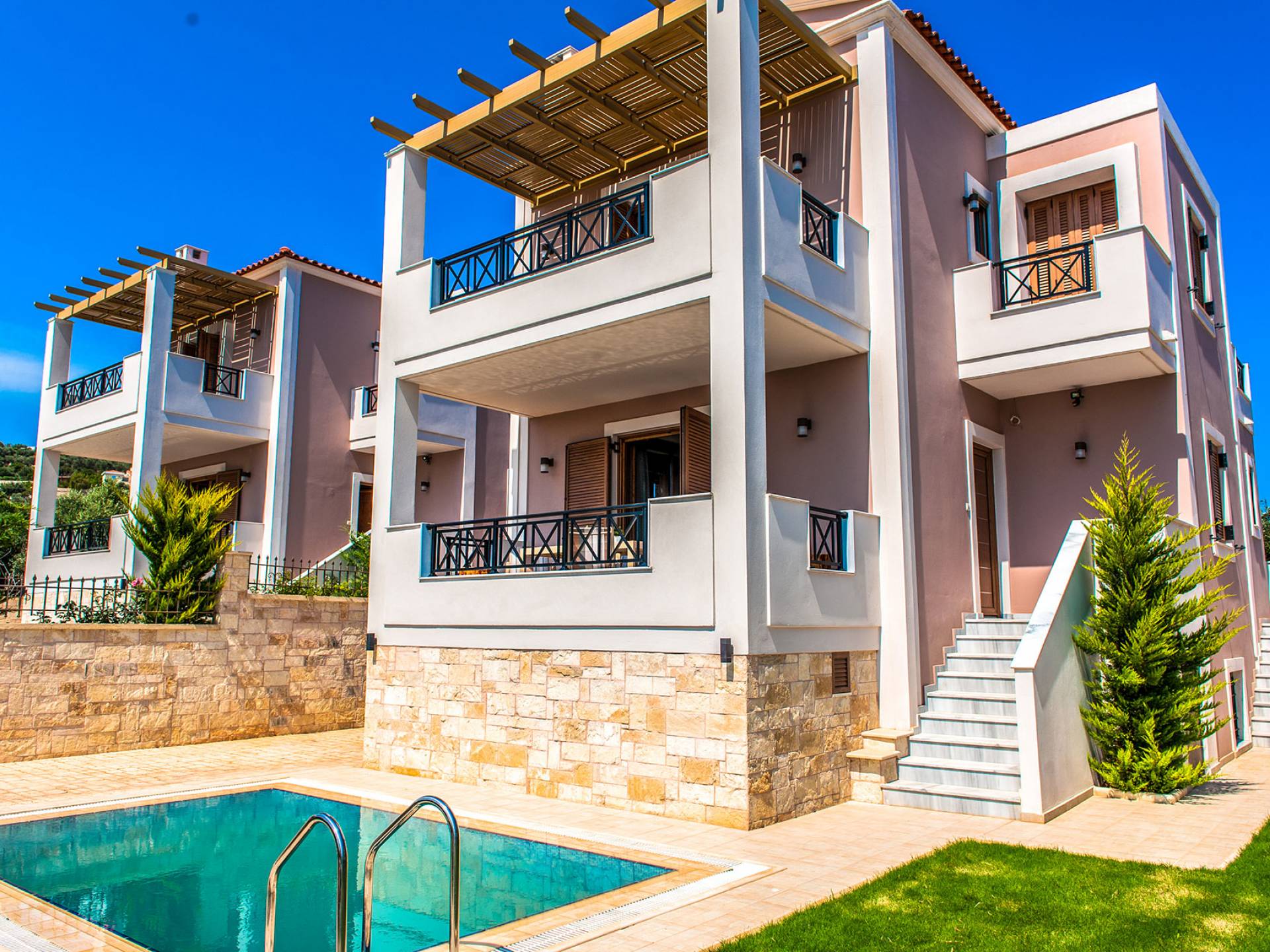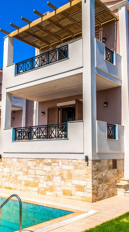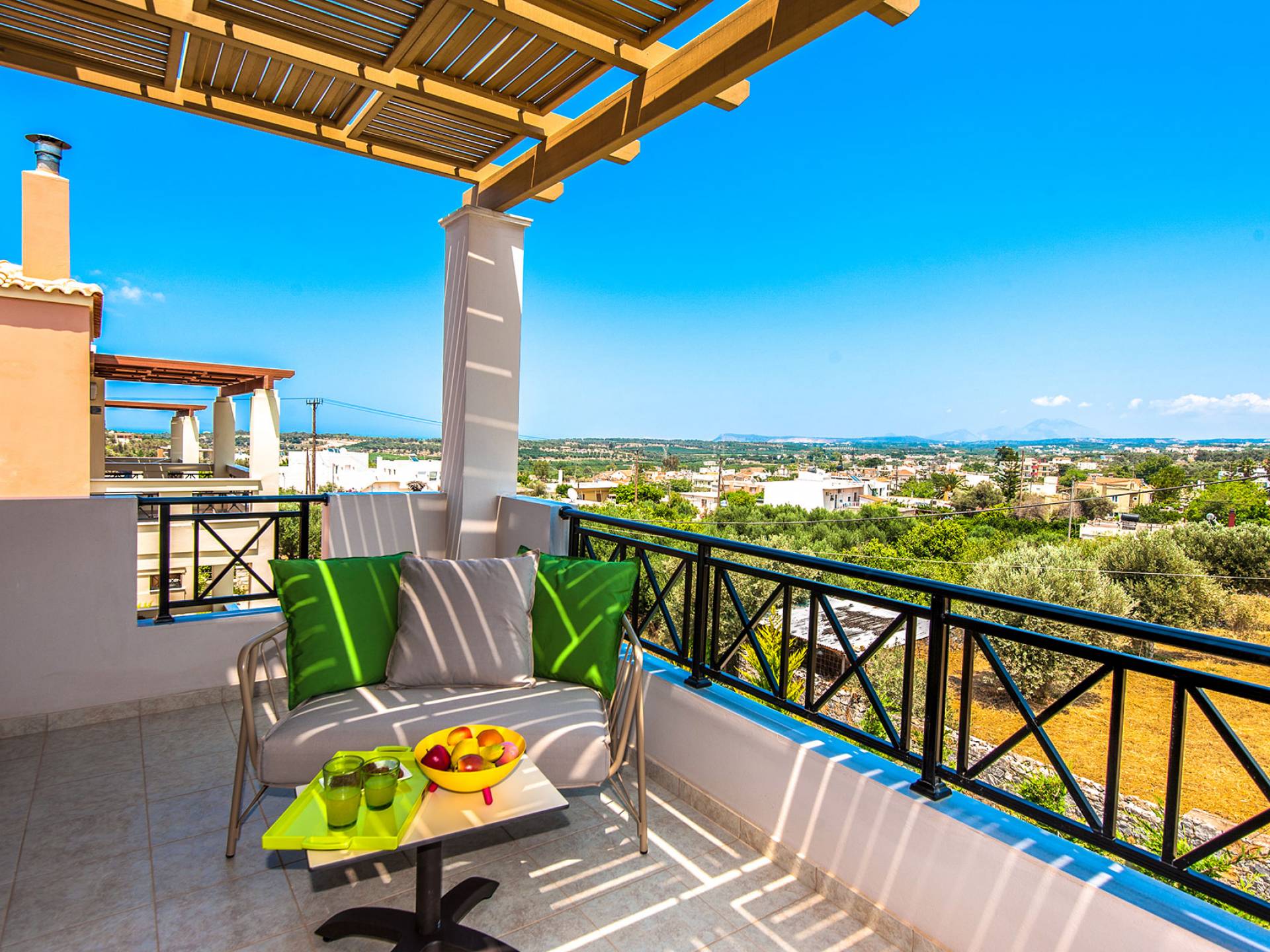 Die Möbel sind modern und der Raum wird mit moderner geringer Hintergrundbeleuchtung beleuchtet. Im ersten Stock befinden sich drei Schlafzimmer. Zwei von ihnen haben Doppelbetten und das dritte ist ein Zweibettzimmer. Die Schlafzimmer verfügen über Matratzen aus Naturprodukten, die auf beiden Seiten verwendet werden können: Eine Seite besteht aus Naturlatex, das sie für einen angenehmen Schlaf weich macht, und die andere Seite hat ein anatomisches Gedächtnis. Eines der Schlafzimmer hat eine große Terrasse mit schöner Aussicht, ausgestattet mit einer modernen Holzpergola als Sonnenschirm und möbliert mit einer Relaxcouch.