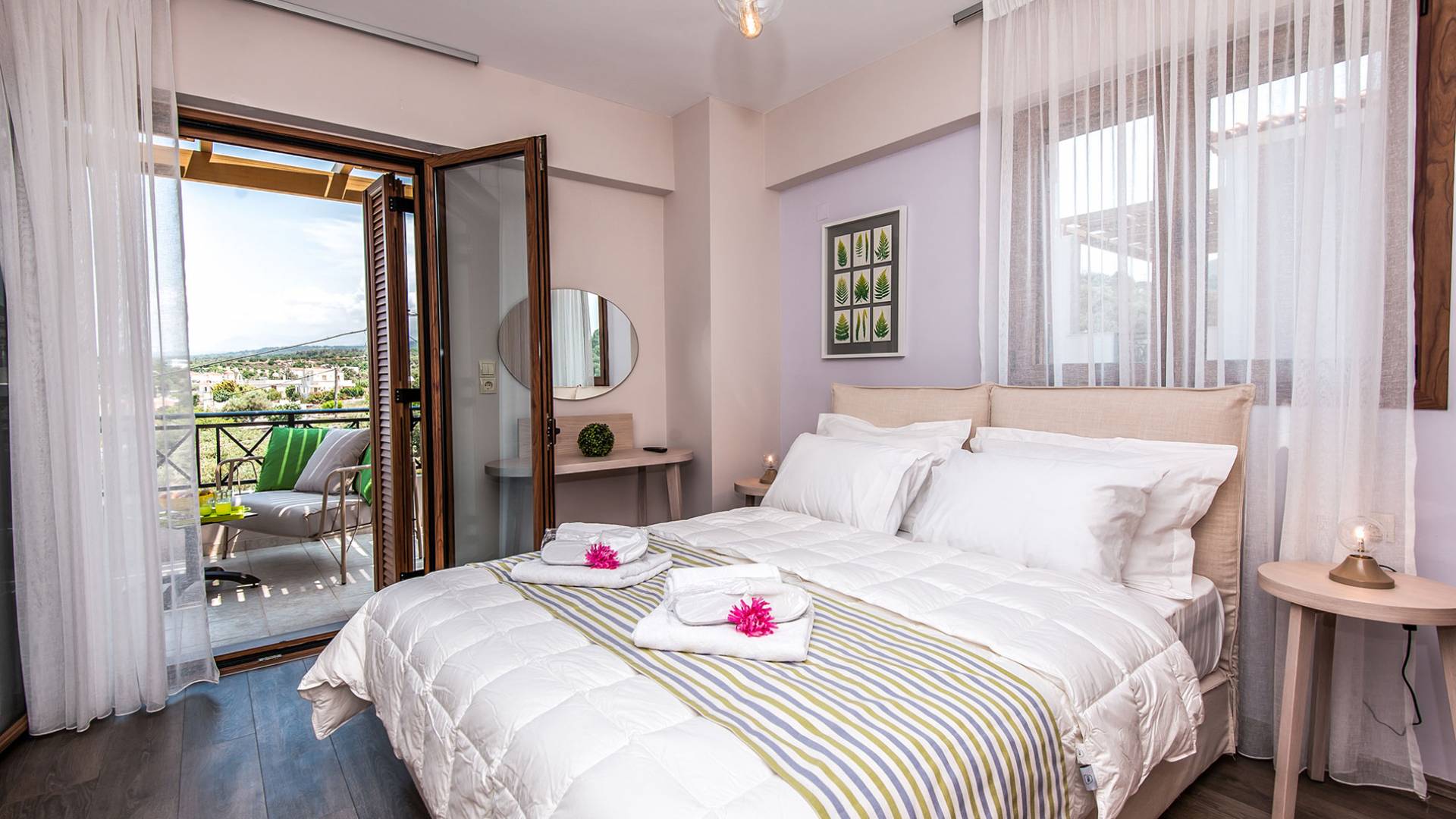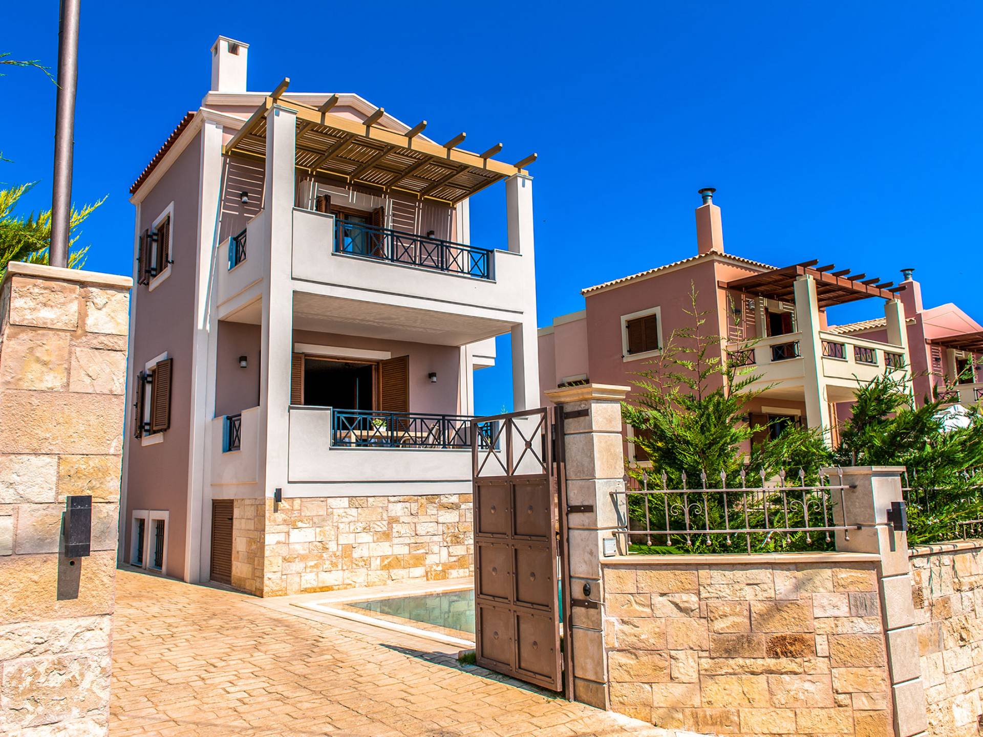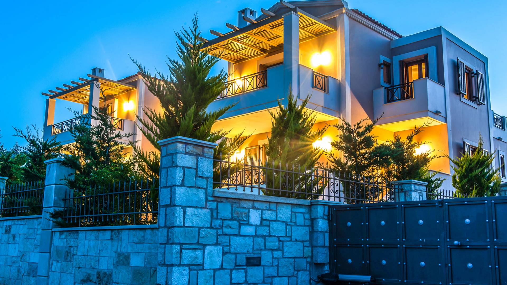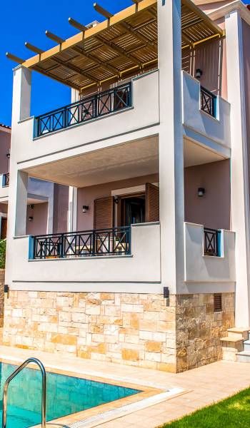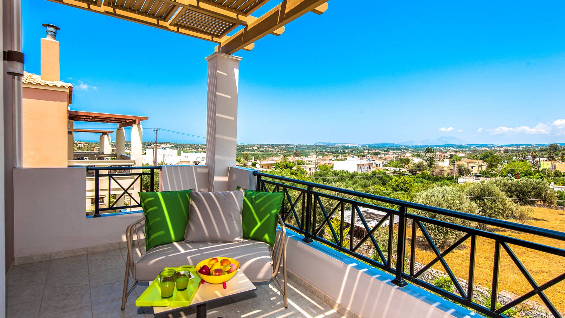 Die Möbel sind modern und der Raum wird mit moderner geringer Hintergrundbeleuchtung beleuchtet. Im ersten Stock befinden sich drei Schlafzimmer. Zwei von ihnen haben Doppelbetten und das dritte ist ein Zweibettzimmer. Die Schlafzimmer verfügen über Matratzen aus Naturprodukten, die auf beiden Seiten verwendet werden können: Eine Seite besteht aus Naturlatex, das sie für einen angenehmen Schlaf weich macht, und die andere Seite hat ein anatomisches Gedächtnis. Eines der Schlafzimmer hat eine große Terrasse mit schöner Aussicht, ausgestattet mit einer modernen Holzpergola als Sonnenschirm und möbliert mit einer Relaxcouch.