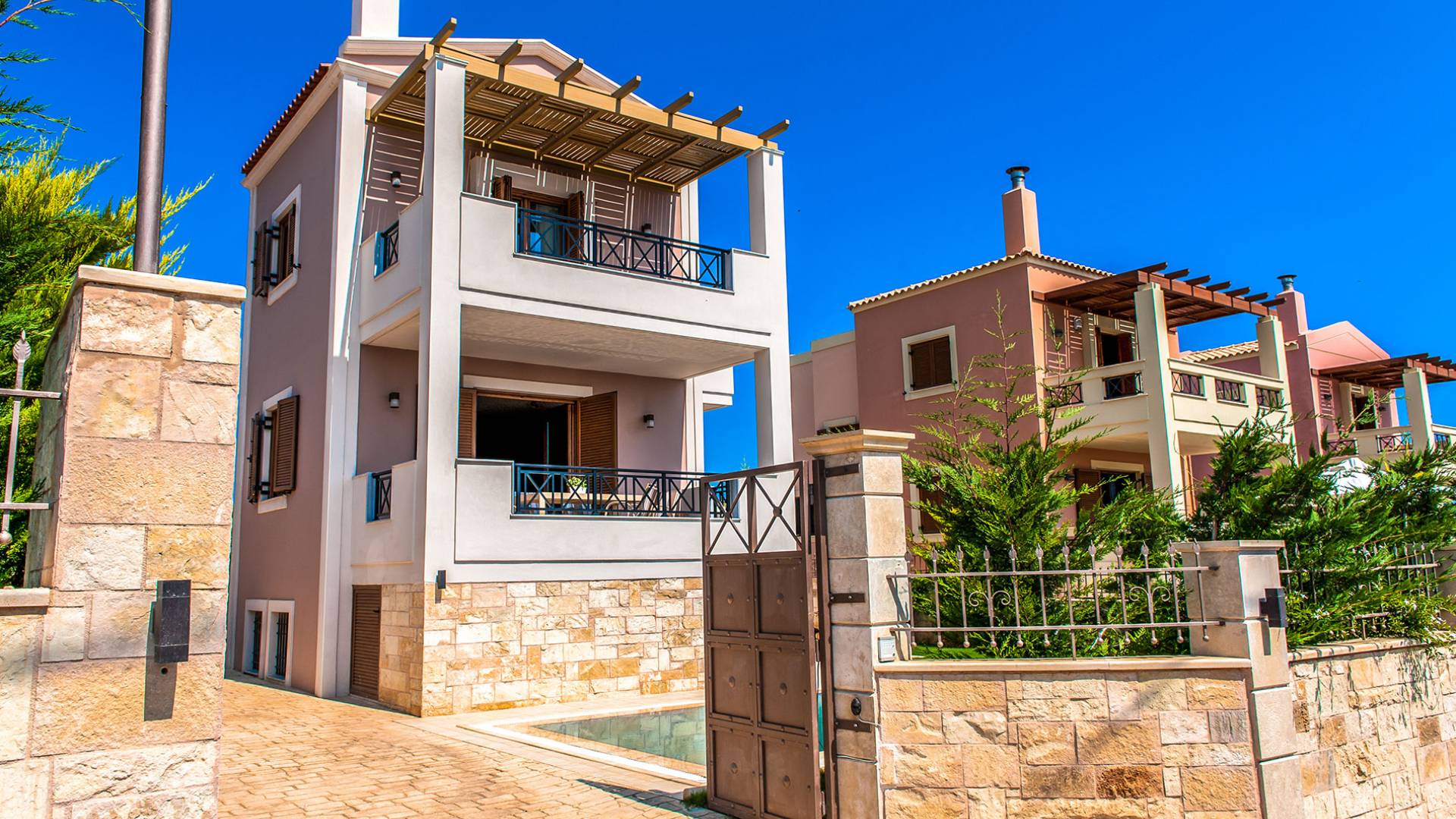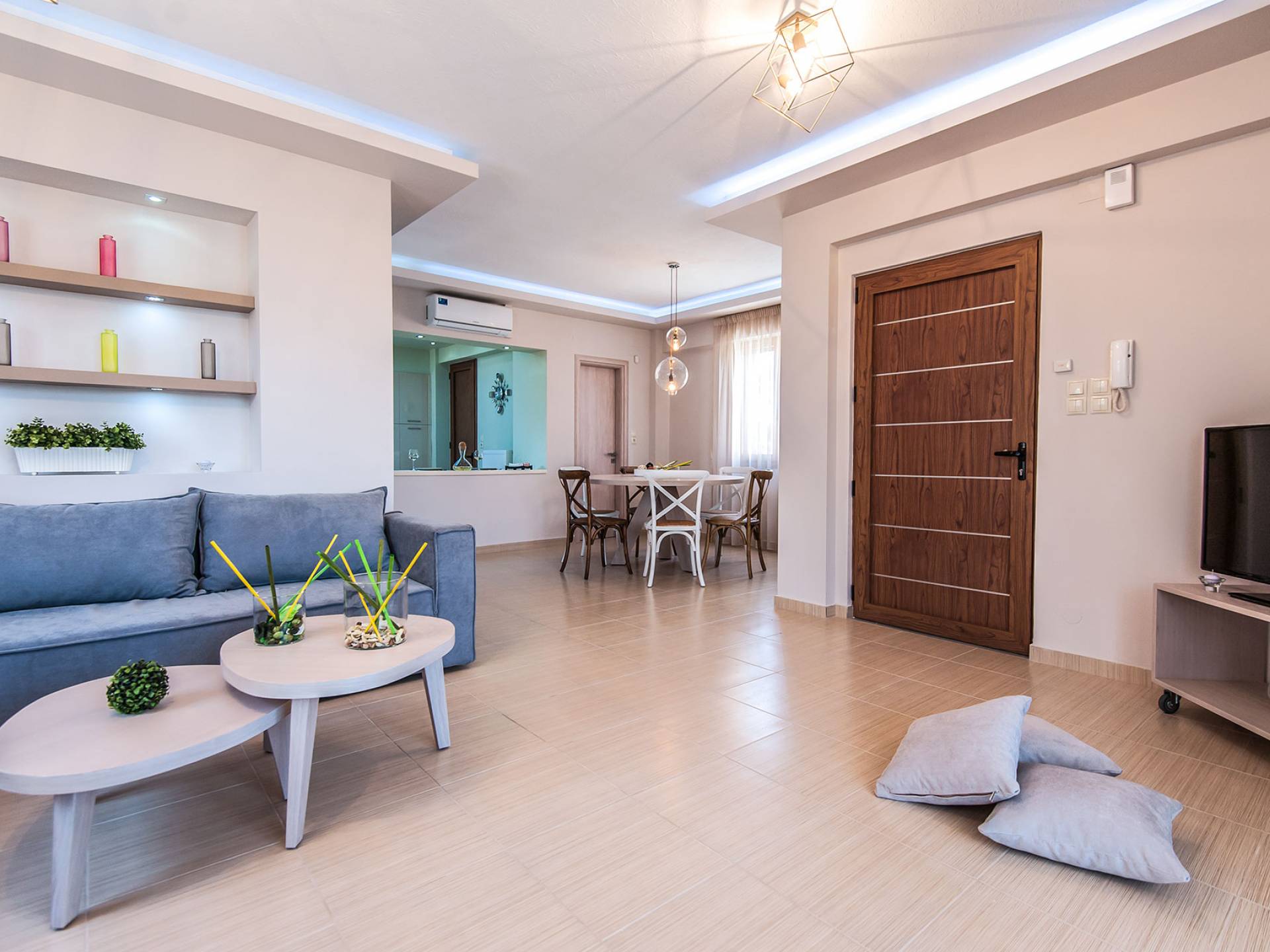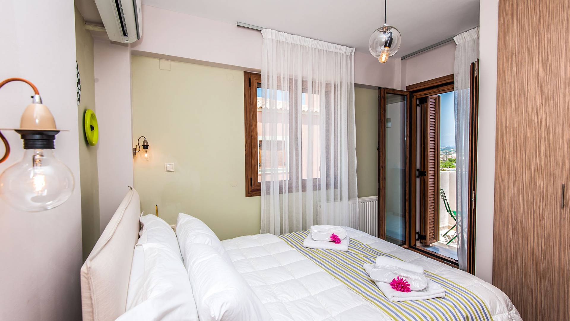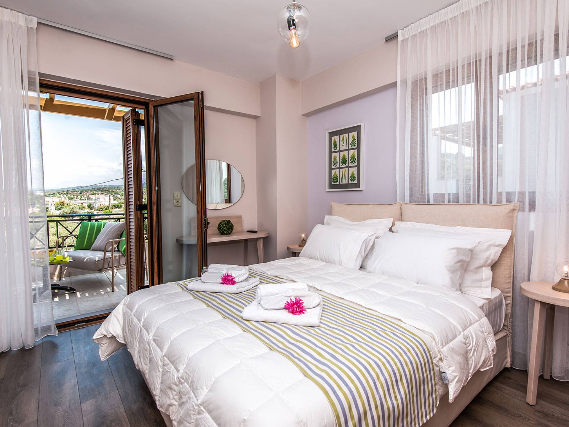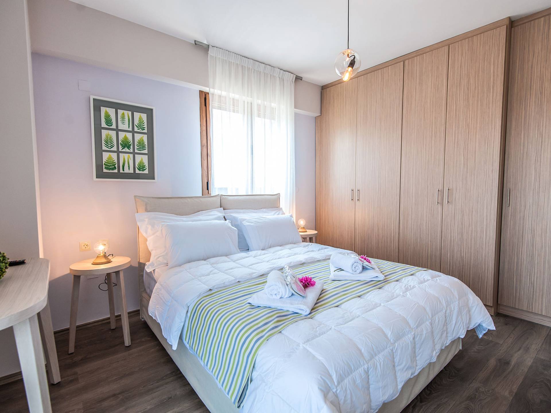 Die Möbel sind modern und der Raum wird mit moderner geringer Hintergrundbeleuchtung beleuchtet. Im ersten Stock befinden sich drei Schlafzimmer. Zwei von ihnen haben Doppelbetten und das dritte ist ein Zweibettzimmer. Die Schlafzimmer verfügen über Matratzen aus Naturprodukten, die auf beiden Seiten verwendet werden können: Eine Seite besteht aus Naturlatex, das sie für einen angenehmen Schlaf weich macht, und die andere Seite hat ein anatomisches Gedächtnis. Eines der Schlafzimmer hat eine große Terrasse mit schöner Aussicht, ausgestattet mit einer modernen Holzpergola als Sonnenschirm und möbliert mit einer Relaxcouch.