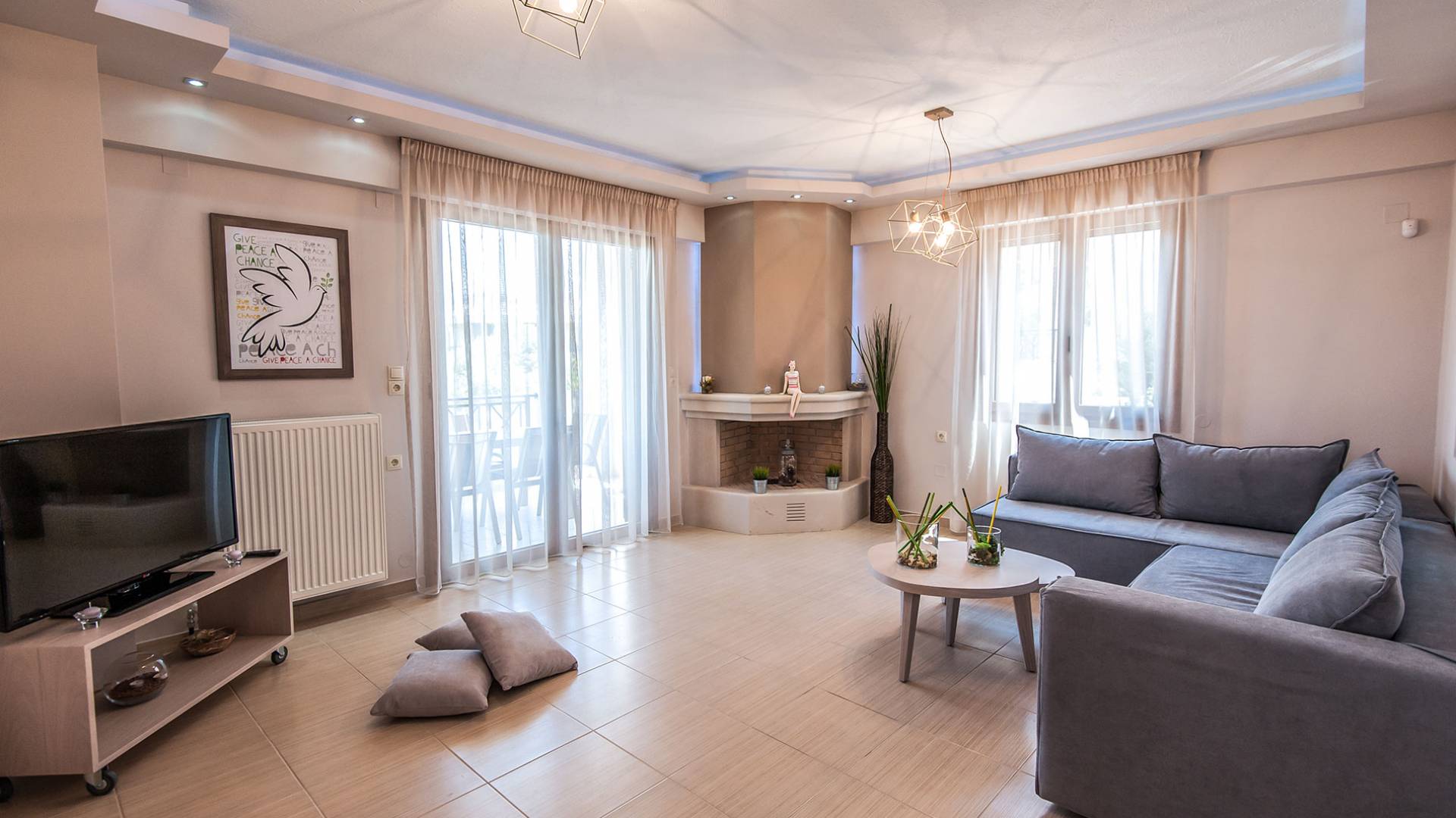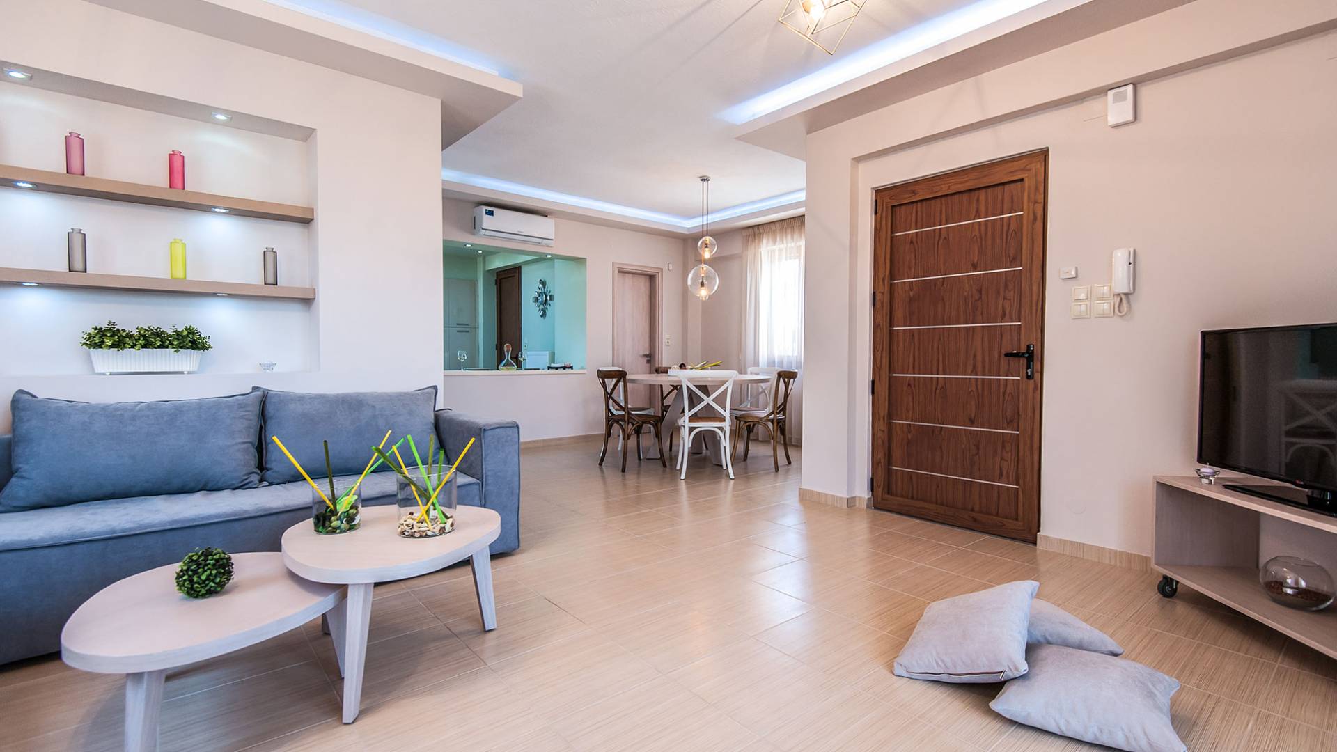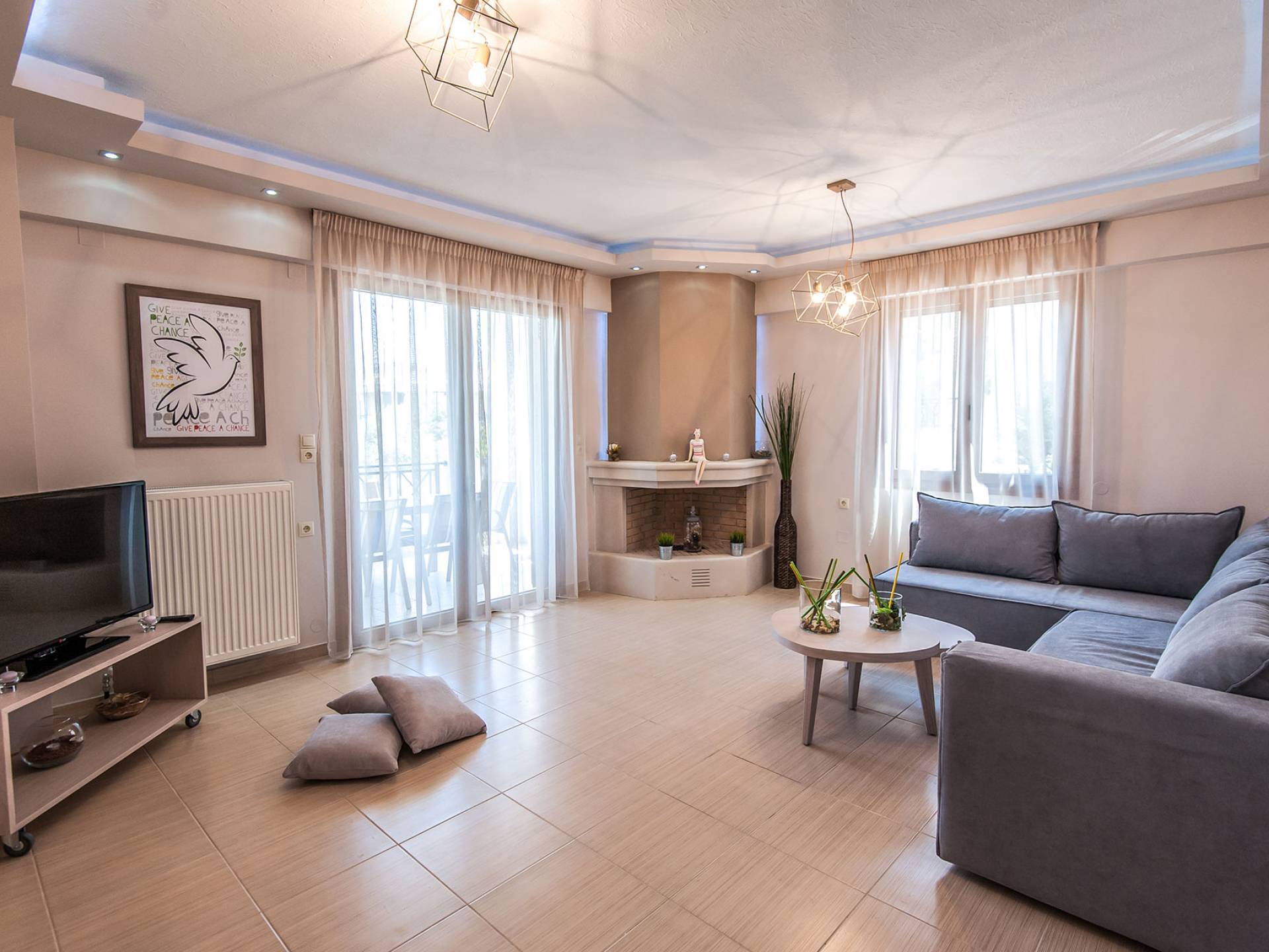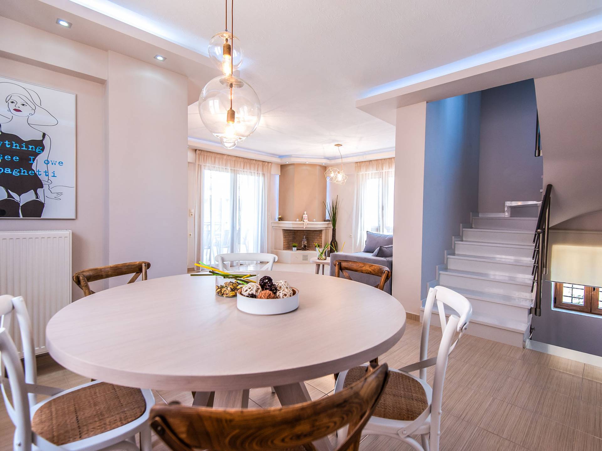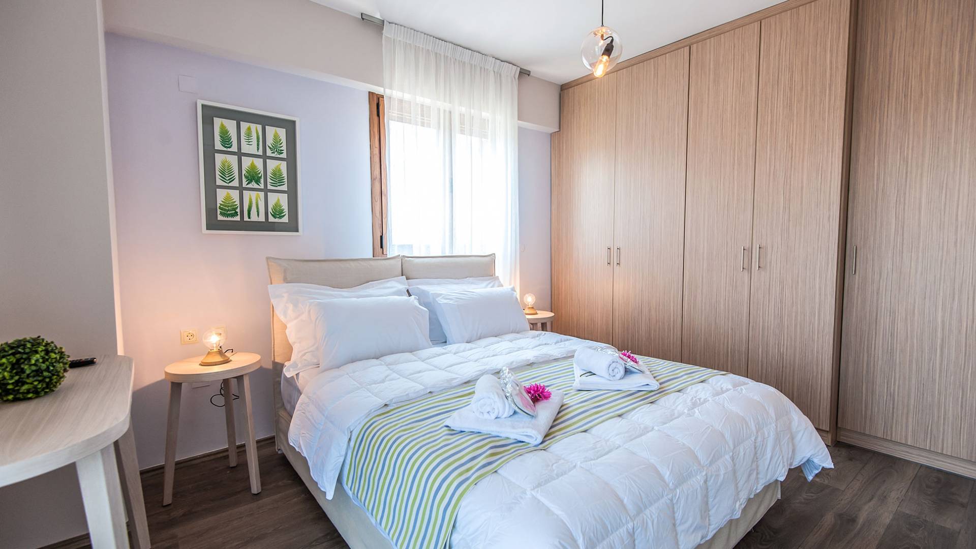 Die Möbel sind modern und der Raum wird mit moderner geringer Hintergrundbeleuchtung beleuchtet. Im ersten Stock befinden sich drei Schlafzimmer. Zwei von ihnen haben Doppelbetten und das dritte ist ein Zweibettzimmer. Die Schlafzimmer verfügen über Matratzen aus Naturprodukten, die auf beiden Seiten verwendet werden können: Eine Seite besteht aus Naturlatex, das sie für einen angenehmen Schlaf weich macht, und die andere Seite hat ein anatomisches Gedächtnis. Eines der Schlafzimmer hat eine große Terrasse mit schöner Aussicht, ausgestattet mit einer modernen Holzpergola als Sonnenschirm und möbliert mit einer Relaxcouch.