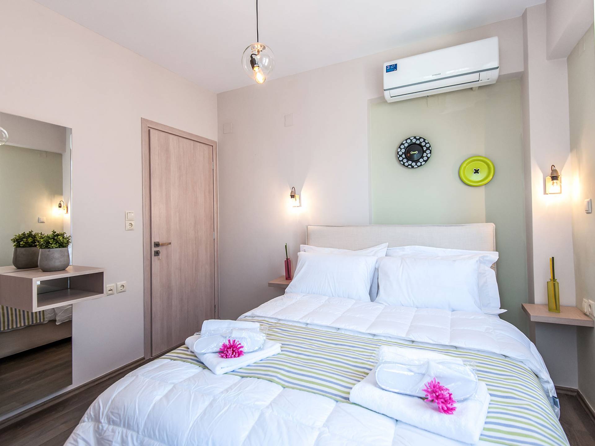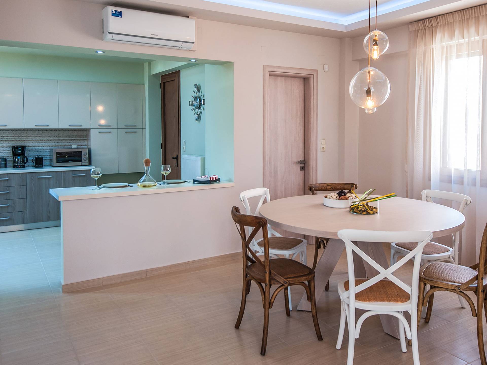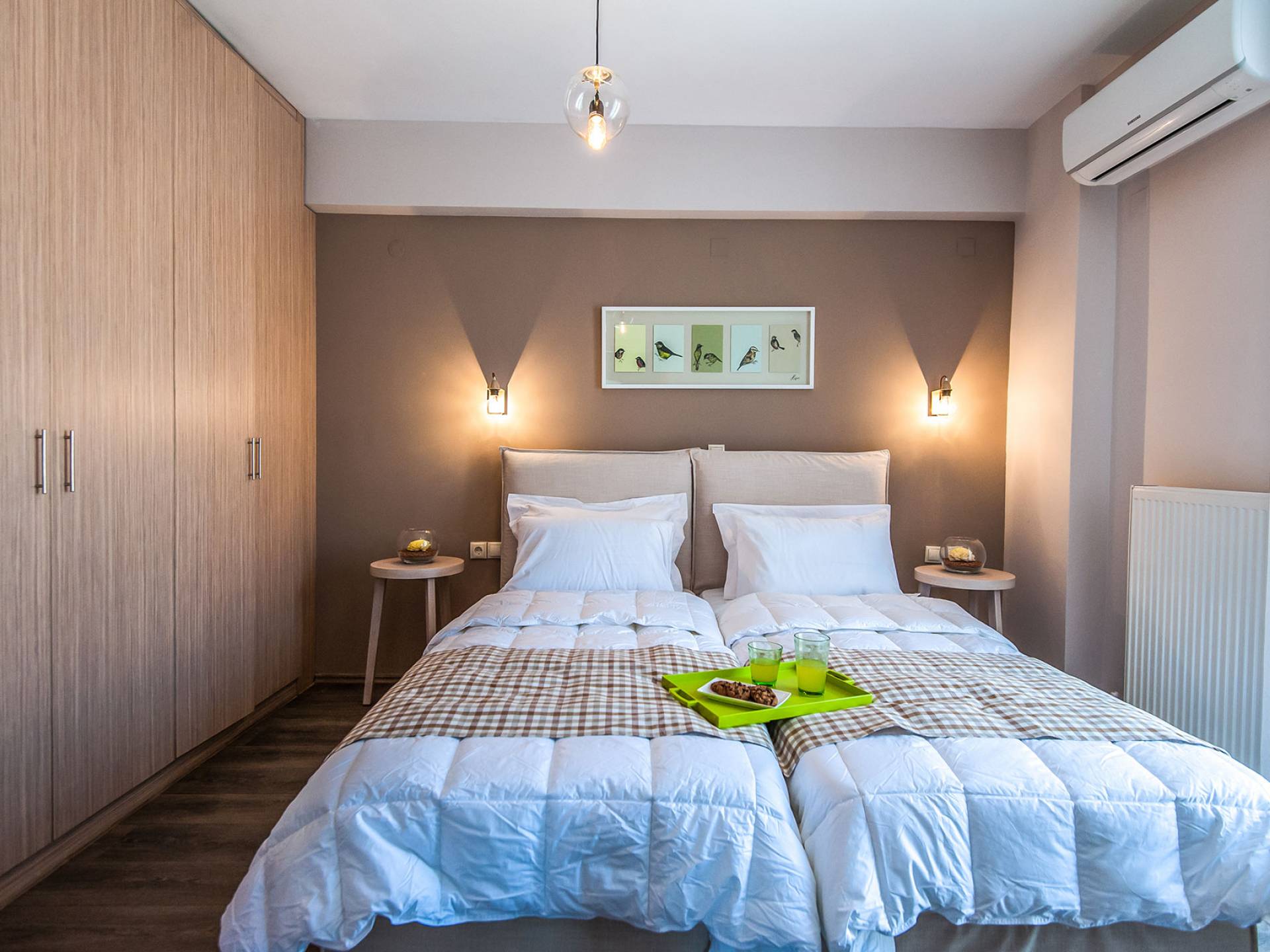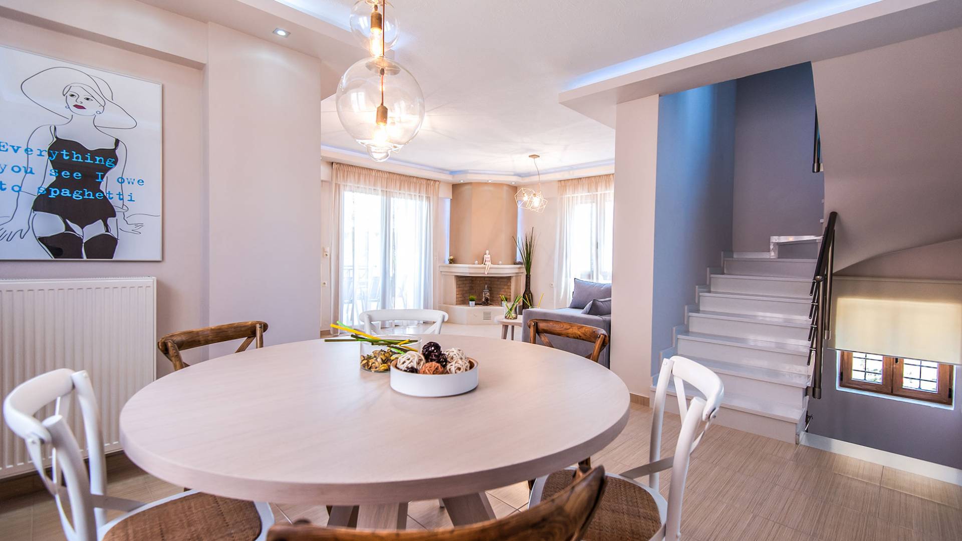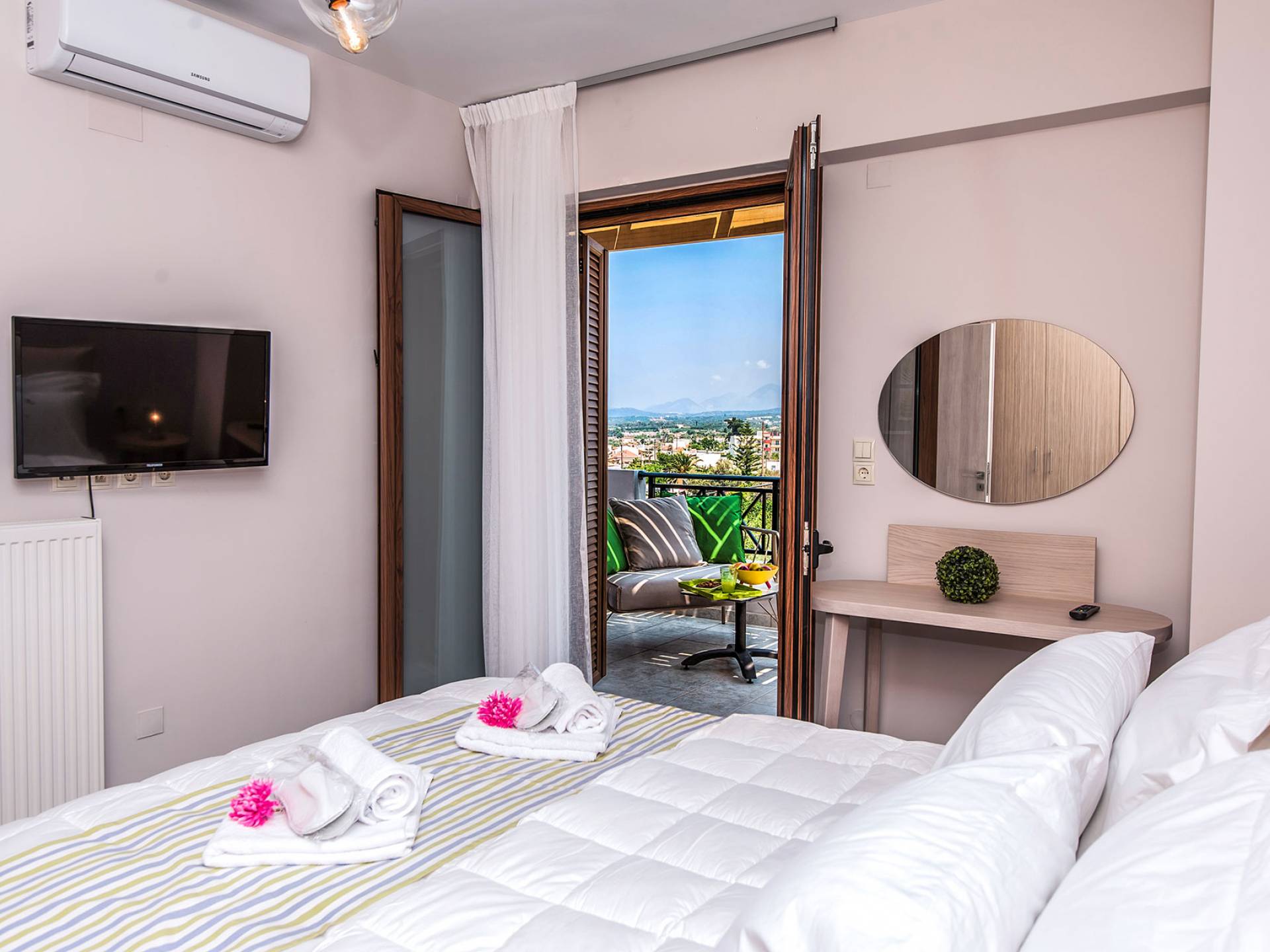 Die Möbel sind modern und der Raum wird mit moderner geringer Hintergrundbeleuchtung beleuchtet. Im ersten Stock befinden sich drei Schlafzimmer. Zwei von ihnen haben Doppelbetten und das dritte ist ein Zweibettzimmer. Die Schlafzimmer verfügen über Matratzen aus Naturprodukten, die auf beiden Seiten verwendet werden können: Eine Seite besteht aus Naturlatex, das sie für einen angenehmen Schlaf weich macht, und die andere Seite hat ein anatomisches Gedächtnis. Eines der Schlafzimmer hat eine große Terrasse mit schöner Aussicht, ausgestattet mit einer modernen Holzpergola als Sonnenschirm und möbliert mit einer Relaxcouch.