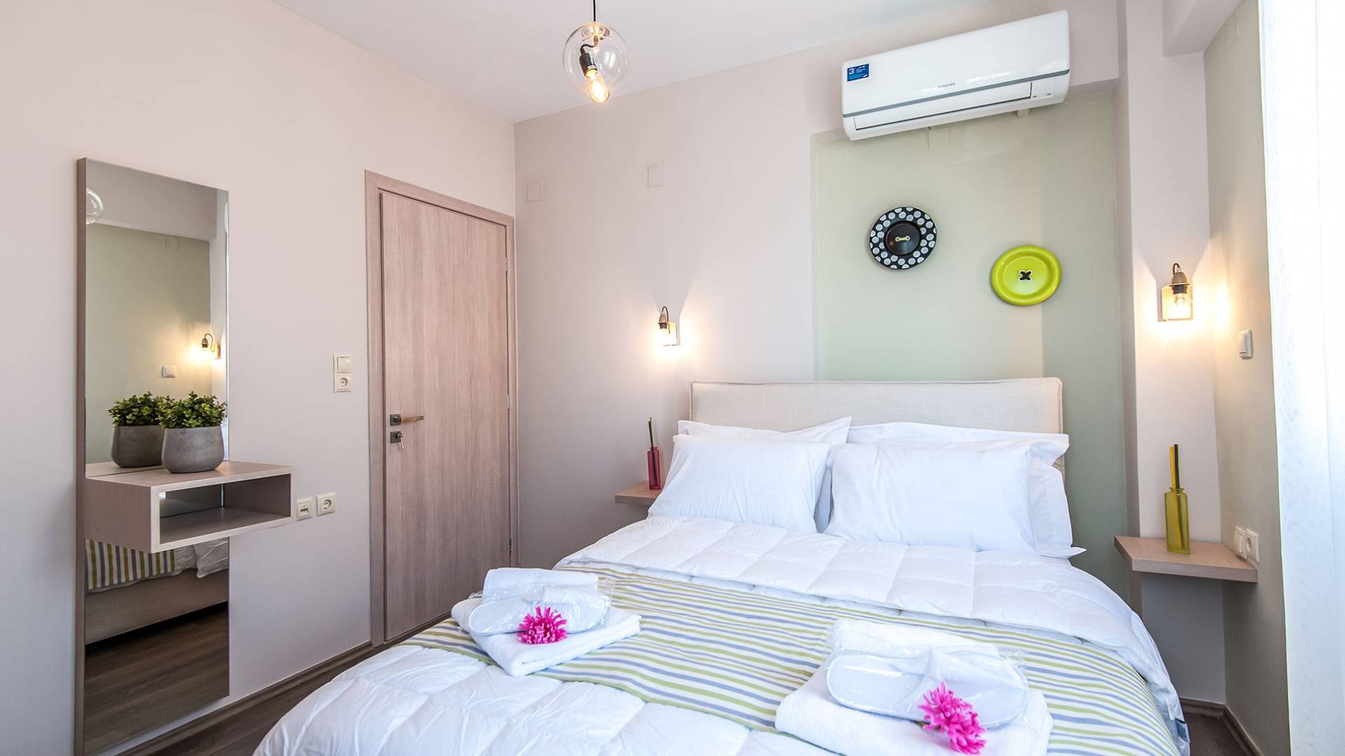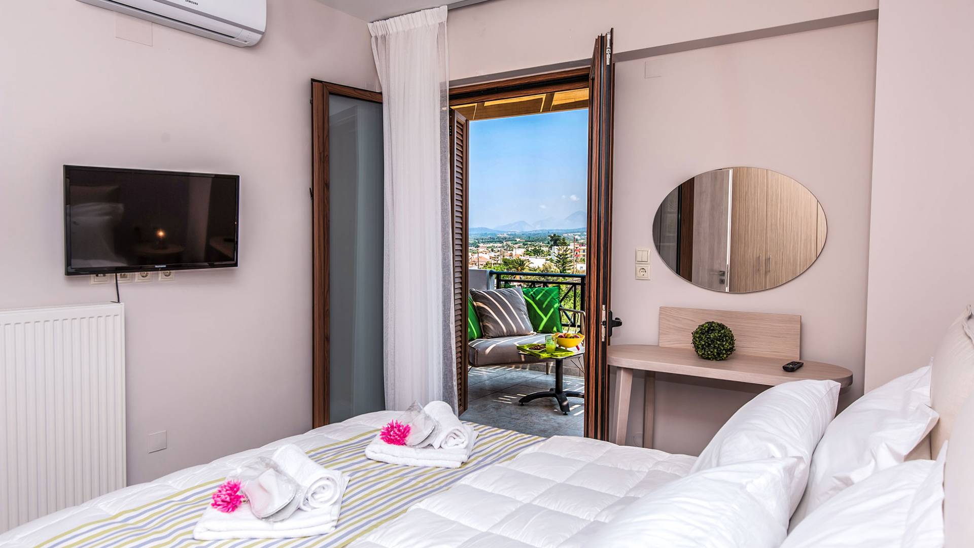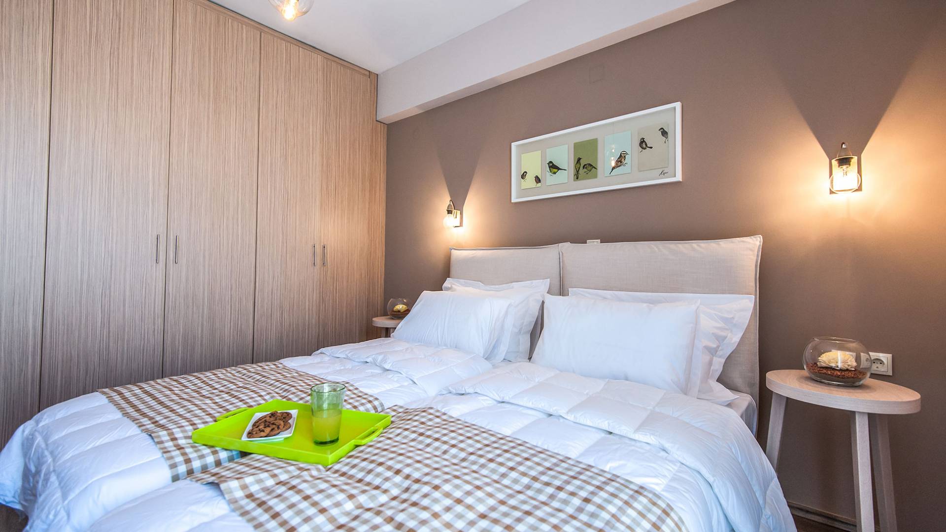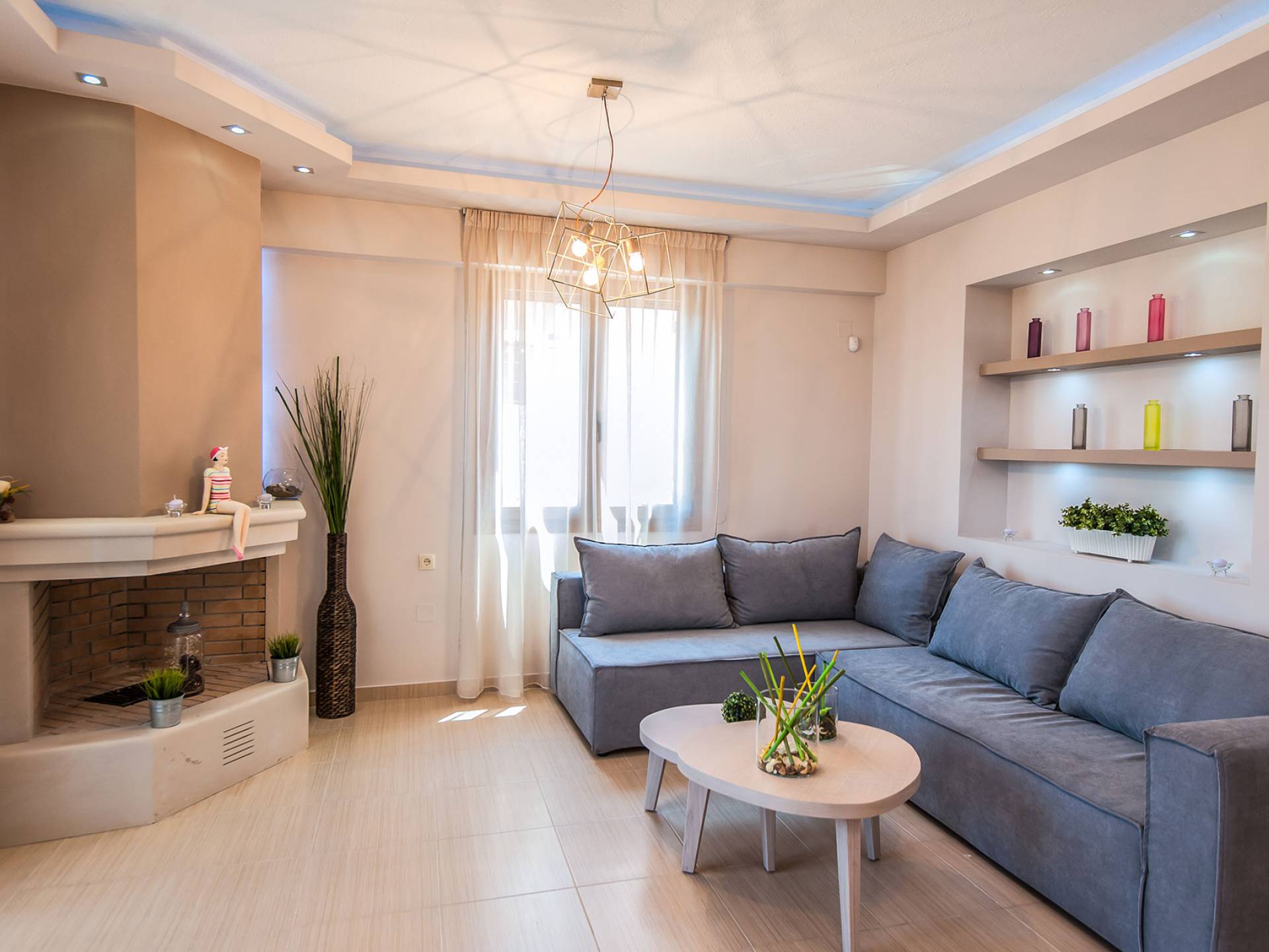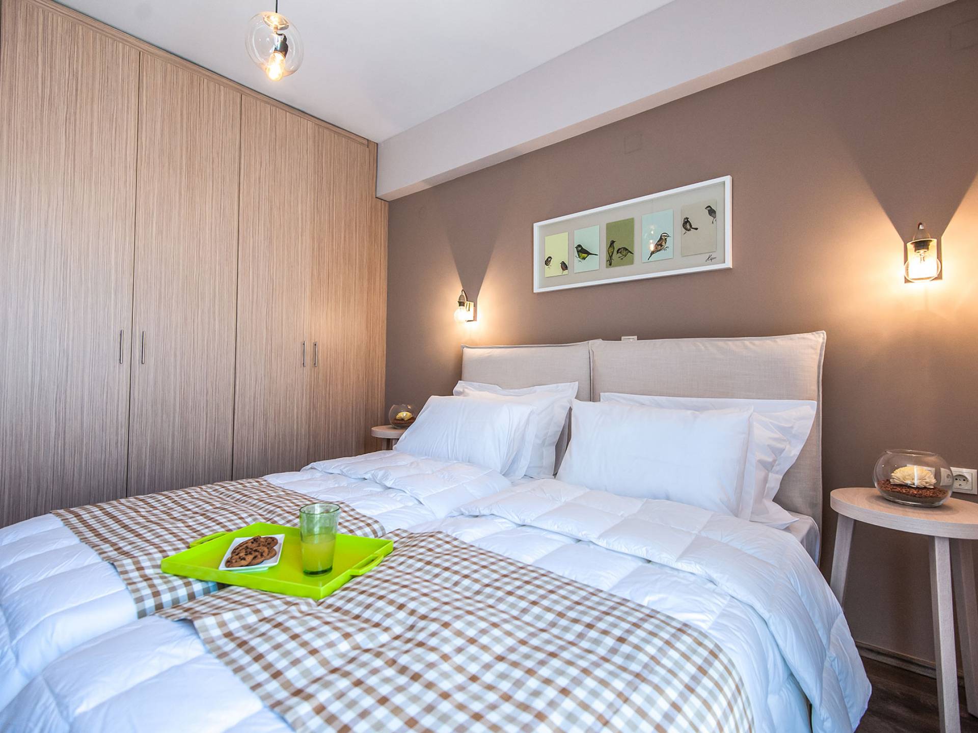 Die Möbel sind modern und der Raum wird mit moderner geringer Hintergrundbeleuchtung beleuchtet. Im ersten Stock befinden sich drei Schlafzimmer. Zwei von ihnen haben Doppelbetten und das dritte ist ein Zweibettzimmer. Die Schlafzimmer verfügen über Matratzen aus Naturprodukten, die auf beiden Seiten verwendet werden können: Eine Seite besteht aus Naturlatex, das sie für einen angenehmen Schlaf weich macht, und die andere Seite hat ein anatomisches Gedächtnis. Eines der Schlafzimmer hat eine große Terrasse mit schöner Aussicht, ausgestattet mit einer modernen Holzpergola als Sonnenschirm und möbliert mit einer Relaxcouch.