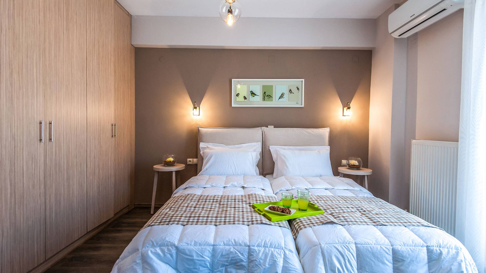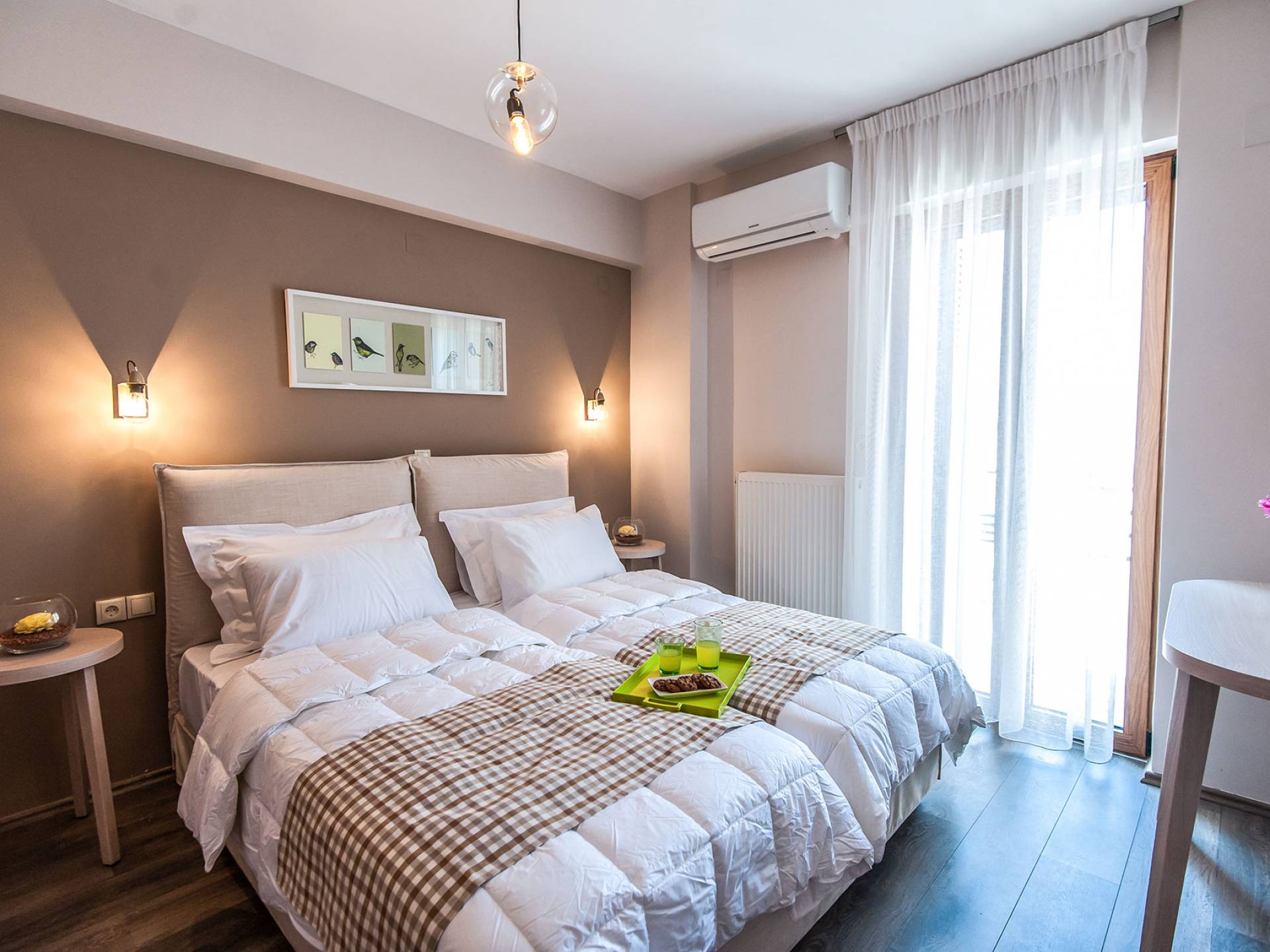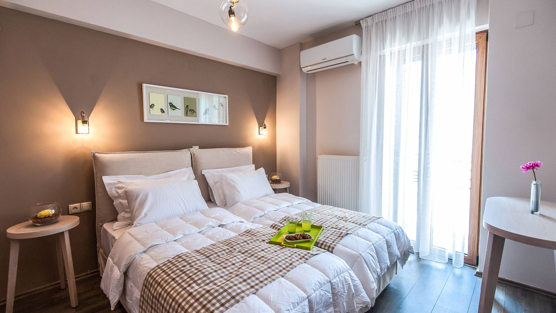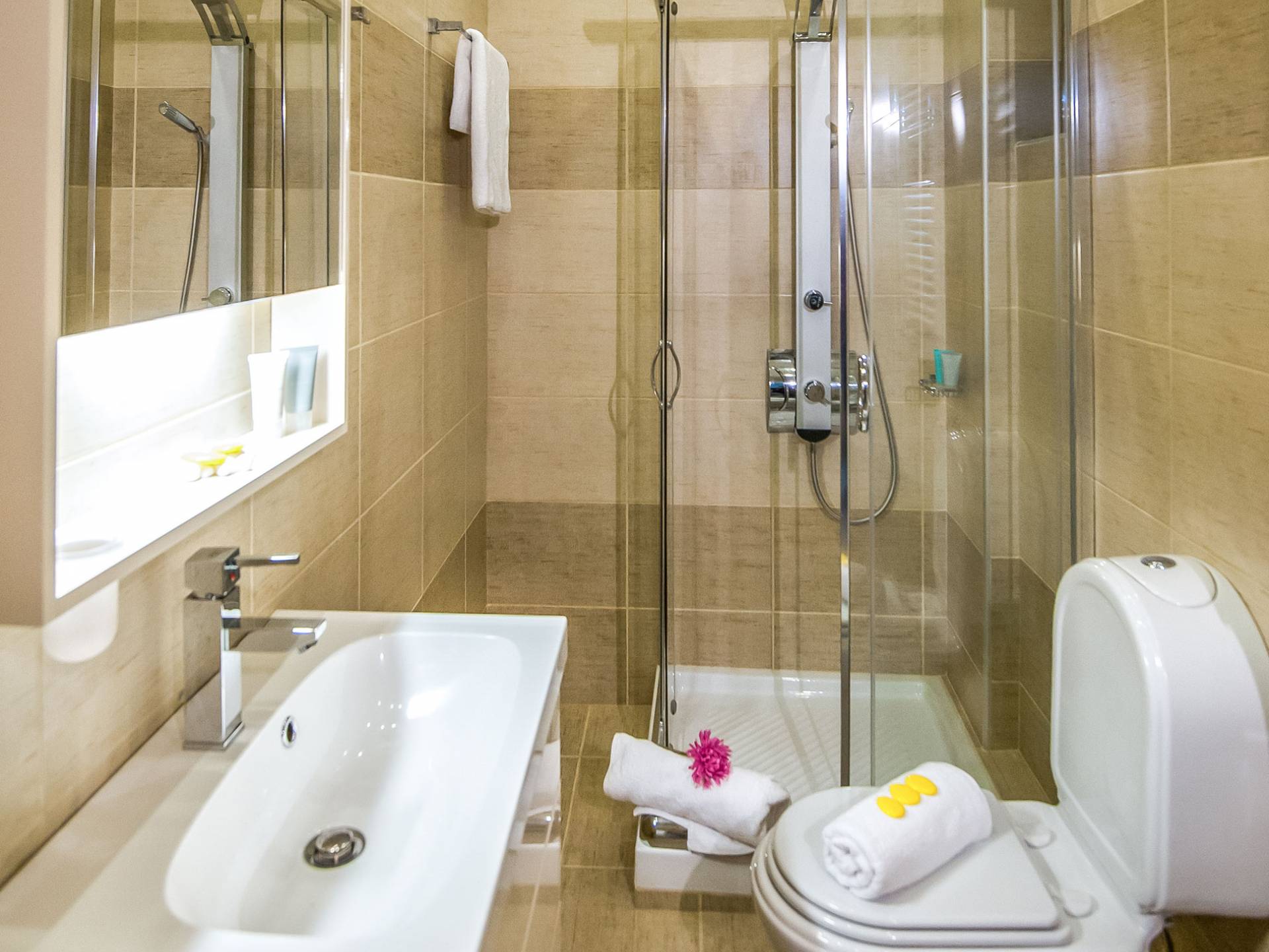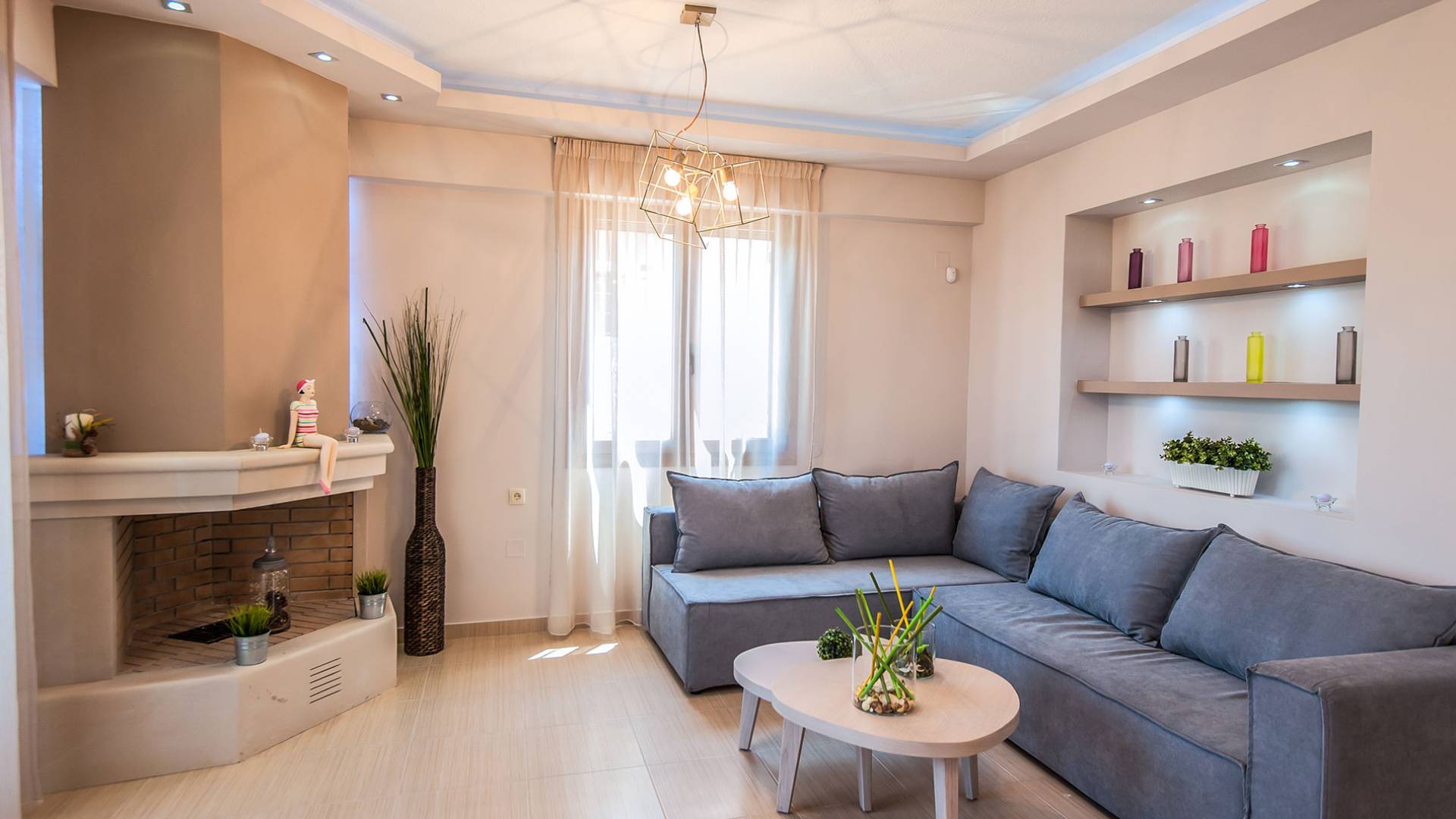 Die Möbel sind modern und der Raum wird mit moderner geringer Hintergrundbeleuchtung beleuchtet. Im ersten Stock befinden sich drei Schlafzimmer. Zwei von ihnen haben Doppelbetten und das dritte ist ein Zweibettzimmer. Die Schlafzimmer verfügen über Matratzen aus Naturprodukten, die auf beiden Seiten verwendet werden können: Eine Seite besteht aus Naturlatex, das sie für einen angenehmen Schlaf weich macht, und die andere Seite hat ein anatomisches Gedächtnis. Eines der Schlafzimmer hat eine große Terrasse mit schöner Aussicht, ausgestattet mit einer modernen Holzpergola als Sonnenschirm und möbliert mit einer Relaxcouch.