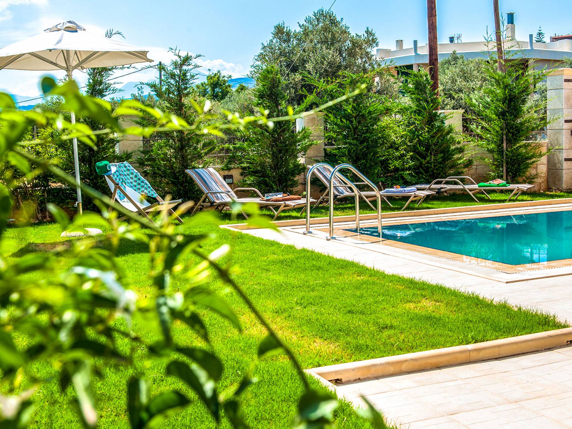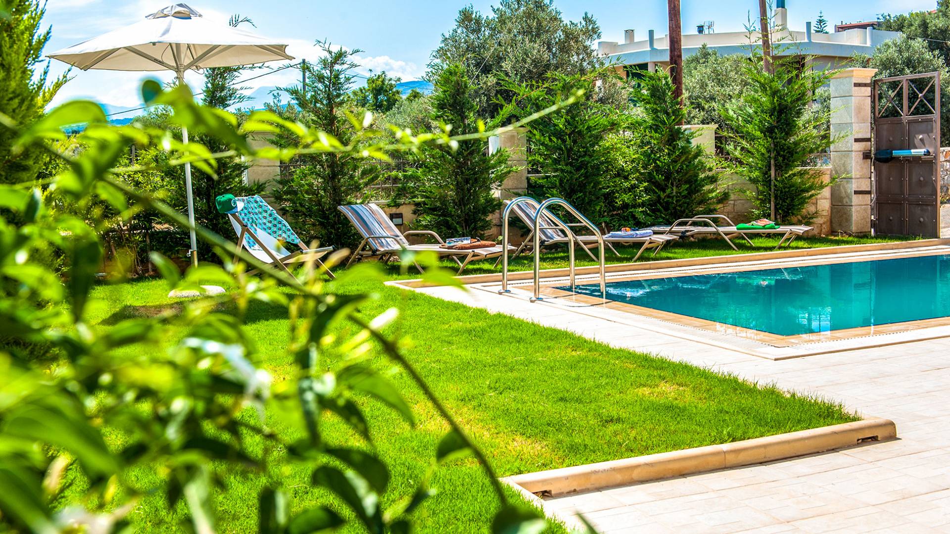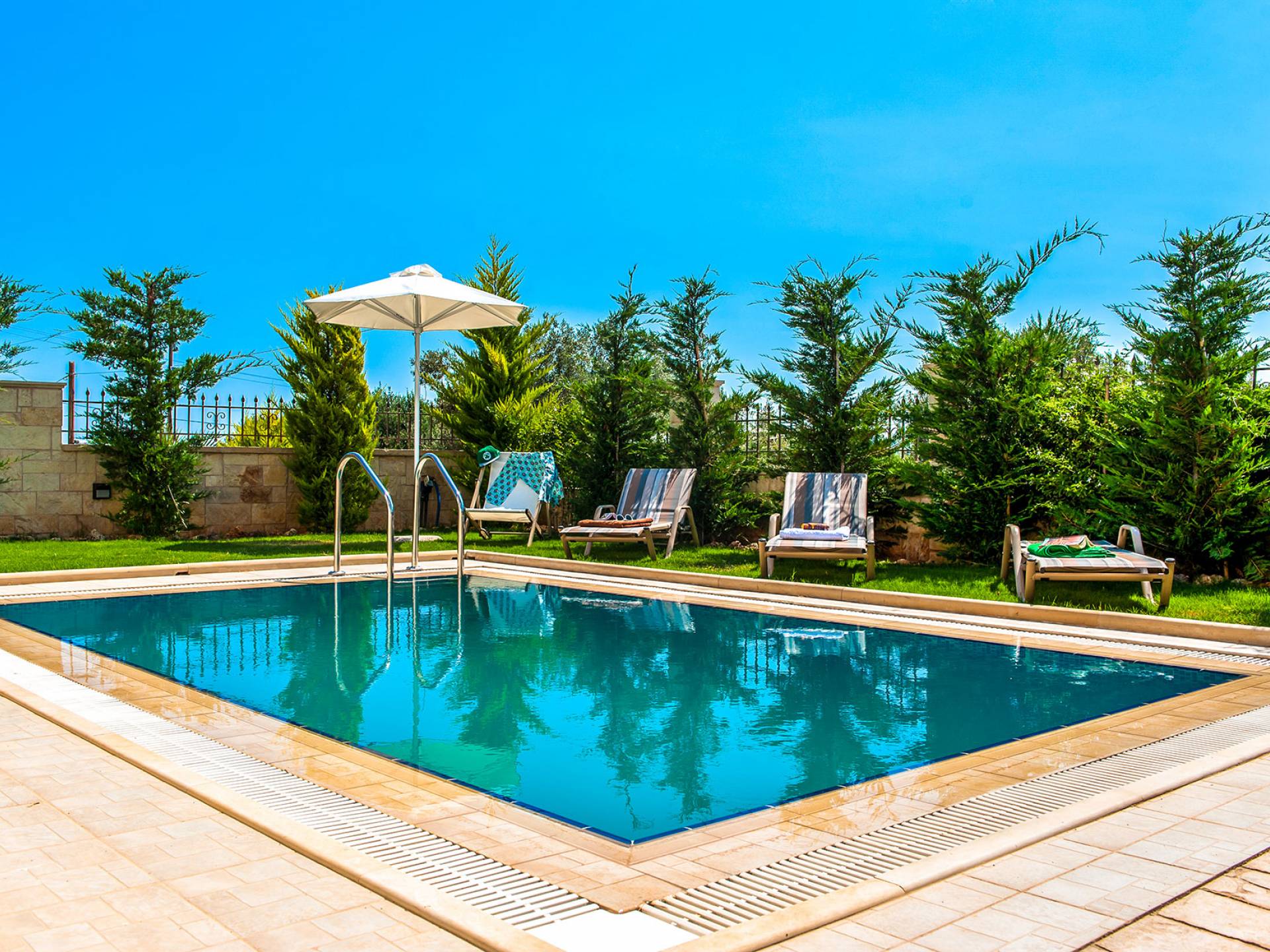 Die anderen beiden Schlafzimmer haben kleine Balkone. Auf der ersten Etage befindet sich auch ein Badezimmer mit Whirlpool-Badewanne und entspannender geringer Hintergrundbeleuchtung. Im Keller gibt es ein Duschbad und eine Waschmaschine. Hana Villa Rethymno ist mit Sat-TV, Klimaanlage, Safe, Geschirrspüler und Waschmaschine ausgestattet und wir bieten auch kostenloses WLAN und ein Babybett bei Bedarf. Die Villa verfügt über einen Garten mit Rasen neben dem Pool, in dem Rosen, Zypressen, Jasmin-Zitronen- und Orangenbäume gepflanzt sind und an einer Ecke befindet sich auch ein Grill. Rund um den Swimmingpool stehen Liegestühle und ein Sonnenschirm. Hana Villa Crete verfügt auch über einen privaten Parkplatz im Freien, der mit einer automatischen Tür geöffnet wird.
