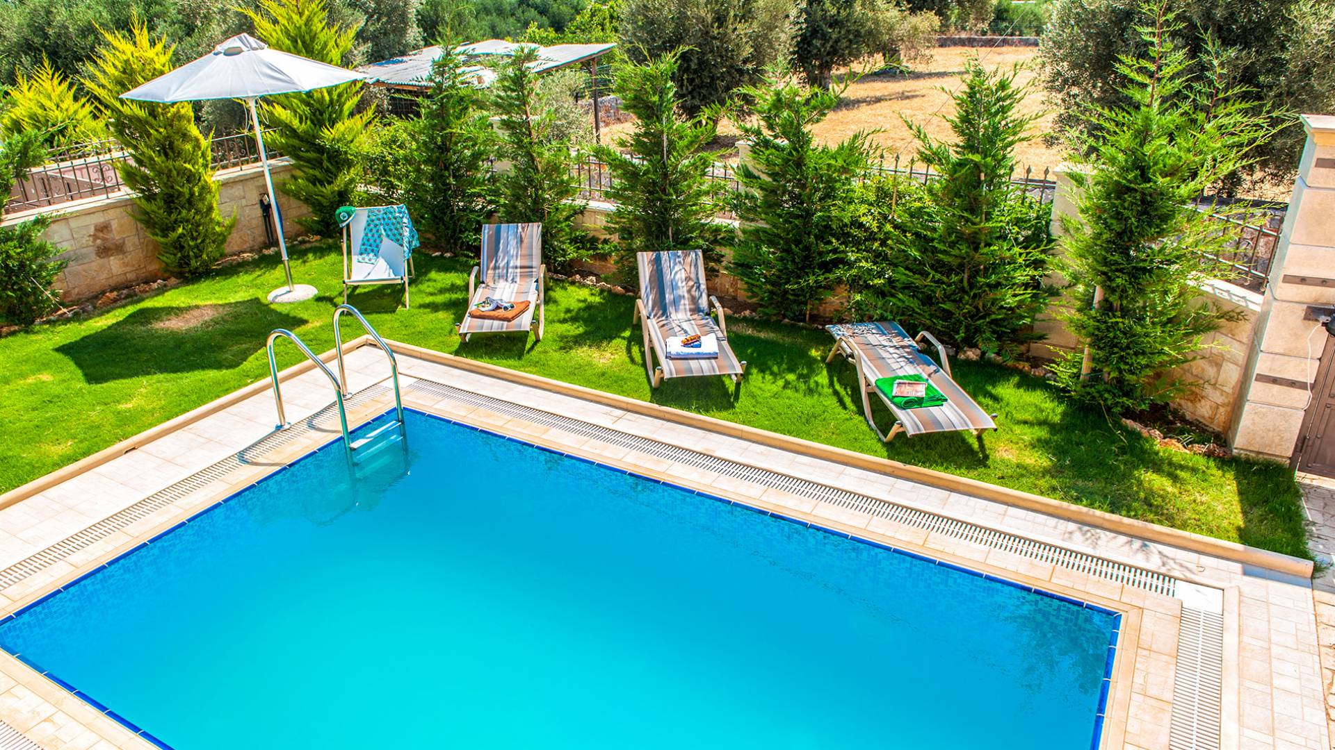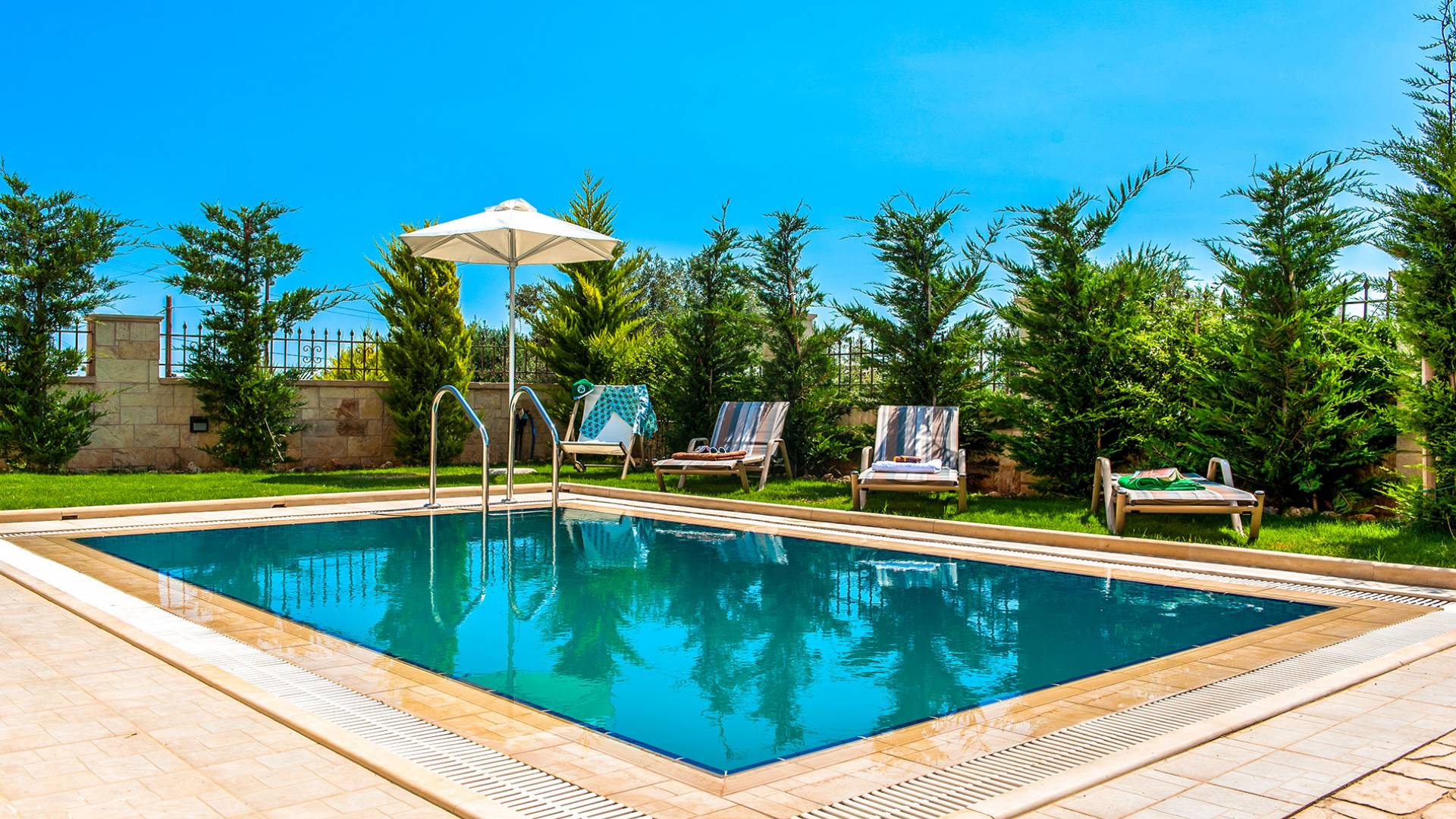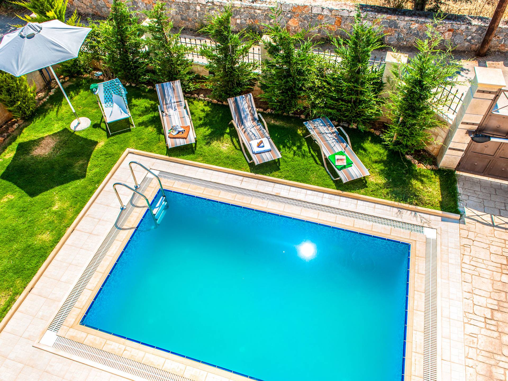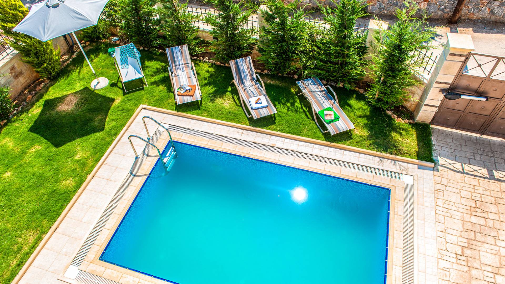 Die anderen beiden Schlafzimmer haben kleine Balkone. Auf der ersten Etage befindet sich auch ein Badezimmer mit Whirlpool-Badewanne und entspannender geringer Hintergrundbeleuchtung. Im Keller gibt es ein Duschbad und eine Waschmaschine. Hana Villa Rethymno ist mit Sat-TV, Klimaanlage, Safe, Geschirrspüler und Waschmaschine ausgestattet und wir bieten auch kostenloses WLAN und ein Babybett bei Bedarf. Die Villa verfügt über einen Garten mit Rasen neben dem Pool, in dem Rosen, Zypressen, Jasmin-Zitronen- und Orangenbäume gepflanzt sind und an einer Ecke befindet sich auch ein Grill. Rund um den Swimmingpool stehen Liegestühle und ein Sonnenschirm. Hana Villa Crete verfügt auch über einen privaten Parkplatz im Freien, der mit einer automatischen Tür geöffnet wird.