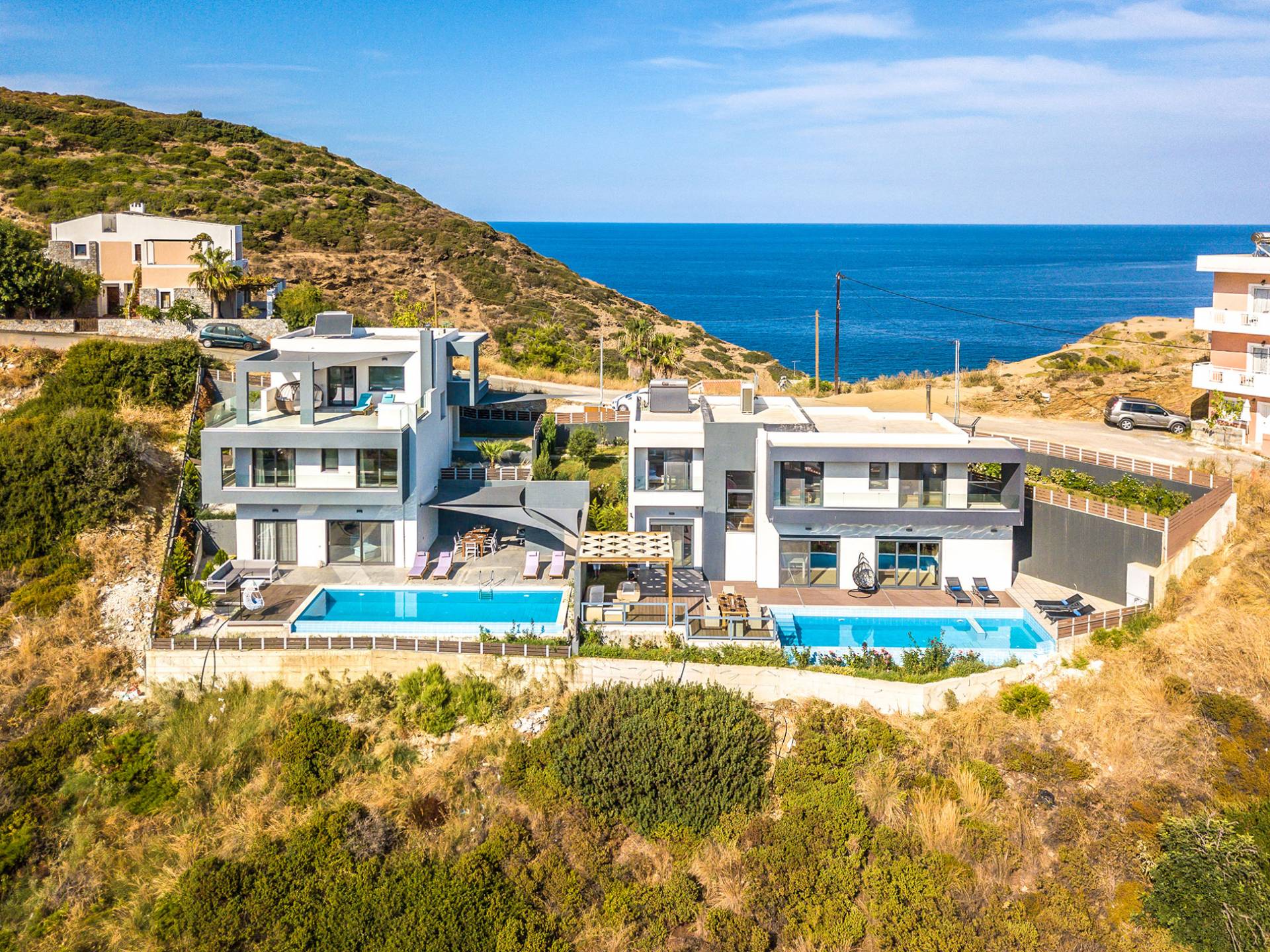 Das offene Design der voll ausgestatteten Küche und des Wohnbereichs sorgt dafür, dass Sie sich entspannt und wohl fühlen. Die hohe Qualität der Möbel und der herrliche Ausblick aus den bodentiefen Fenstern gelten als einzigartig. Die drei Schlafzimmer sind hochwertig ausgestattet und verfügen über alle erforderlichen Einrichtungen. Das Badezimmer bietet auch eine Jacuzzi-Wanne für einzigartige Entspannungszeiten. Der private Infinity-Pool ist einzigartig und bietet einen atemberaubenden Blick auf die Umgebung. Villa Elli Kreta ist eine einzigartige Wahl, um Ihren Urlaub zu verbringen und den Sommer auf Kreta zu genießen.
