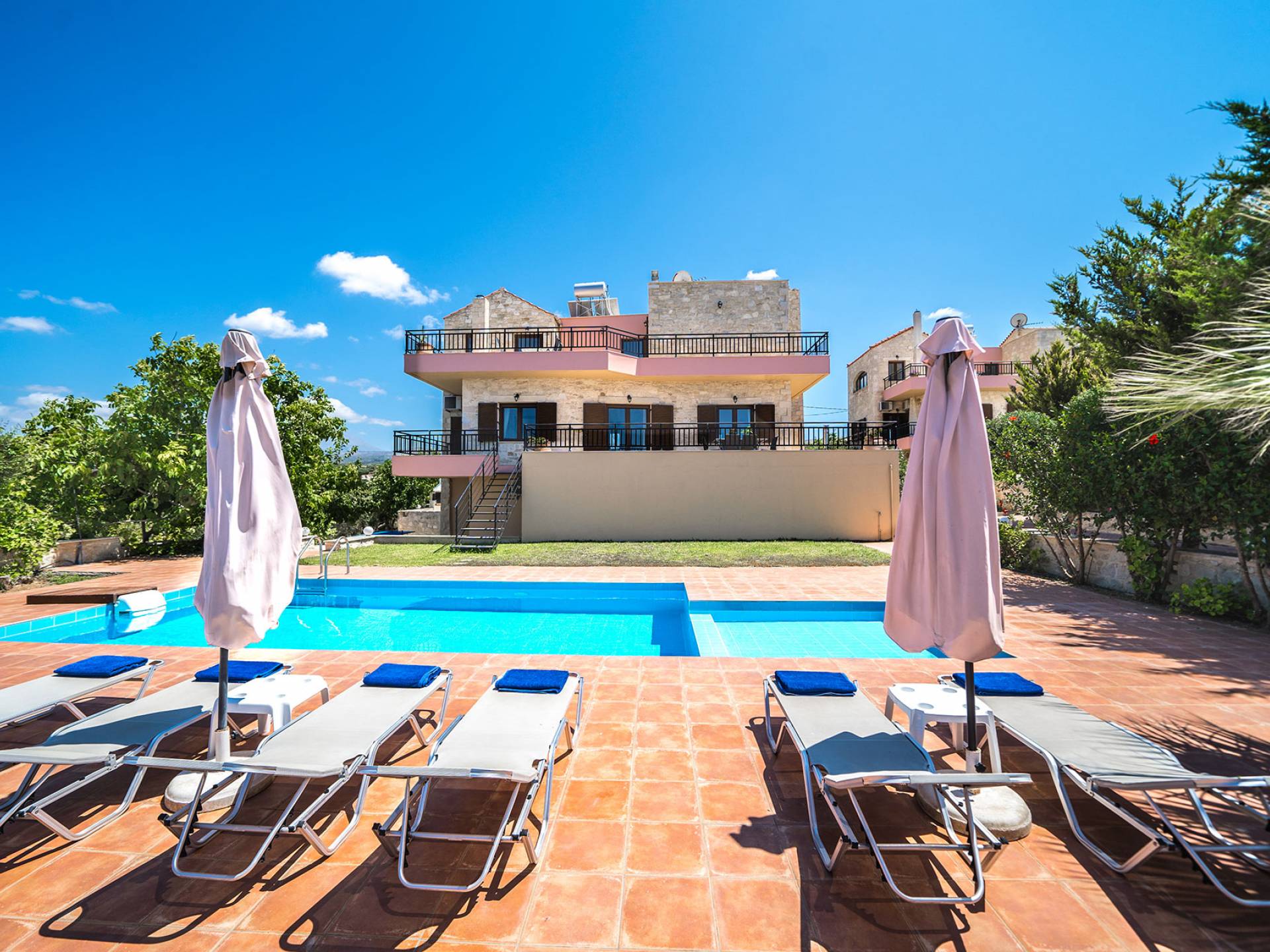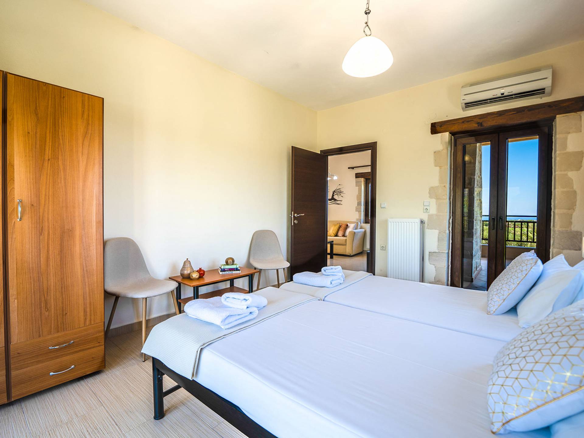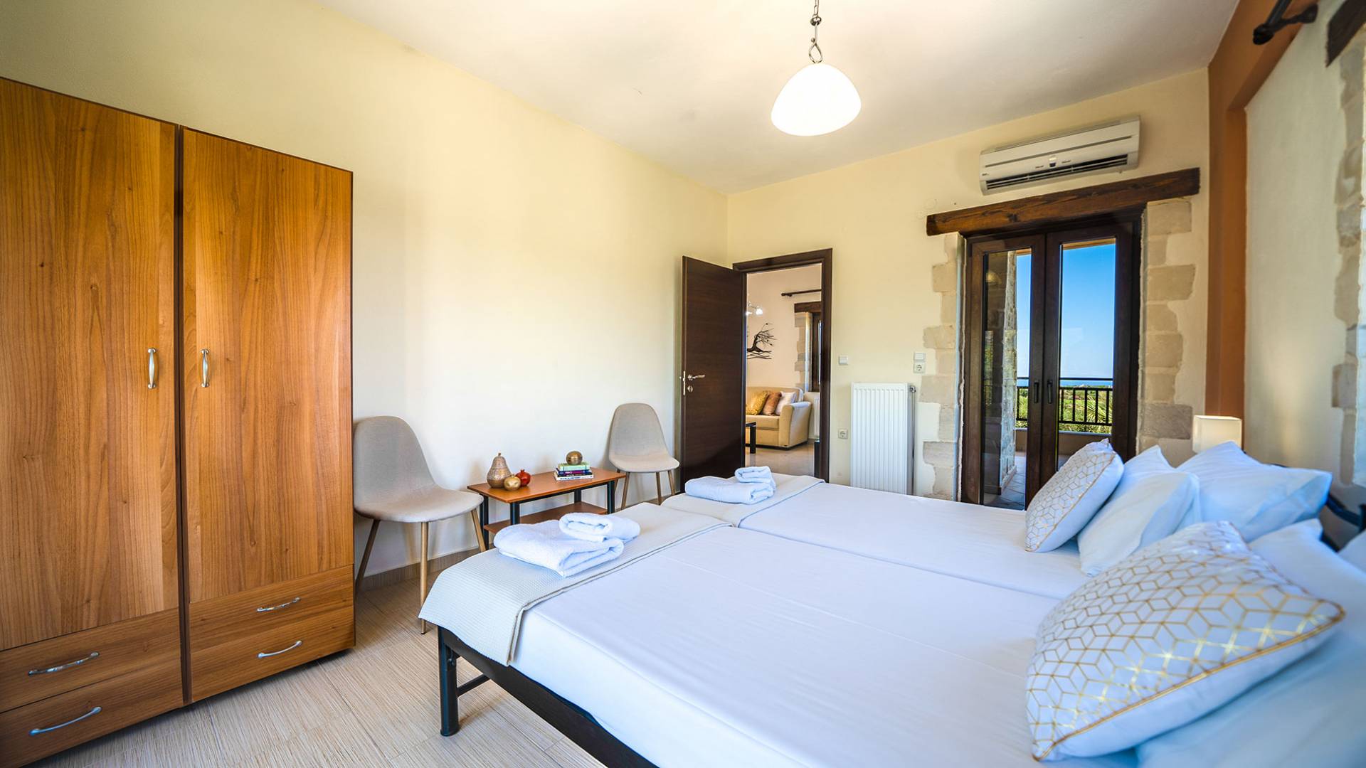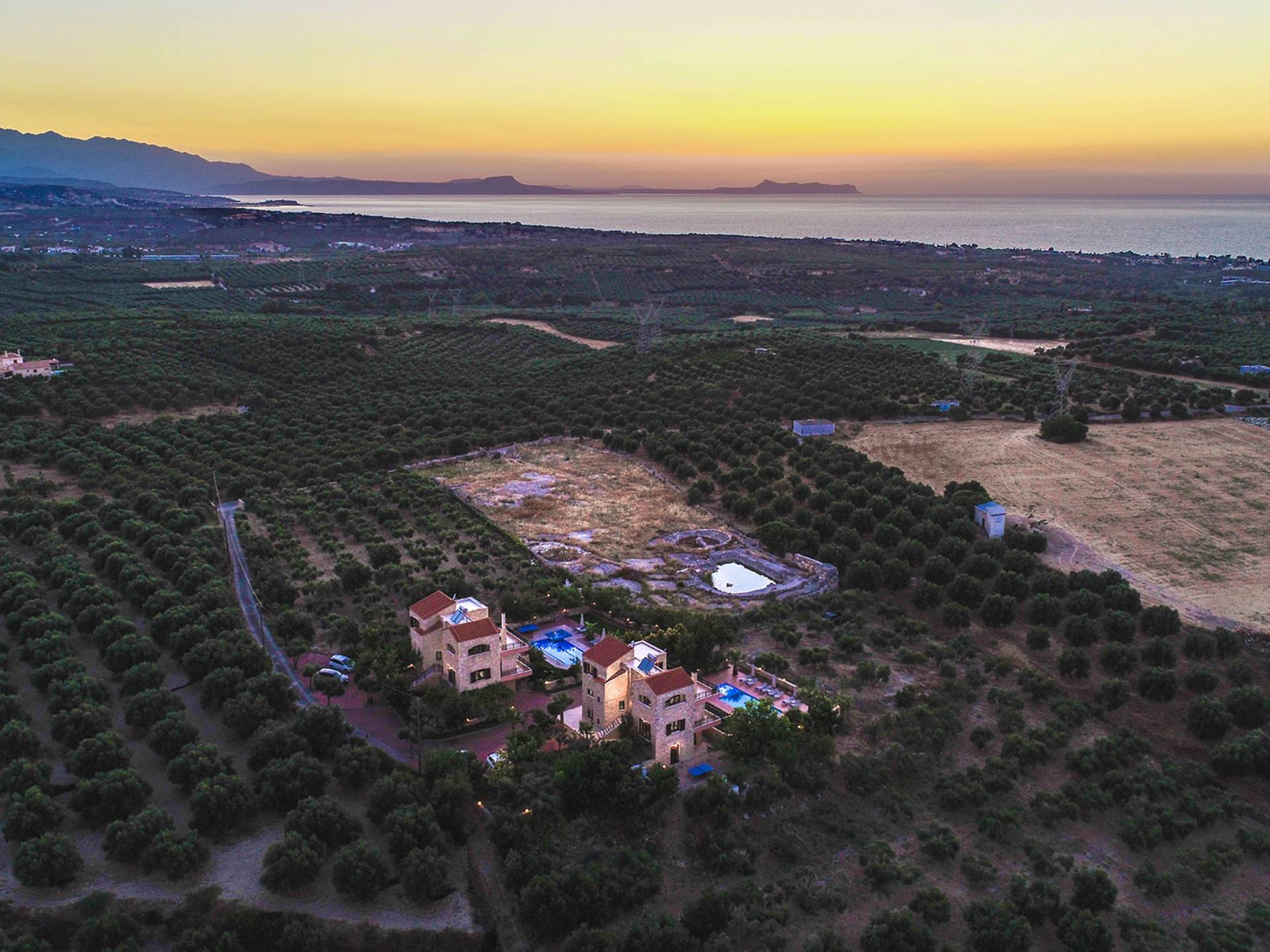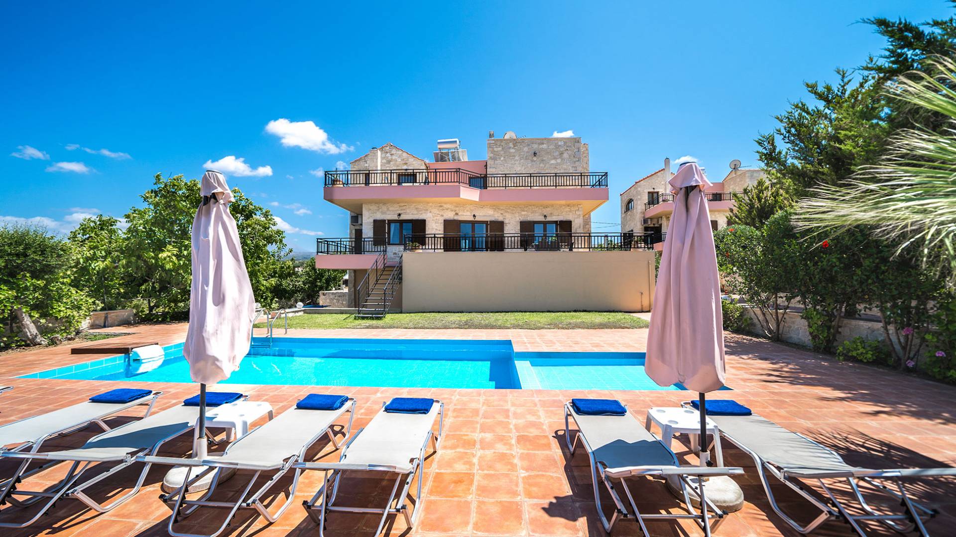 Jede Villa besteht aus einem geräumigen Interieur, vier Doppelzimmern, einem Wohnzimmer, einem Esszimmer, einem traditionellen Kamin, zwei Badezimmern, einer voll ausgestatteten Küche, einem halben Außenbereich und großen Veranden. Alle Zimmer haben einen Gesamtblick auf die einzigartige kretische Landschaft. Großer Wert wird auf die Dekoration gelegt, die einfachen, modernen Linien folgt, die variieren, mit persönlichen Akzenten, die in jeder Villa unterschiedlich sind, um sie einzigartig zu machen. Die Umgebung beider Villen ist von einem Garten mit Rasen, Blumenbeeten mit bunten Blumen und einem privaten Swimmingpool umgeben und bietet Möglichkeiten zum Entspannen und Wohlfühlen. Jede Villa hat einen eigenen Grill für unvergessliche Grillabende.