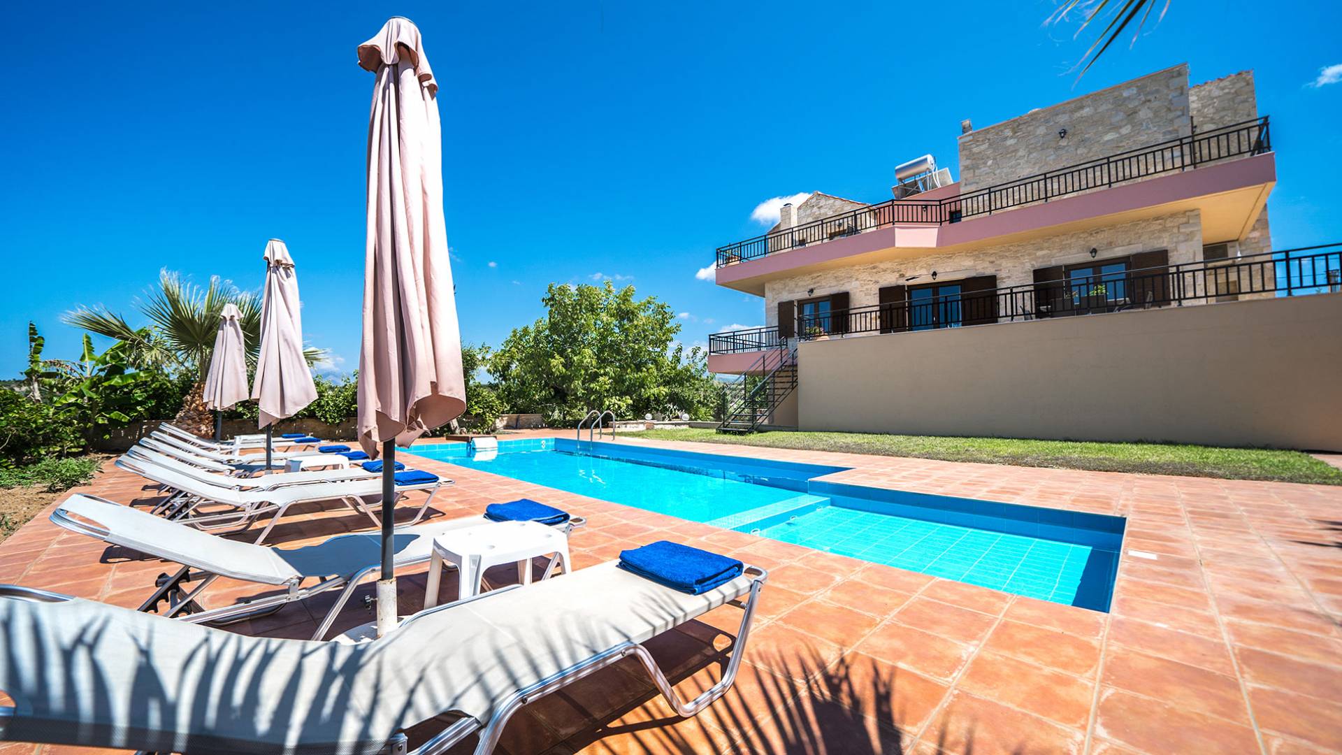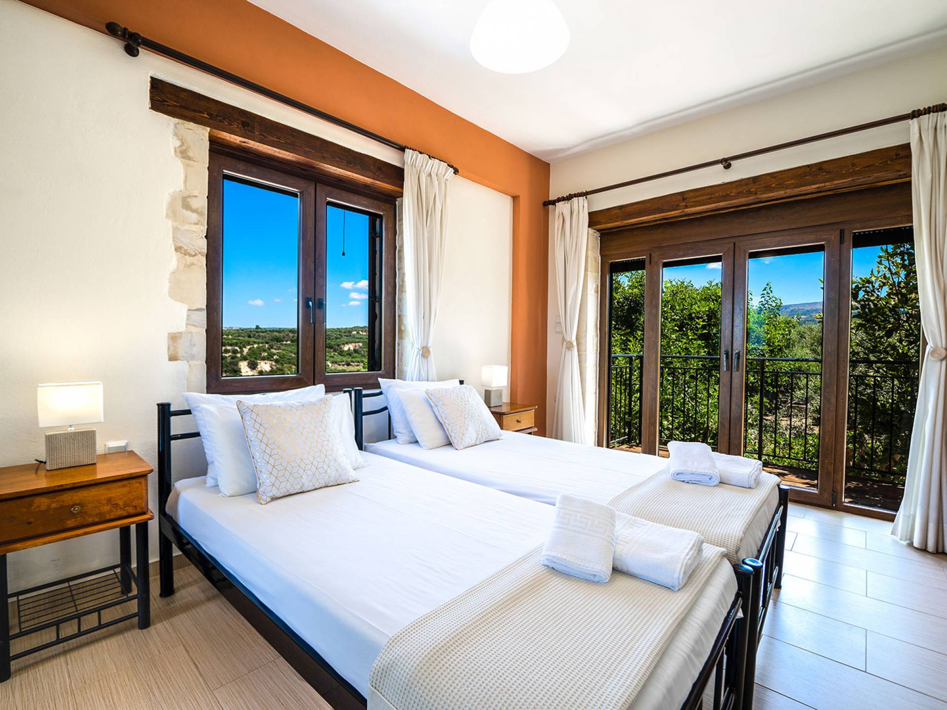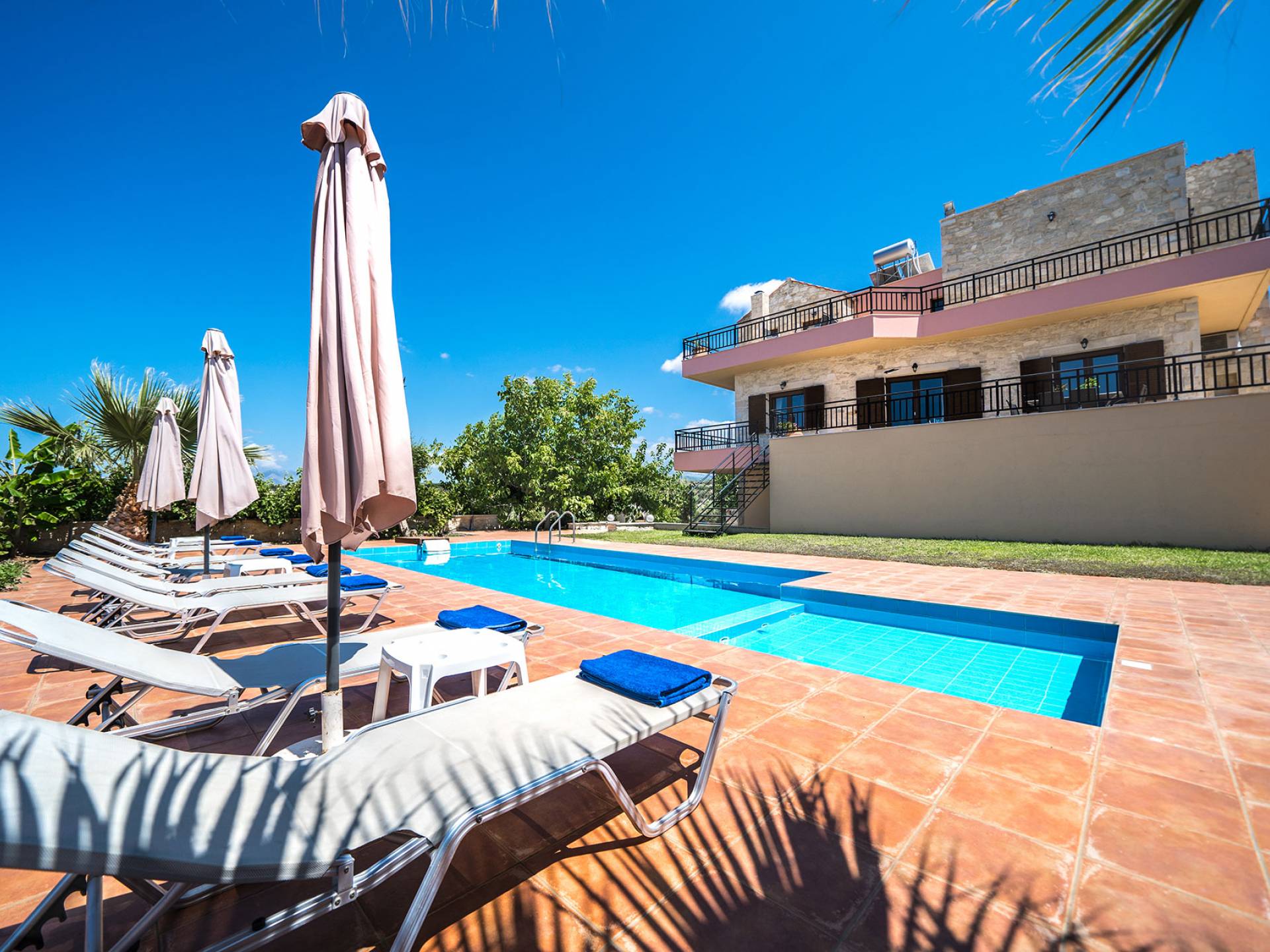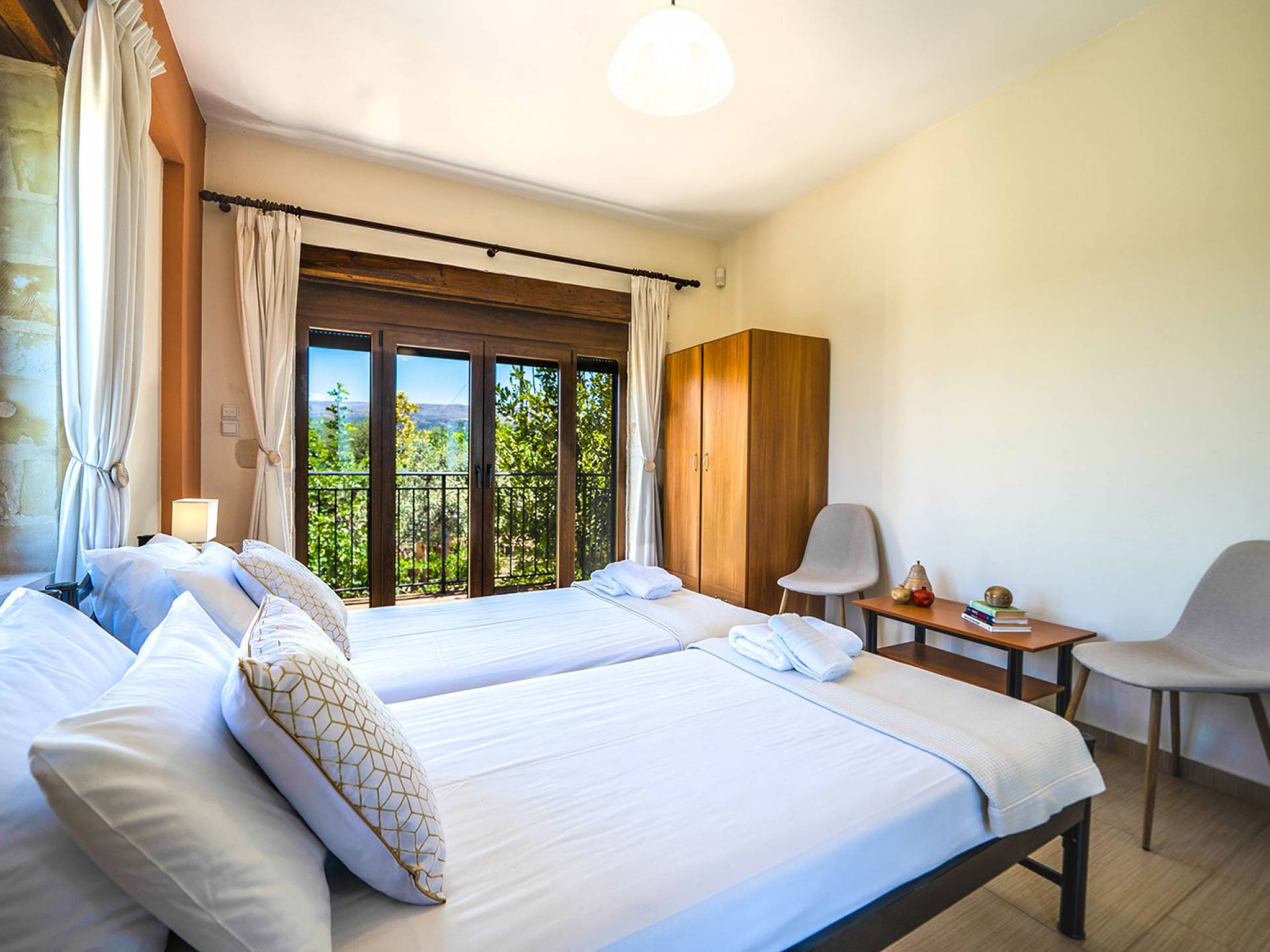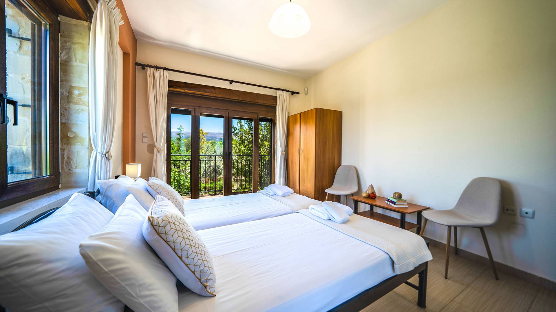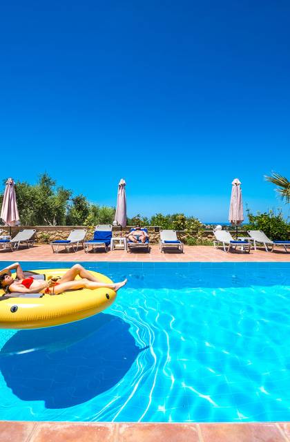 Jede Villa besteht aus einem geräumigen Interieur, vier Doppelzimmern, einem Wohnzimmer, einem Esszimmer, einem traditionellen Kamin, zwei Badezimmern, einer voll ausgestatteten Küche, einem halben Außenbereich und großen Veranden. Alle Zimmer haben einen Gesamtblick auf die einzigartige kretische Landschaft. Großer Wert wird auf die Dekoration gelegt, die einfachen, modernen Linien folgt, die variieren, mit persönlichen Akzenten, die in jeder Villa unterschiedlich sind, um sie einzigartig zu machen. Die Umgebung beider Villen ist von einem Garten mit Rasen, Blumenbeeten mit bunten Blumen und einem privaten Swimmingpool umgeben und bietet Möglichkeiten zum Entspannen und Wohlfühlen. Jede Villa hat einen eigenen Grill für unvergessliche Grillabende.