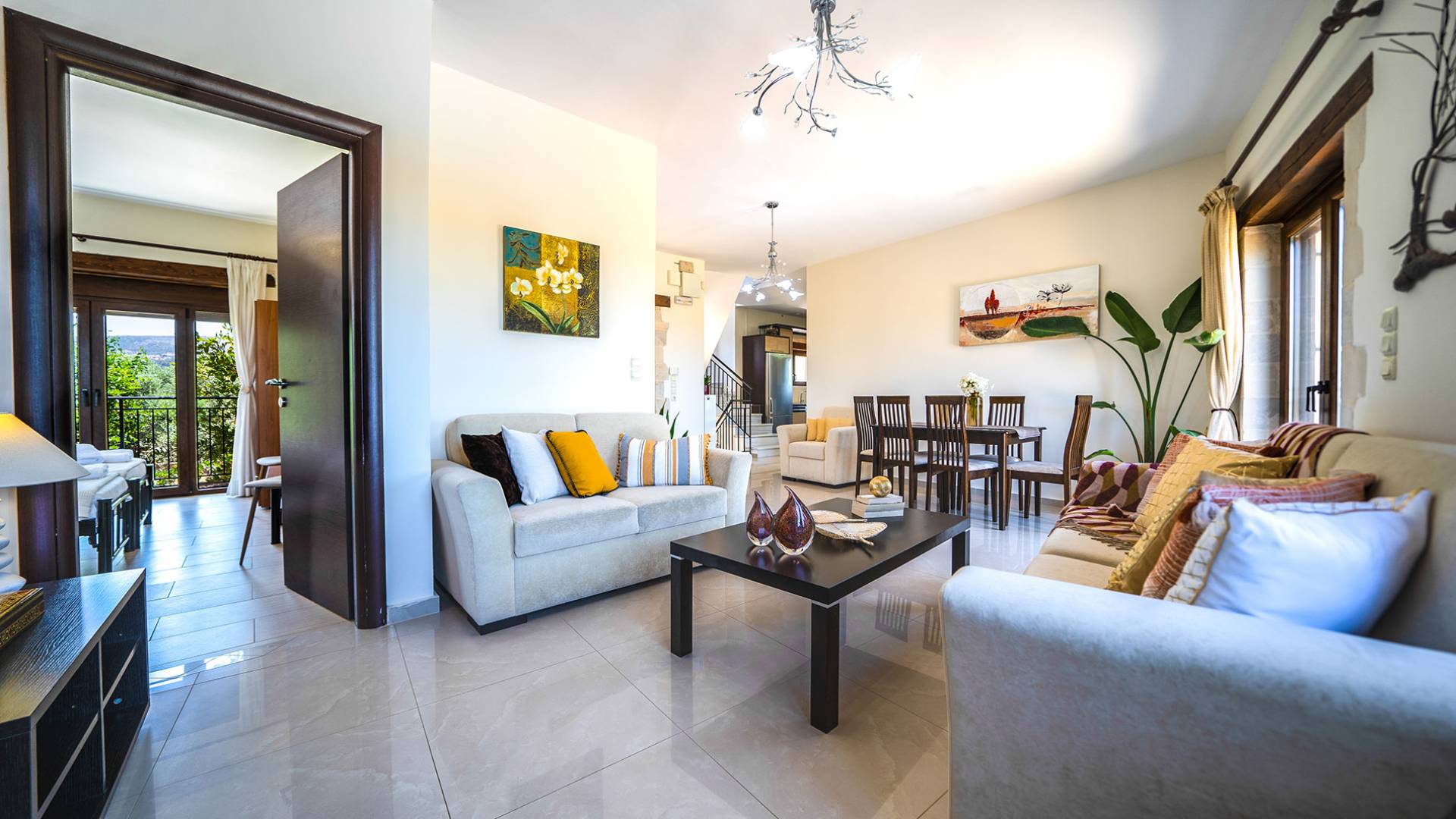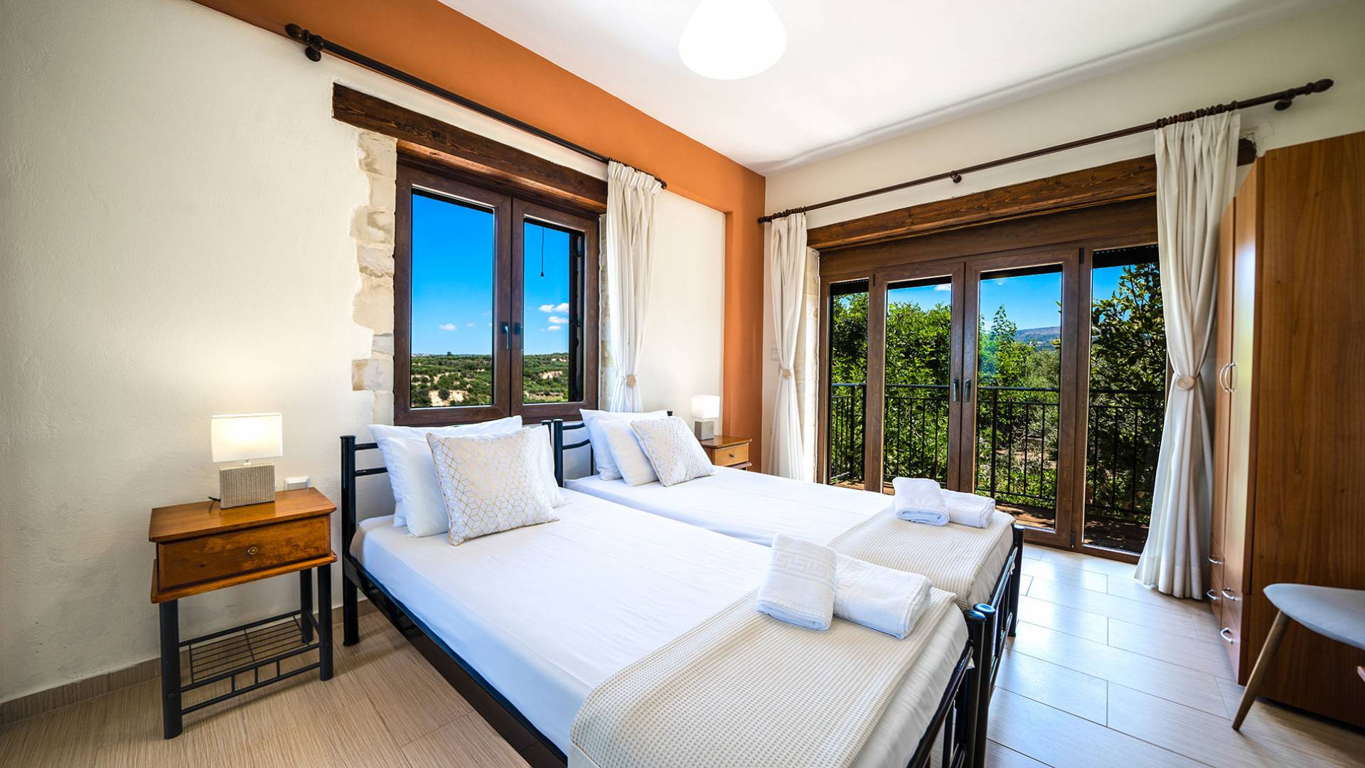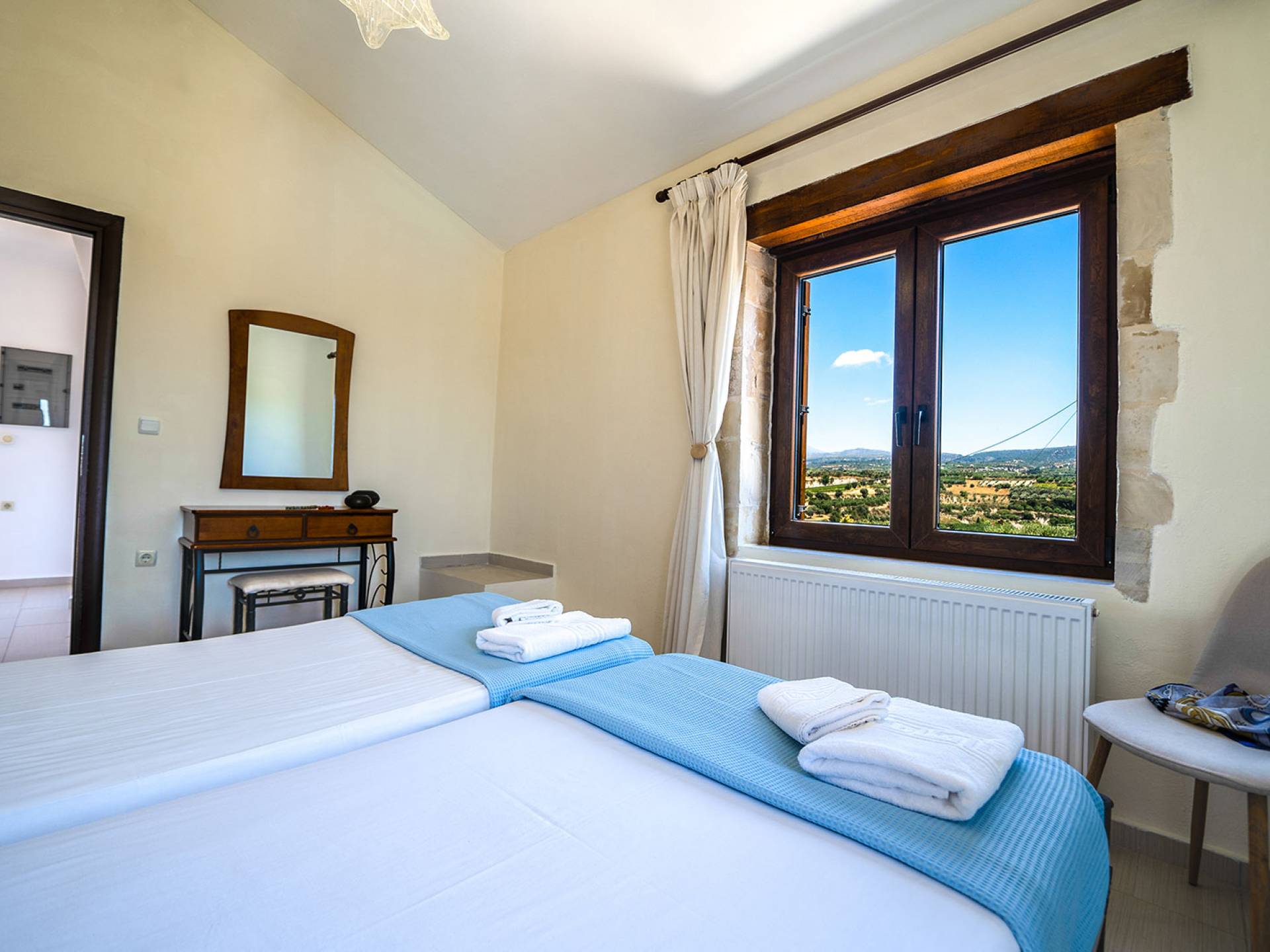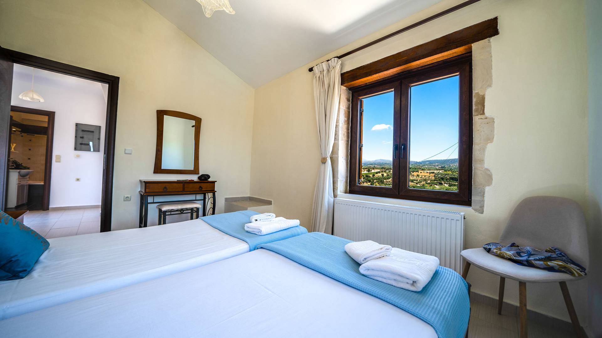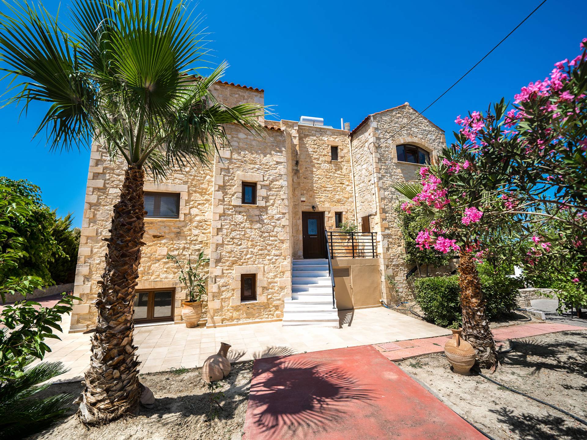 Jede Villa besteht aus einem geräumigen Interieur, vier Doppelzimmern, einem Wohnzimmer, einem Esszimmer, einem traditionellen Kamin, zwei Badezimmern, einer voll ausgestatteten Küche, einem halben Außenbereich und großen Veranden. Alle Zimmer haben einen Gesamtblick auf die einzigartige kretische Landschaft. Großer Wert wird auf die Dekoration gelegt, die einfachen, modernen Linien folgt, die variieren, mit persönlichen Akzenten, die in jeder Villa unterschiedlich sind, um sie einzigartig zu machen. Die Umgebung beider Villen ist von einem Garten mit Rasen, Blumenbeeten mit bunten Blumen und einem privaten Swimmingpool umgeben und bietet Möglichkeiten zum Entspannen und Wohlfühlen. Jede Villa hat einen eigenen Grill für unvergessliche Grillabende.