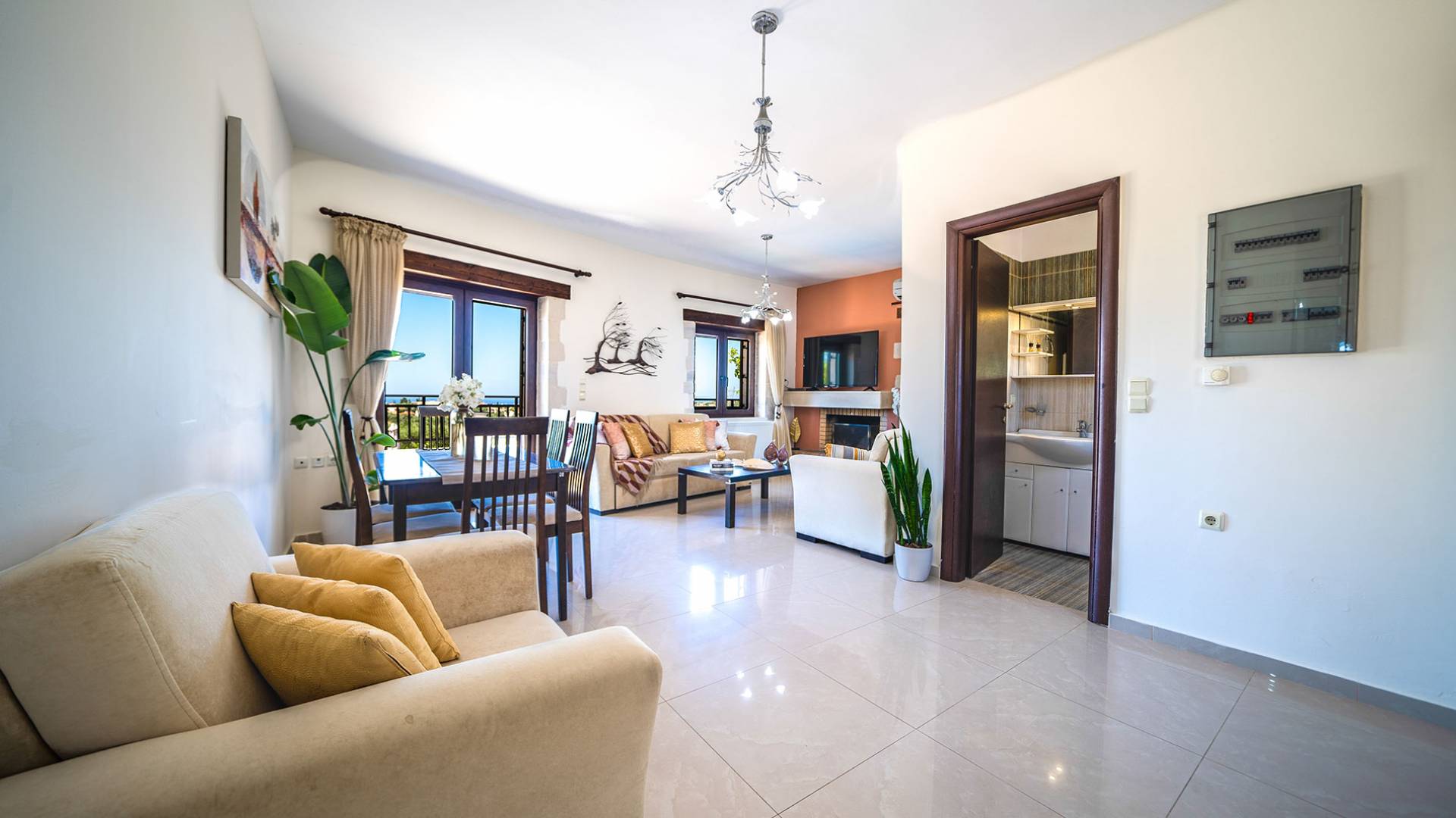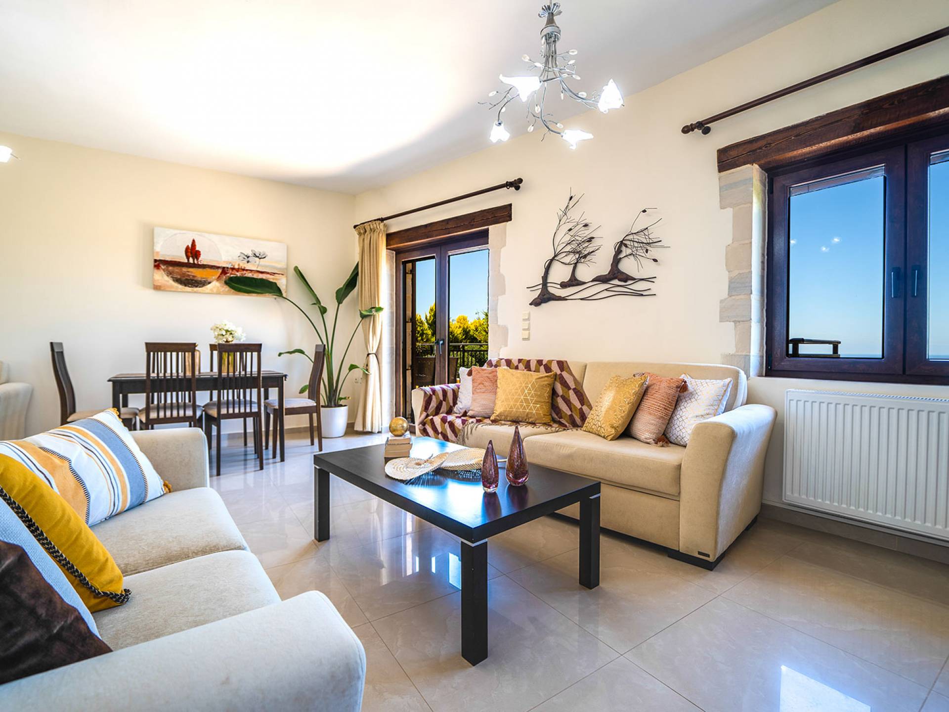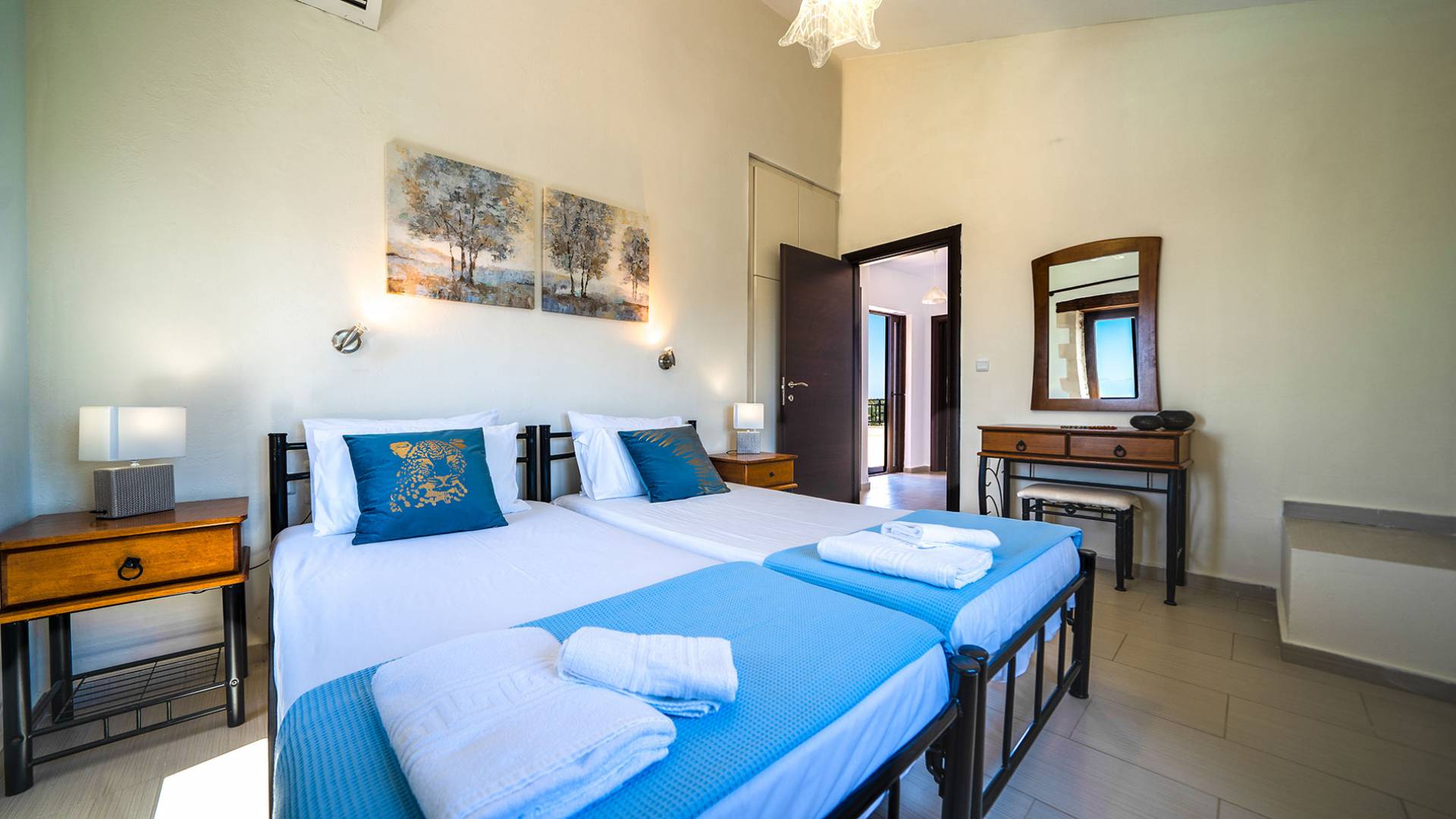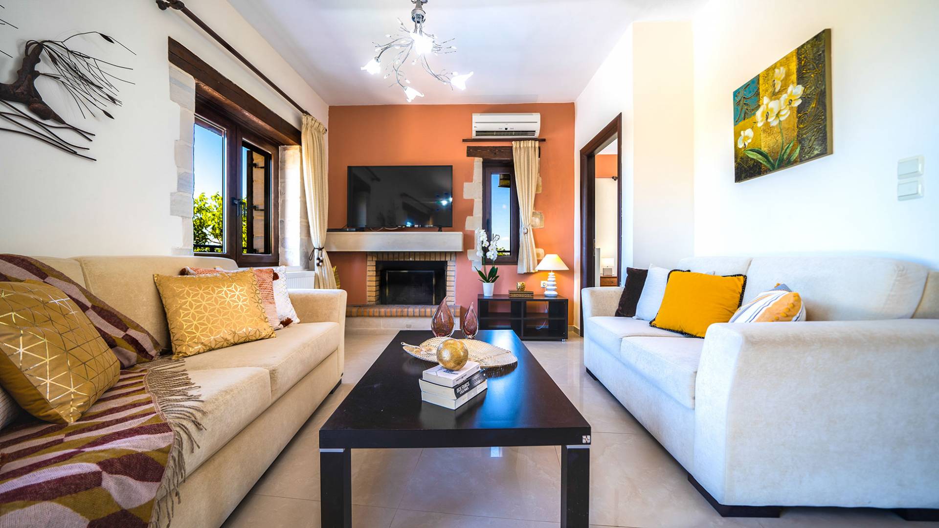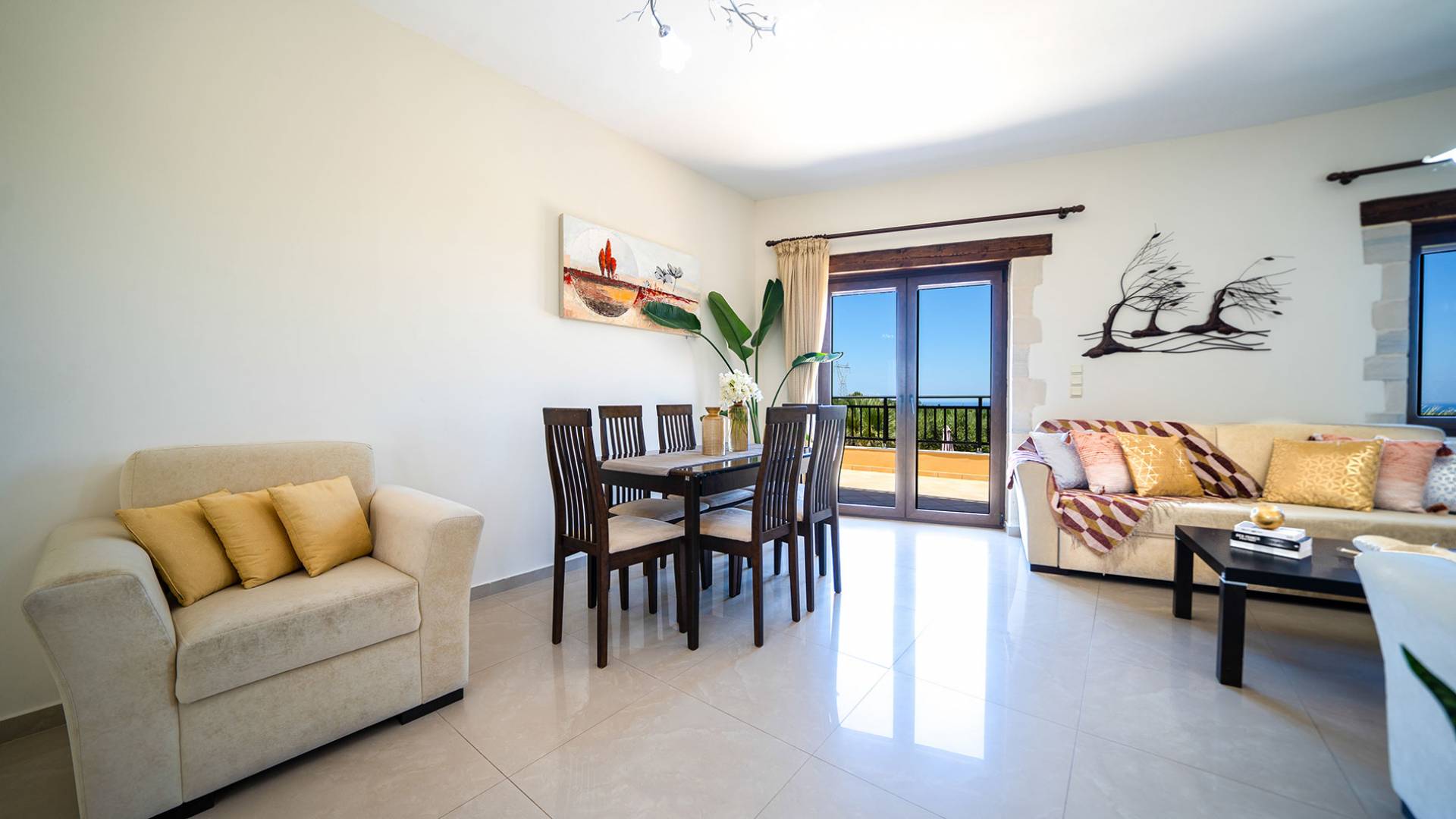 Jede Villa besteht aus einem geräumigen Interieur, vier Doppelzimmern, einem Wohnzimmer, einem Esszimmer, einem traditionellen Kamin, zwei Badezimmern, einer voll ausgestatteten Küche, einem halben Außenbereich und großen Veranden. Alle Zimmer haben einen Gesamtblick auf die einzigartige kretische Landschaft. Großer Wert wird auf die Dekoration gelegt, die einfachen, modernen Linien folgt, die variieren, mit persönlichen Akzenten, die in jeder Villa unterschiedlich sind, um sie einzigartig zu machen. Die Umgebung beider Villen ist von einem Garten mit Rasen, Blumenbeeten mit bunten Blumen und einem privaten Swimmingpool umgeben und bietet Möglichkeiten zum Entspannen und Wohlfühlen. Jede Villa hat einen eigenen Grill für unvergessliche Grillabende.