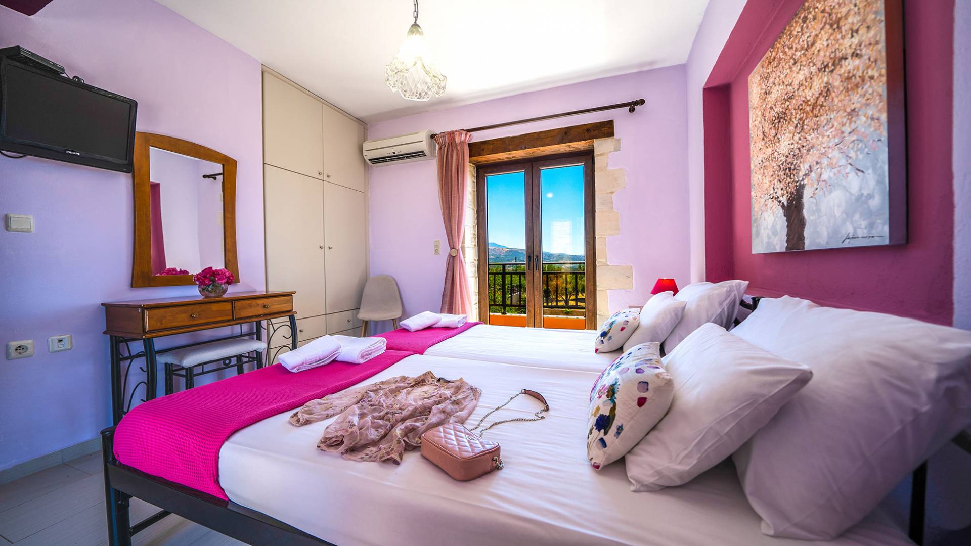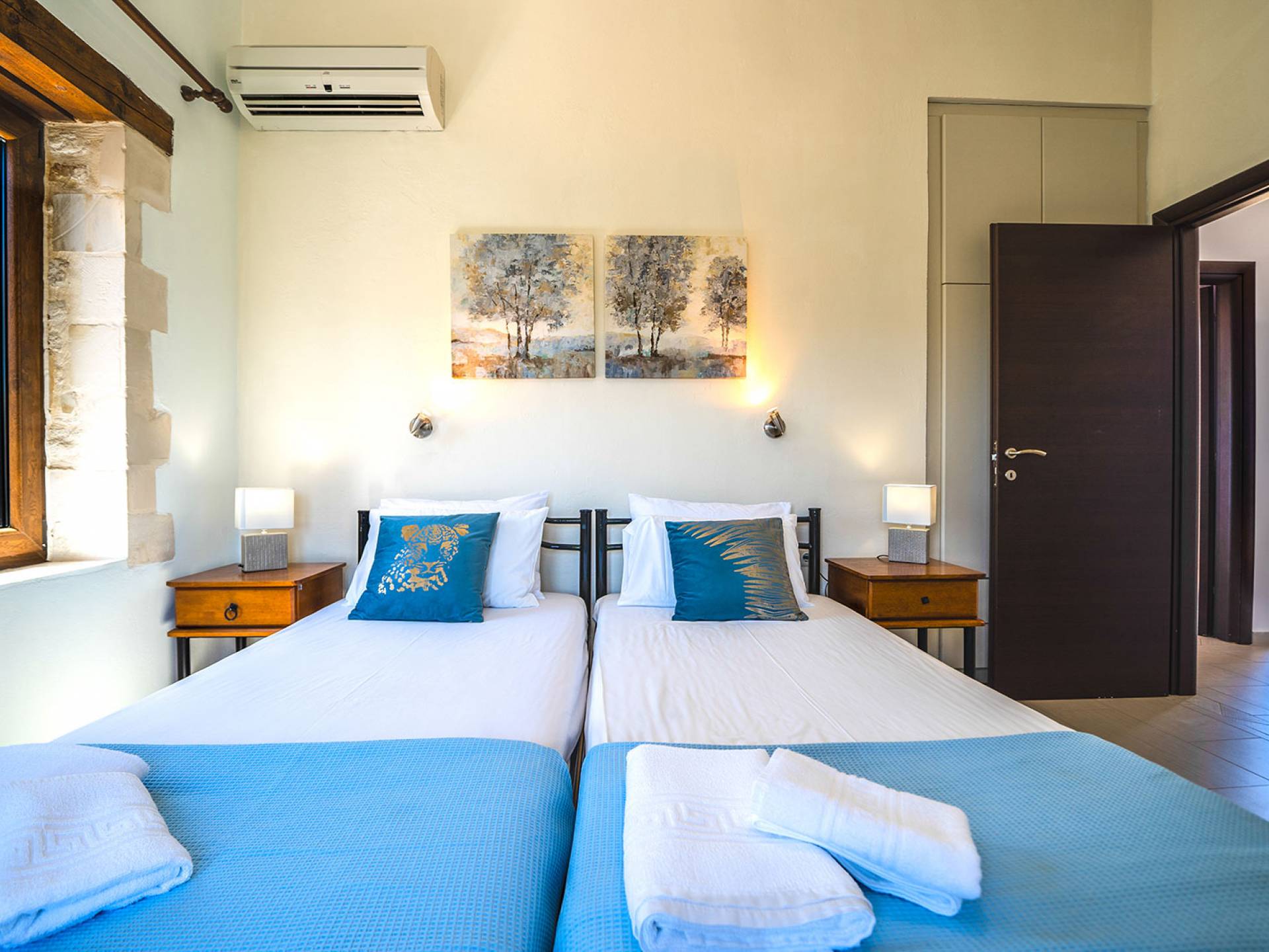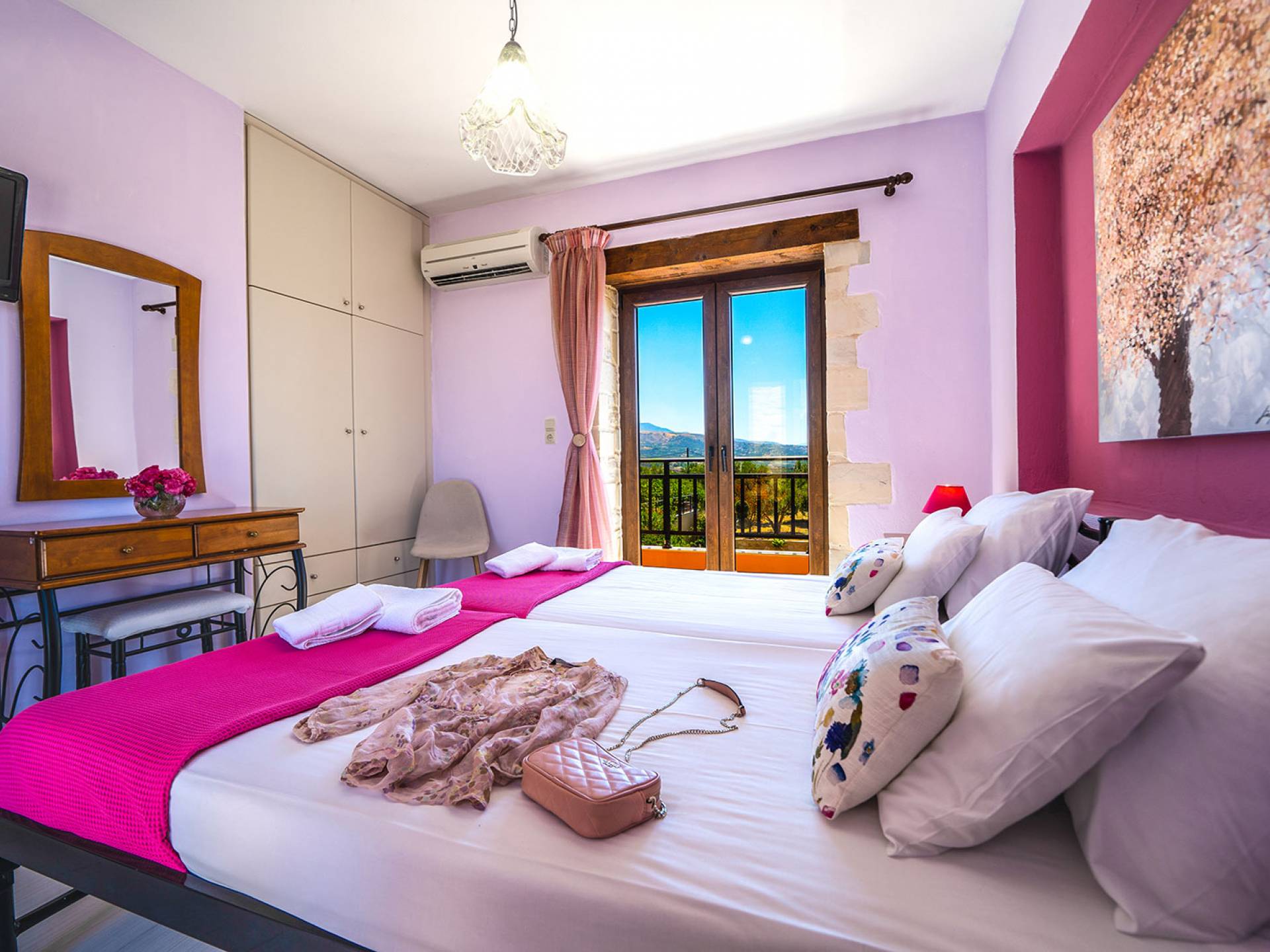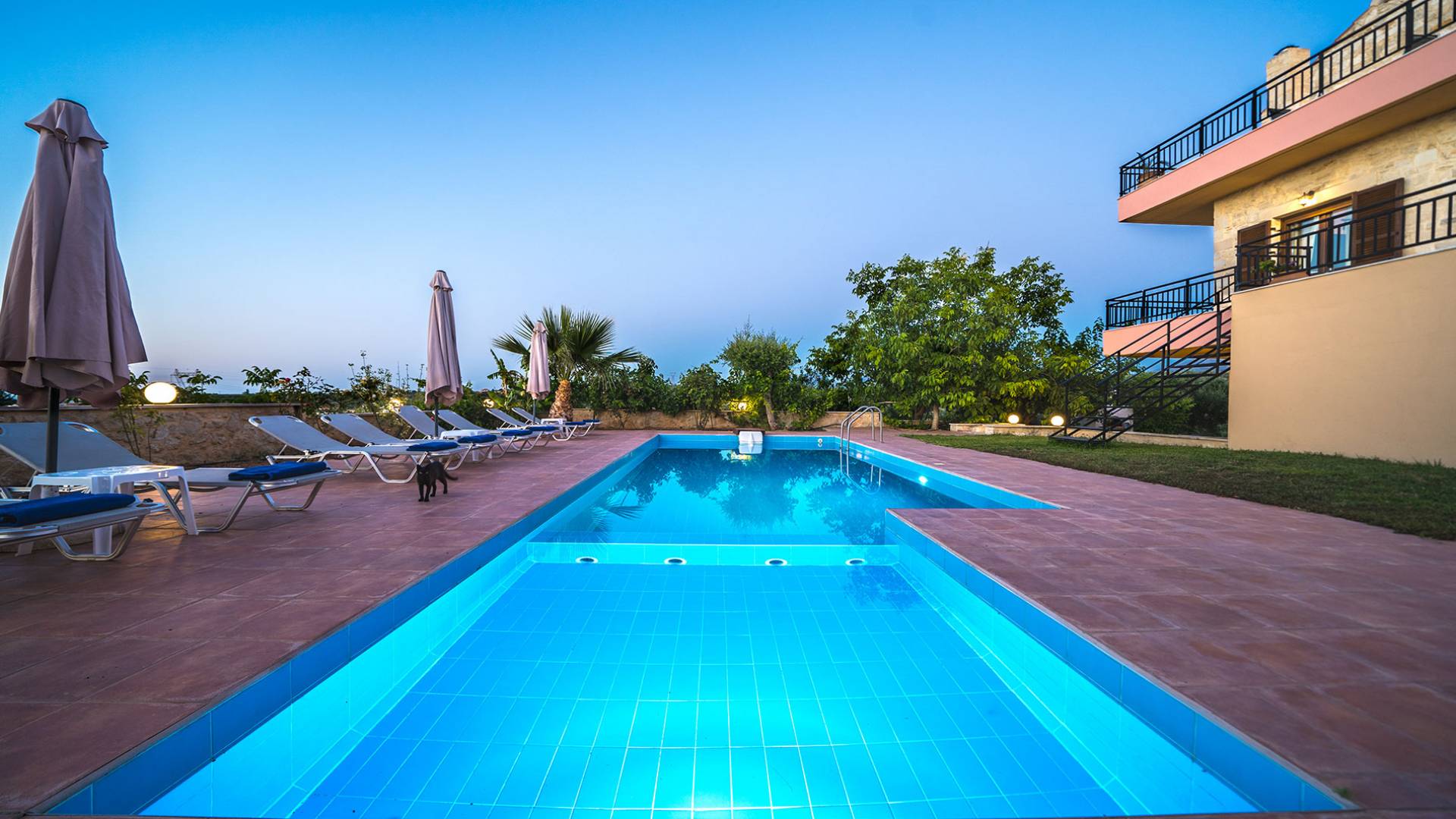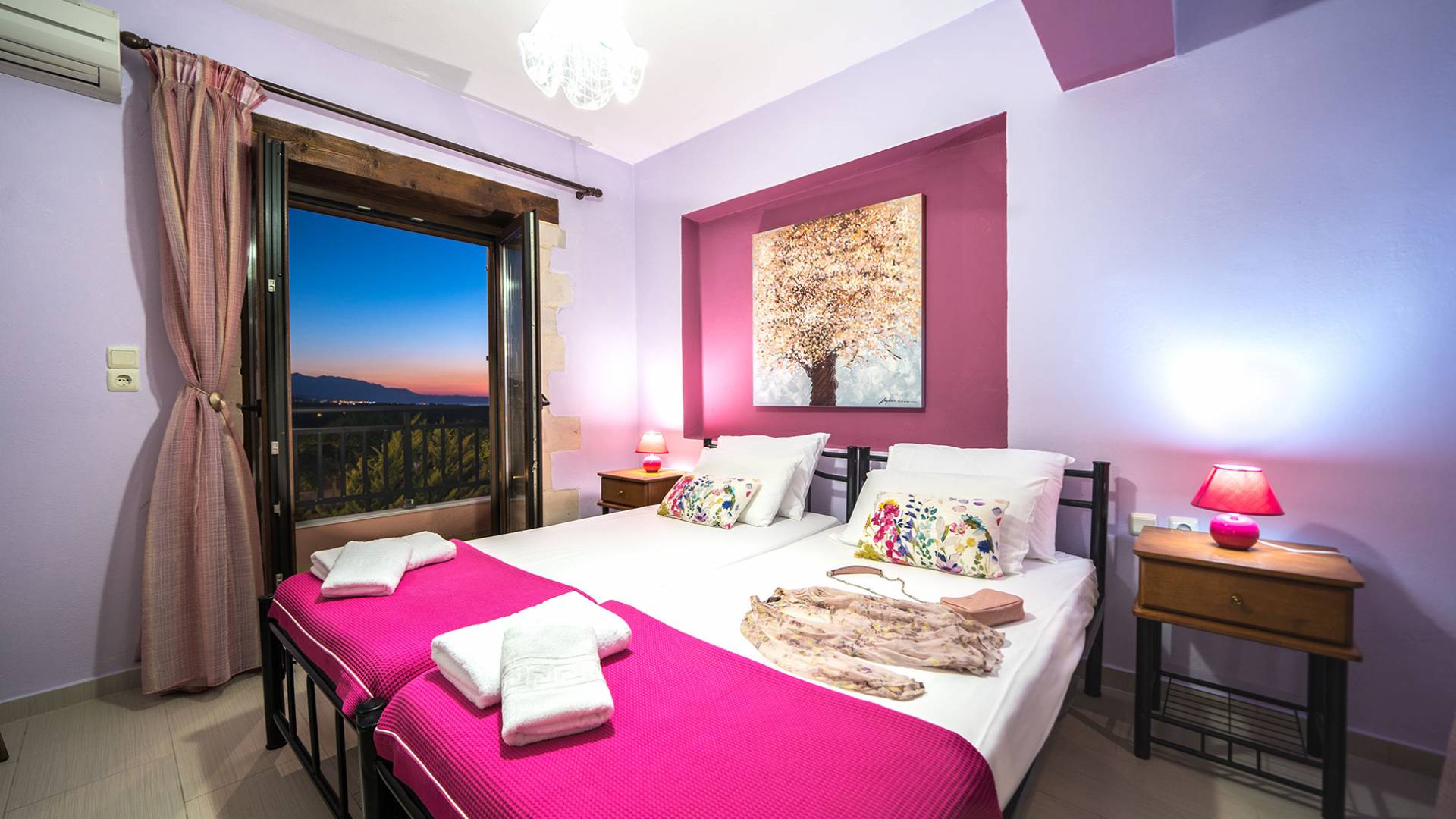 Jede Villa besteht aus einem geräumigen Interieur, vier Doppelzimmern, einem Wohnzimmer, einem Esszimmer, einem traditionellen Kamin, zwei Badezimmern, einer voll ausgestatteten Küche, einem halben Außenbereich und großen Veranden. Alle Zimmer haben einen Gesamtblick auf die einzigartige kretische Landschaft. Großer Wert wird auf die Dekoration gelegt, die einfachen, modernen Linien folgt, die variieren, mit persönlichen Akzenten, die in jeder Villa unterschiedlich sind, um sie einzigartig zu machen. Die Umgebung beider Villen ist von einem Garten mit Rasen, Blumenbeeten mit bunten Blumen und einem privaten Swimmingpool umgeben und bietet Möglichkeiten zum Entspannen und Wohlfühlen. Jede Villa hat einen eigenen Grill für unvergessliche Grillabende.