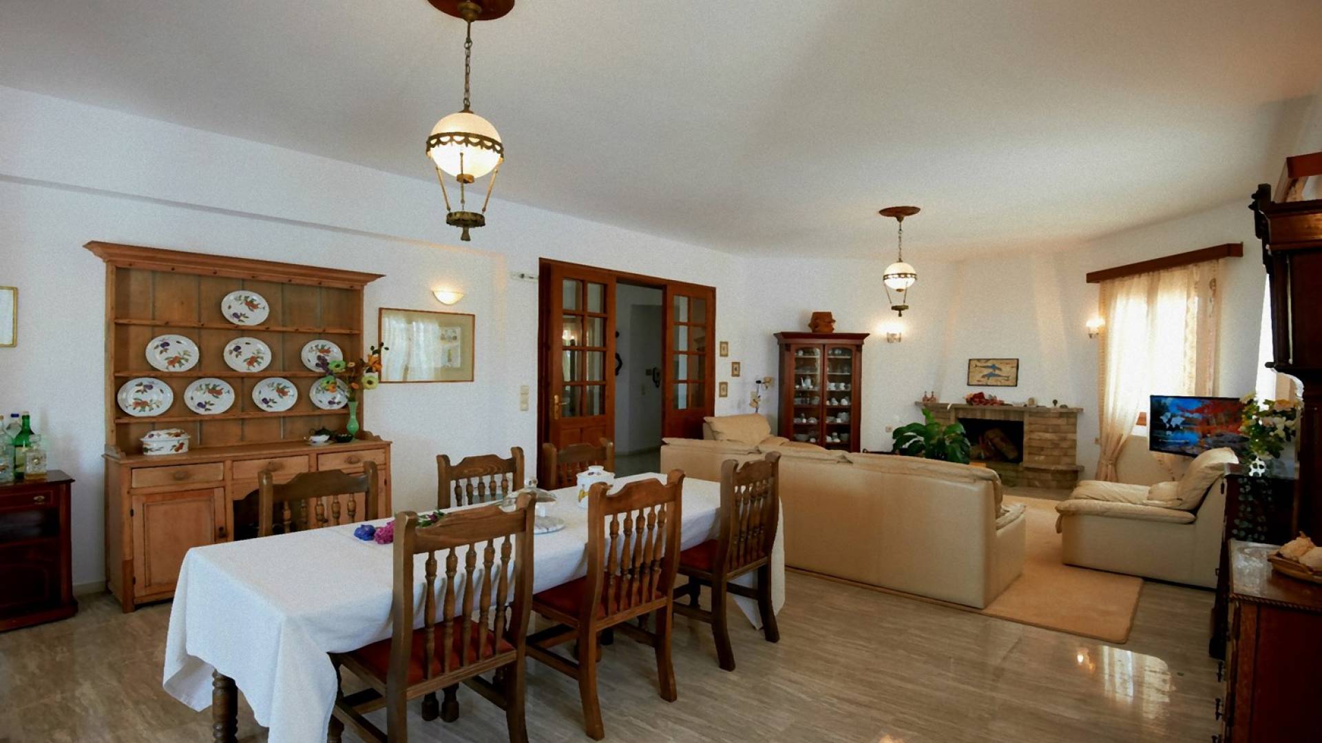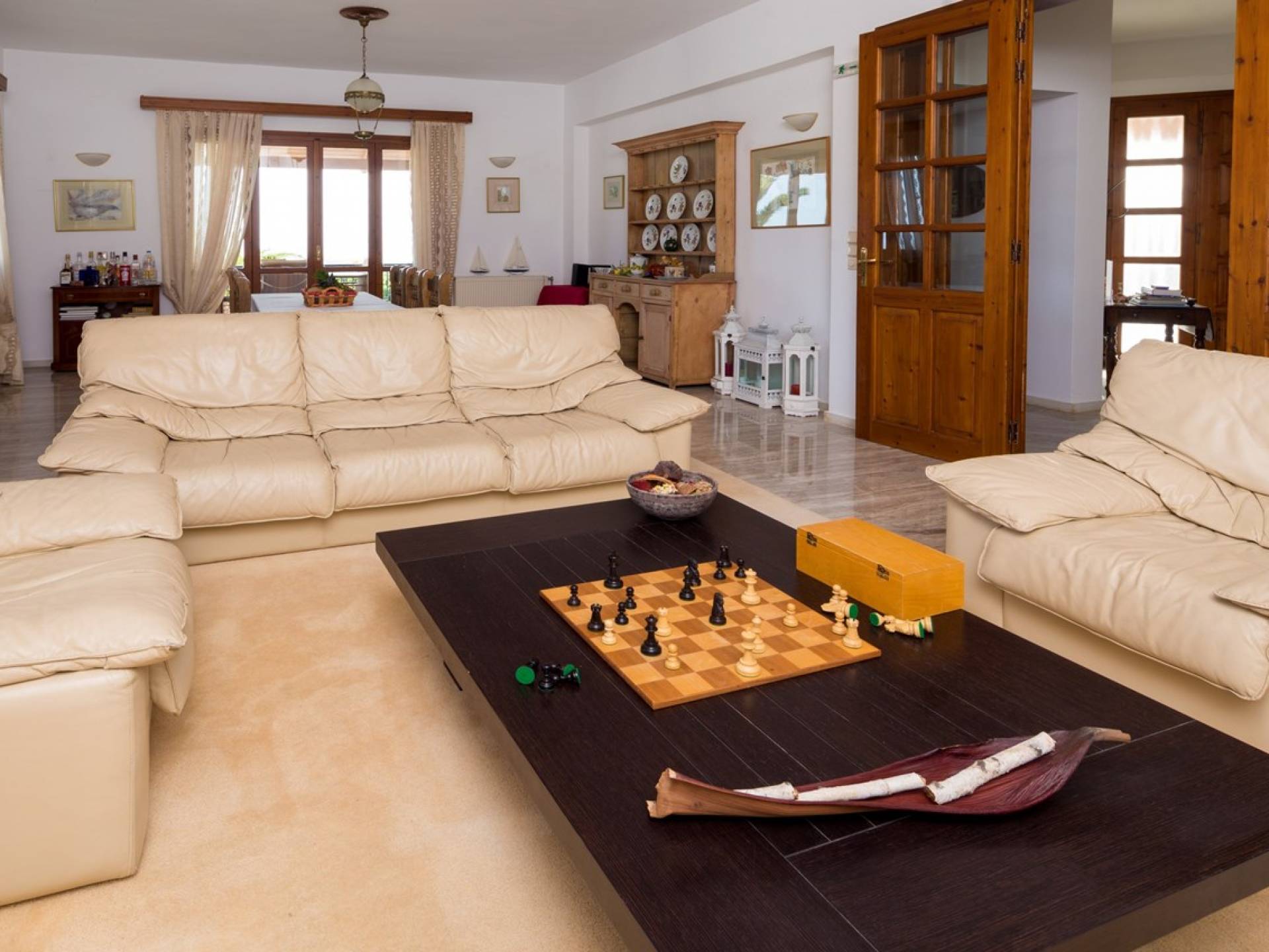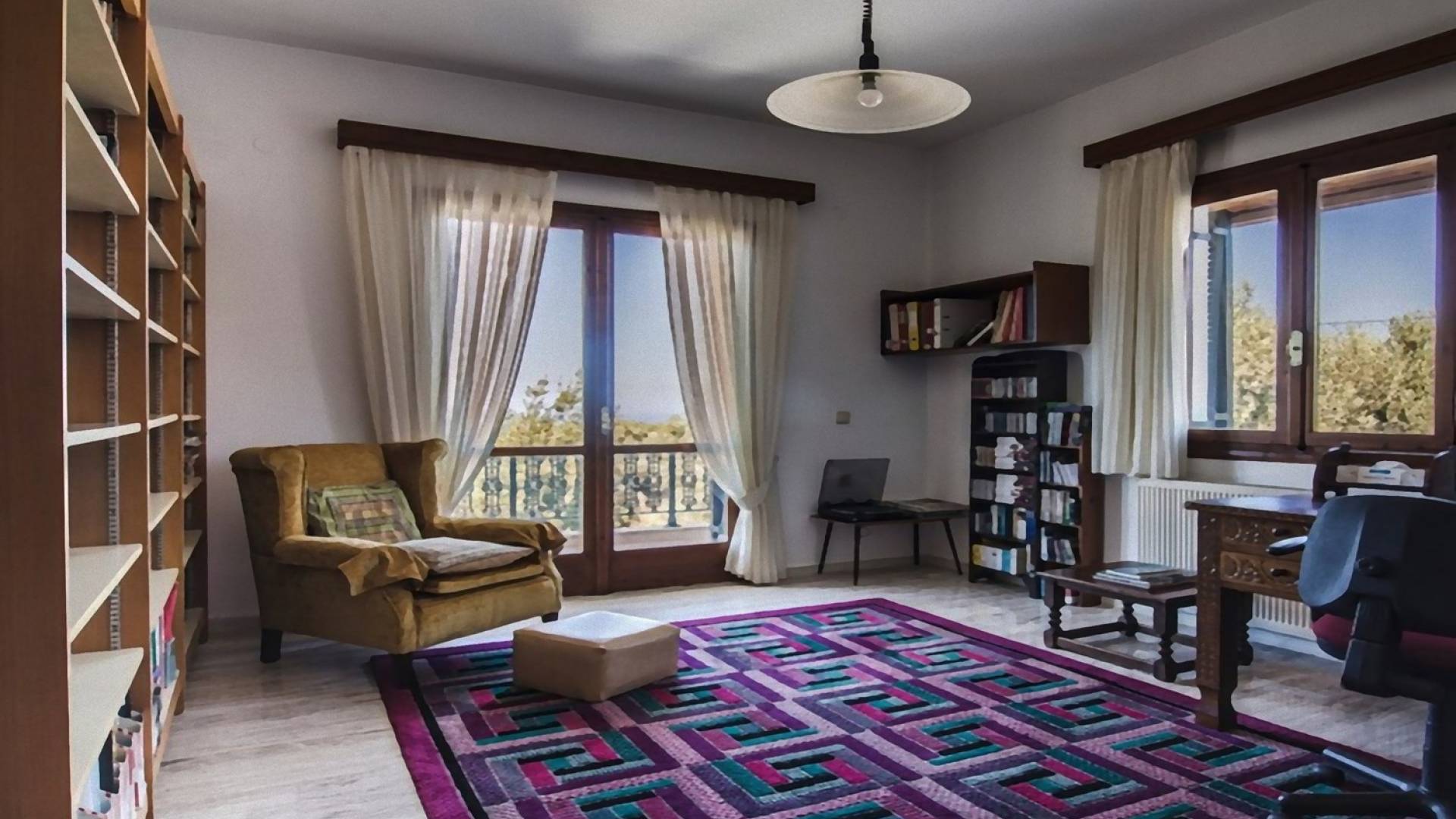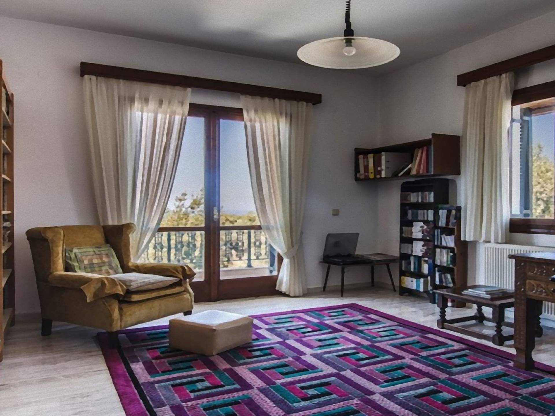 Die Villa verfügt über ein klassisches Wohnzimmer mit antiken Möbelstücken, einen Wohn- und Essbereich, Gemälde mit kretischem Thema und einige andere Annehmlichkeiten wie Satellitenfernsehen und eine tragbare Stereoanlage. Sie führt zu einer zum Ägäischen Meer offenen Veranda mit bequemen Sitzmöbeln, die der Meeresbrise ausgesetzt ist und einen atemberaubenden Blick auf das Meer, die bewaldeten Hügel, die Weißen Berge und – vor allem – die Aussicht auf unglaubliche Sonnenuntergänge! Der Bibliotheksraum enthält mehr als tausend Bücher über Philosophie, Geschichte, Soziologie, Religion, Bildung und Literatur und bietet Momente des ruhigen Lesens.