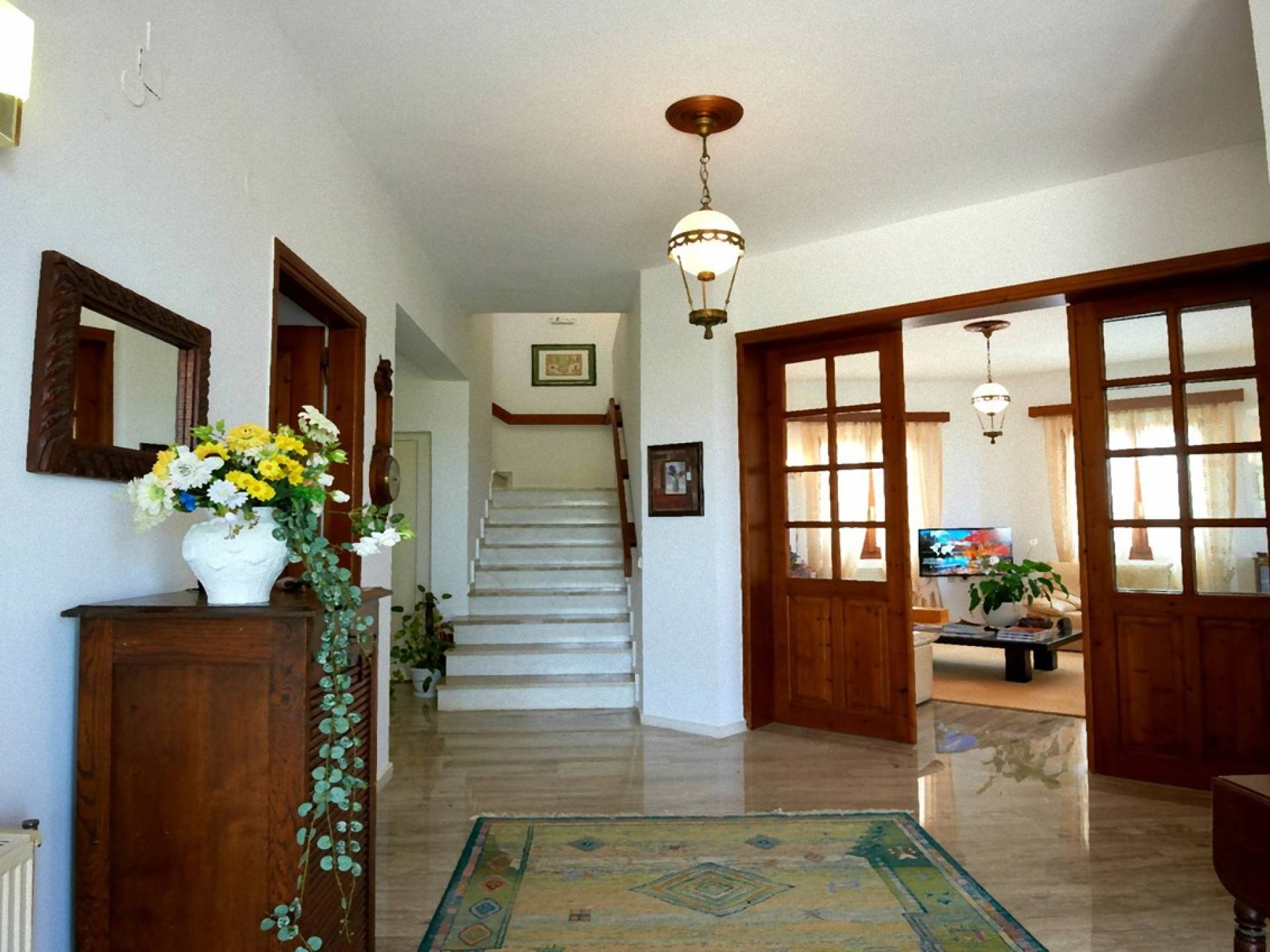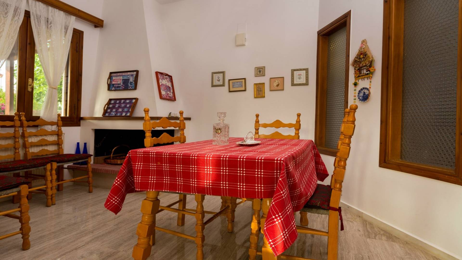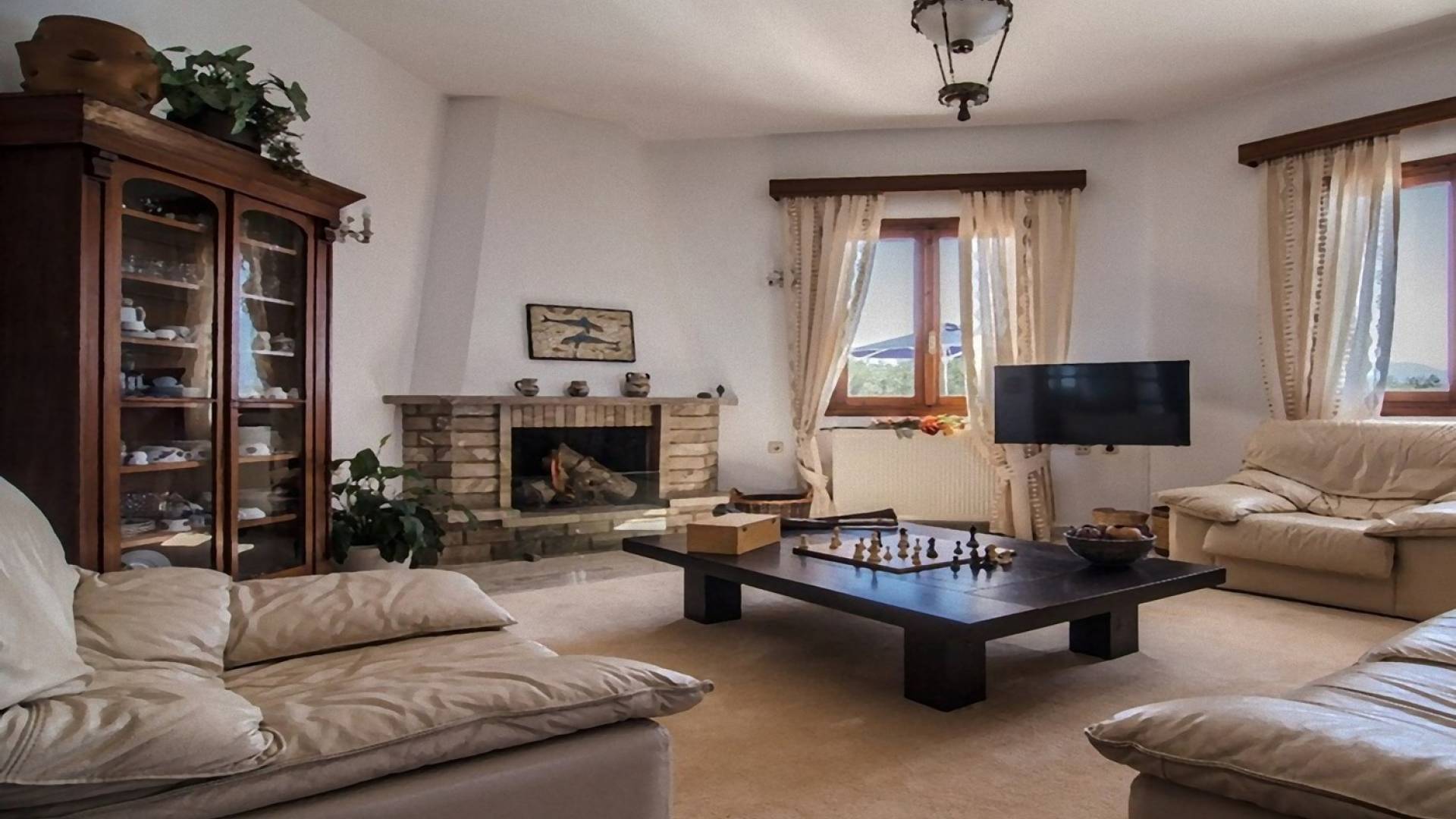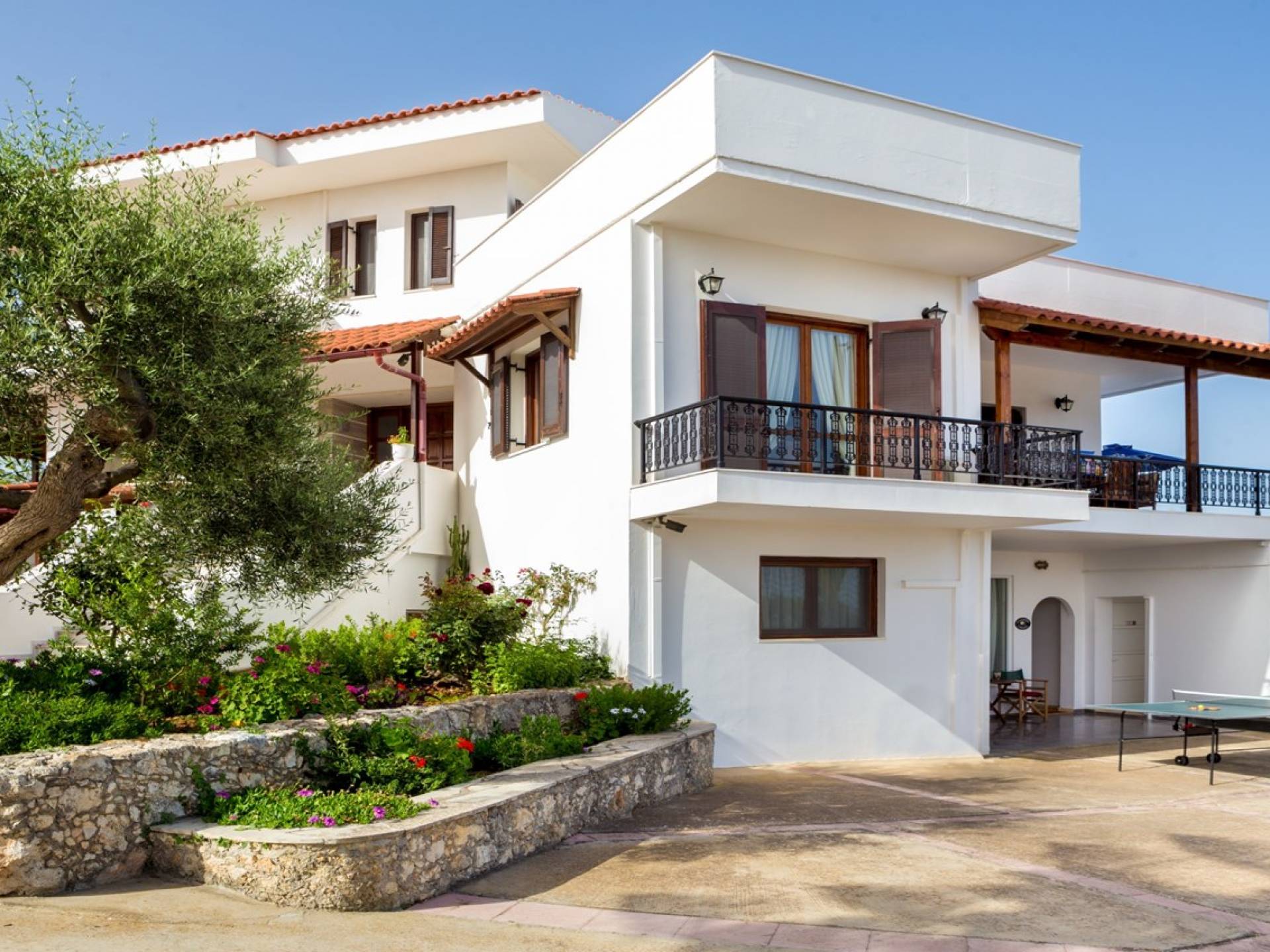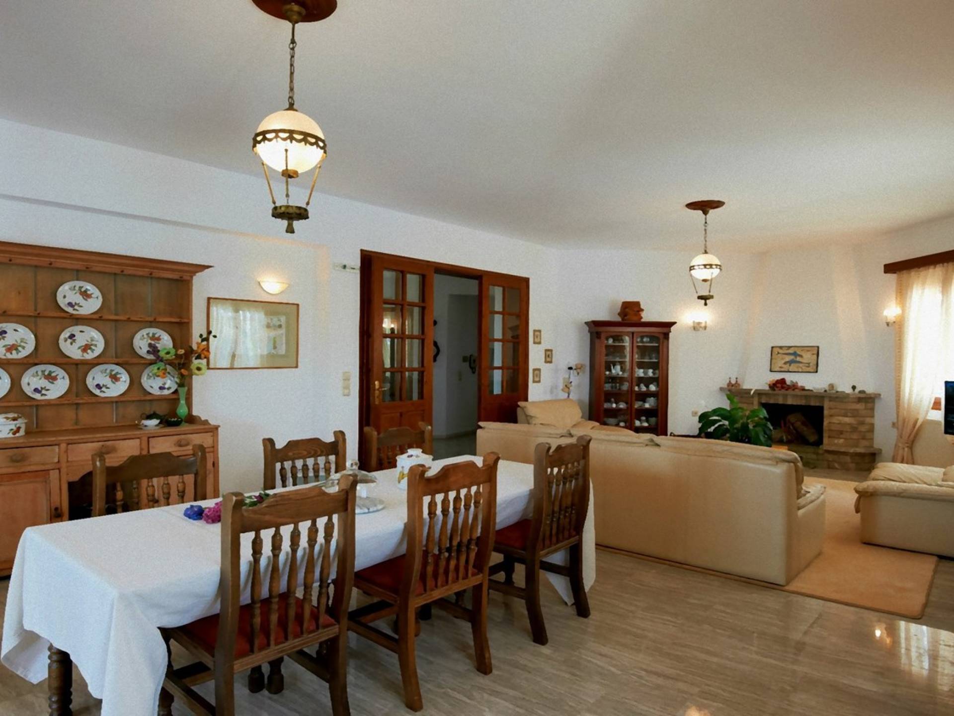 Die Villa verfügt über ein klassisches Wohnzimmer mit antiken Möbelstücken, einen Wohn- und Essbereich, Gemälde mit kretischem Thema und einige andere Annehmlichkeiten wie Satellitenfernsehen und eine tragbare Stereoanlage. Sie führt zu einer zum Ägäischen Meer offenen Veranda mit bequemen Sitzmöbeln, die der Meeresbrise ausgesetzt ist und einen atemberaubenden Blick auf das Meer, die bewaldeten Hügel, die Weißen Berge und – vor allem – die Aussicht auf unglaubliche Sonnenuntergänge! Der Bibliotheksraum enthält mehr als tausend Bücher über Philosophie, Geschichte, Soziologie, Religion, Bildung und Literatur und bietet Momente des ruhigen Lesens.