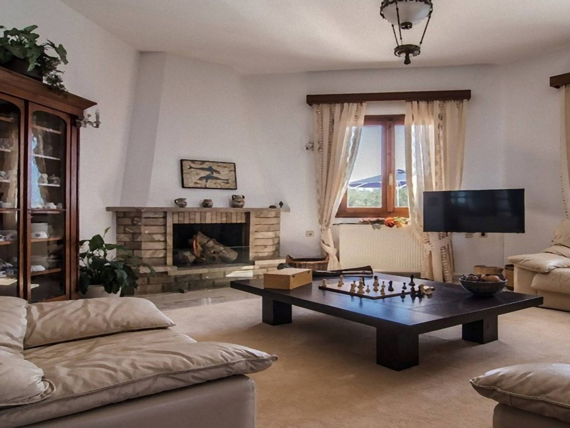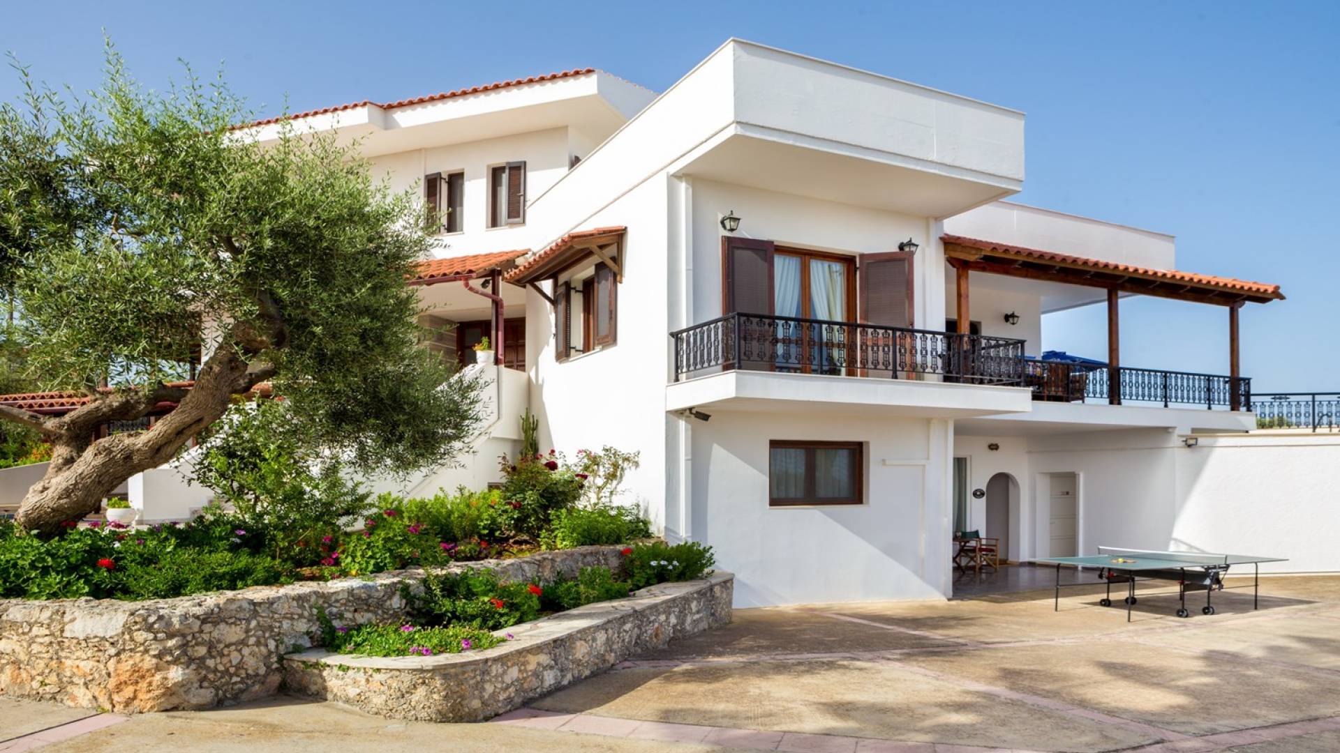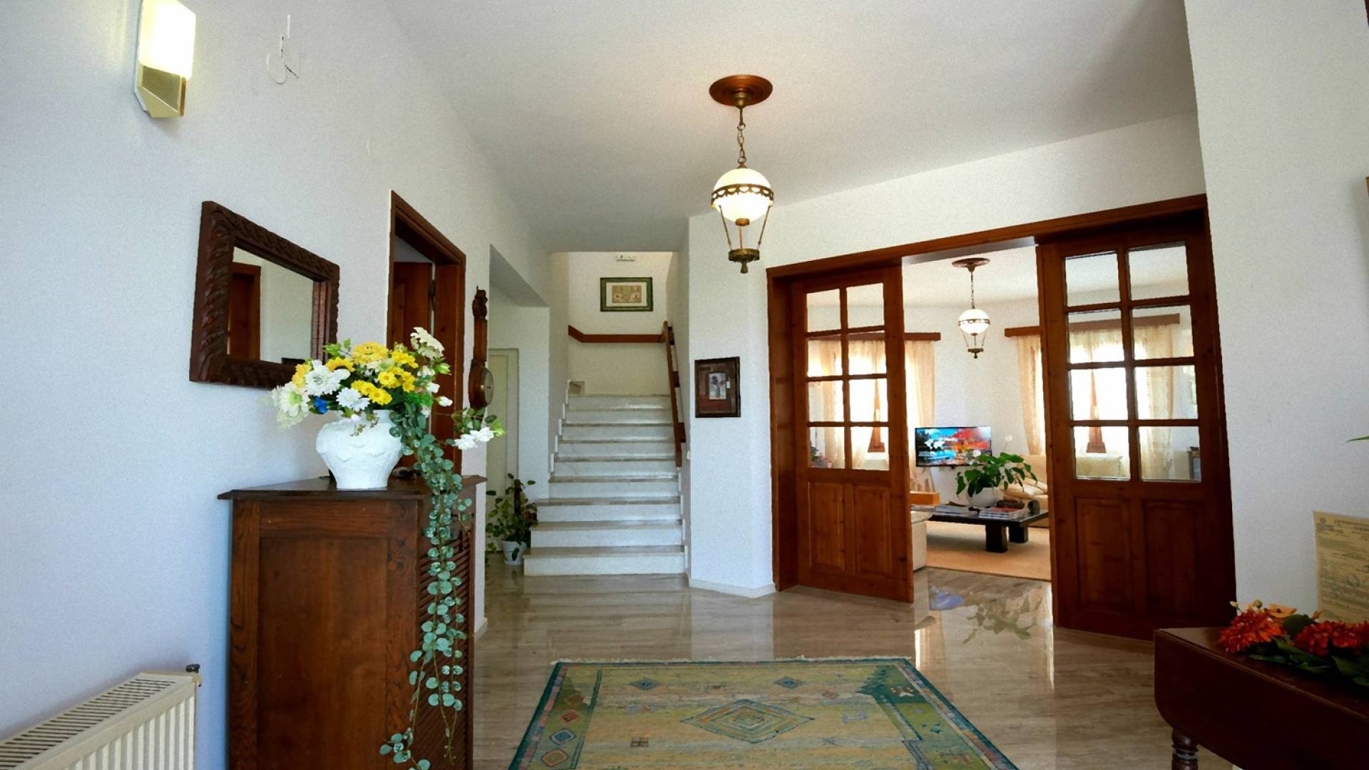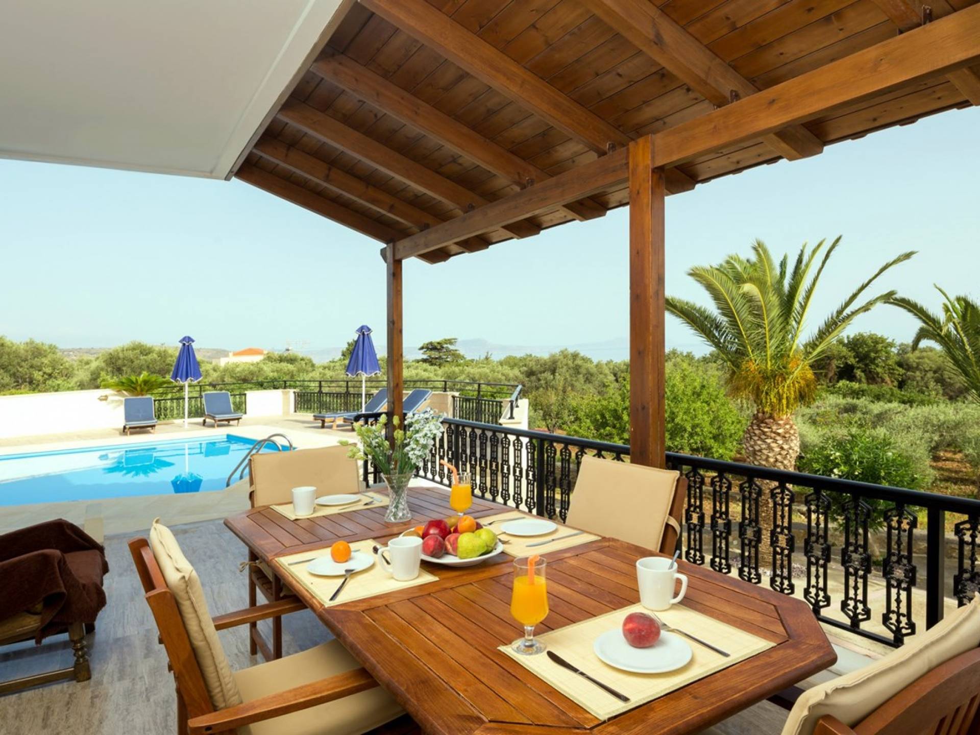 Die Villa verfügt über ein klassisches Wohnzimmer mit antiken Möbelstücken, einen Wohn- und Essbereich, Gemälde mit kretischem Thema und einige andere Annehmlichkeiten wie Satellitenfernsehen und eine tragbare Stereoanlage. Sie führt zu einer zum Ägäischen Meer offenen Veranda mit bequemen Sitzmöbeln, die der Meeresbrise ausgesetzt ist und einen atemberaubenden Blick auf das Meer, die bewaldeten Hügel, die Weißen Berge und – vor allem – die Aussicht auf unglaubliche Sonnenuntergänge! Der Bibliotheksraum enthält mehr als tausend Bücher über Philosophie, Geschichte, Soziologie, Religion, Bildung und Literatur und bietet Momente des ruhigen Lesens.