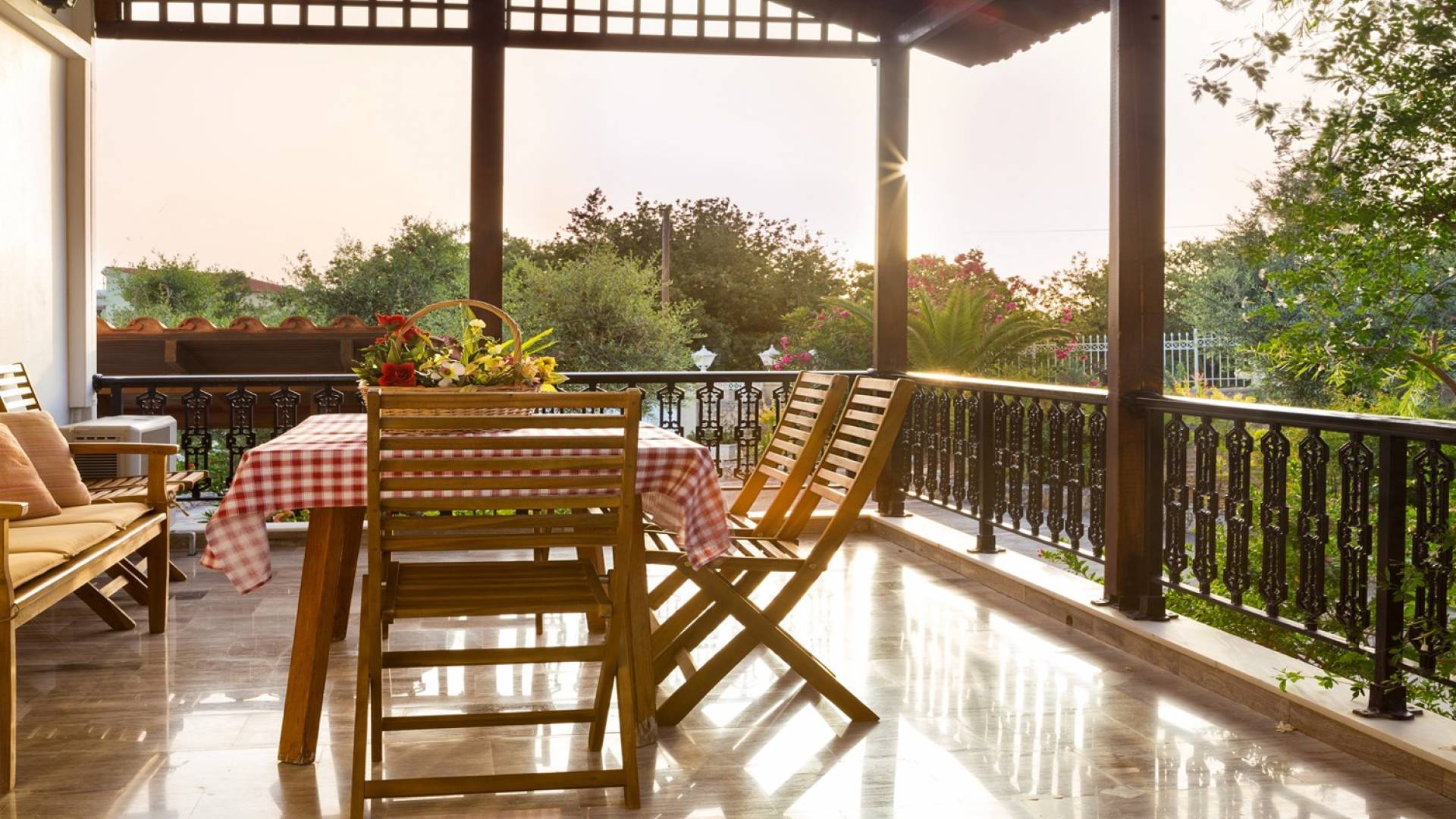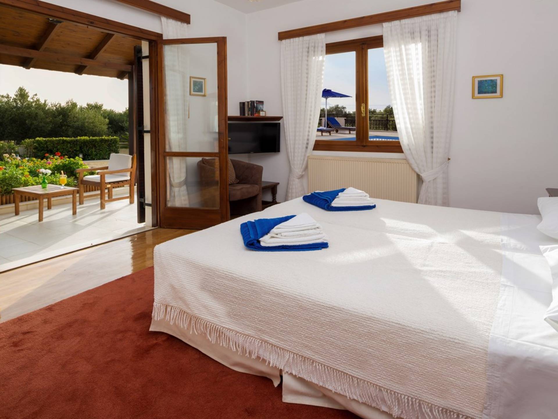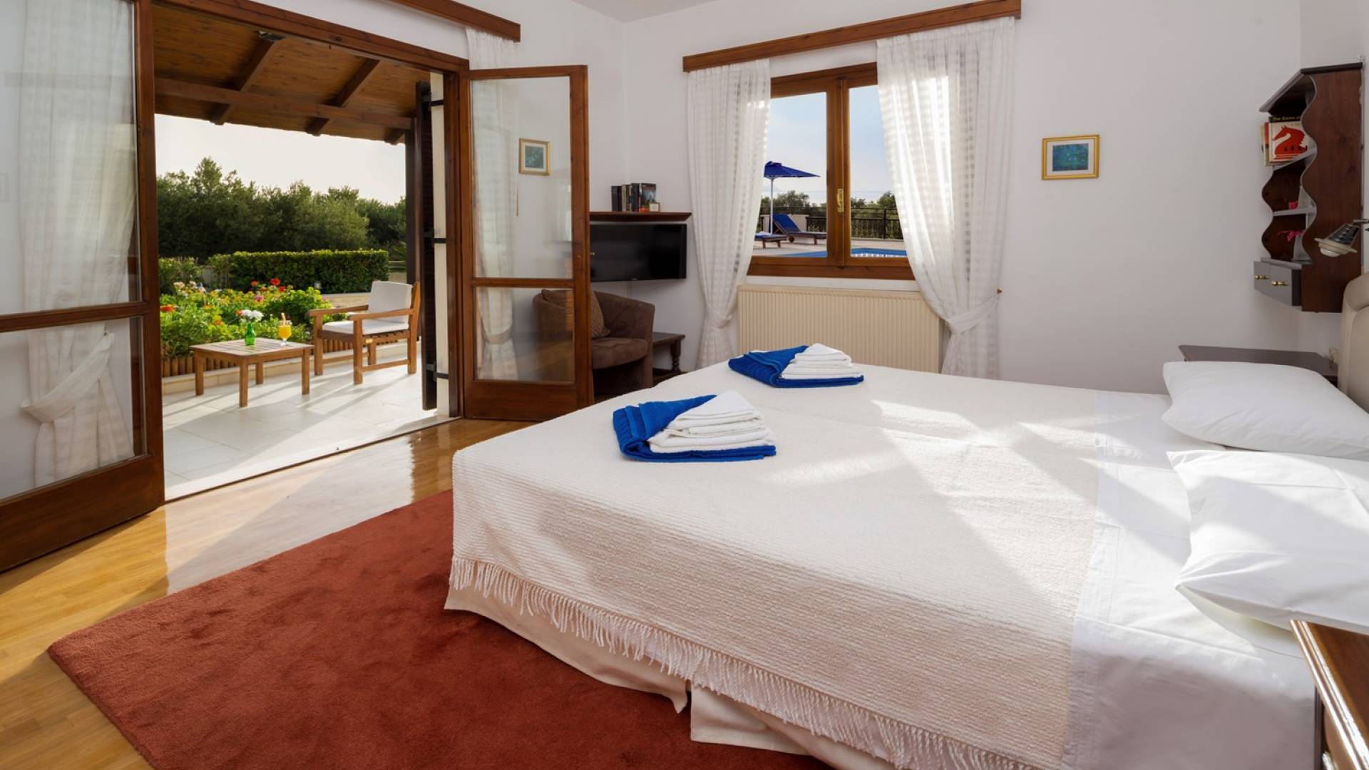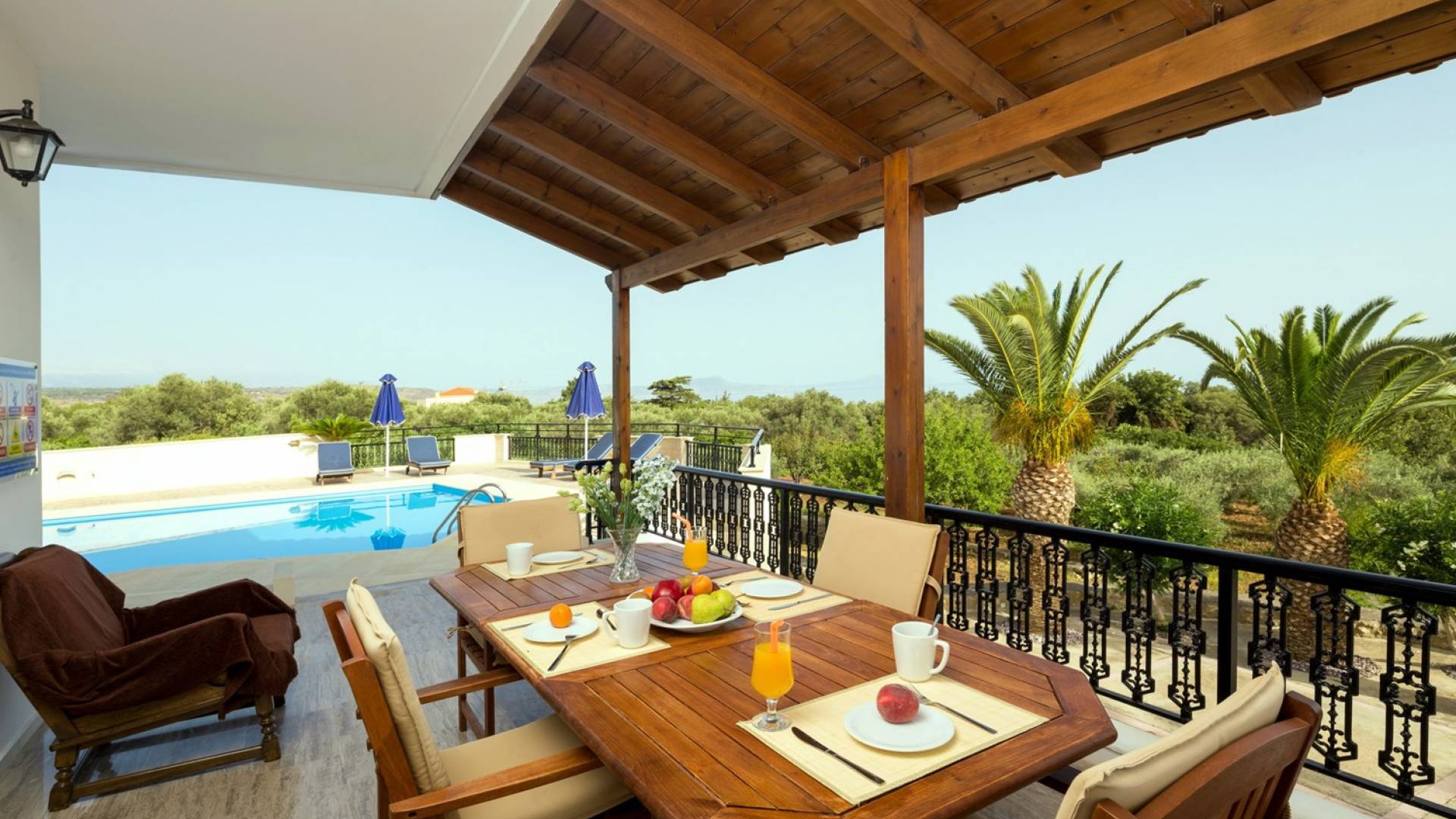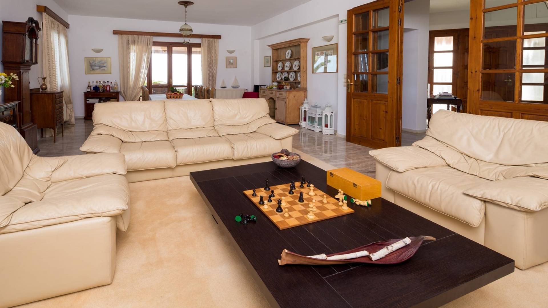 Die Villa verfügt über ein klassisches Wohnzimmer mit antiken Möbelstücken, einen Wohn- und Essbereich, Gemälde mit kretischem Thema und einige andere Annehmlichkeiten wie Satellitenfernsehen und eine tragbare Stereoanlage. Sie führt zu einer zum Ägäischen Meer offenen Veranda mit bequemen Sitzmöbeln, die der Meeresbrise ausgesetzt ist und einen atemberaubenden Blick auf das Meer, die bewaldeten Hügel, die Weißen Berge und – vor allem – die Aussicht auf unglaubliche Sonnenuntergänge! Der Bibliotheksraum enthält mehr als tausend Bücher über Philosophie, Geschichte, Soziologie, Religion, Bildung und Literatur und bietet Momente des ruhigen Lesens.