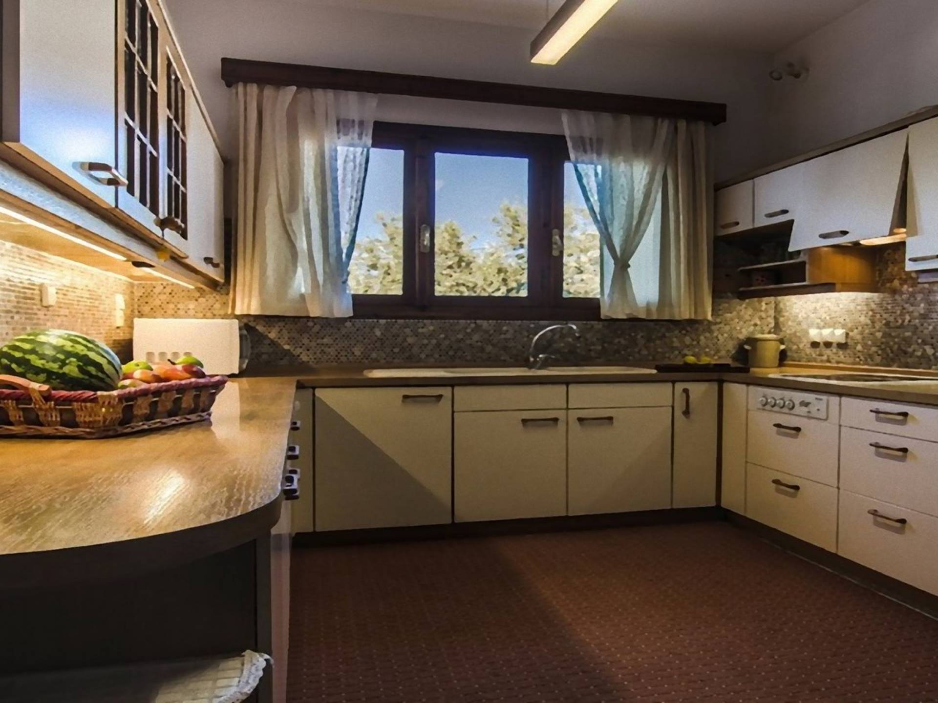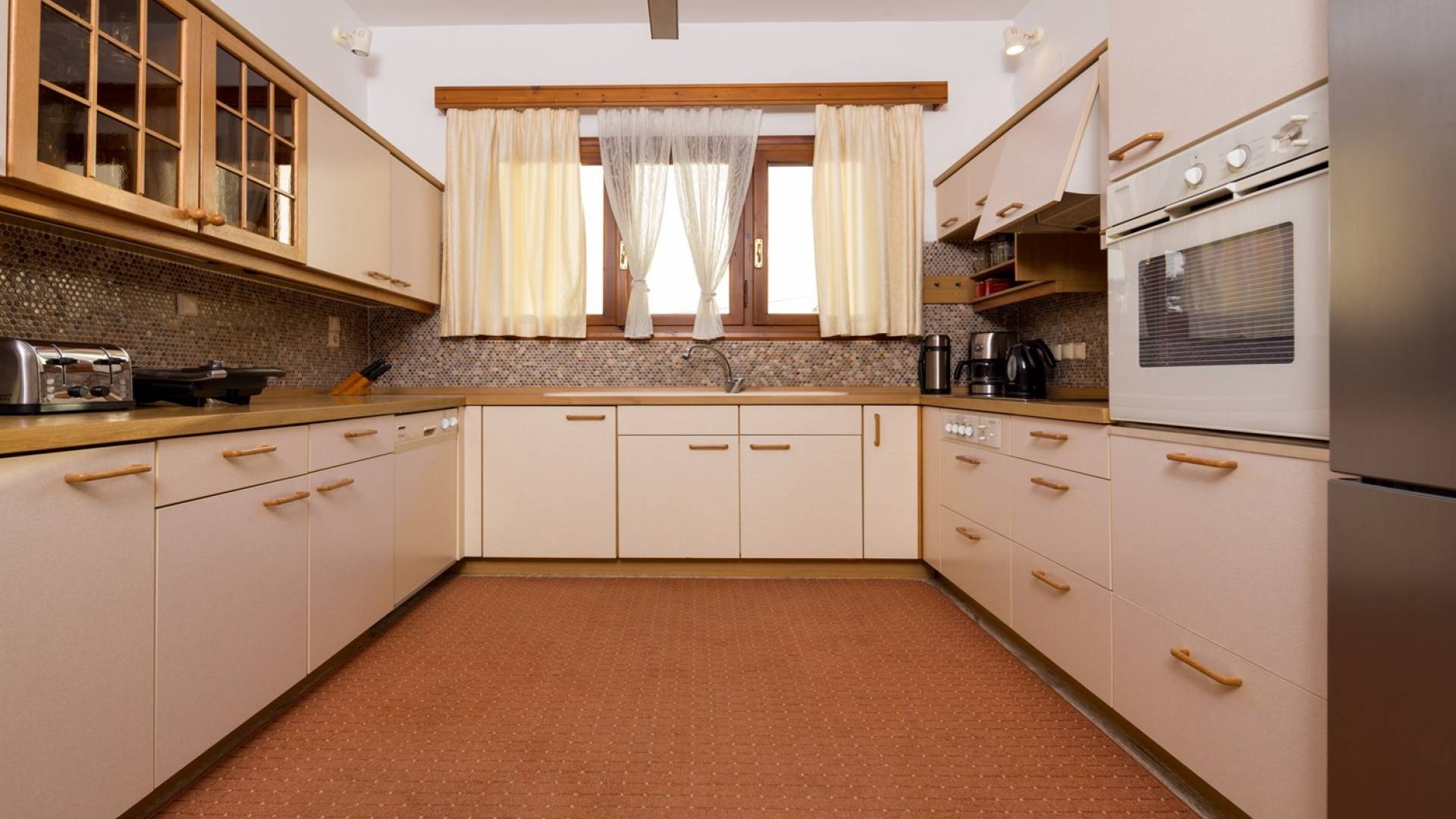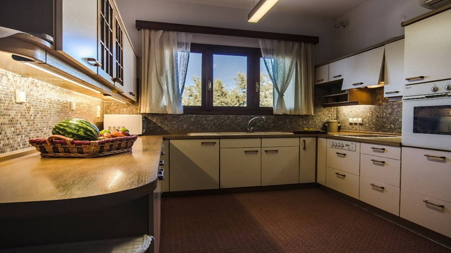 Eine voll ausgestattete Küche mit – Elektroherd, Backofen, Mikrowelle, Kühlschrank, Gefrierschrank, Geschirrspüler, Toaster, Kaffeemaschine, Wasserkocher, Grill, Obstmixer, Bügeleisen – ist mit dem Frühstücksraum verbunden. Die an die Küche angeschlossene Veranda ist gut gelegen, um Ihren Morgenkaffee zu genießen und im Freien zu speisen. Der Hauswirtschaftsraum im Küchenbereich bietet die Möglichkeit einer Kleiderwaschmaschine, eines Gefrierschranks und eines zweiten Kühlschranks. Wenn Sie von der Küchenveranda kommen, folgt der Grillplatz, der von Maulbeerbäumen beschattet und von Büschen und Blumen umgeben ist.