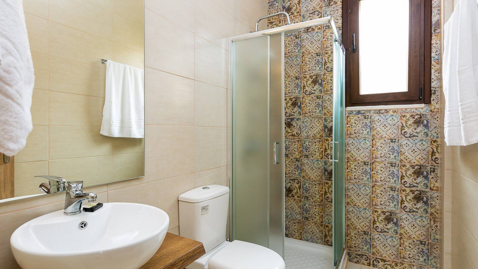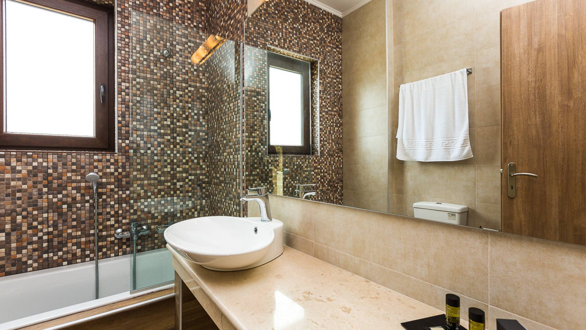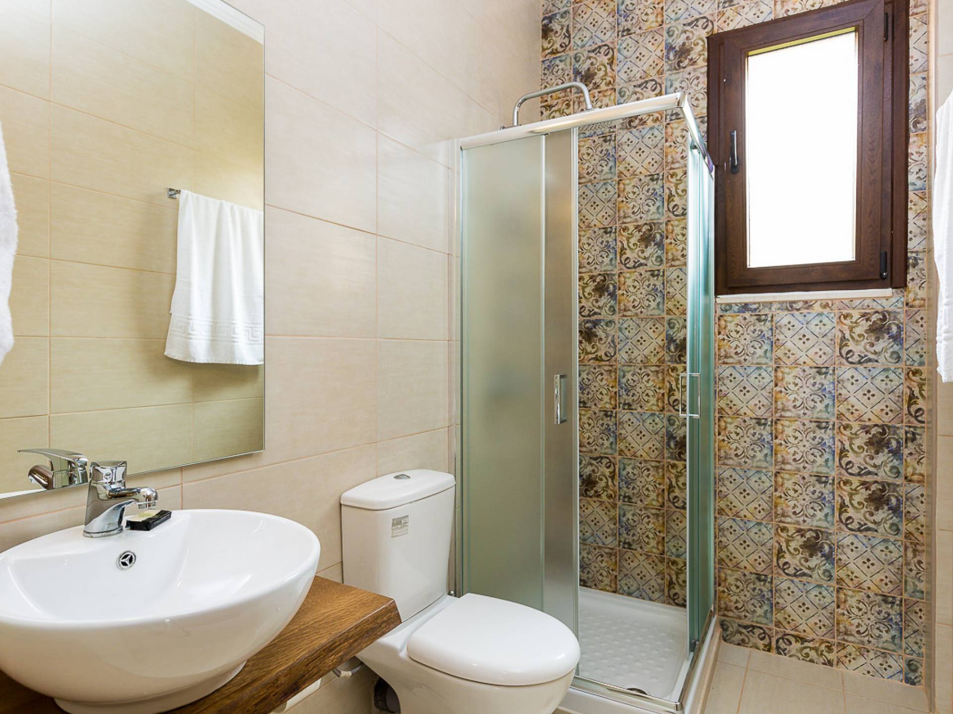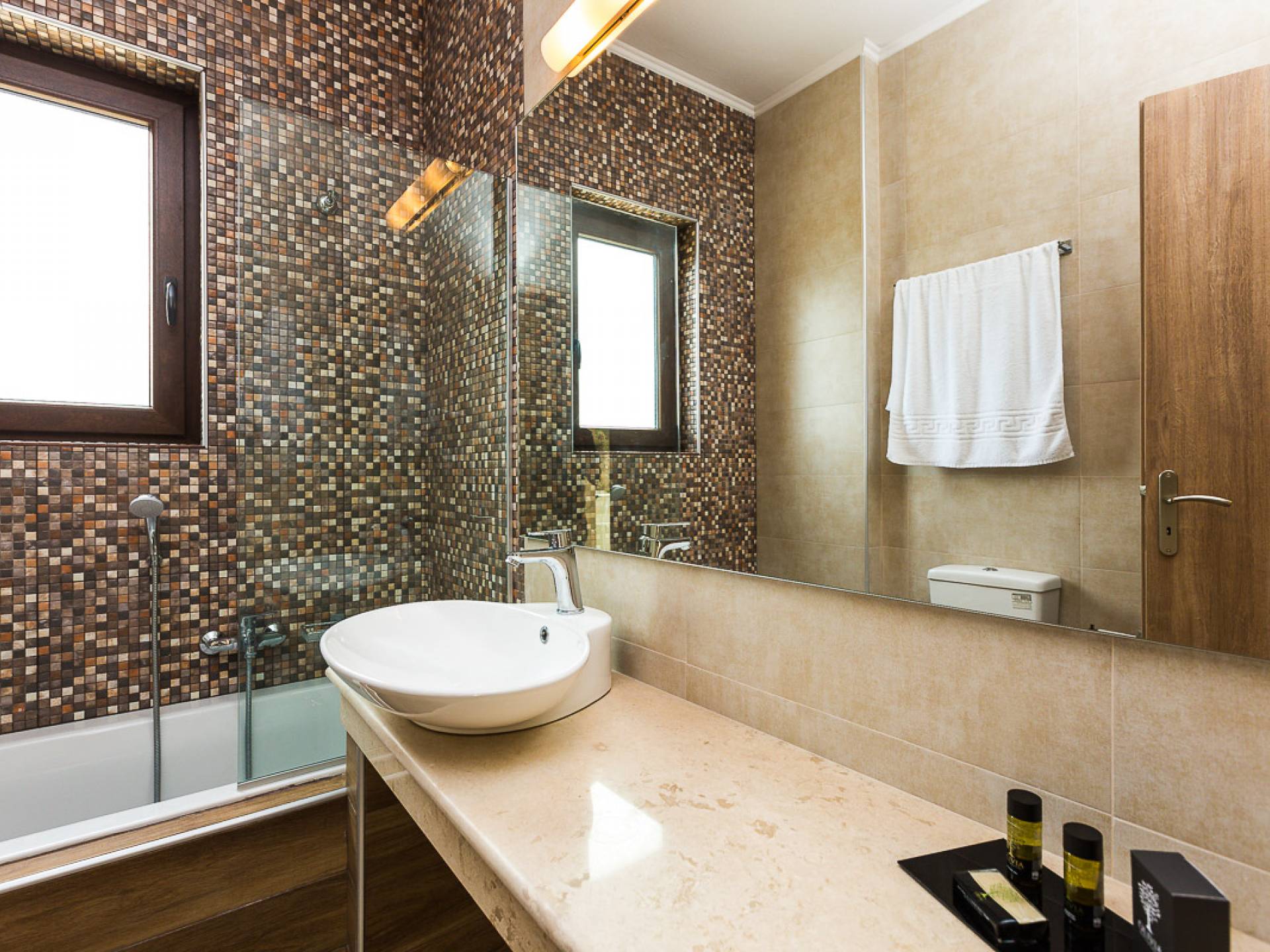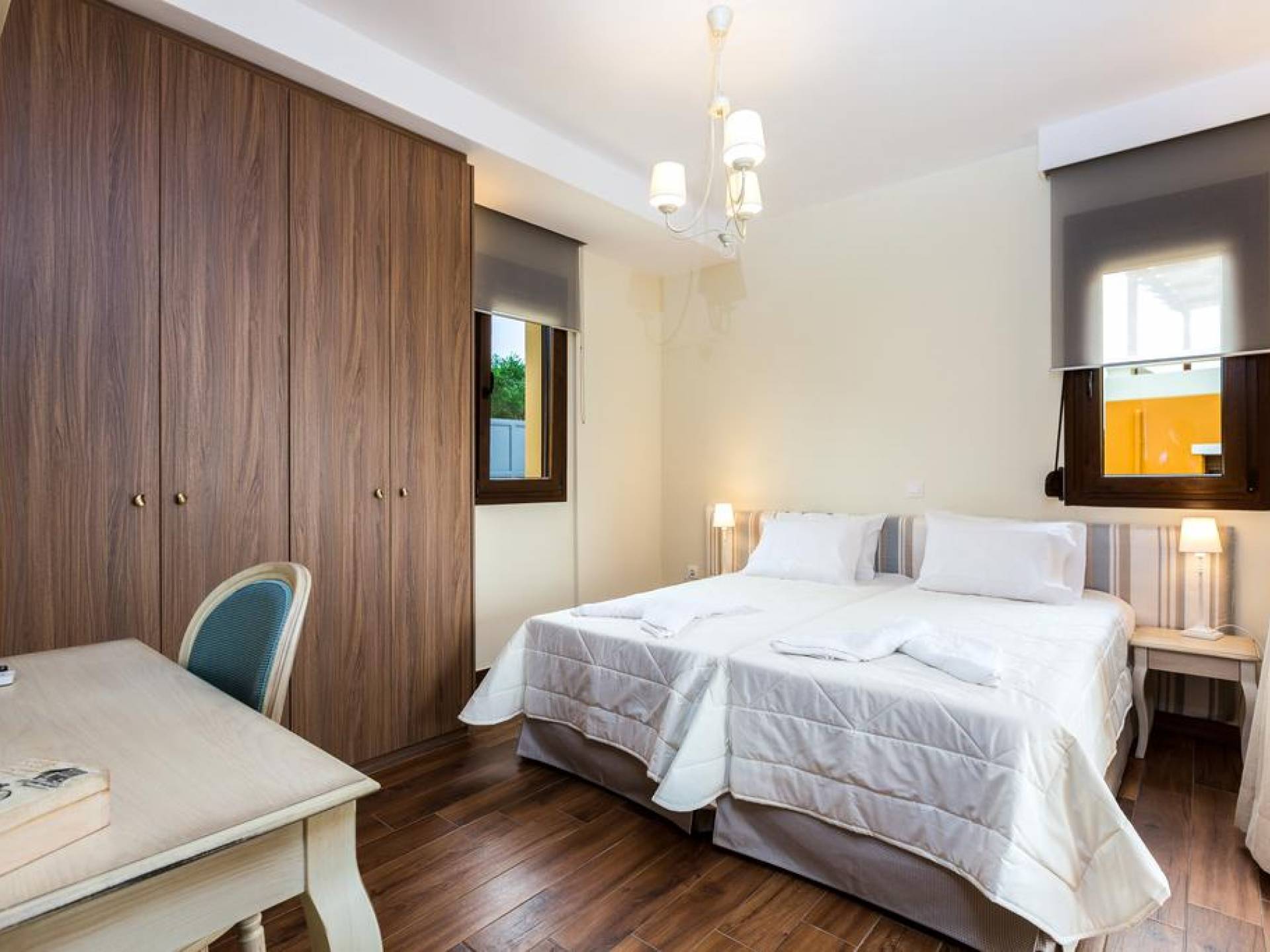 Erster Stock: Eine Marmortreppe führt Sie in die obere Ebene der Villa. Auf dieser Etage befinden sich zwei große Schlafzimmer mit Doppelbett. Im ersten befindet sich ein Doppelbett und im anderen zwei Einzelbetten, beide mit stilvollen Möbeln, Kleiderschränken und Flachbild-TVs. Alle Betten sind von höchster Qualität, Bettwäsche und Handtücher werden gestellt. Terrassentüren in jedem Schlafzimmer führen Sie auf einen Balkon, von dem Sie einen atemberaubenden Blick auf das Meer und die Nordküste genießen können. Außerdem gibt es ein voll ausgestattetes luxuriöses Badezimmer mit einer großen Badewanne. Der schönste Teil der ersten Etage ist die sehr große möblierte Terrasse auf der Rückseite des Gebäudes (25 m²), die einen spektakulären Blick auf die Berge und die natürliche Umgebung der Olivenhaine und Obstgärten in der Umgebung bietet. Jede Villa ist mit einer individuellen zentralen Klimaanlage und Heizung ausgestattet, die sicherstellen, dass alle Räume in der Villa die perfekte Temperatur haben, um Ihren Aufenthalt zu verbessern.