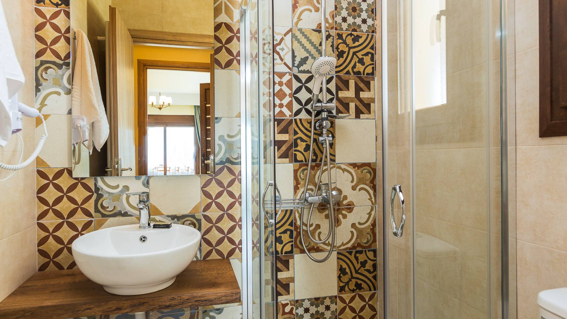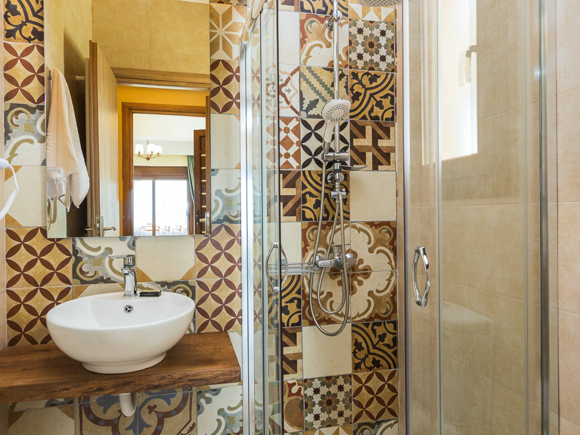 Erdgeschoss: Der Haupteingang der Villa befindet sich im Erdgeschoss, wo sich ein geräumiges Wohnzimmer, ein Essbereich und eine voll ausgestattete offene Küche befinden. Der Wohnbereich verfügt über bequeme Sofas, einen Flachbild-Sat-TV, eine DVD und einen CD-Player. Die Küche verfügt über alle Einrichtungen, die Sie für Ihren Urlaub mit Selbstverpflegung benötigen. Terrassentüren führen Sie auf eine Veranda mit Blick auf den Garten und den Poolbereich. Auf dieser Ebene haben wir ein hübsches Doppelzimmer mit zwei Einzelbetten, einem Kleiderschrank und einem Flachbild-TV sowie ein schön gefliestes, voll ausgestattetes Badezimmer mit ebenerdiger Dusche für Ihren Komfort. Ein hochwertiges Schlafsofa ist vorhanden, so dass eine zusätzliche Person untergebracht werden kann. Alle Bereiche sind wunderschön mit modernen Möbeln mit traditionellen Akzenten eingerichtet. Babybetten und Hochstühle sind auf Anfrage erhältlich.
