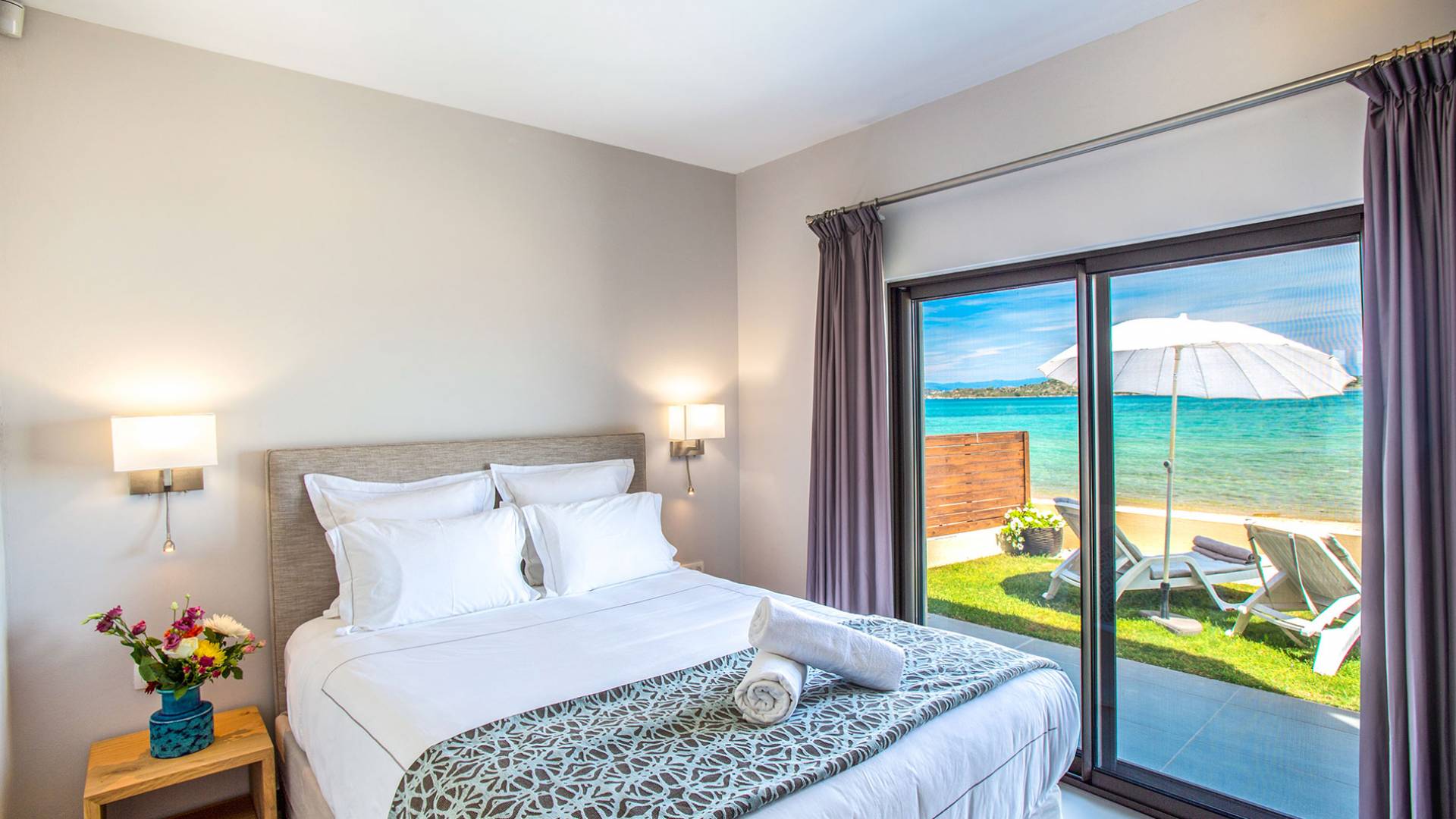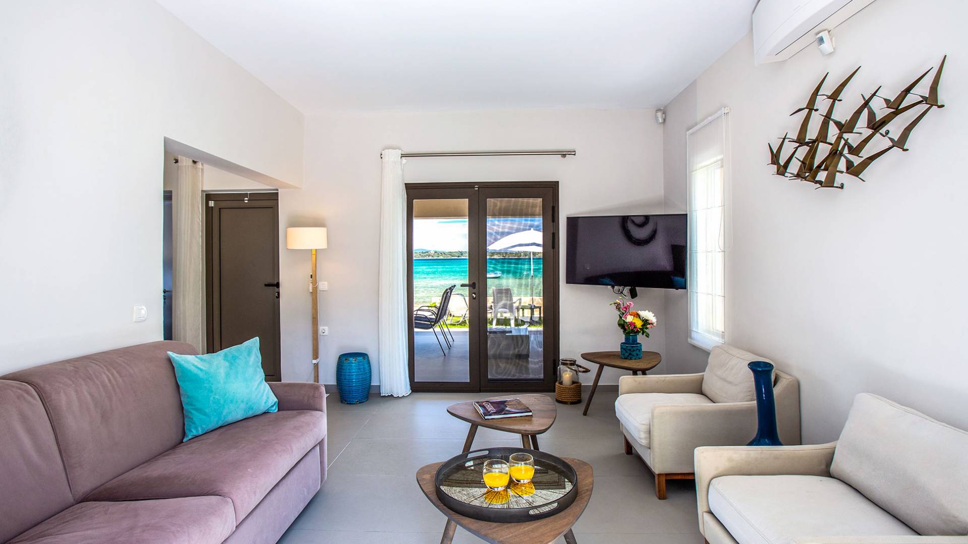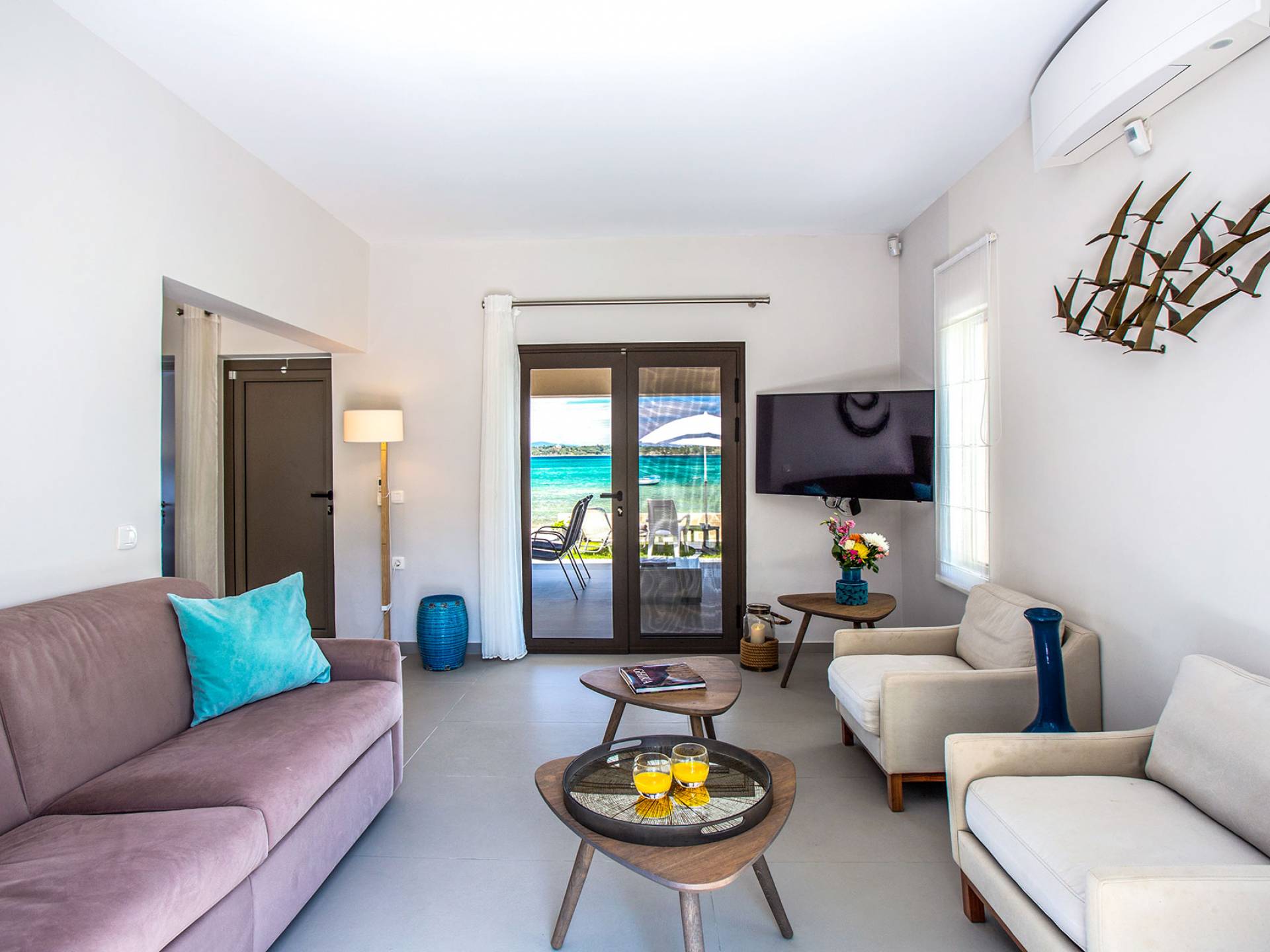 Der Garten schirmt den Grill- und Essbereich mit einer 16 m² großen Pergola ab. Gehen Sie einfach aus dem Wohnzimmer (18 m2) durch die Terrassentüren, entspannen Sie im Schatten der privaten Terrasse oder entspannen Sie noch einen Schritt weiter auf den Sonnenliegen am Sandstrand. Das geräumige Schlafzimmer bietet einen herrlichen Blick auf das Meer. Voll ausgestattete Küche, um den täglichen Bedarf einfach und angenehm zu machen. Nach einem erfrischenden Bad mit herrlichem Blick auf die Insel Diaporos kann man die Entspannung bei einem Cocktail auf dem Außenbalkon genießen. Diese Residenz bietet wirklich die einzigartige Gelegenheit, die perfekten Urlaubsmomente in dieser schönen Landschaft zu verbringen und Privatsphäre zu wählen, während Sie sich im Herzen dieses schönen Dorfes befinden.