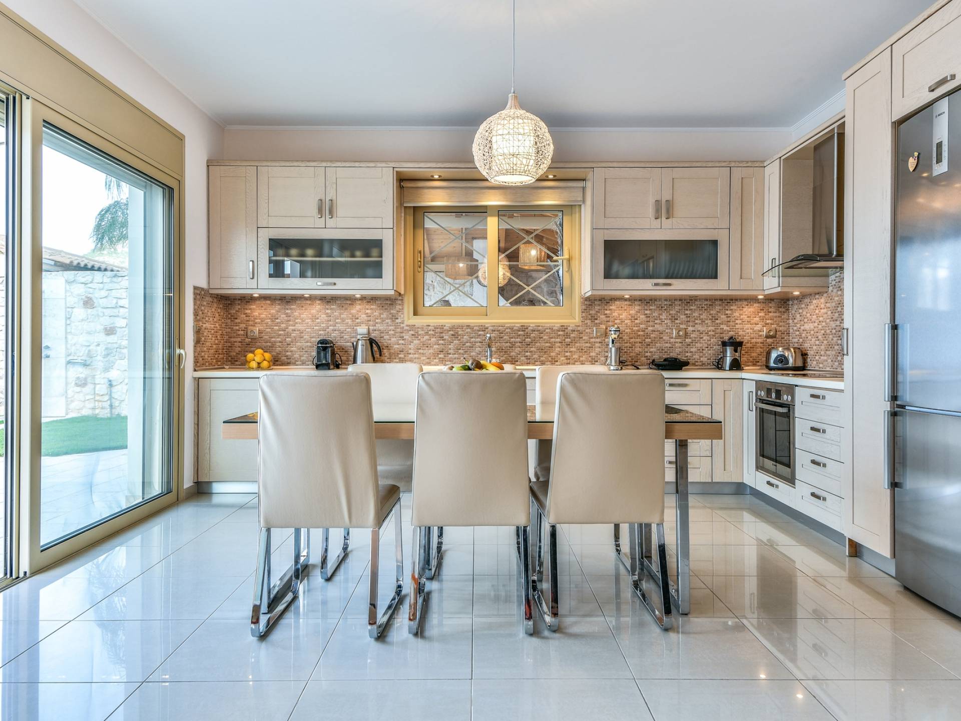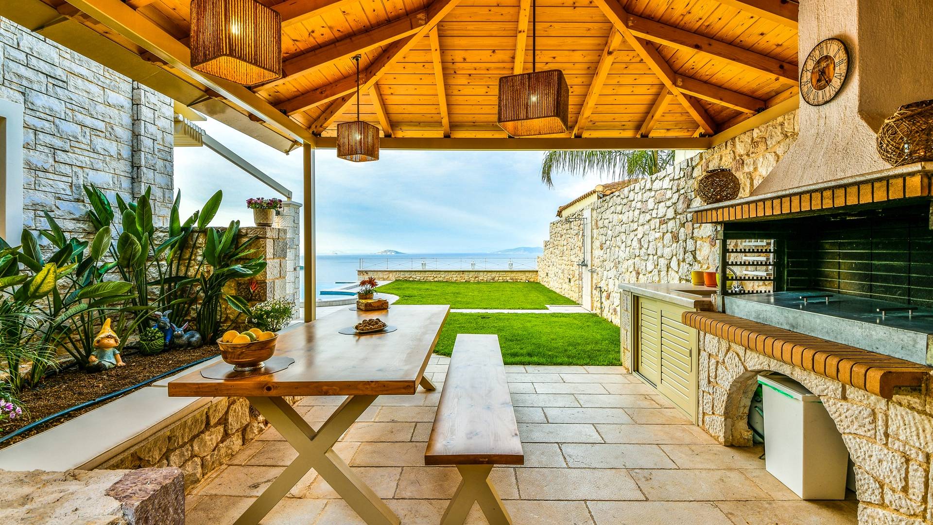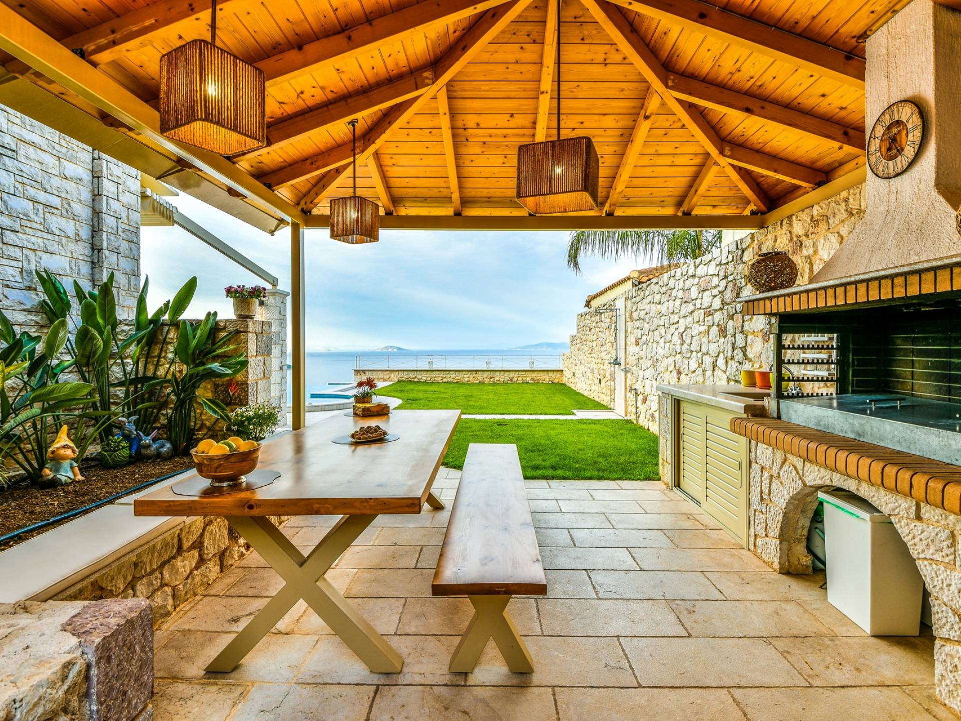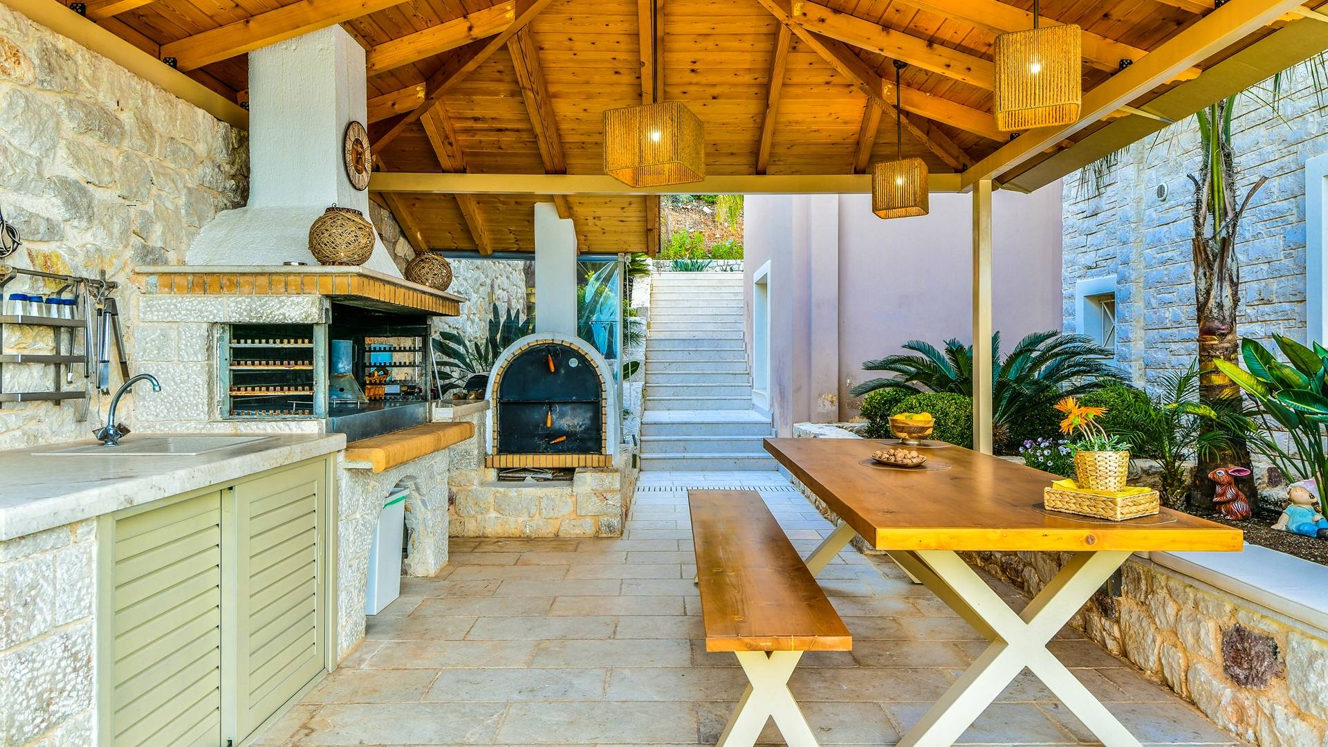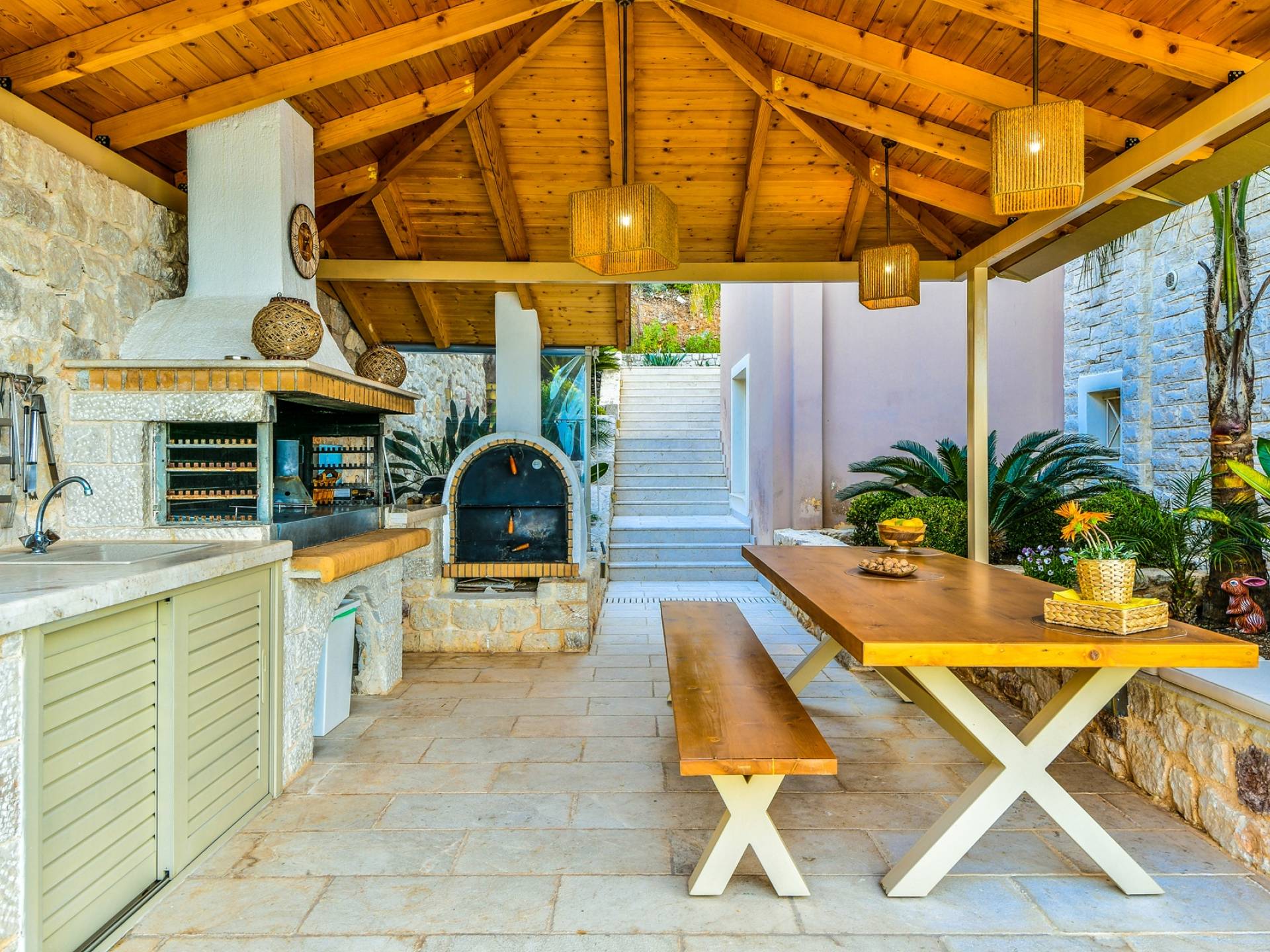 Im Garten gibt es einen speziellen geschlossenen Grillplatz, der komplett ausgestattet ist mit einem Holzofen, einer Spüle, einem Kühlschrank und einem schönen Esstisch aus Kristallmarmor mit Platz für 12 Personen. Ein schattiger Innenhof im Poolbereich bietet einen perfekten Blick auf die Schönheit um Sie herum. Im Inneren verfügt die Villa über große Bereiche, die mit großer Sorgfalt gestaltet und dekoriert wurden. Im Erdgeschoss finden Sie das Wohnzimmer, eine voll ausgestattete offene Küche, ein geräumiges Badezimmer, 2 Schlafzimmer und eine Waschküche. Es hat direkten Zugang zum Pool.