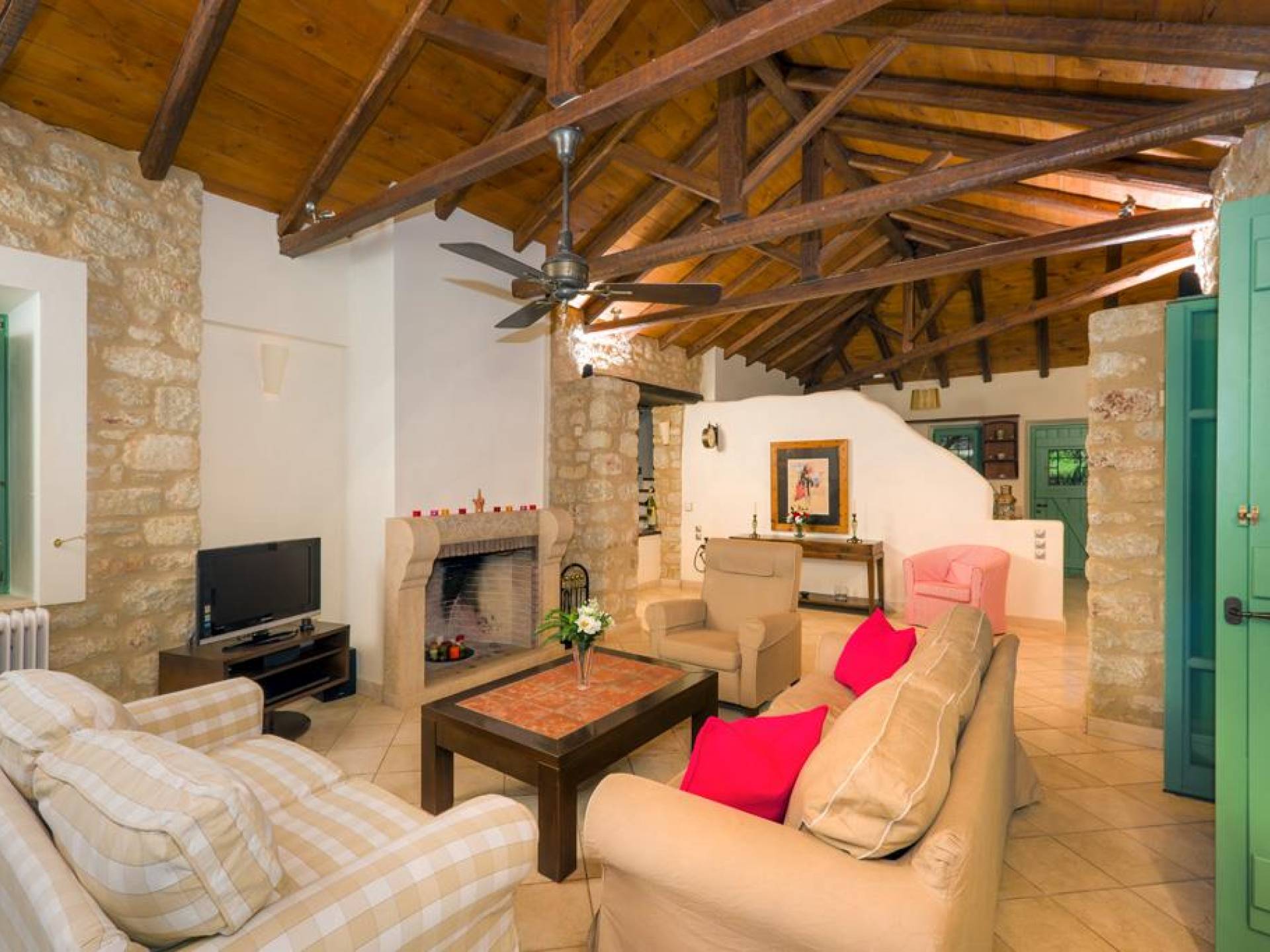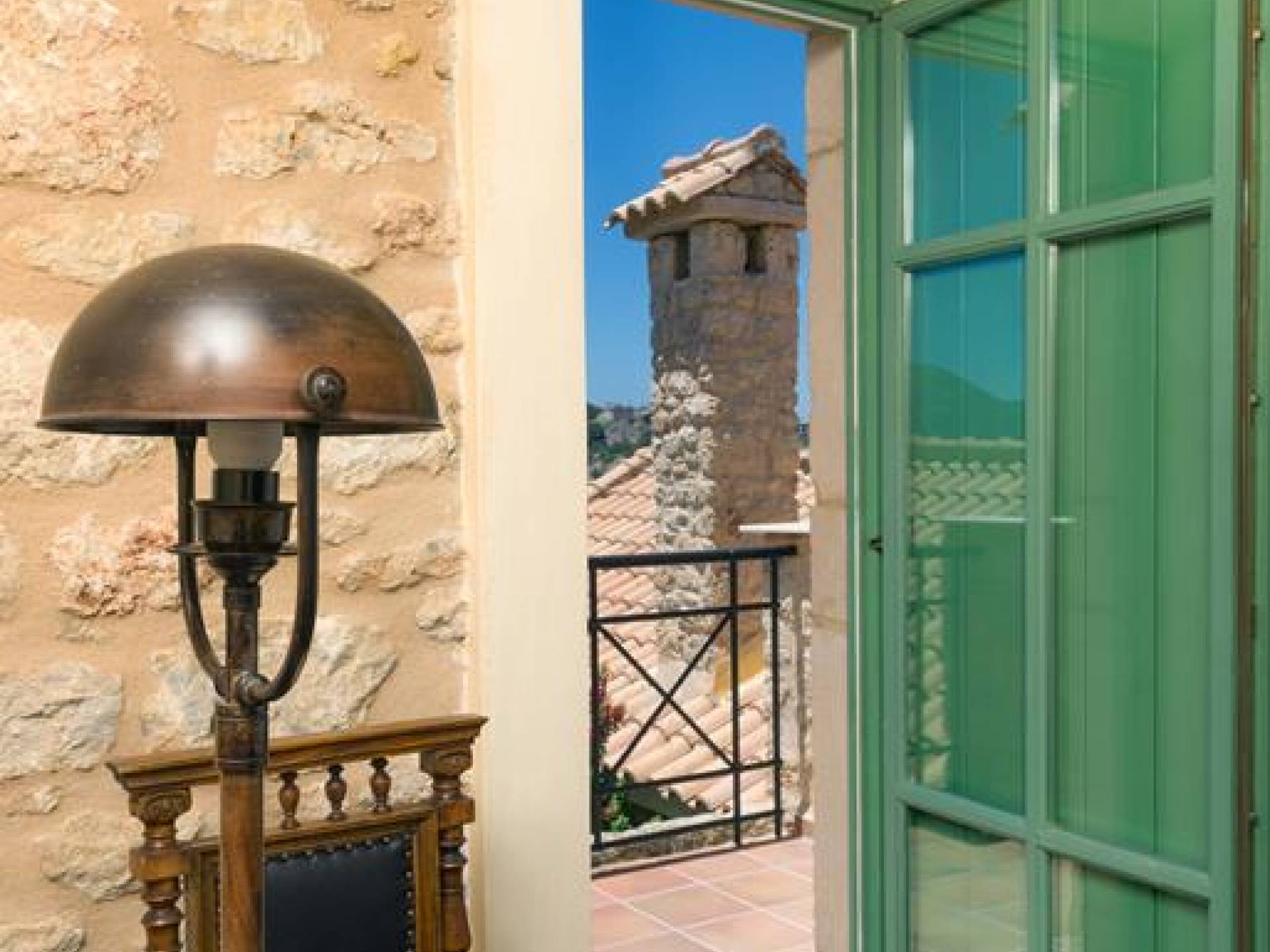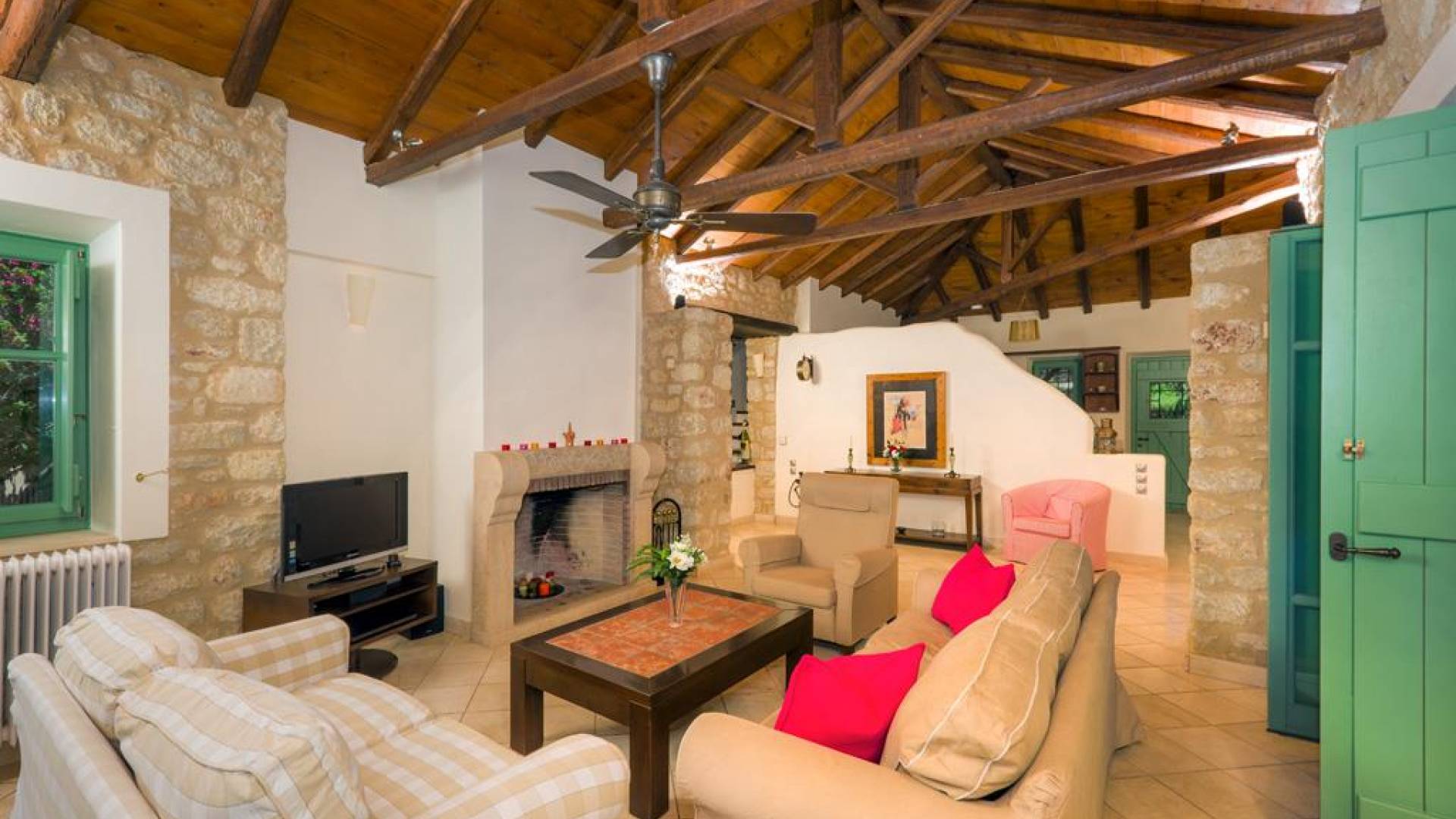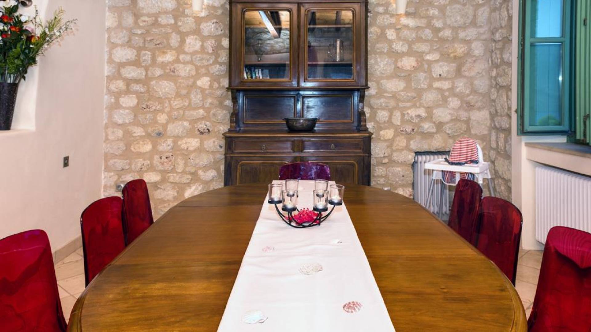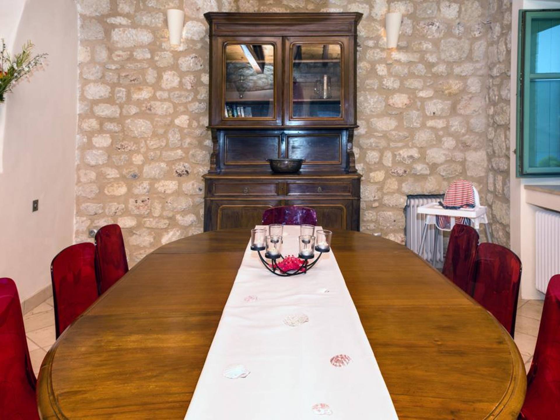 Die Steinwände werden mit einem modernen Interieur kombiniert, das auf Komfort ausgerichtet ist. Das traditionsreiche, aber einzigartige Anwesen bietet alle modernen Annehmlichkeiten, darunter unter anderem ein Soundsystem für verschiedene Bereiche des Hauses, Sat-TV, Grill und Holzofen sowie einen Infinity-Pool mit atemberaubender Aussicht. Die Farben sind schlicht, Creme und Stein, mit einem durchgehenden Fliesenboden. Die Fensterläden sind in hellem Pistazie gestrichen und helles Magenta wurde überall in die Polstermöbel und Esszimmerstühle eingeführt, die einen brillanten Kontrast zum Farbschema bilden. Große Türen im französischen Stil führen von jedem Bereich auf die Poolterrasse, die einen perfekten Ort zum Entspannen für jeden Teil des Tages bietet.