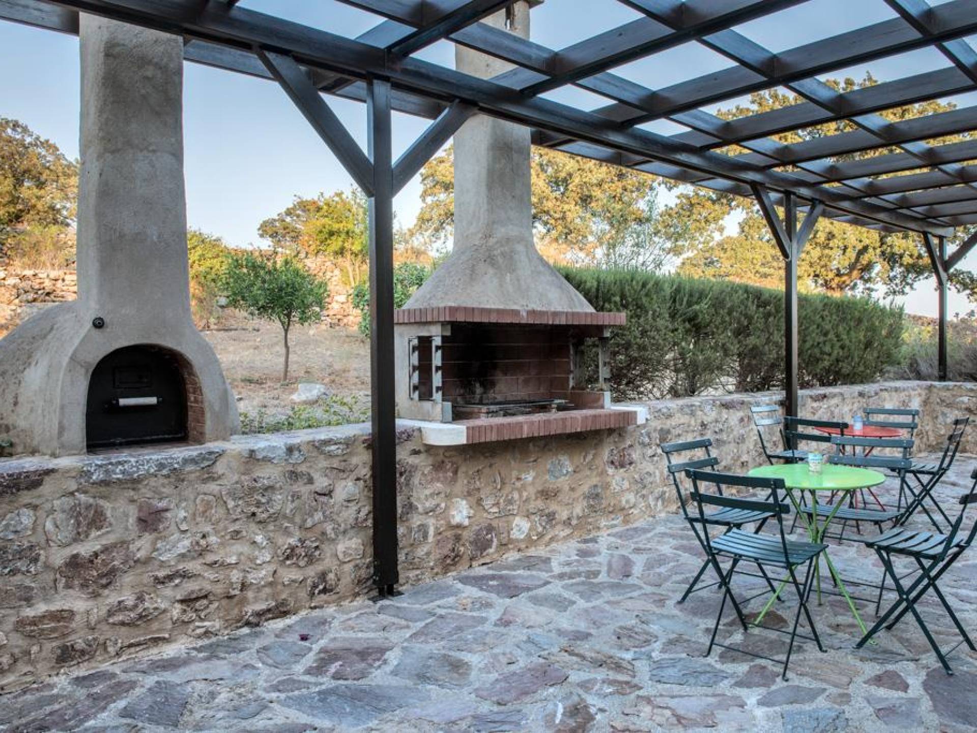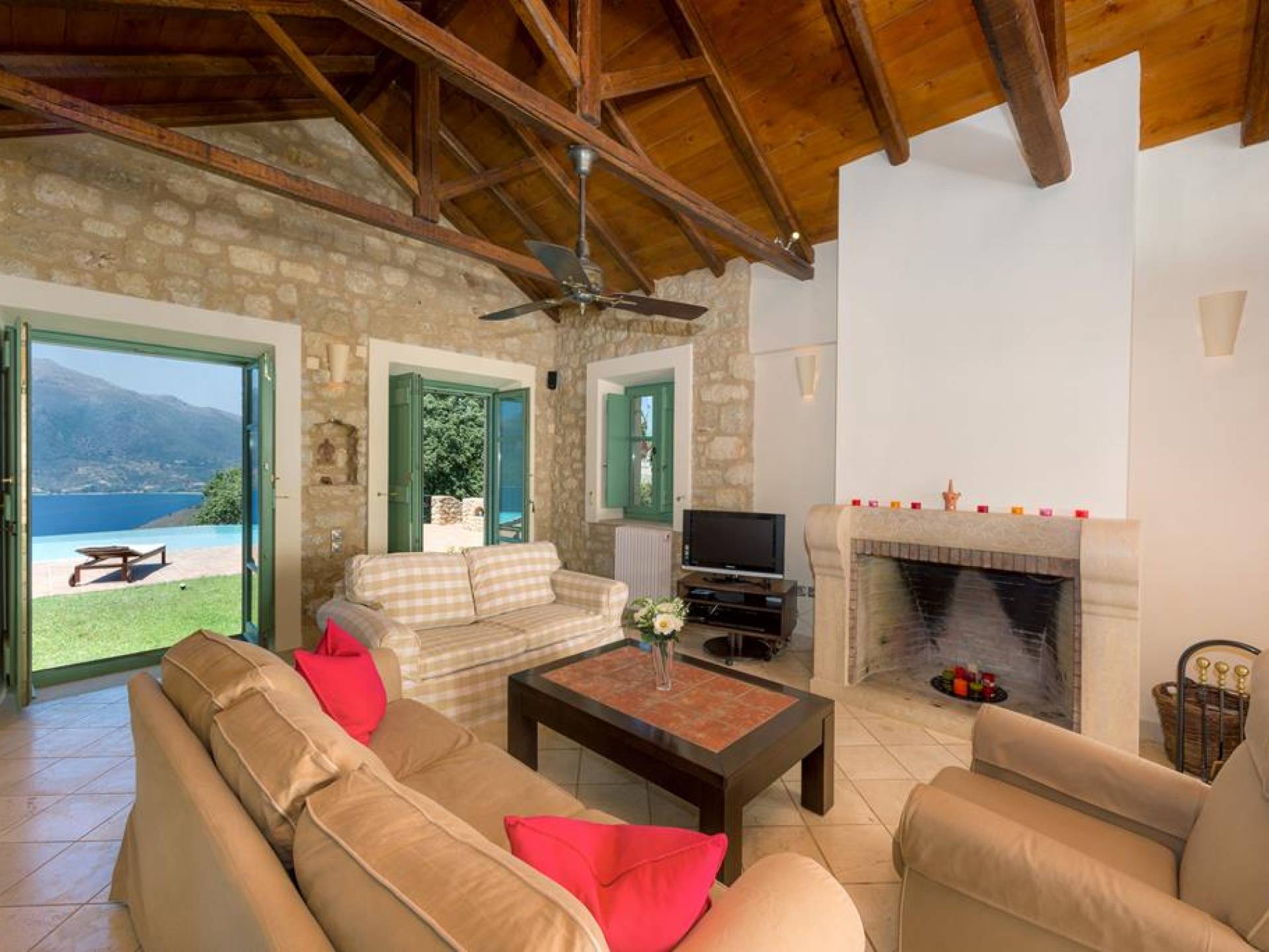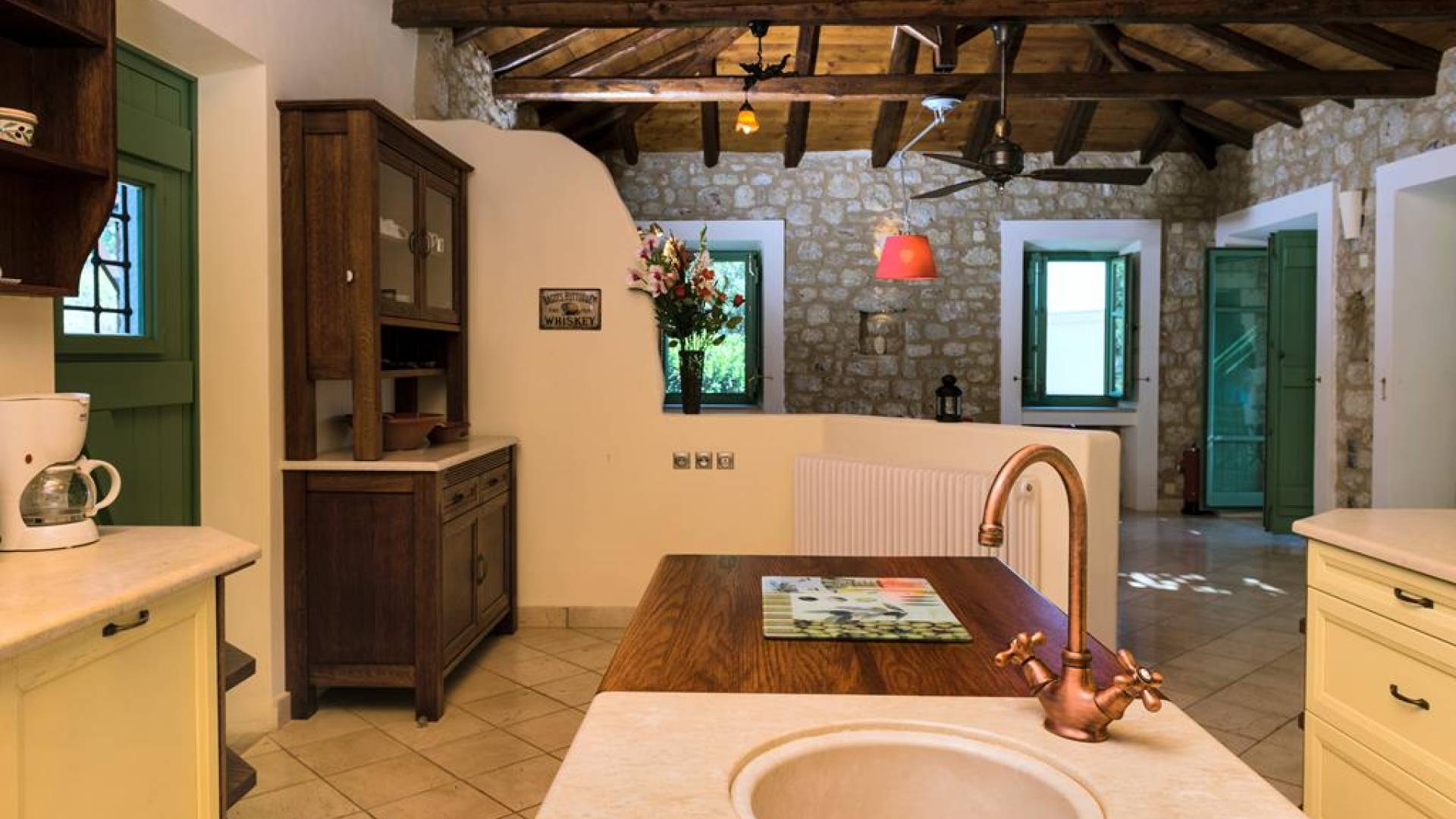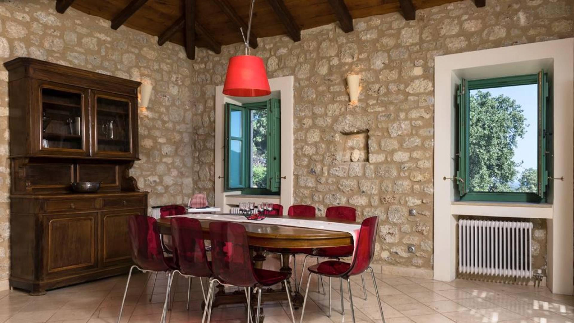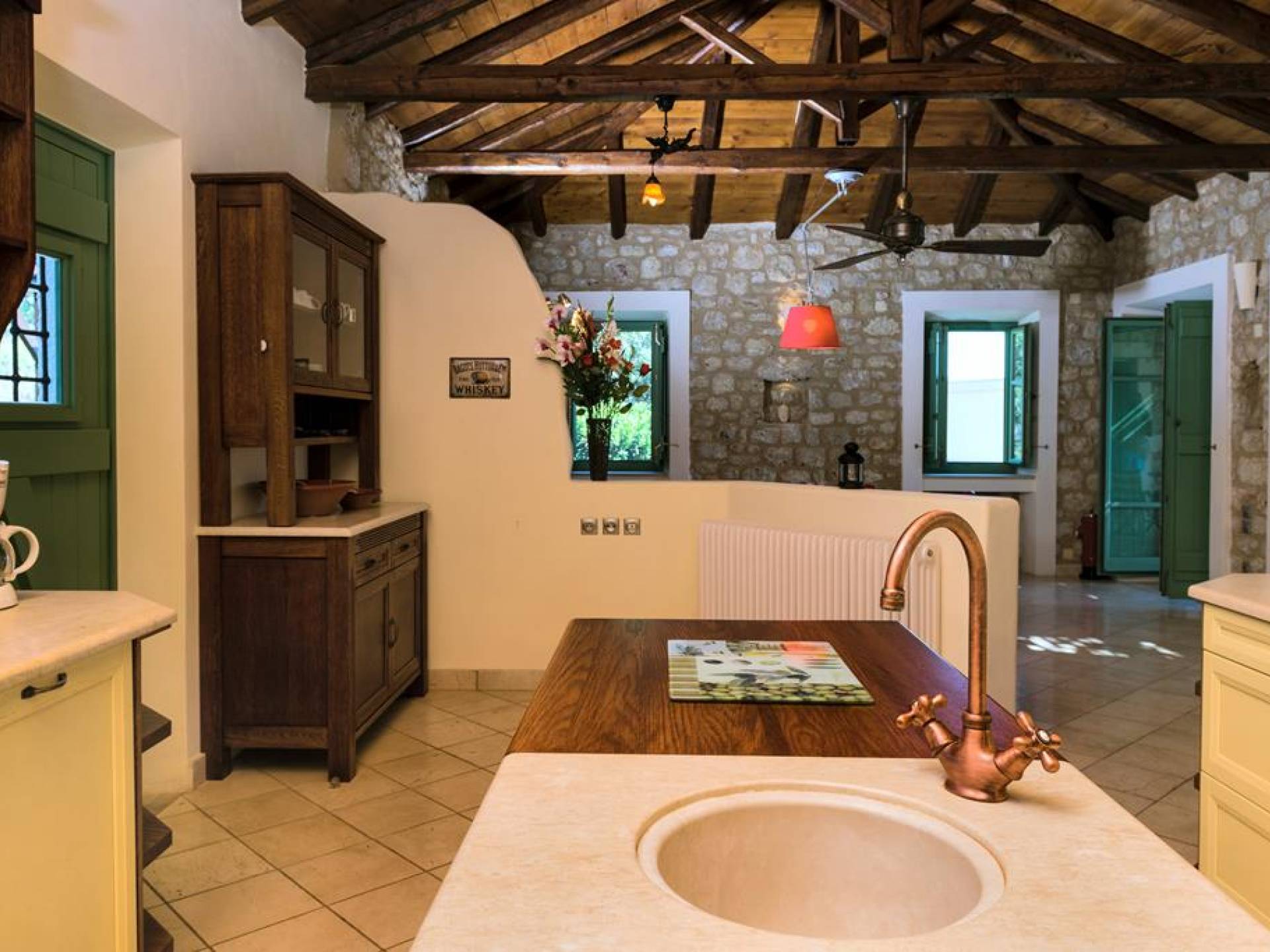 Die Steinwände werden mit einem modernen Interieur kombiniert, das auf Komfort ausgerichtet ist. Das traditionsreiche, aber einzigartige Anwesen bietet alle modernen Annehmlichkeiten, darunter unter anderem ein Soundsystem für verschiedene Bereiche des Hauses, Sat-TV, Grill und Holzofen sowie einen Infinity-Pool mit atemberaubender Aussicht. Die Farben sind schlicht, Creme und Stein, mit einem durchgehenden Fliesenboden. Die Fensterläden sind in hellem Pistazie gestrichen und helles Magenta wurde überall in die Polstermöbel und Esszimmerstühle eingeführt, die einen brillanten Kontrast zum Farbschema bilden. Große Türen im französischen Stil führen von jedem Bereich auf die Poolterrasse, die einen perfekten Ort zum Entspannen für jeden Teil des Tages bietet.