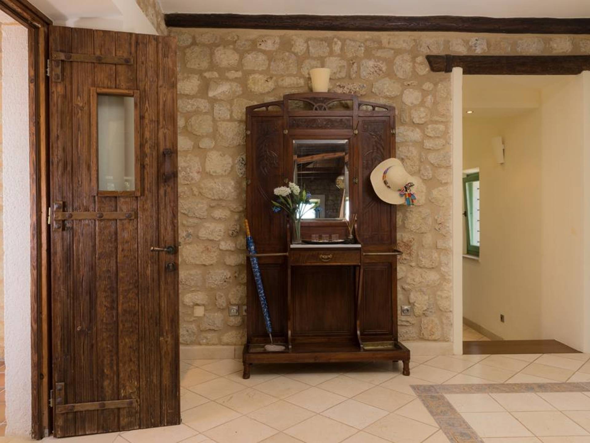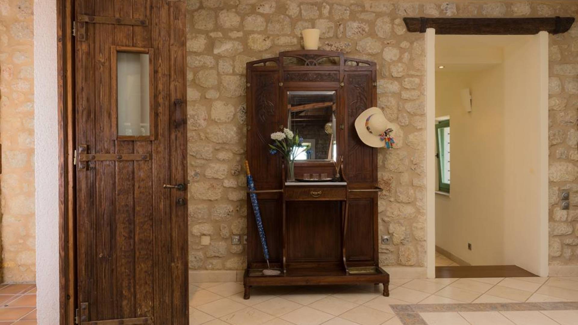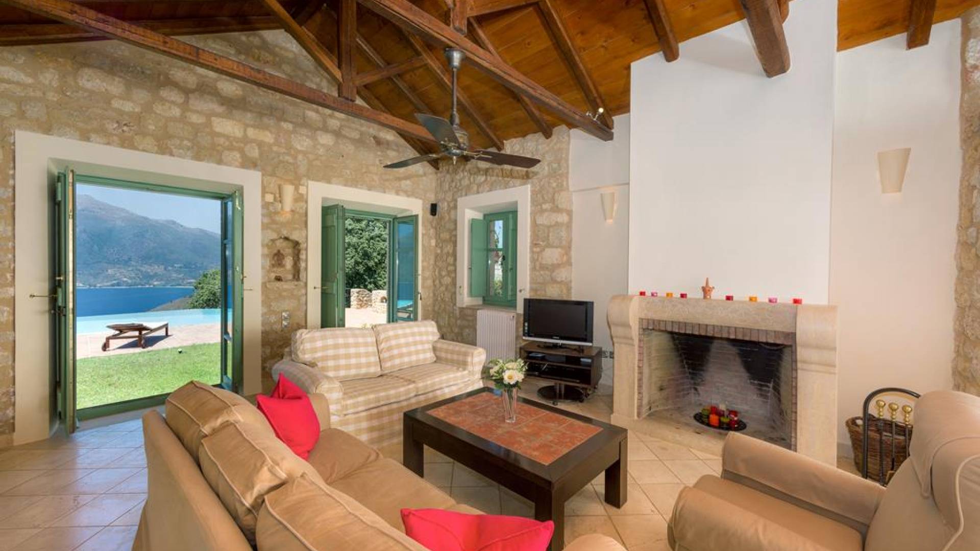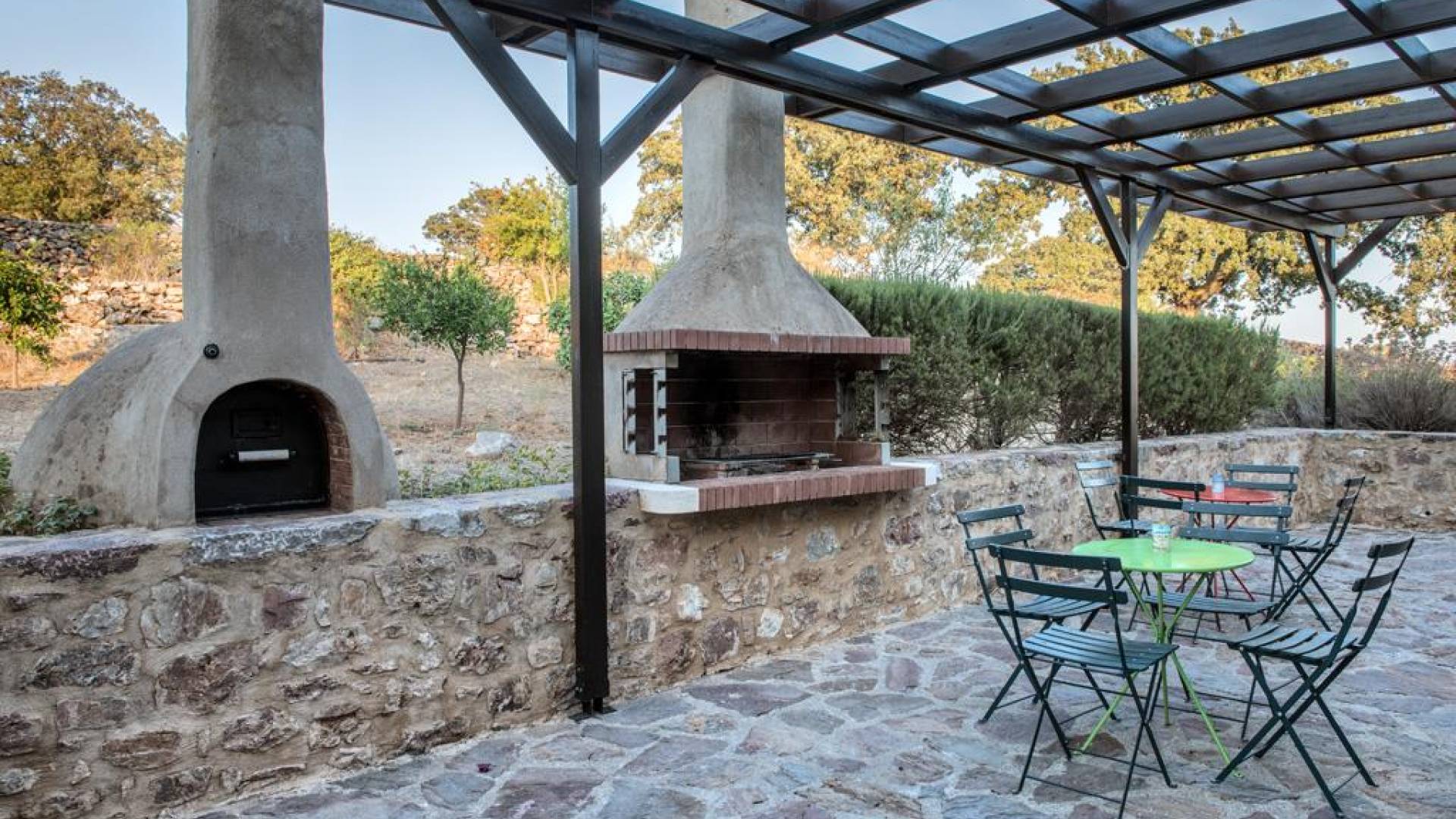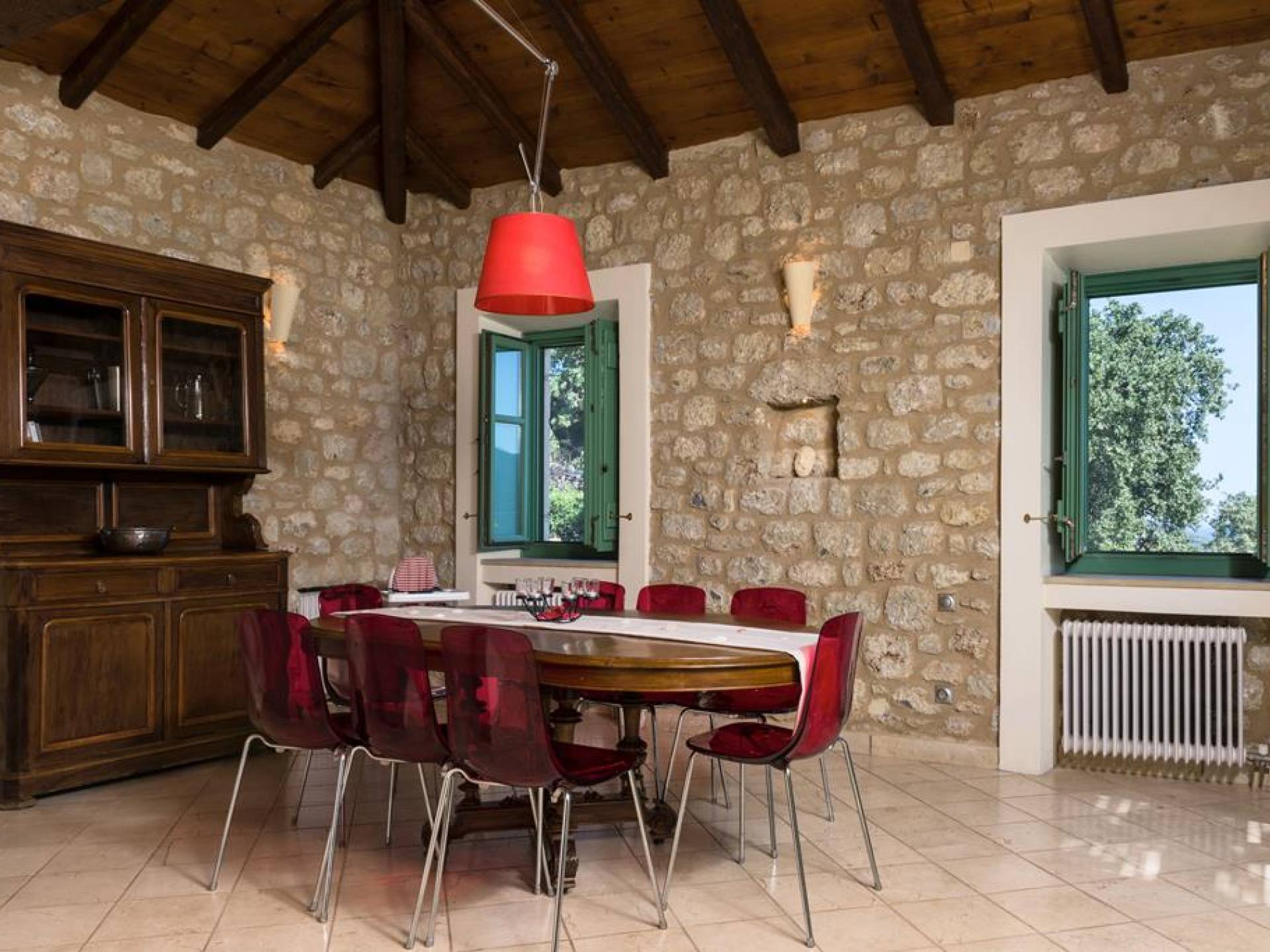 Die Steinwände werden mit einem modernen Interieur kombiniert, das auf Komfort ausgerichtet ist. Das traditionsreiche, aber einzigartige Anwesen bietet alle modernen Annehmlichkeiten, darunter unter anderem ein Soundsystem für verschiedene Bereiche des Hauses, Sat-TV, Grill und Holzofen sowie einen Infinity-Pool mit atemberaubender Aussicht. Die Farben sind schlicht, Creme und Stein, mit einem durchgehenden Fliesenboden. Die Fensterläden sind in hellem Pistazie gestrichen und helles Magenta wurde überall in die Polstermöbel und Esszimmerstühle eingeführt, die einen brillanten Kontrast zum Farbschema bilden. Große Türen im französischen Stil führen von jedem Bereich auf die Poolterrasse, die einen perfekten Ort zum Entspannen für jeden Teil des Tages bietet.