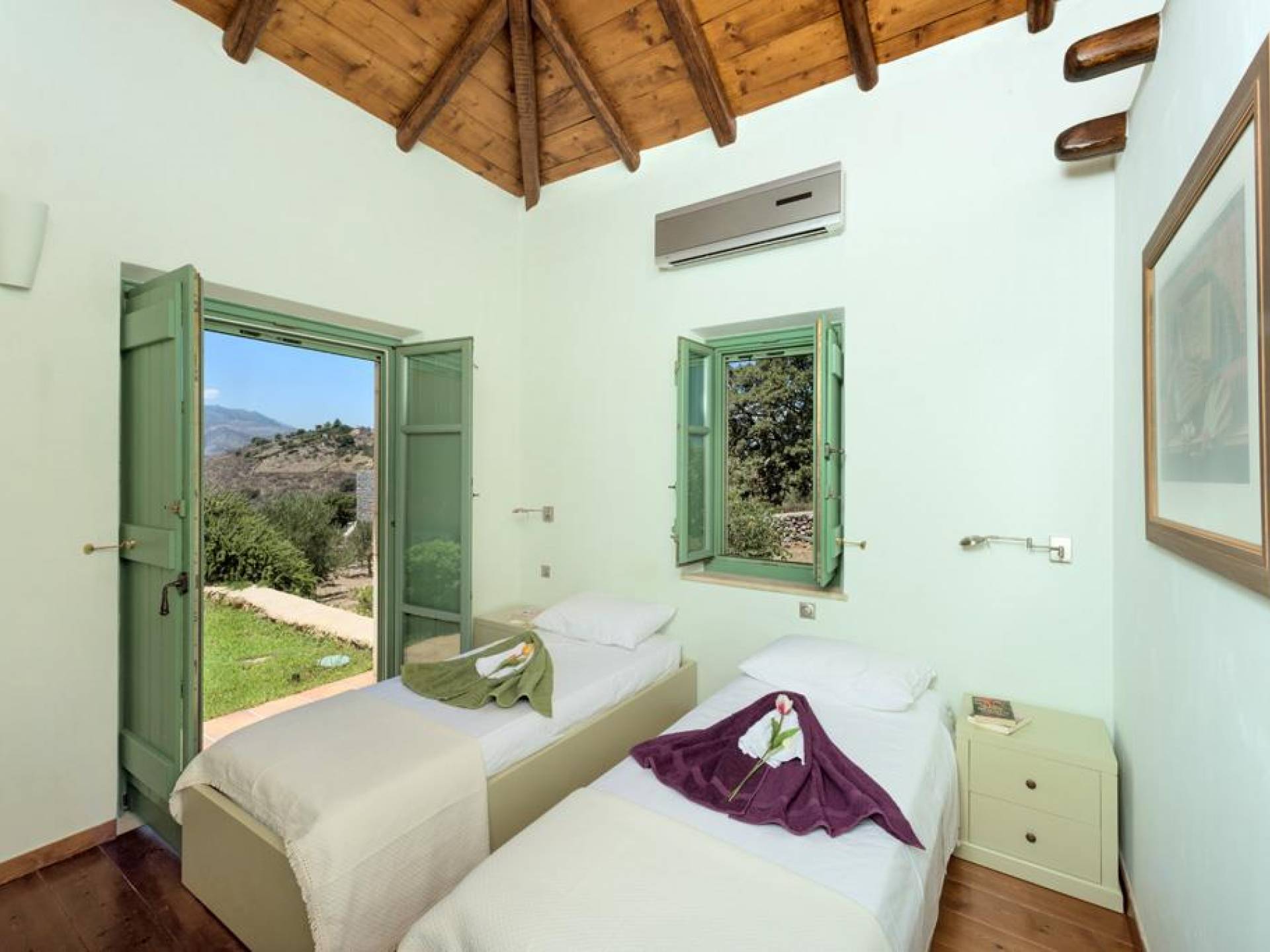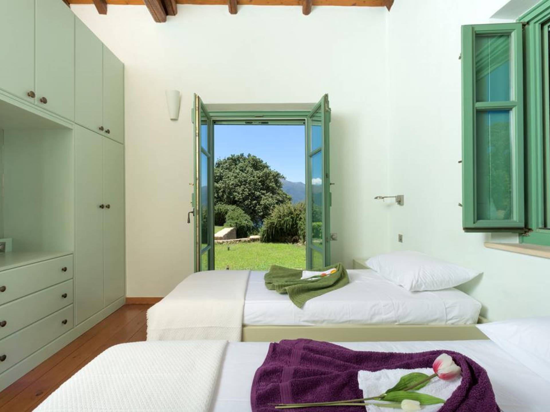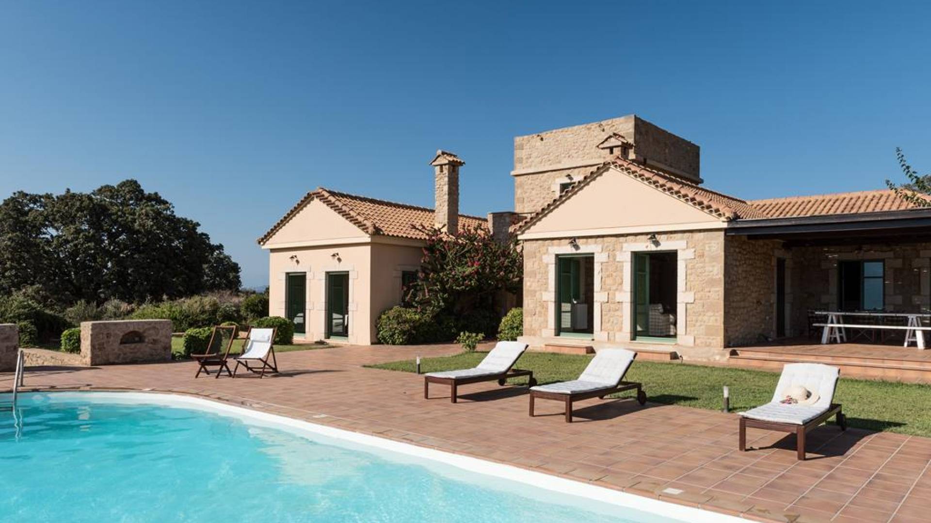 Genießen Sie Ihren Aufenthalt im Mani House mit den Sonnenliegen rund um den Pool, den schattigen Bereichen zum Essen oder sitzen Sie im Schatten der riesigen Eiche, während Sie Schach oder Backgammon spielen. Die Küche befindet sich im hinteren Teil des großen zentralen Wohnraums und ist komplett mit allen modernen Annehmlichkeiten ausgestattet. Es bietet direkten Zugang zu einer Terrasse an der Rückseite des Hauses, die im traditionellen Café-Stil mit hübschen Metallstühlen und -tischen sowie einem Grill und Brotofen die Aromen Griechenlands heraufbeschwört. Auf der gleichen Ebene, aber in einem separaten Flügel, befinden sich drei Schlafzimmer. Eines hat ein Doppelbett mit eigenem Bad mit Badewanne und einem großen Ankleidebereich. Weiter gibt es zwei Zweibettzimmer, jedes mit eigenem Bad mit Dusche. Alle Schlafzimmer haben direkten Zugang zur Poolterrasse.