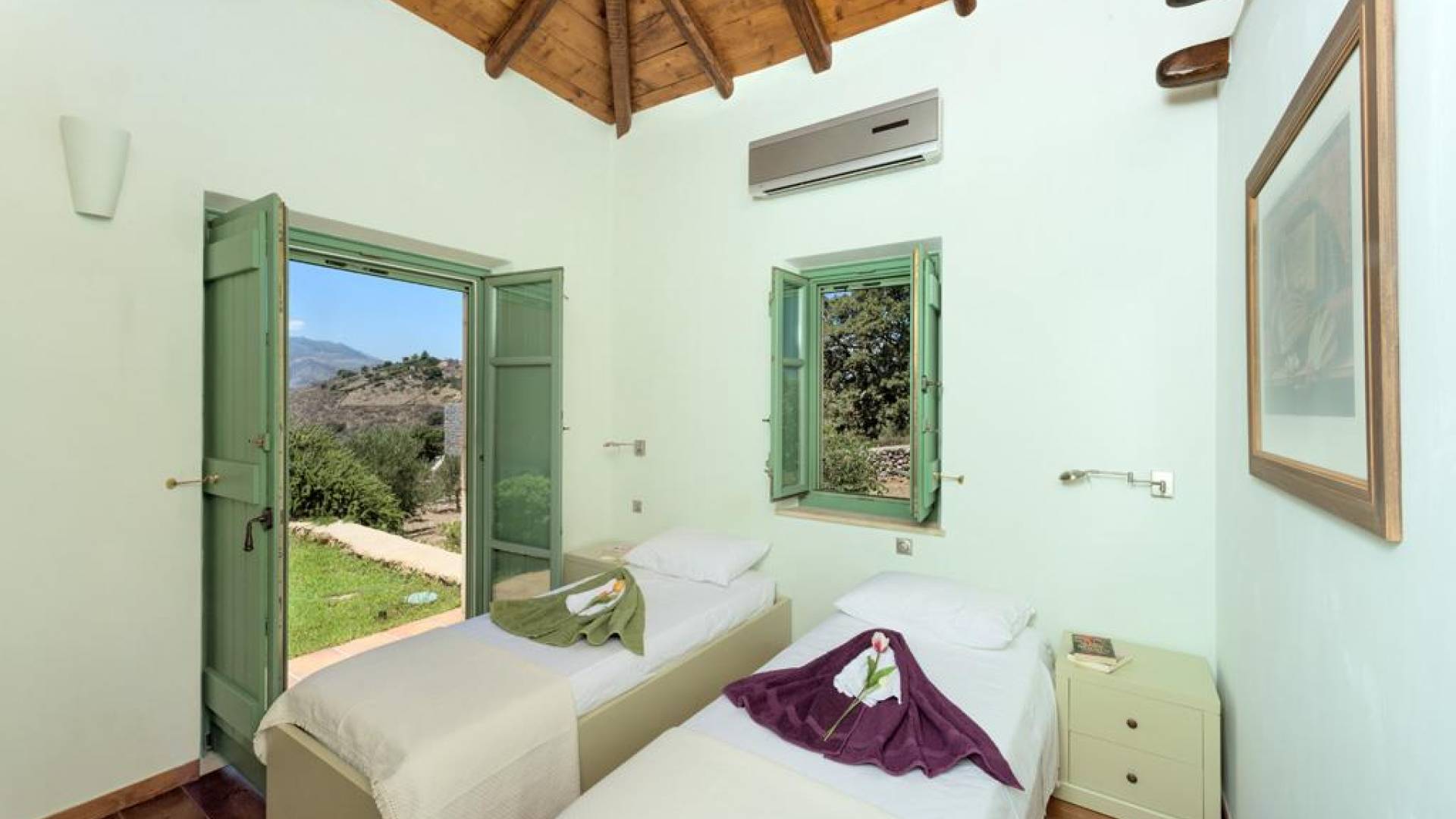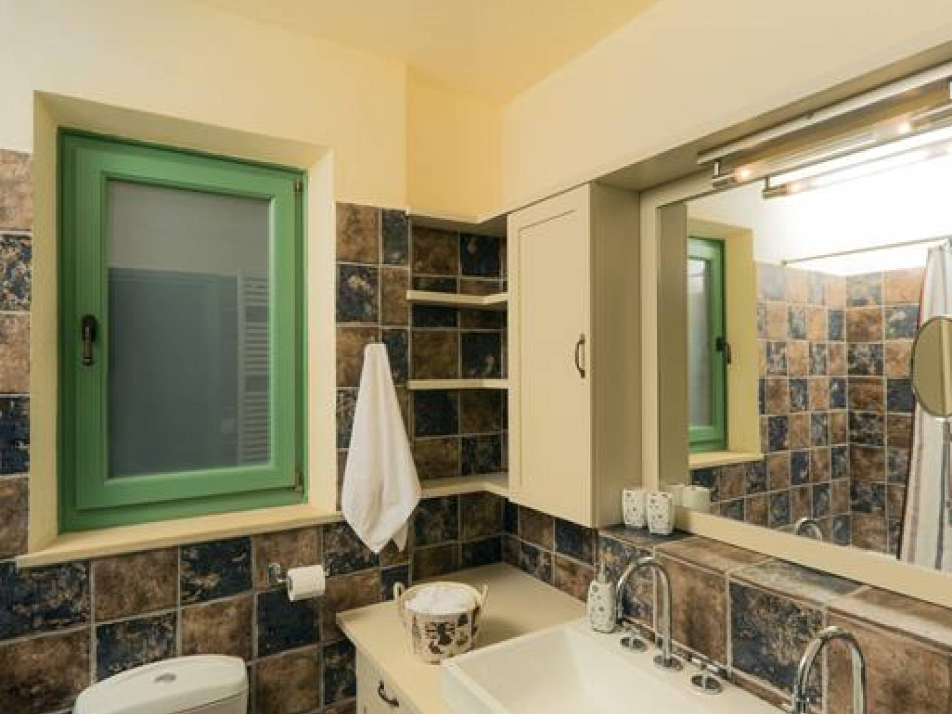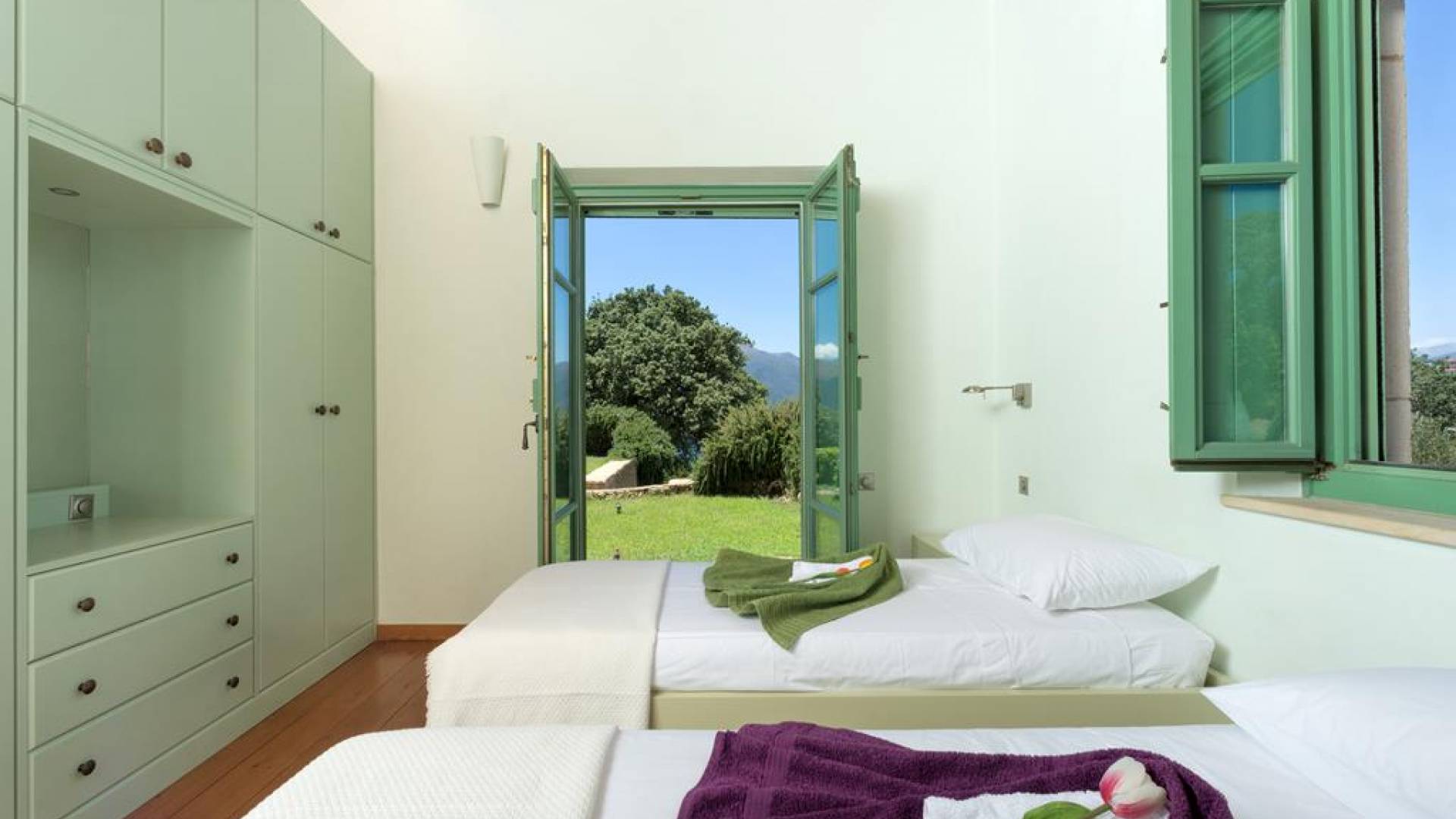 Genießen Sie Ihren Aufenthalt im Mani House mit den Sonnenliegen rund um den Pool, den schattigen Bereichen zum Essen oder sitzen Sie im Schatten der riesigen Eiche, während Sie Schach oder Backgammon spielen. Die Küche befindet sich im hinteren Teil des großen zentralen Wohnraums und ist komplett mit allen modernen Annehmlichkeiten ausgestattet. Es bietet direkten Zugang zu einer Terrasse an der Rückseite des Hauses, die im traditionellen Café-Stil mit hübschen Metallstühlen und -tischen sowie einem Grill und Brotofen die Aromen Griechenlands heraufbeschwört. Auf der gleichen Ebene, aber in einem separaten Flügel, befinden sich drei Schlafzimmer. Eines hat ein Doppelbett mit eigenem Bad mit Badewanne und einem großen Ankleidebereich. Weiter gibt es zwei Zweibettzimmer, jedes mit eigenem Bad mit Dusche. Alle Schlafzimmer haben direkten Zugang zur Poolterrasse.