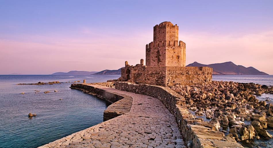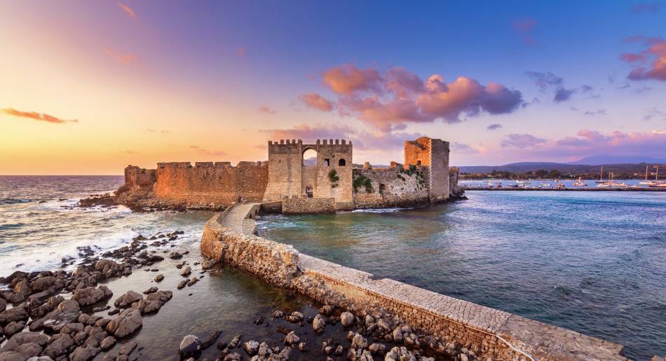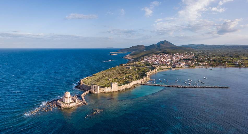 Methoni ist ein beliebtes Touristenziel auf dem Peloponnes, das eine Reihe antiker Denkmäler sowie byzantinische, venezianische und türkische Kirchen, Moscheen und Befestigungen bietet. Sein Juwel ist die venezianische Burg, die auf sehr imposante Weise aus dem Meer hervorgeht. Es ist auf einem Felsen gebaut, der ins Meer mündet und durch einen künstlichen Wassergraben vom Festland getrennt ist. Südlich der Burg befindet sich der Turm von Mpourtzi, der auf einer kleinen felsigen Insel errichtet wurde, die durch eine Brücke mit Bögen mit der Festung verbunden ist. In Methoni sehen Sie auch Herrenhäuser, die die Merkmale der lokalen Architektur beibehalten.