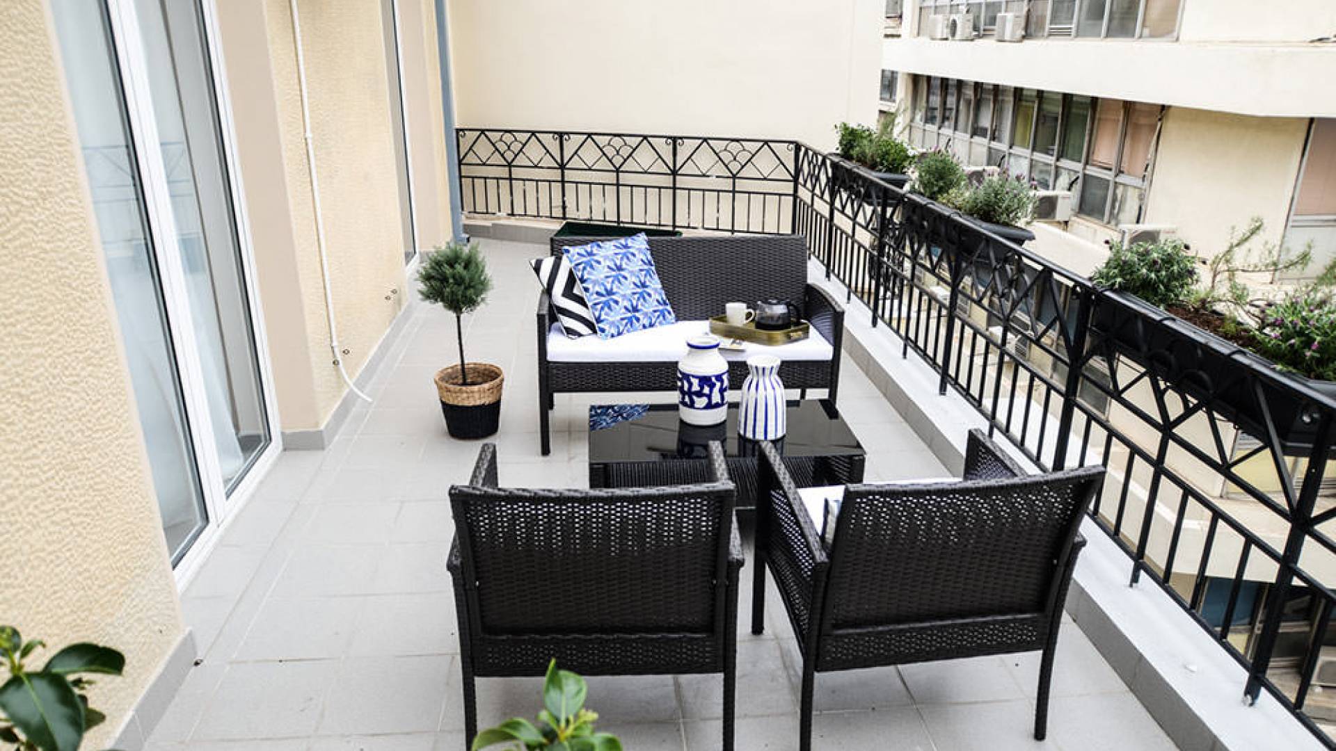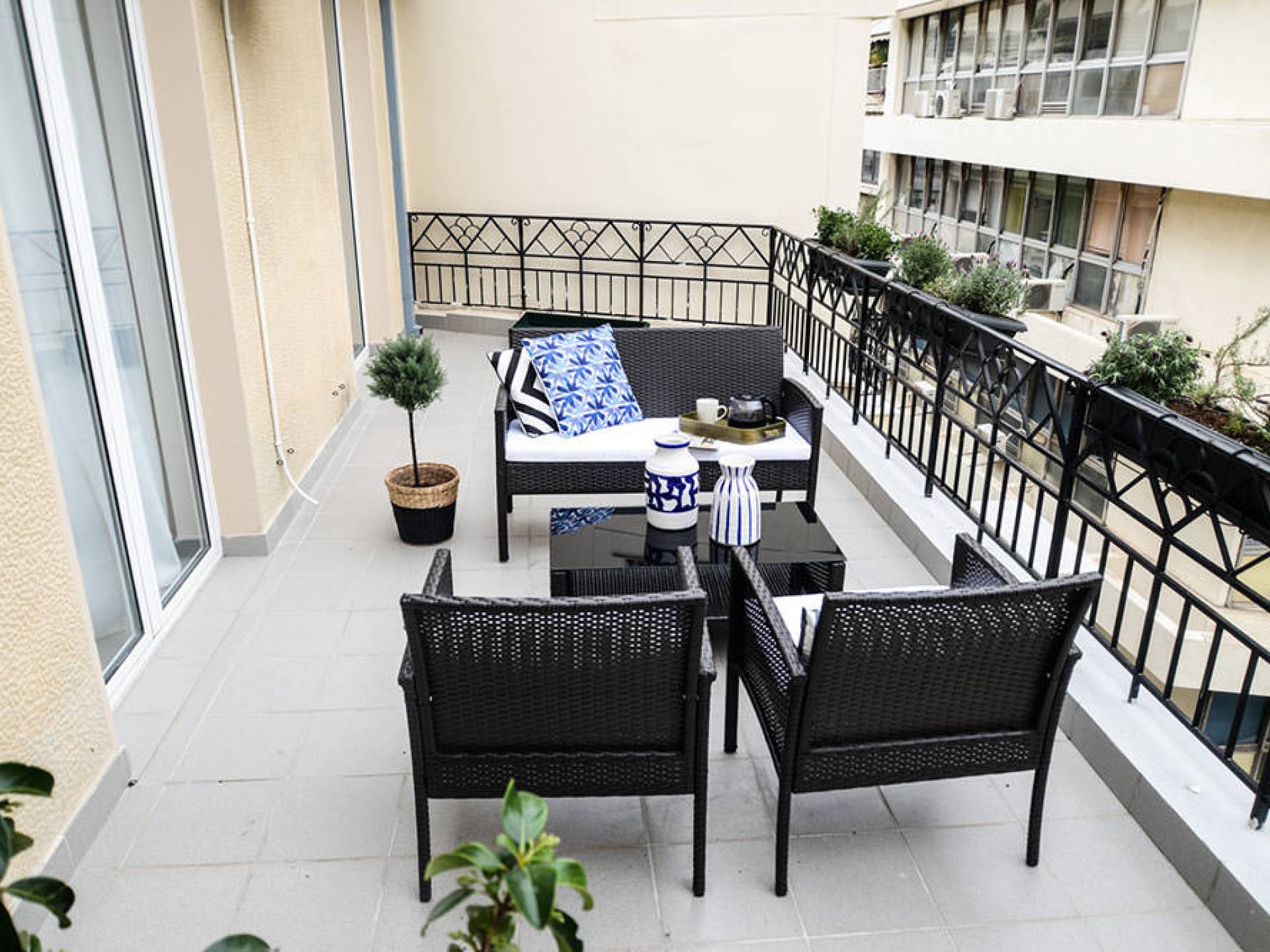 5 In Athen Apartment 4: Ein 62 m² großes Apartment mit einem Balkon mit Blick auf den Lycabettus-Hügel. Küche mit Induktionskochfeld mit Backofen, Kühlschrank, Toaster, Nespresso-Maschine und French Press. Zugang zum Balkon mit Blick auf den Karitsi-Platz und den St.-Georgs-Tempel vom Schlafzimmer oder Wohnzimmer aus.