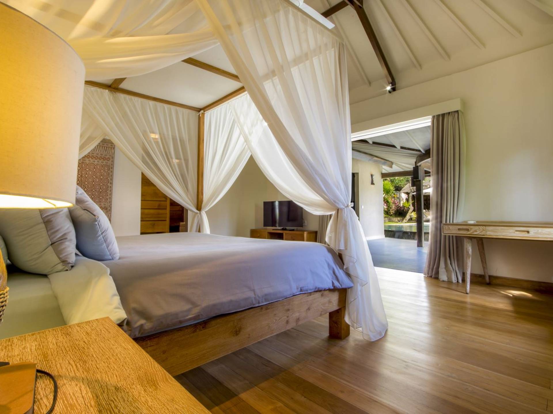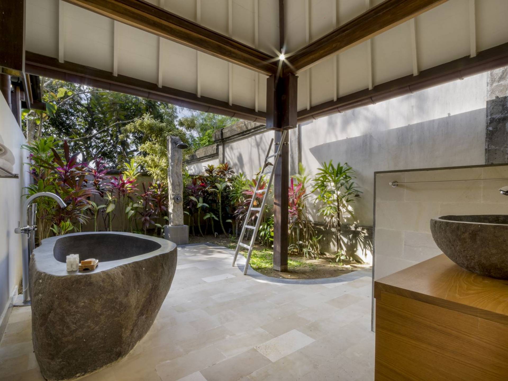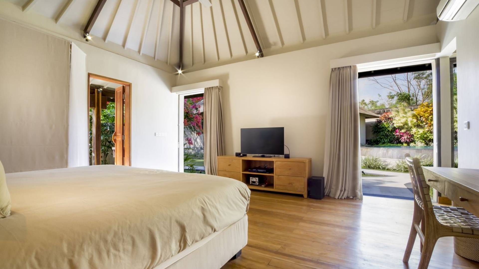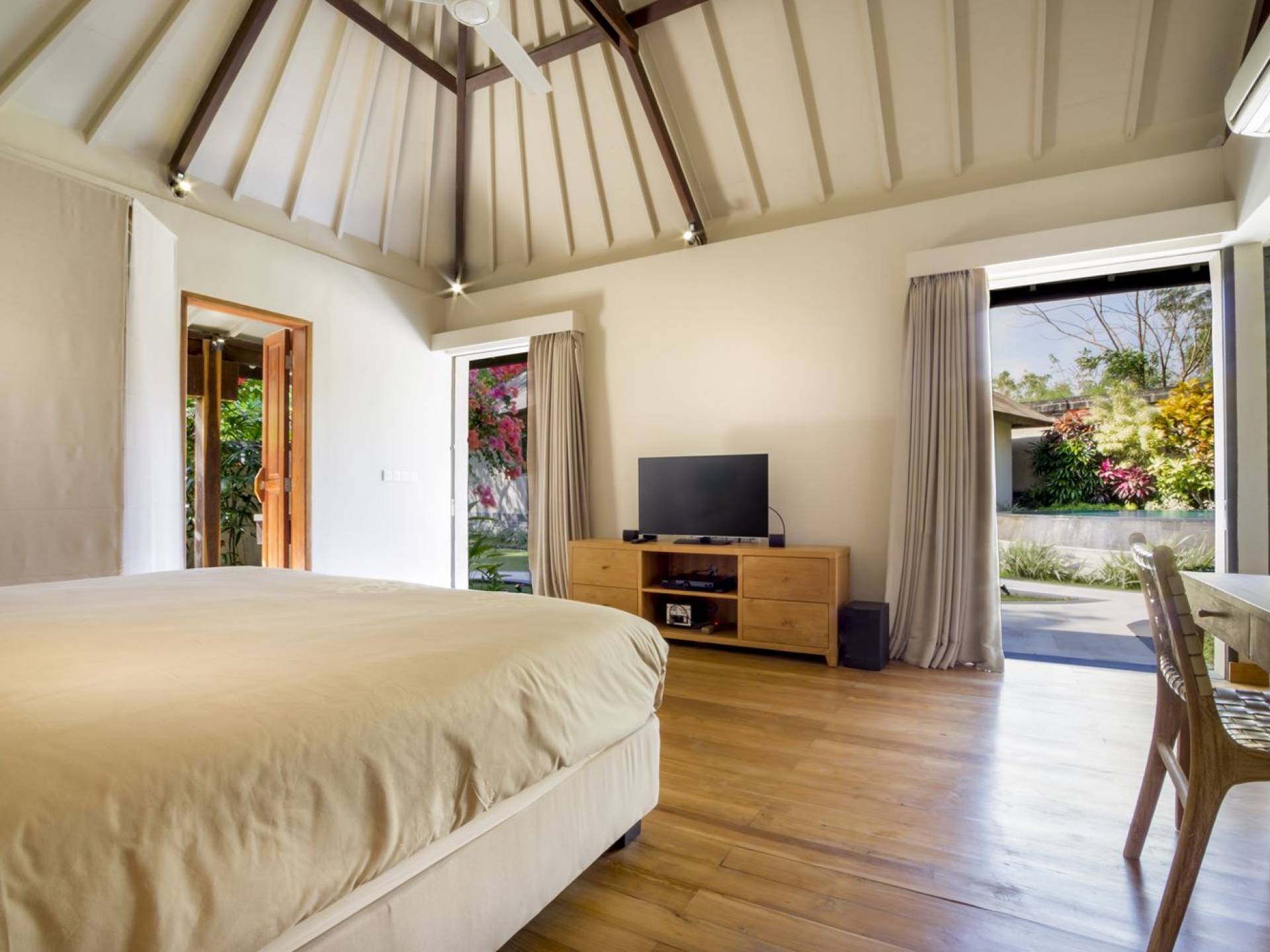Villa Markisa ist eine Villa mit 3 Schlafzimmern und alle 3 Schlafzimmer sind geräumig, klimatisiert und mit ihren hochwertigen Betten, Laken und Kissen sehr komfortabel. Das Hauptschlafzimmer befindet sich in einem privaten, unabhängigen Pavillon, der sich zum Garten hin öffnet. Dieses luxuriöse Schlafzimmer verfügt über ein Kingsize-Bett, einen Fernseher mit internationalen Kanälen, einen Schreibtisch, ein Ankleidezimmer und ein atemberaubendes Open-Air-Badezimmer mit großer Badewanne und Außendusche. Die 2 Gästezimmer teilen sich einen dritten Gartenpavillon und eine Veranda. Ein Schlafzimmer ist mit einem Queensize-Bett mit Baldachin ausgestattet, das andere mit zwei Einzelbetten, die auf Anfrage in ein Kingsize-Bett umgewandelt werden können. Außerdem verfügen diese 2 Schlafzimmer über geräumige Umkleideräume und Badezimmer im Garten mit Badewannen und Duschen im Freien. Alle Gäste der Villa Markisa genießen den gleichen modernen Komfort und Luxus. Wie wunderbar!