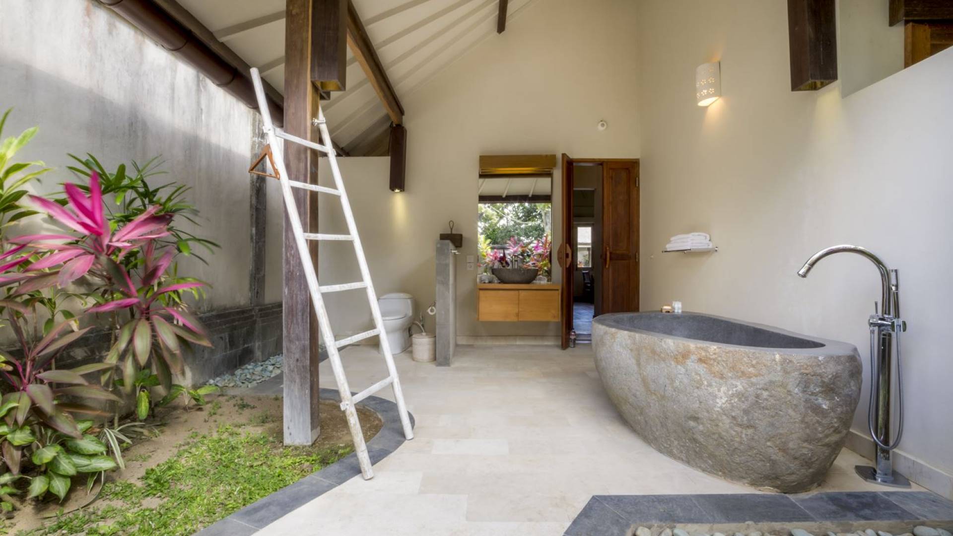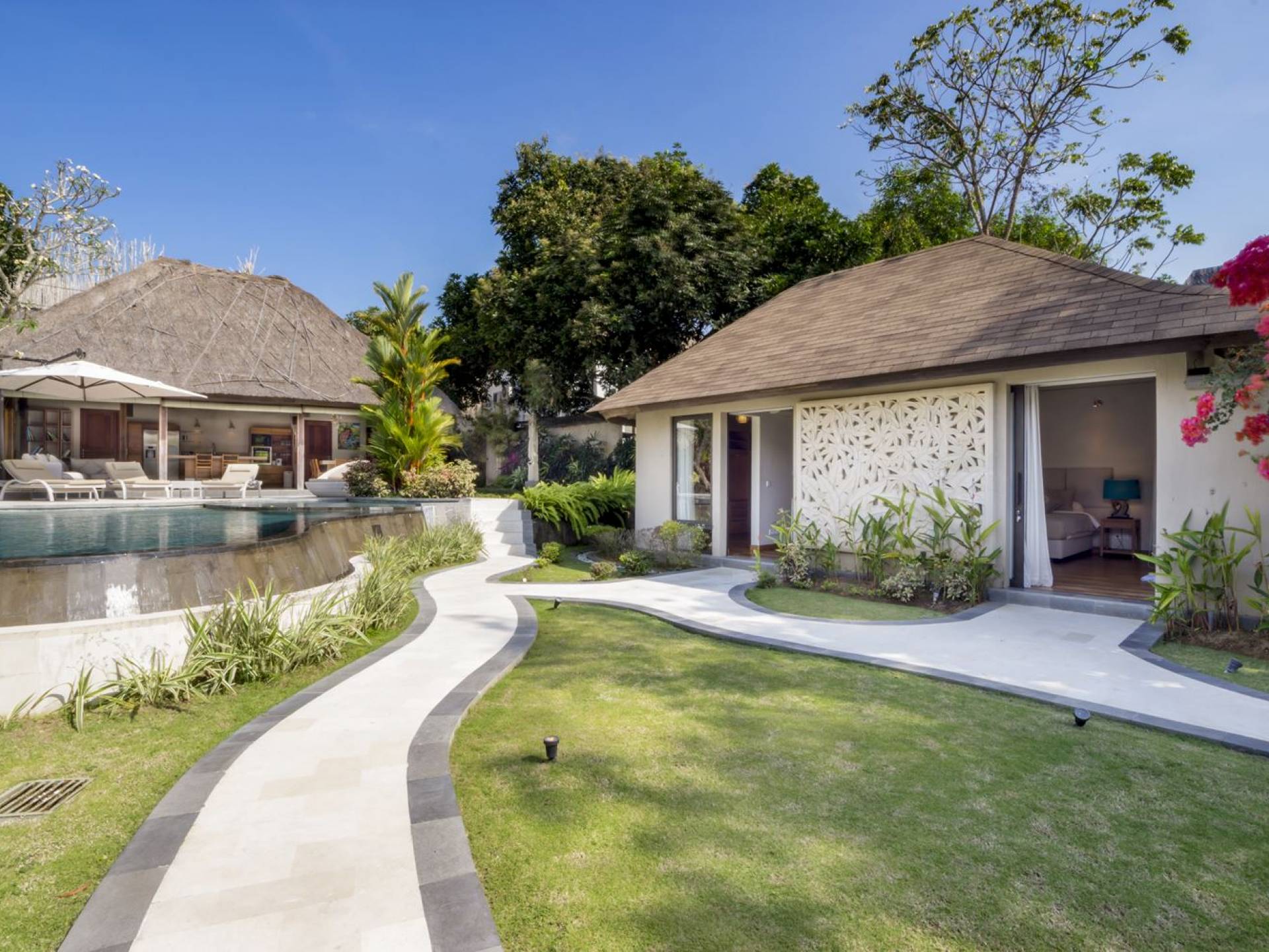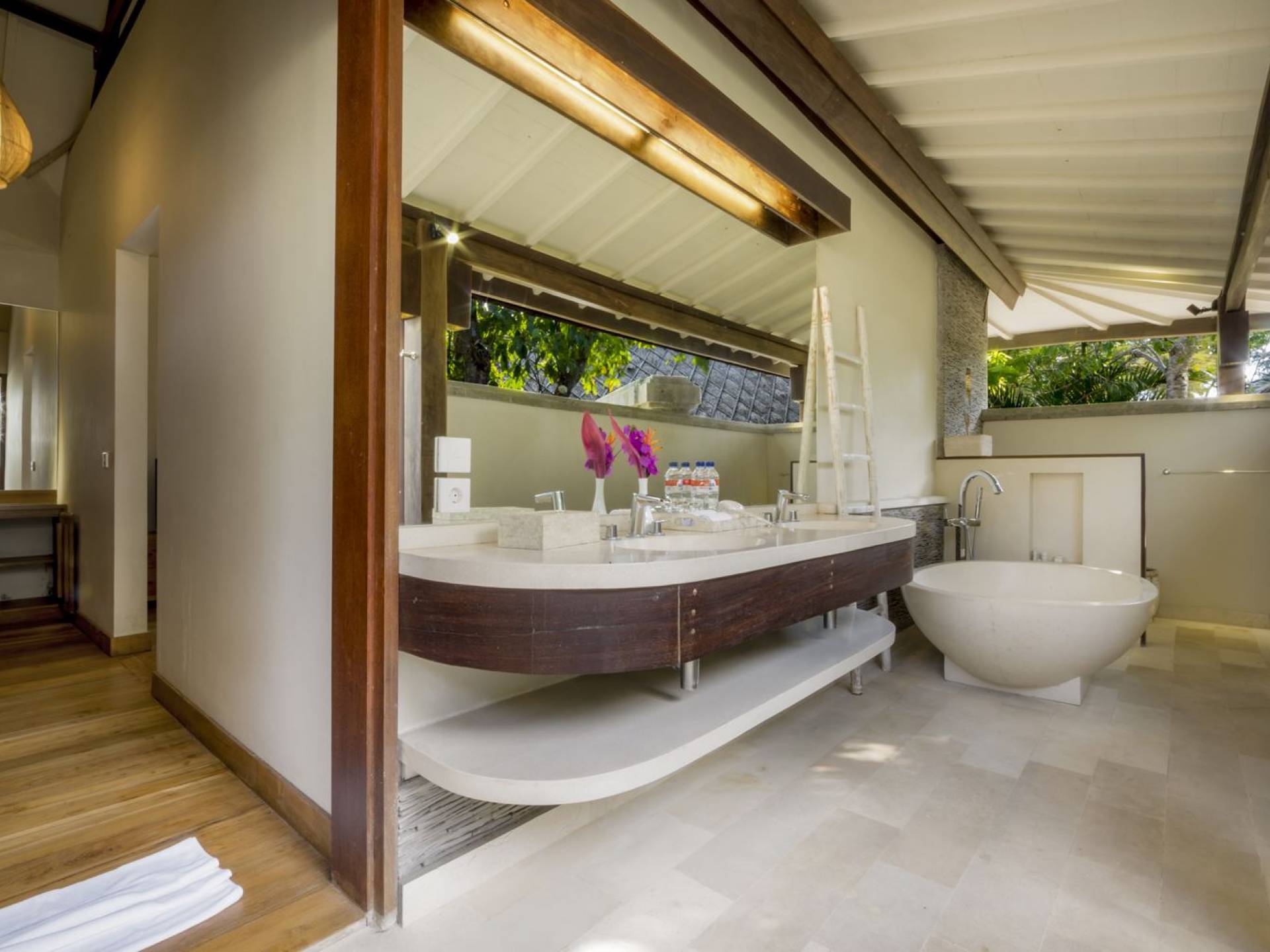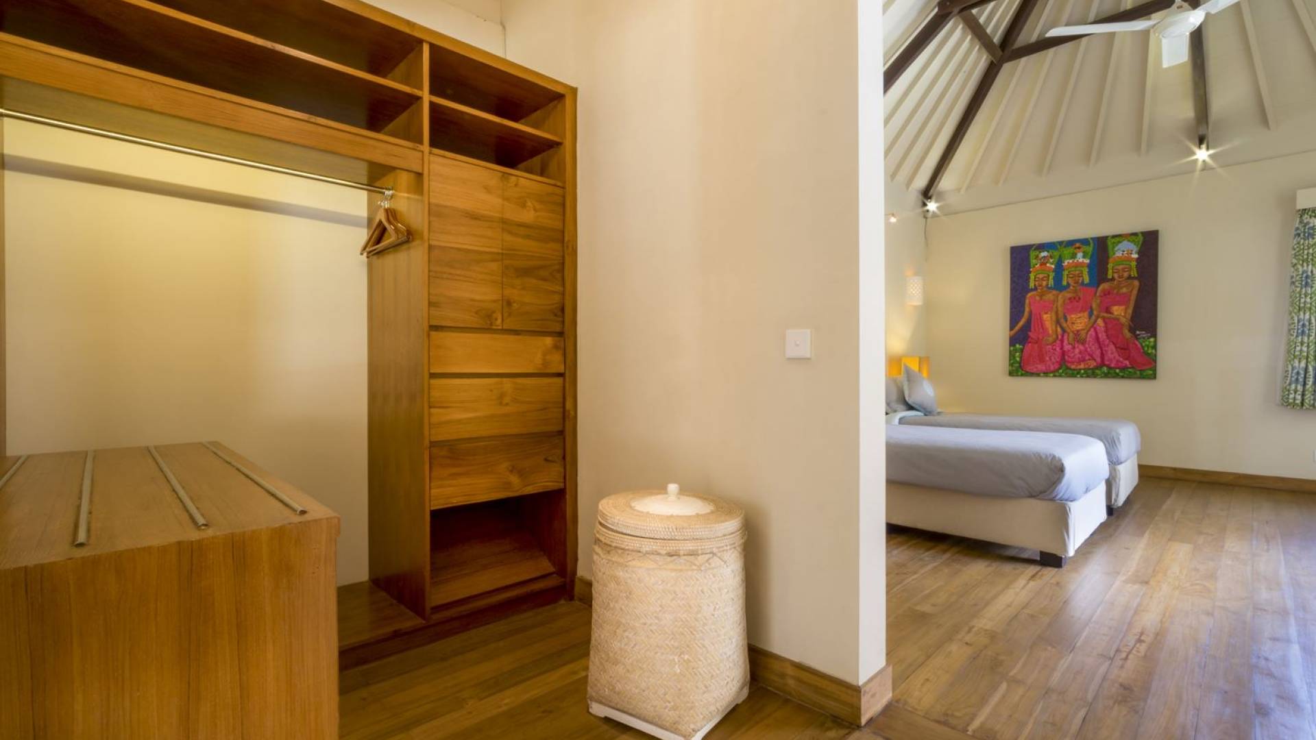 Villa Markisa ist eine Villa mit 3 Schlafzimmern und alle 3 Schlafzimmer sind geräumig, klimatisiert und mit ihren hochwertigen Betten, Laken und Kissen sehr komfortabel. Das Hauptschlafzimmer befindet sich in einem privaten, unabhängigen Pavillon, der sich zum Garten hin öffnet. Dieses luxuriöse Schlafzimmer verfügt über ein Kingsize-Bett, einen Fernseher mit internationalen Kanälen, einen Schreibtisch, ein Ankleidezimmer und ein atemberaubendes Open-Air-Badezimmer mit großer Badewanne und Außendusche. Die 2 Gästezimmer teilen sich einen dritten Gartenpavillon und eine Veranda. Ein Schlafzimmer ist mit einem Queensize-Bett mit Baldachin ausgestattet, das andere mit zwei Einzelbetten, die auf Anfrage in ein Kingsize-Bett umgewandelt werden können. Außerdem verfügen diese 2 Schlafzimmer über geräumige Umkleideräume und Badezimmer im Garten mit Badewannen und Duschen im Freien. Alle Gäste der Villa Markisa genießen den gleichen modernen Komfort und Luxus. Wie wunderbar!