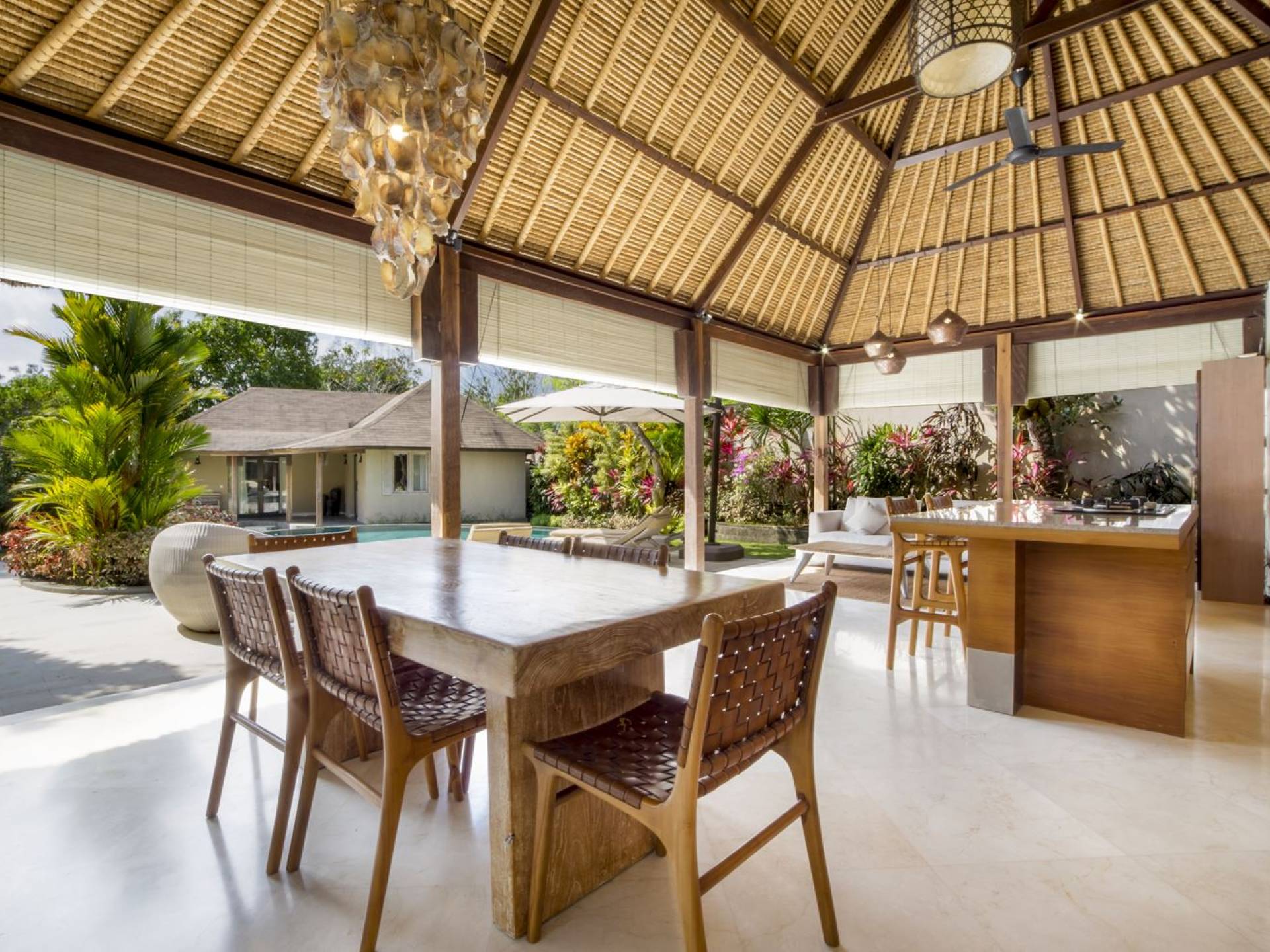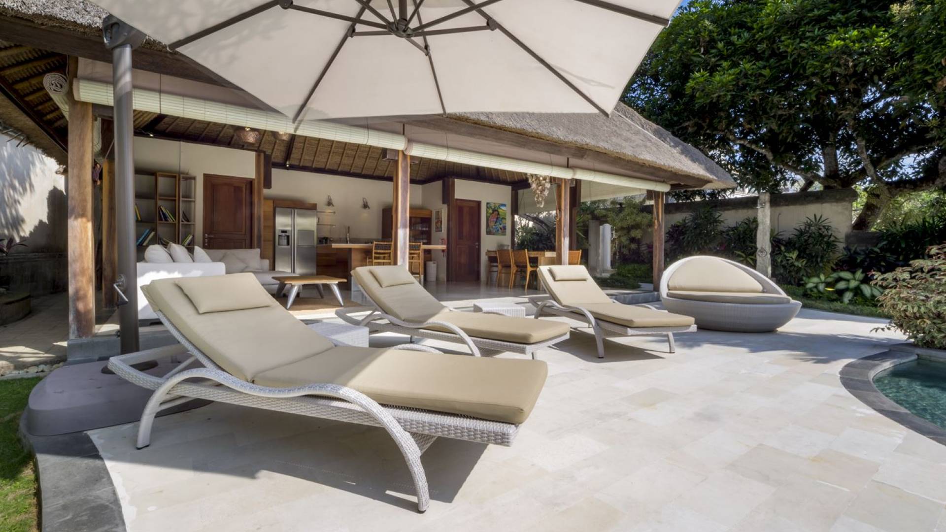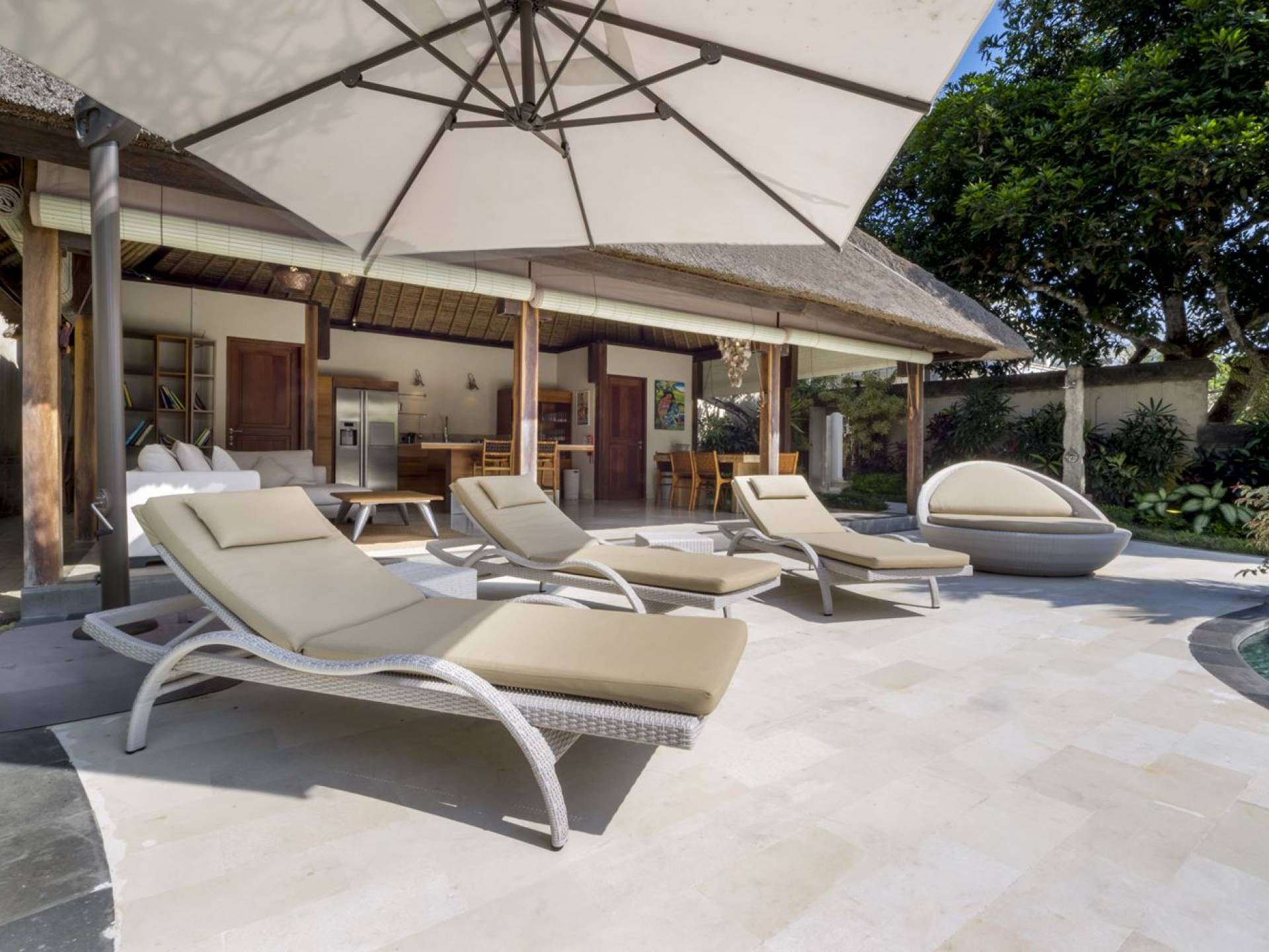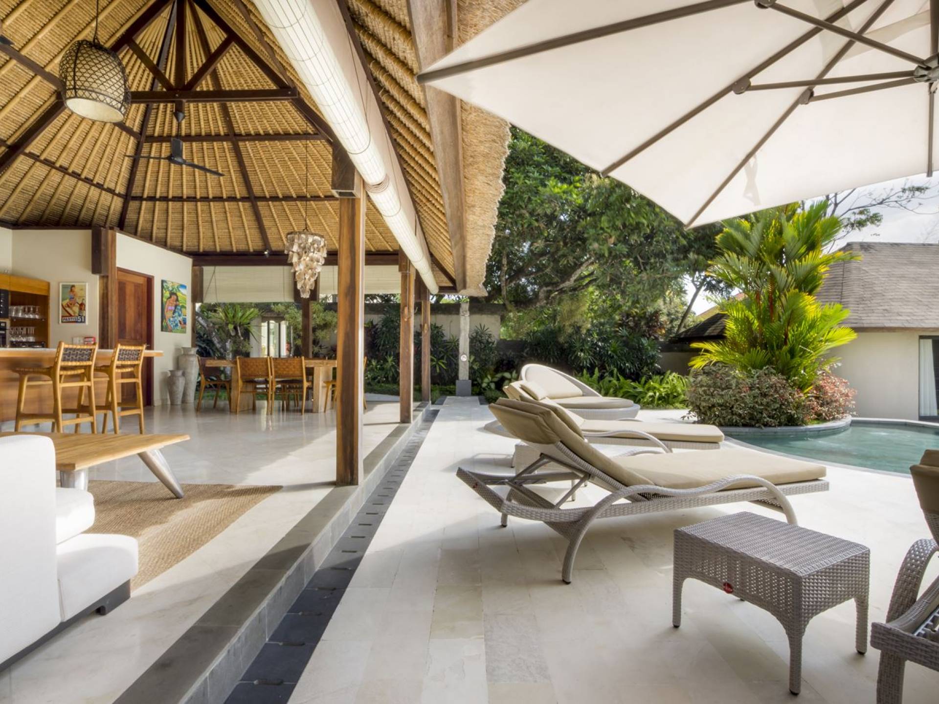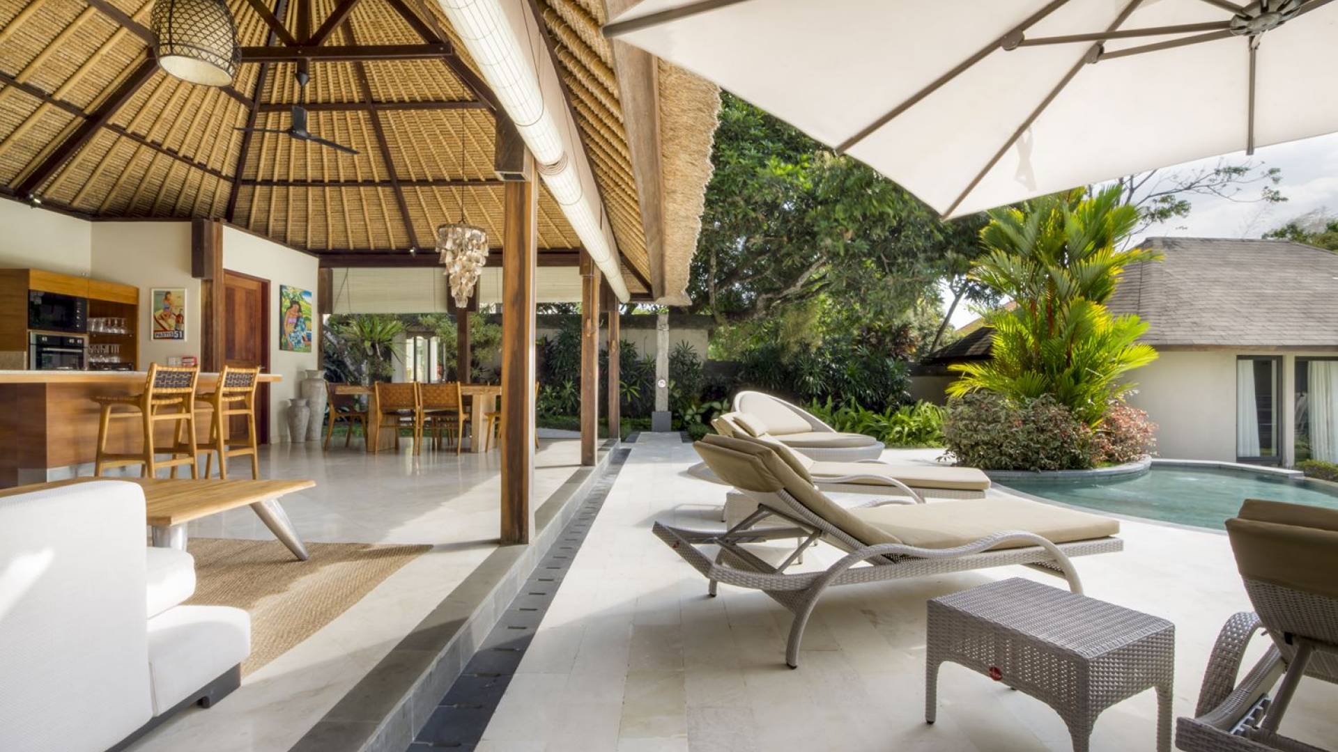 Das Wohnzimmer bietet einen herrlichen Blick auf den Garten und den Pool. Auf der einen Seite gibt es ein schickes, weißes L-förmiges Sofa mit Couchtisch und einen Holzschrank mit Büchern und Zeitschriften zum Lesen. Auf der anderen Seite befindet sich ein hübscher, weiß getünchter Esstisch für 6 Personen, und dazwischen befindet sich eine stilvolle, europäische Küche, die mit einem Ofen, einer Mikrowelle und einem Hightech-Kühlschrank mit Doppeltür ausgestattet ist. Küchengeräte sind von führenden Marken und um das Ganze abzurunden, gibt es eine lange Holzbar mit 2 Hochstühlen, die einen weiteren schönen Ort schafft, um etwas zu trinken, Musik zu hören und mit Ihren Lieben zu entspannen. Der Garten ist vollständig von hohen, ausgewachsenen tropischen Bäumen, blühenden Pflanzen und weiterer tropischer Schönheit umgeben, was dieser Villa eine sehr abgeschiedene und paradiesische Atmosphäre verleiht. Nicht zu vergessen der atemberaubende lagunenförmige Infinity-Pool mit separatem flachen Bereich für die Kinder. Das Sonnendeck aus weißem Stein ist mit weißen Rattansesseln und Tagesbetten ausgestattet, die teilweise von einem großen Sonnenschirm beschattet werden.