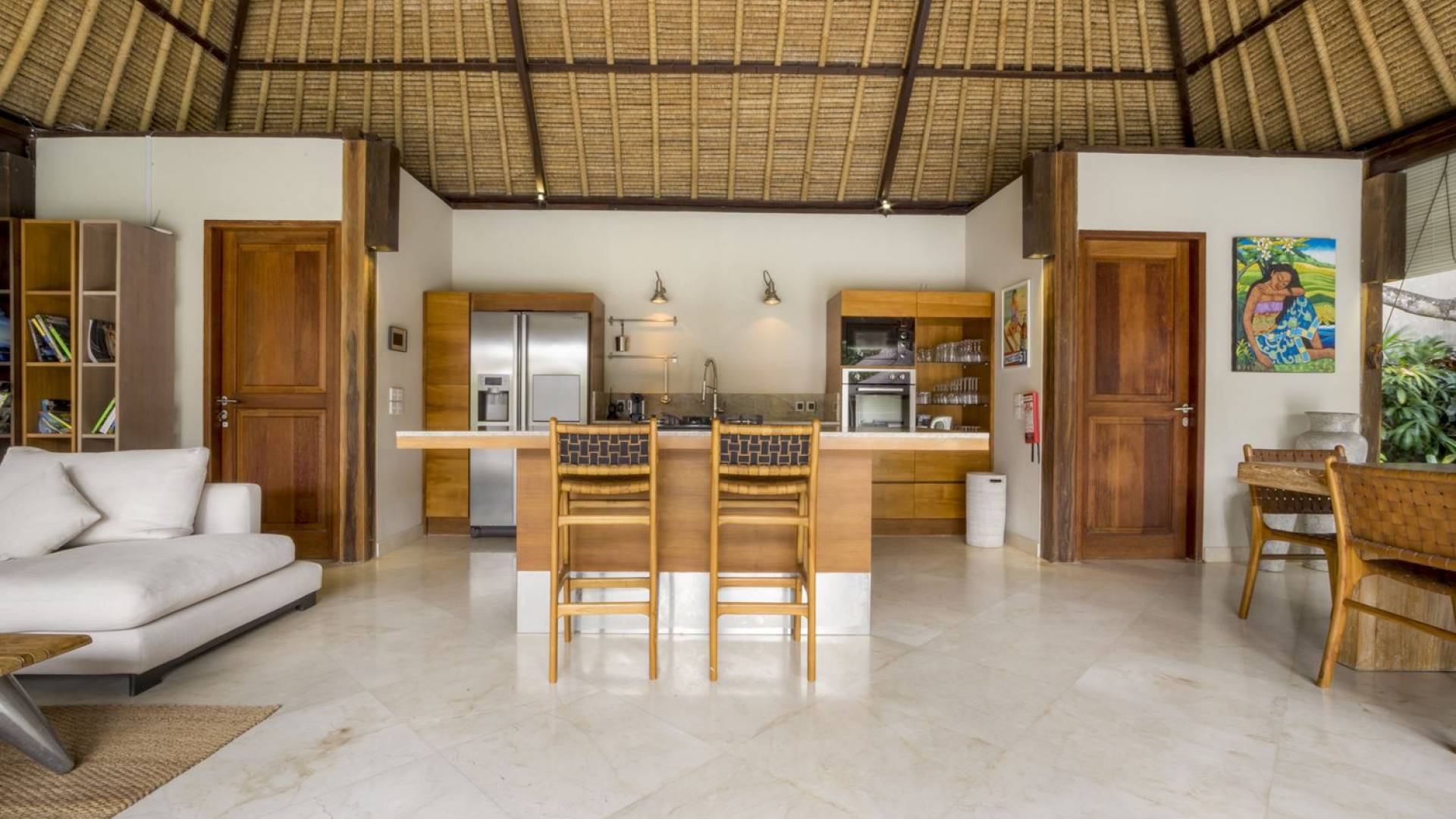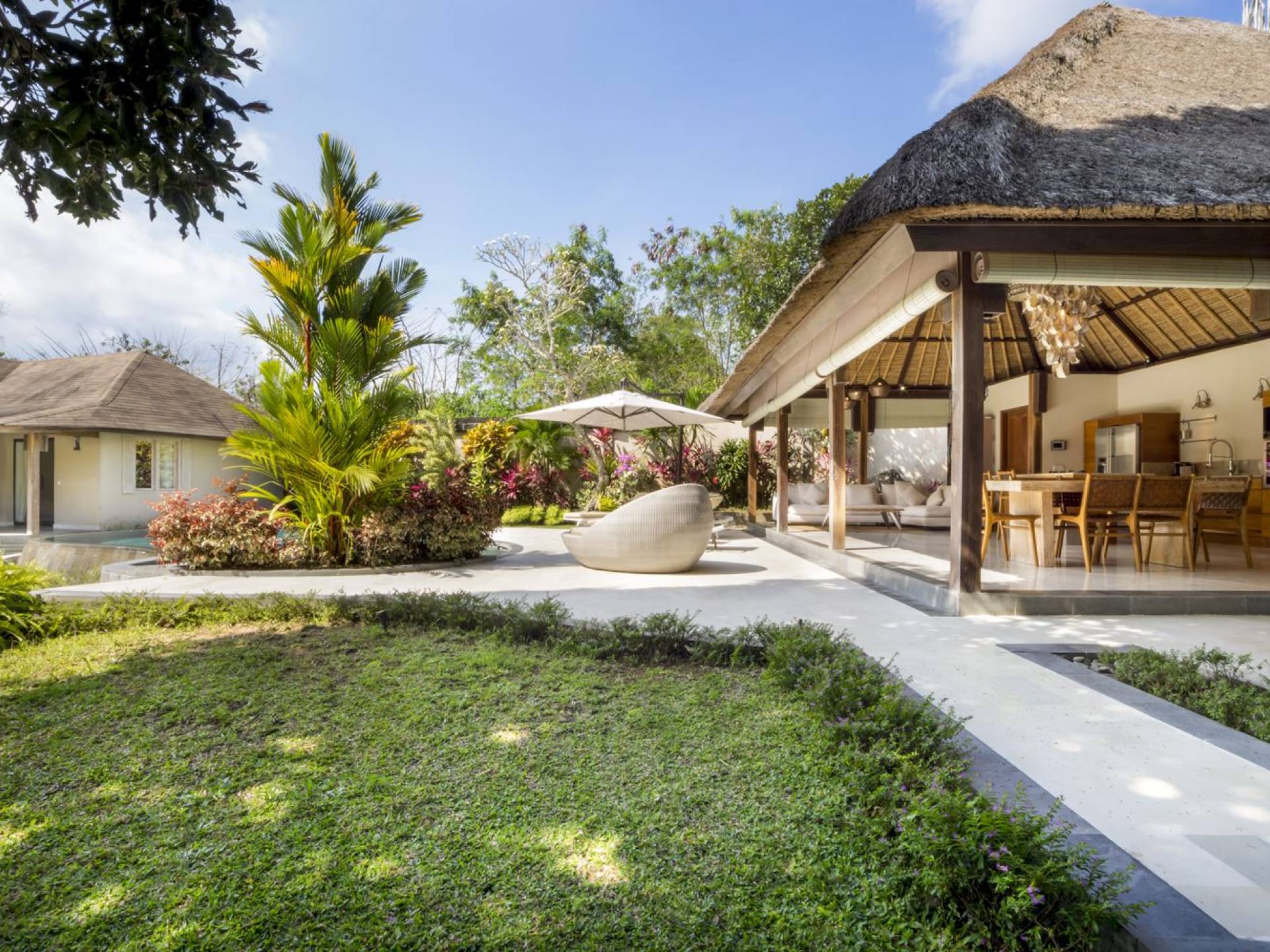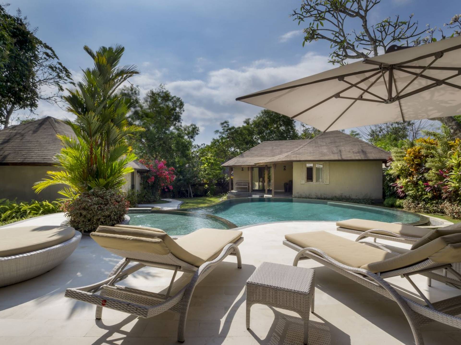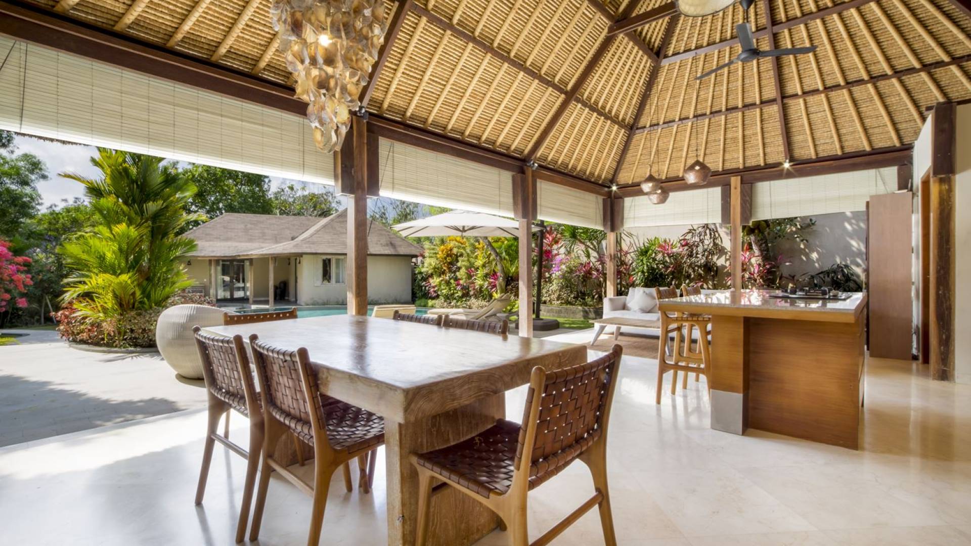 Das Wohnzimmer bietet einen herrlichen Blick auf den Garten und den Pool. Auf der einen Seite gibt es ein schickes, weißes L-förmiges Sofa mit Couchtisch und einen Holzschrank mit Büchern und Zeitschriften zum Lesen. Auf der anderen Seite befindet sich ein hübscher, weiß getünchter Esstisch für 6 Personen, und dazwischen befindet sich eine stilvolle, europäische Küche, die mit einem Ofen, einer Mikrowelle und einem Hightech-Kühlschrank mit Doppeltür ausgestattet ist. Küchengeräte sind von führenden Marken und um das Ganze abzurunden, gibt es eine lange Holzbar mit 2 Hochstühlen, die einen weiteren schönen Ort schafft, um etwas zu trinken, Musik zu hören und mit Ihren Lieben zu entspannen. Der Garten ist vollständig von hohen, ausgewachsenen tropischen Bäumen, blühenden Pflanzen und weiterer tropischer Schönheit umgeben, was dieser Villa eine sehr abgeschiedene und paradiesische Atmosphäre verleiht. Nicht zu vergessen der atemberaubende lagunenförmige Infinity-Pool mit separatem flachen Bereich für die Kinder. Das Sonnendeck aus weißem Stein ist mit weißen Rattansesseln und Tagesbetten ausgestattet, die teilweise von einem großen Sonnenschirm beschattet werden.