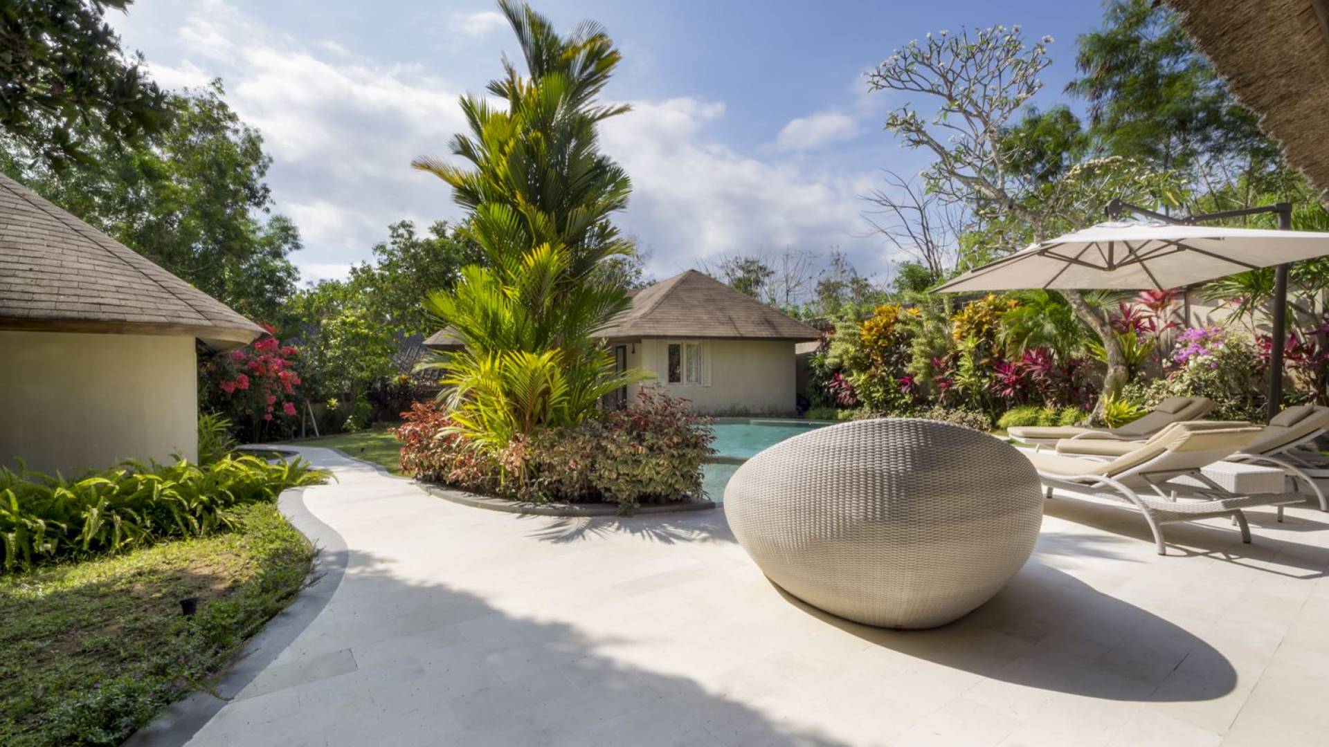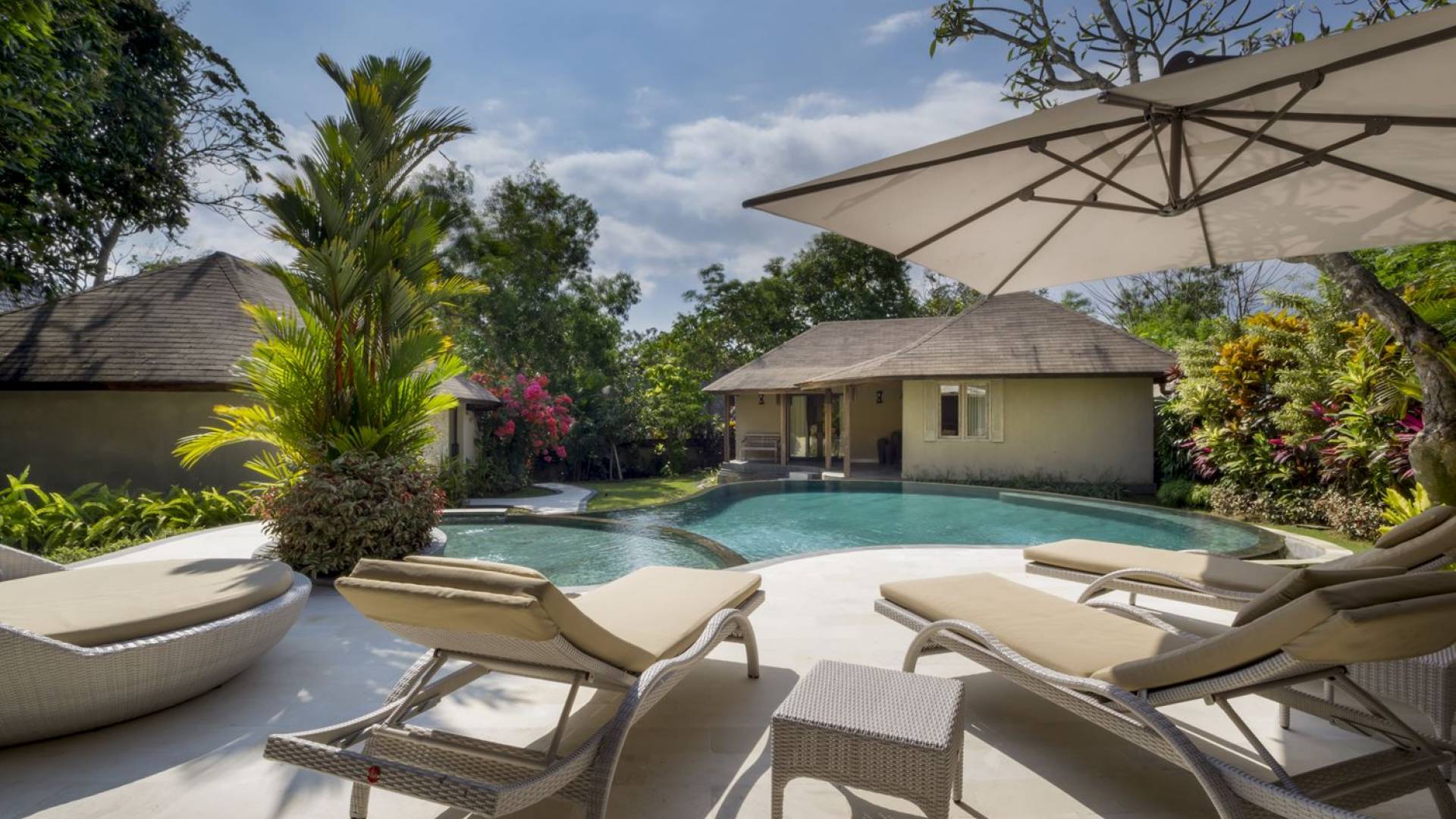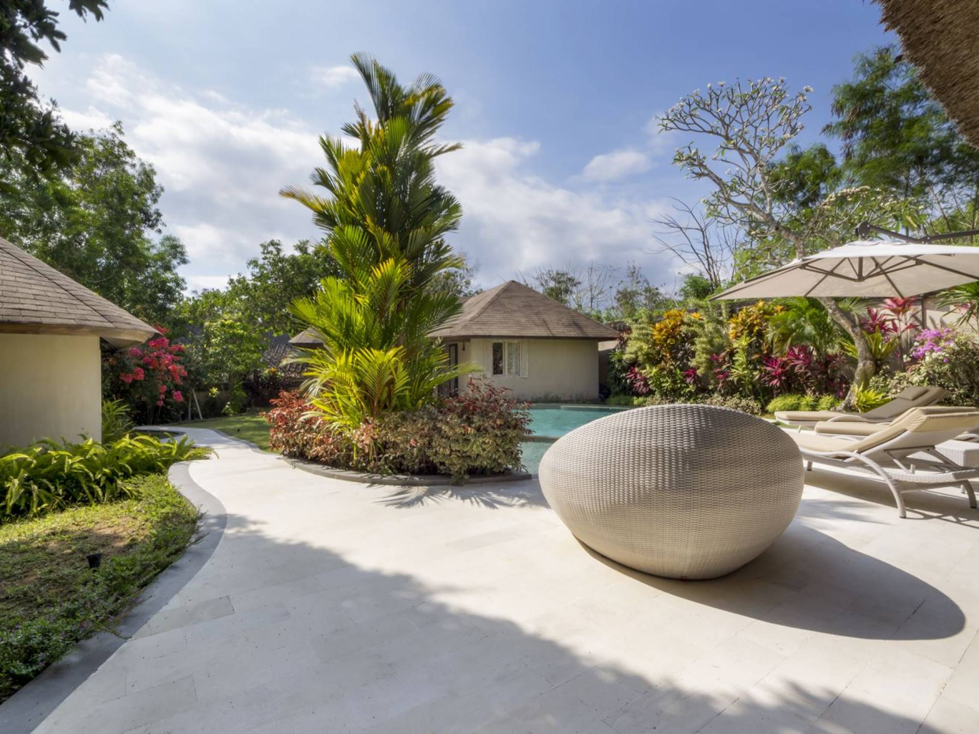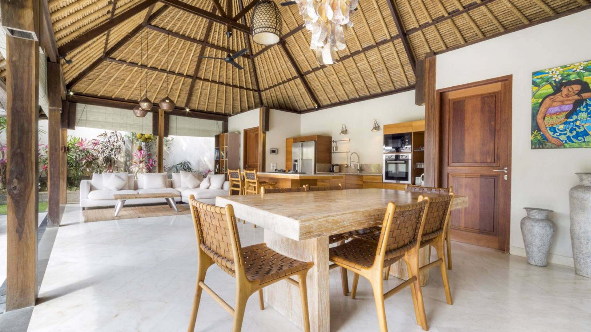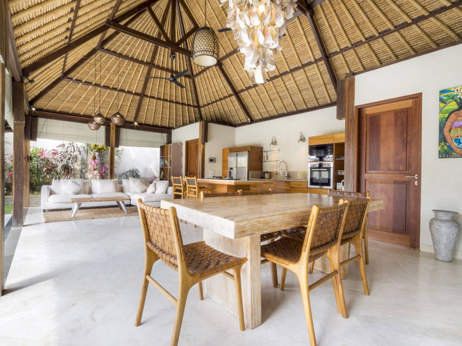 Das Wohnzimmer bietet einen herrlichen Blick auf den Garten und den Pool. Auf der einen Seite gibt es ein schickes, weißes L-förmiges Sofa mit Couchtisch und einen Holzschrank mit Büchern und Zeitschriften zum Lesen. Auf der anderen Seite befindet sich ein hübscher, weiß getünchter Esstisch für 6 Personen, und dazwischen befindet sich eine stilvolle, europäische Küche, die mit einem Ofen, einer Mikrowelle und einem Hightech-Kühlschrank mit Doppeltür ausgestattet ist. Küchengeräte sind von führenden Marken und um das Ganze abzurunden, gibt es eine lange Holzbar mit 2 Hochstühlen, die einen weiteren schönen Ort schafft, um etwas zu trinken, Musik zu hören und mit Ihren Lieben zu entspannen. Der Garten ist vollständig von hohen, ausgewachsenen tropischen Bäumen, blühenden Pflanzen und weiterer tropischer Schönheit umgeben, was dieser Villa eine sehr abgeschiedene und paradiesische Atmosphäre verleiht. Nicht zu vergessen der atemberaubende lagunenförmige Infinity-Pool mit separatem flachen Bereich für die Kinder. Das Sonnendeck aus weißem Stein ist mit weißen Rattansesseln und Tagesbetten ausgestattet, die teilweise von einem großen Sonnenschirm beschattet werden.