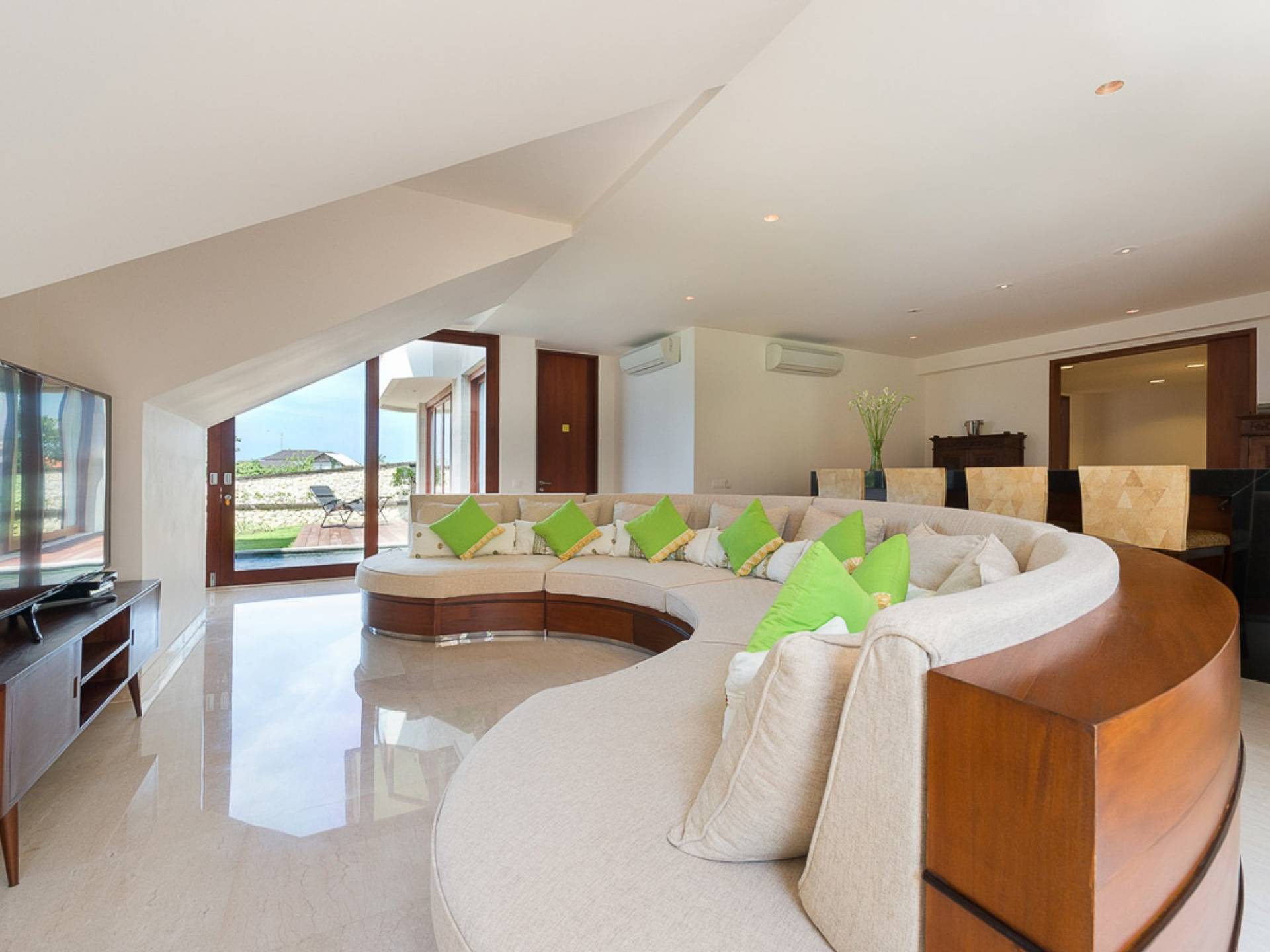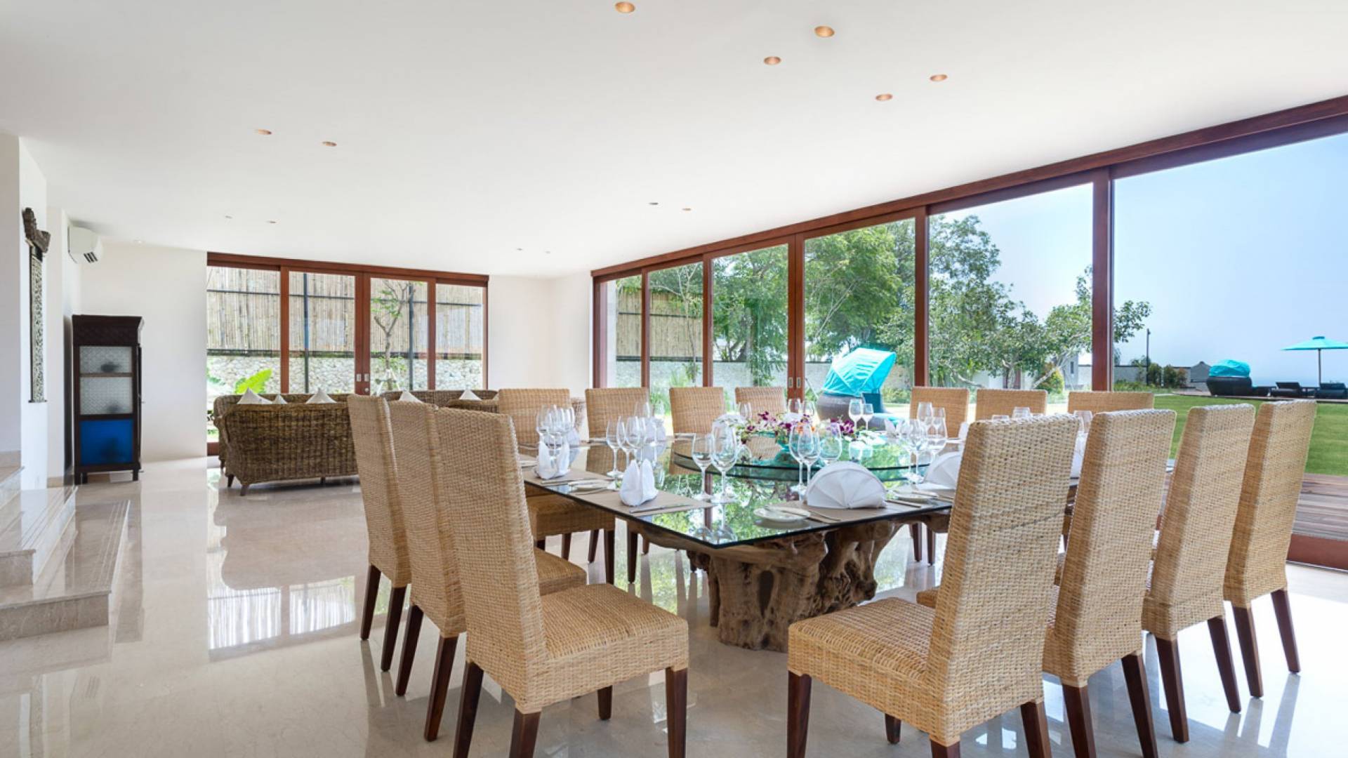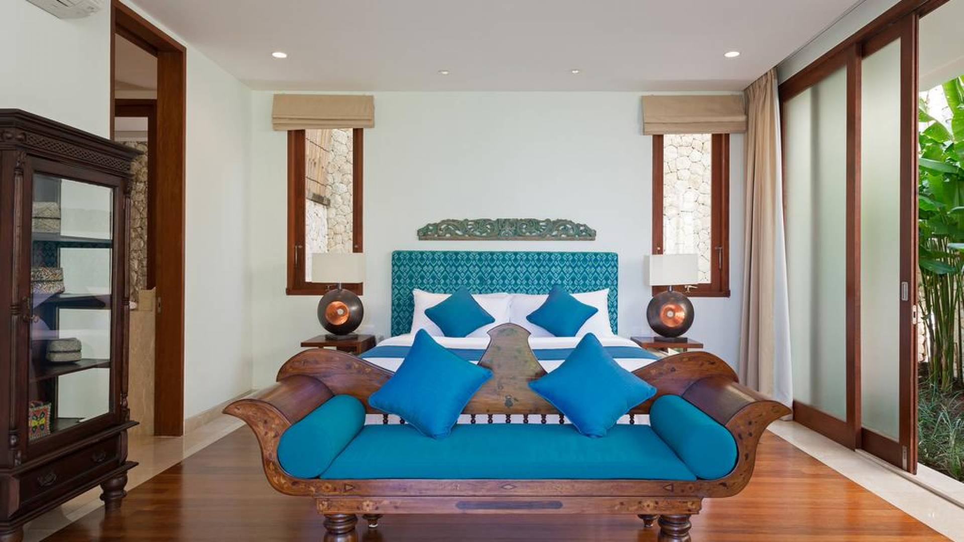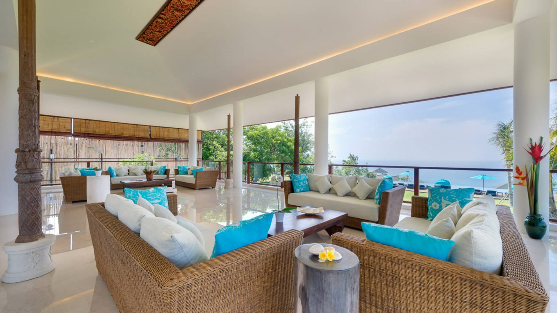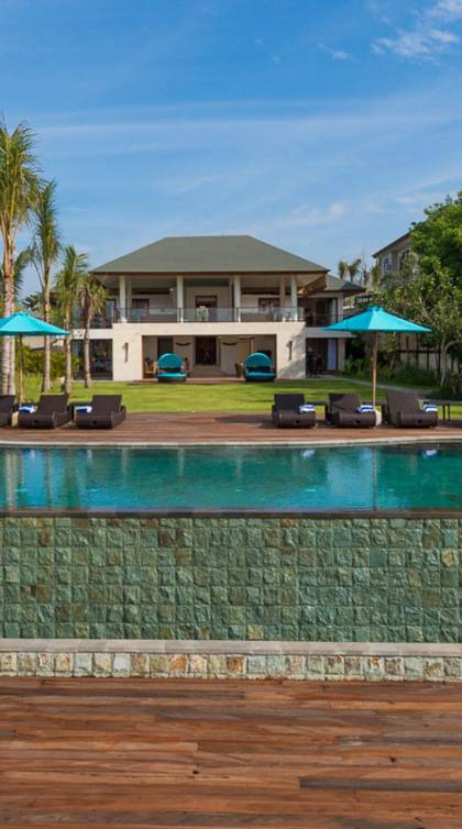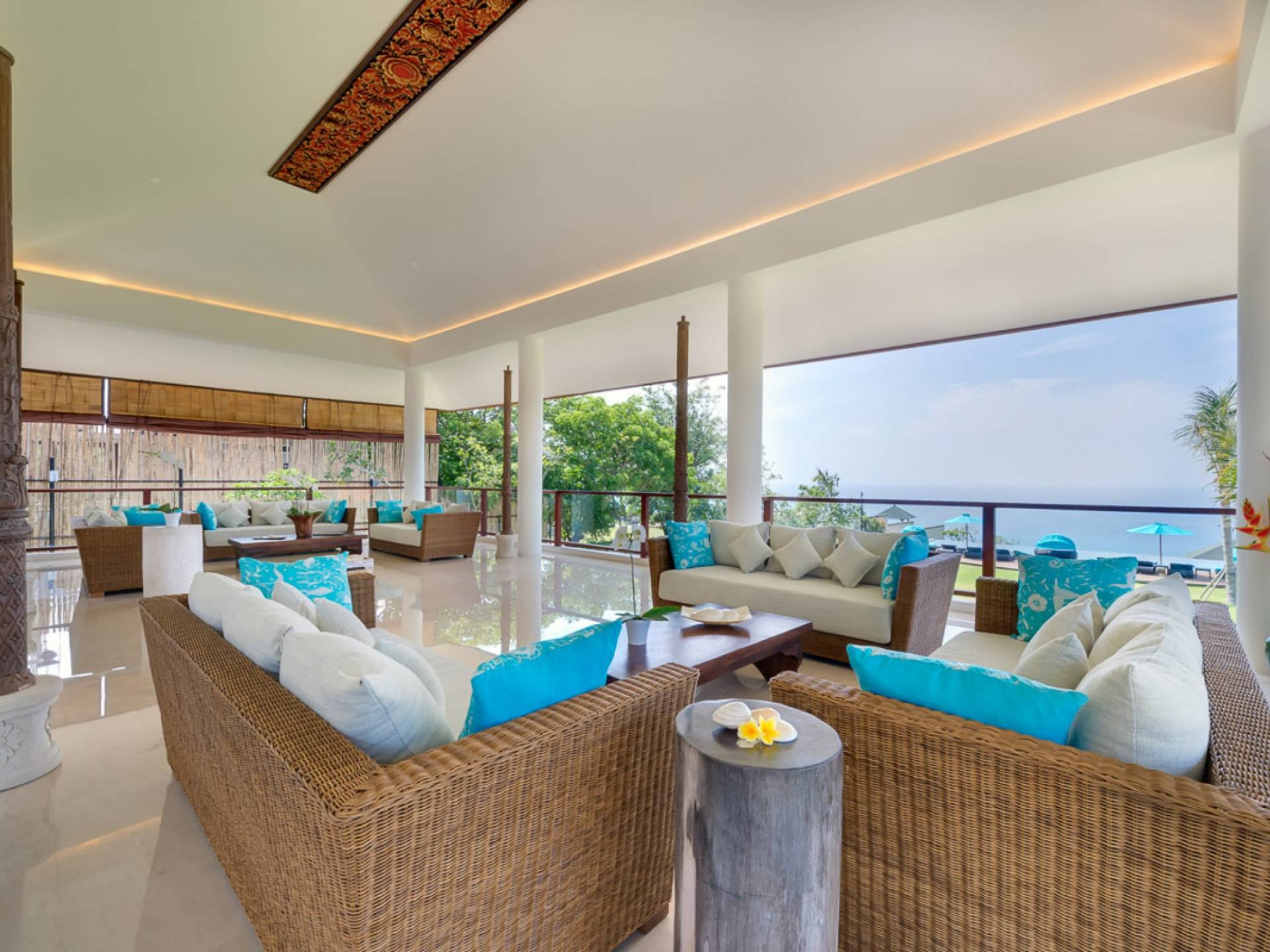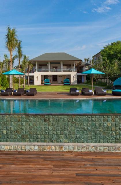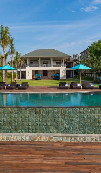 Abgesehen von einer Handvoll anderer Luxusvillen auf den Klippen und den Strandhütten und lokalen Cafés, die weit unten an den weißen Sandstrand von Pandawa Beach grenzen (benannt nach den fünf Kriegerbrüdern des Mahabharata-Epos, deren weiße Steinstatuen geschnitzt sind in Nischen entlang der Straße, die zum Strand hinunterführt), gibt es in dieser unberührten Ecke Balis wenig Entwicklung. Aber trotz seiner ruhigen, ländlichen Umgebung ist das Pandawa Cliff Estate weniger als 30 Autominuten vom internationalen Flughafen Balis entfernt und in der Nähe mehrerer herrlicher Surfstrände, des heiligen Meerestempels von Uluwatu und der vielen Restaurants und Strandbars von Jimbaran und Nusa Dua.