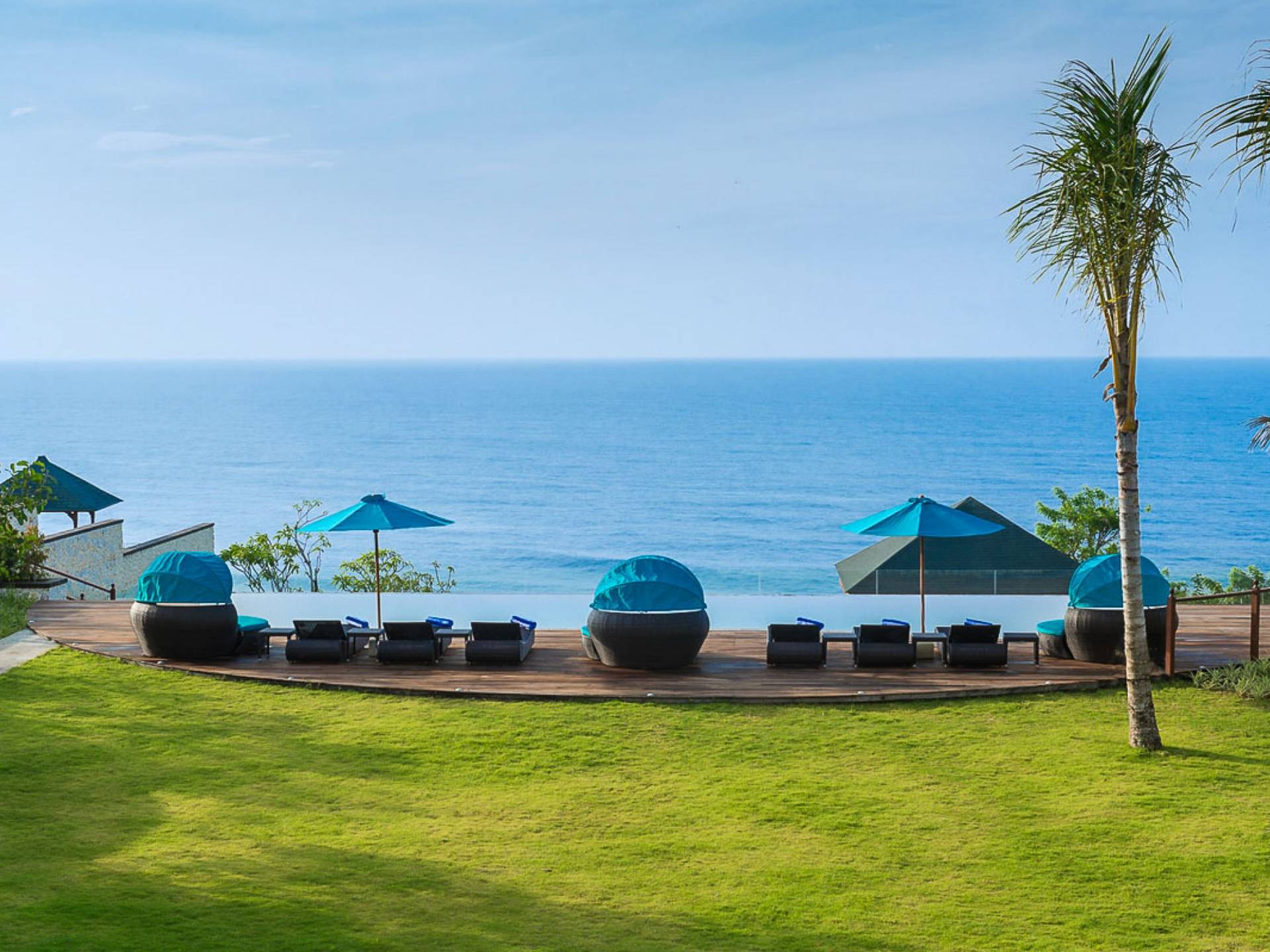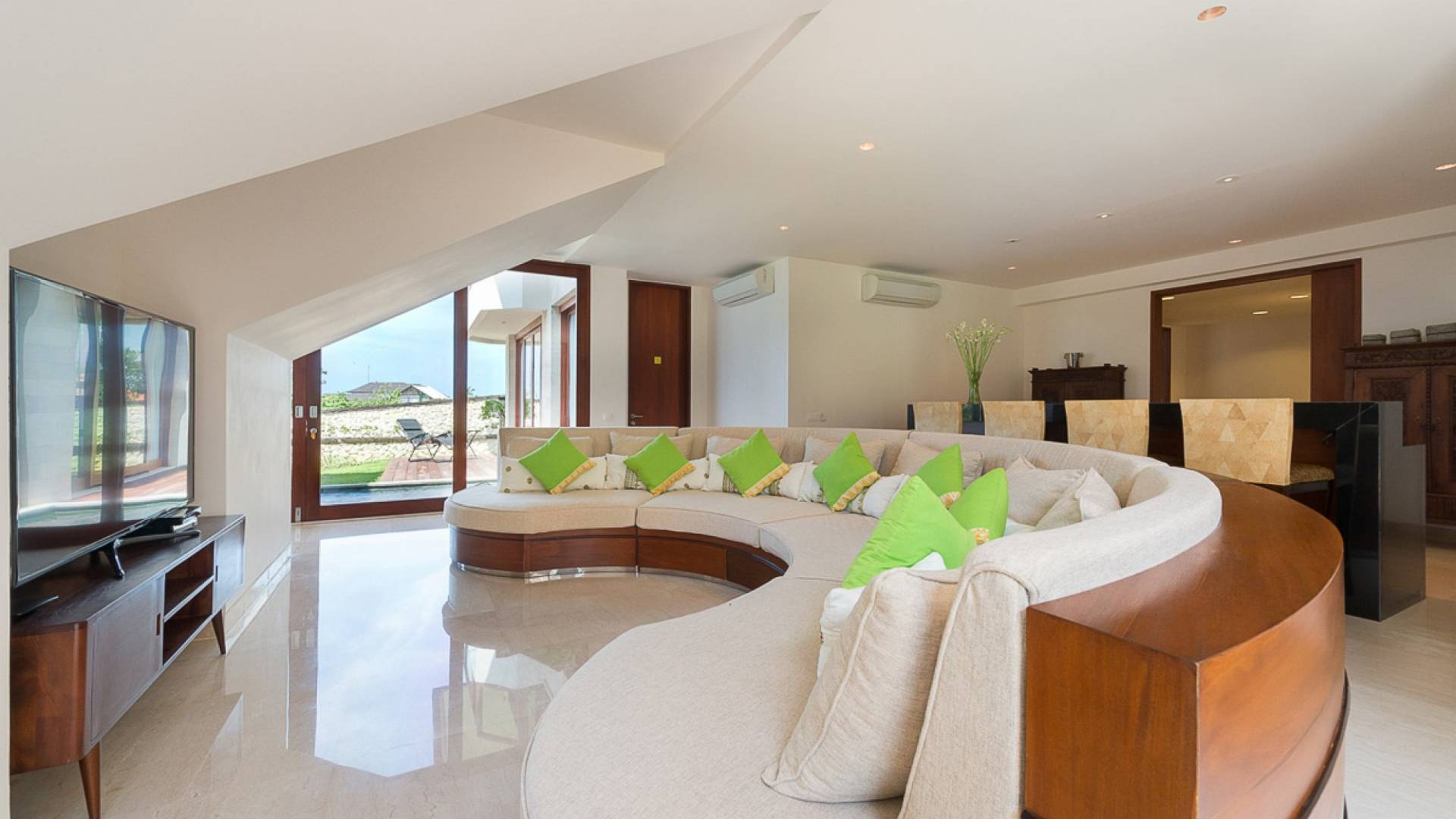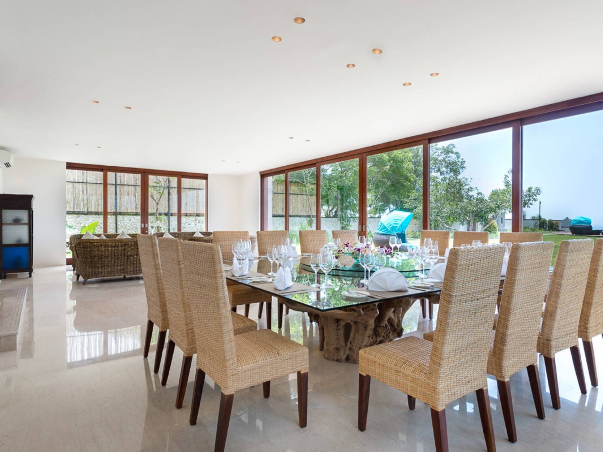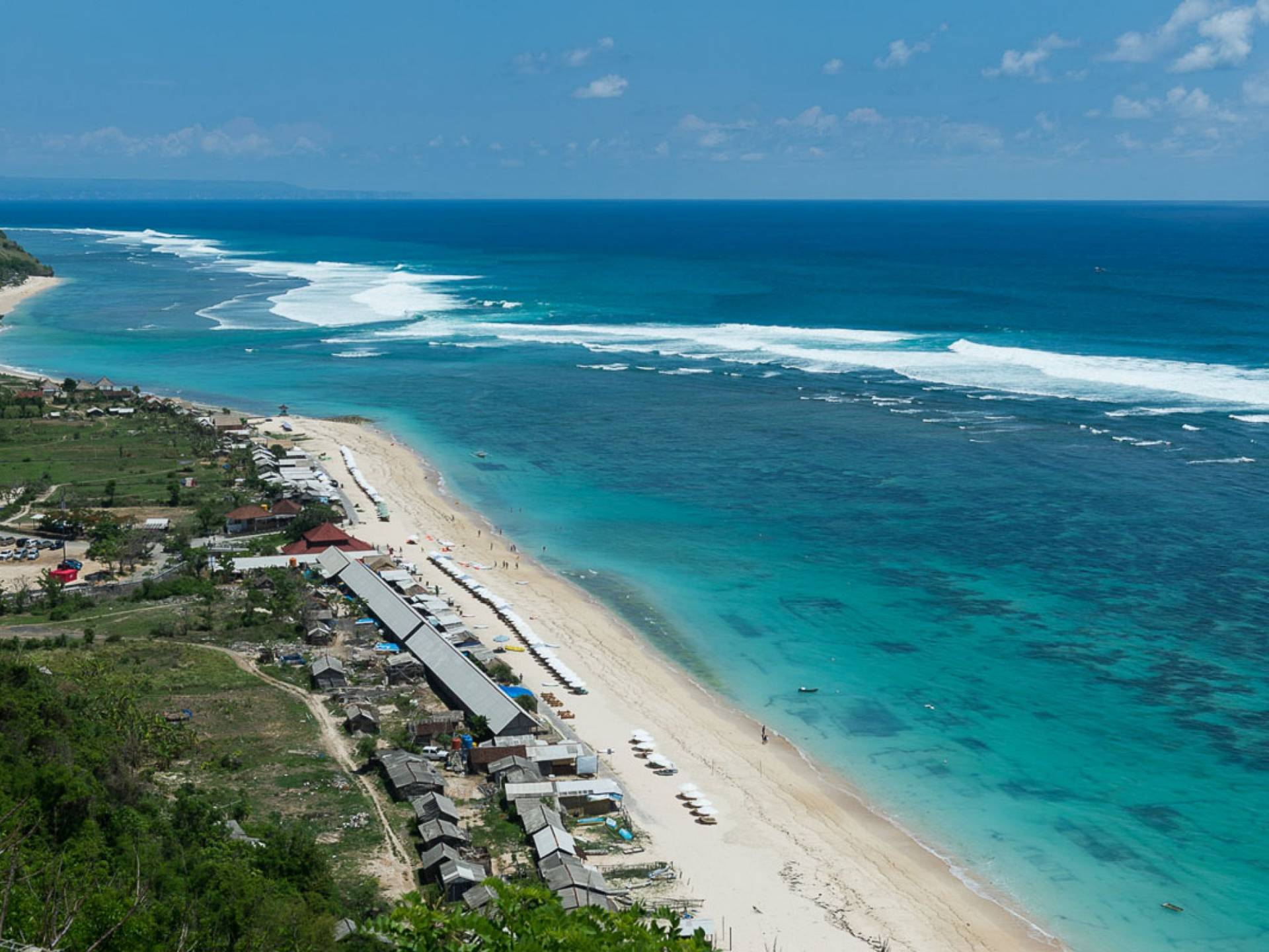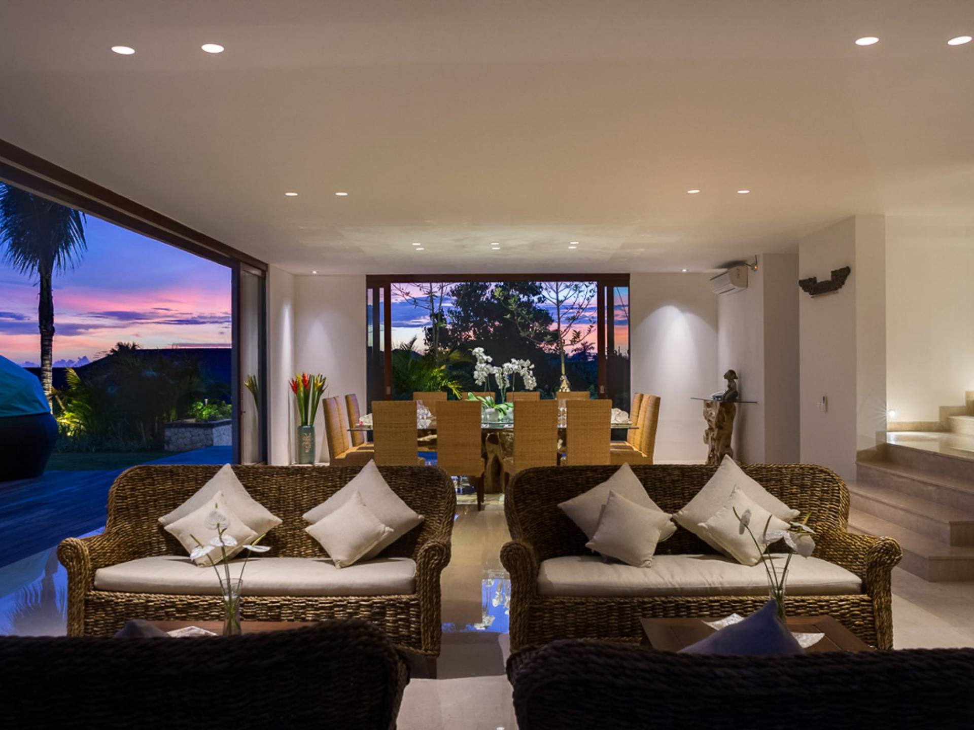 Abgesehen von einer Handvoll anderer Luxusvillen auf den Klippen und den Strandhütten und lokalen Cafés, die weit unten an den weißen Sandstrand von Pandawa Beach grenzen (benannt nach den fünf Kriegerbrüdern des Mahabharata-Epos, deren weiße Steinstatuen geschnitzt sind in Nischen entlang der Straße, die zum Strand hinunterführt), gibt es in dieser unberührten Ecke Balis wenig Entwicklung. Aber trotz seiner ruhigen, ländlichen Umgebung ist das Pandawa Cliff Estate weniger als 30 Autominuten vom internationalen Flughafen Balis entfernt und in der Nähe mehrerer herrlicher Surfstrände, des heiligen Meerestempels von Uluwatu und der vielen Restaurants und Strandbars von Jimbaran und Nusa Dua.