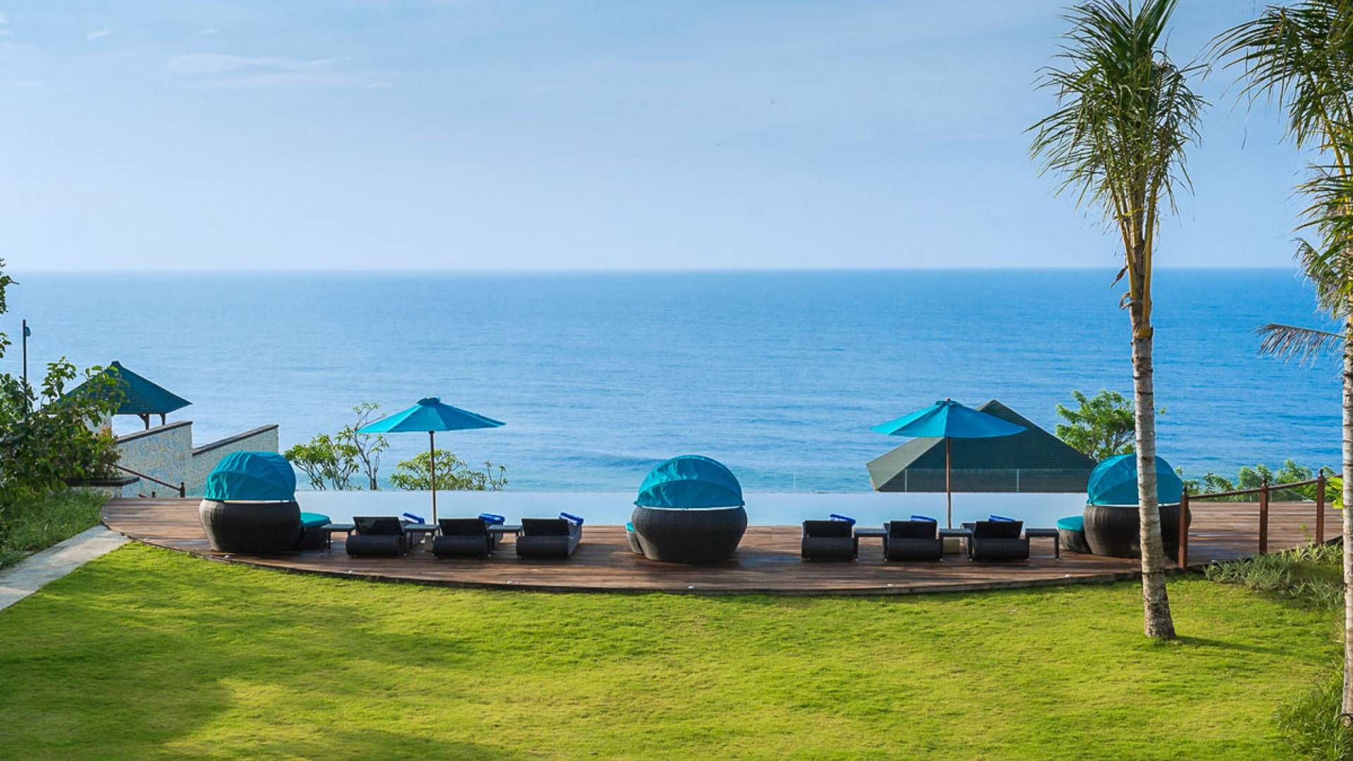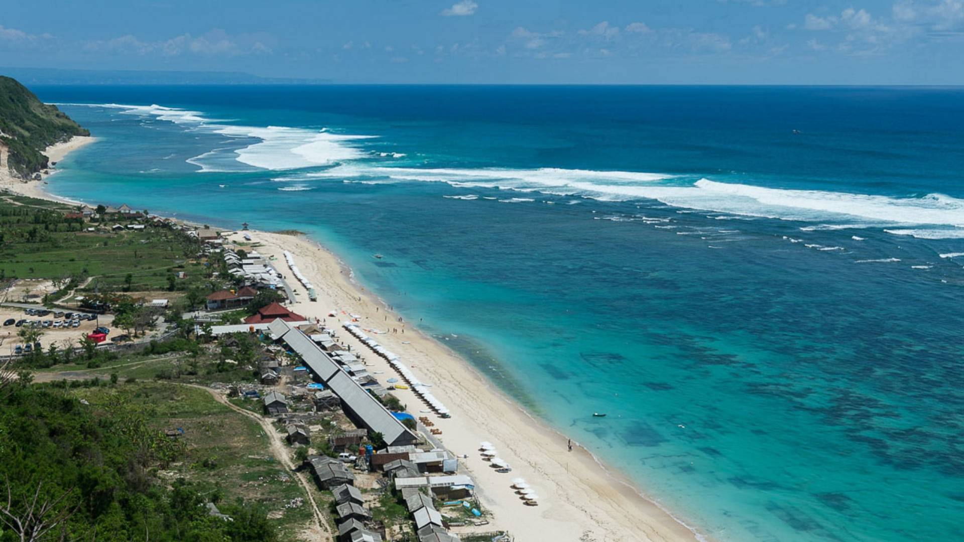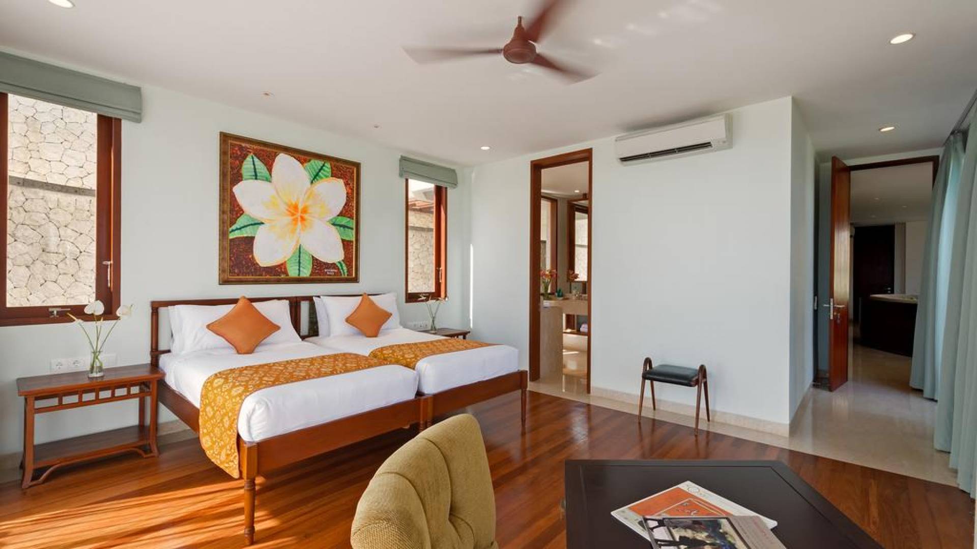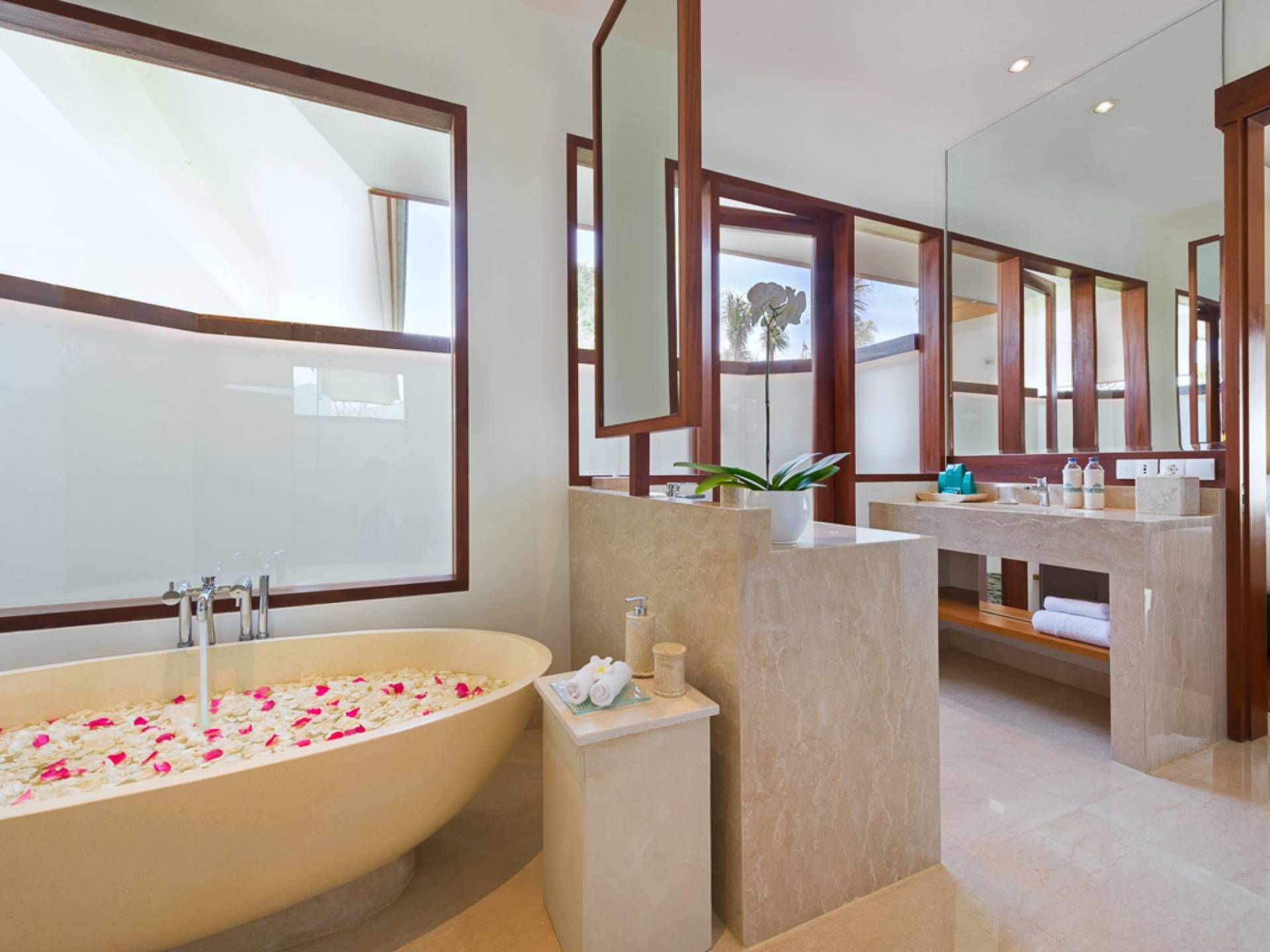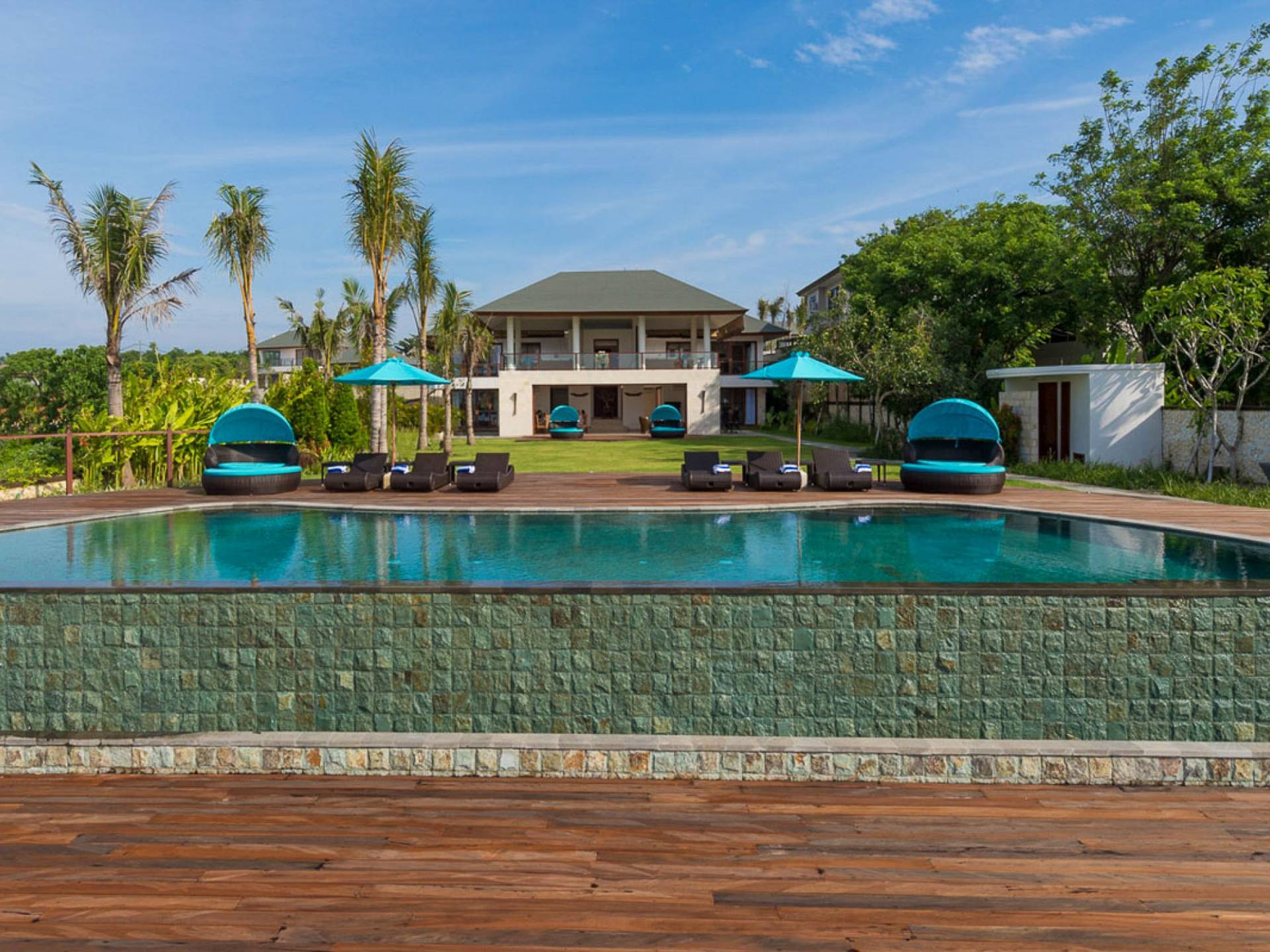 Abgesehen von einer Handvoll anderer Luxusvillen auf den Klippen und den Strandhütten und lokalen Cafés, die weit unten an den weißen Sandstrand von Pandawa Beach grenzen (benannt nach den fünf Kriegerbrüdern des Mahabharata-Epos, deren weiße Steinstatuen geschnitzt sind in Nischen entlang der Straße, die zum Strand hinunterführt), gibt es in dieser unberührten Ecke Balis wenig Entwicklung. Aber trotz seiner ruhigen, ländlichen Umgebung ist das Pandawa Cliff Estate weniger als 30 Autominuten vom internationalen Flughafen Balis entfernt und in der Nähe mehrerer herrlicher Surfstrände, des heiligen Meerestempels von Uluwatu und der vielen Restaurants und Strandbars von Jimbaran und Nusa Dua.