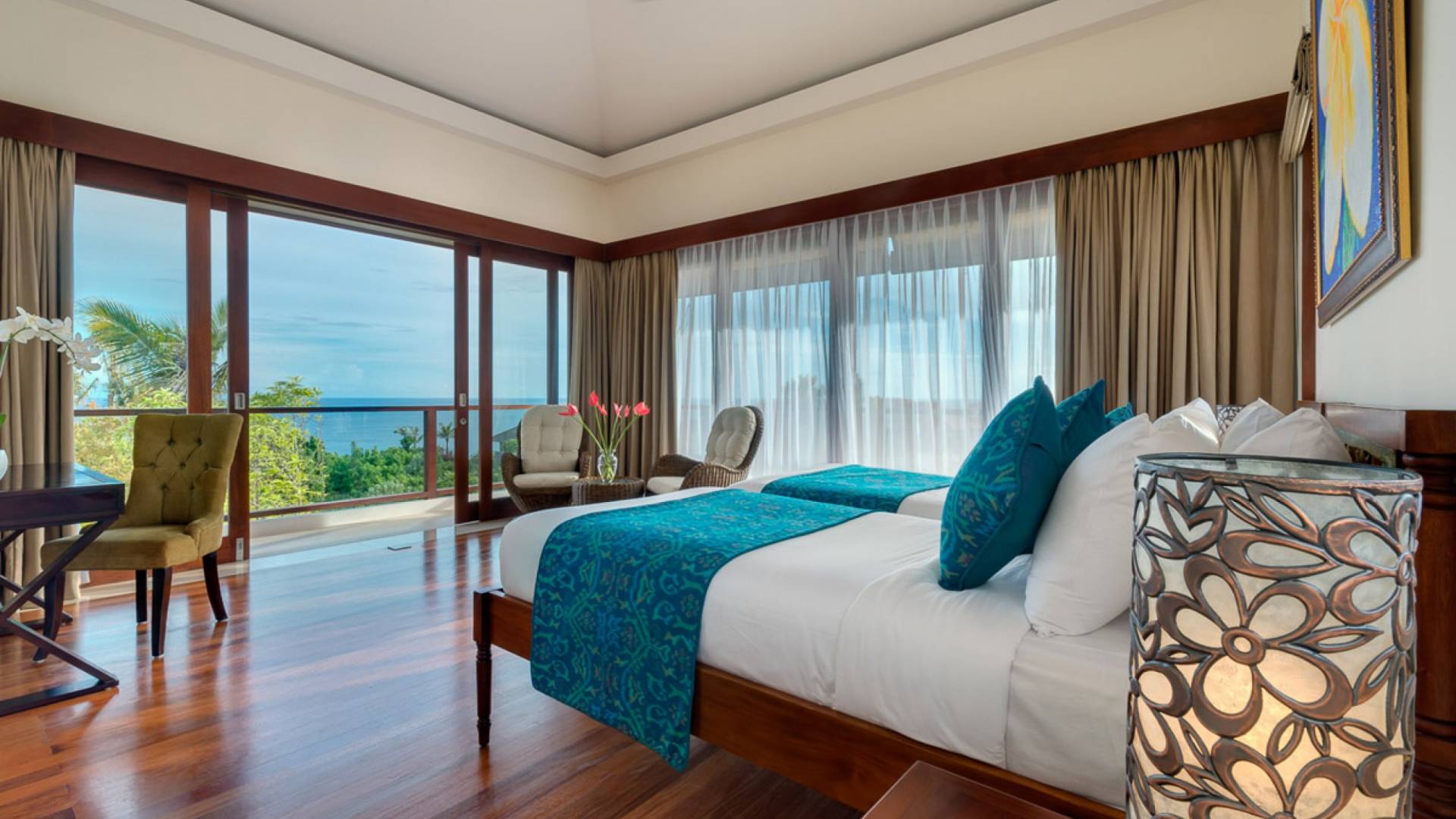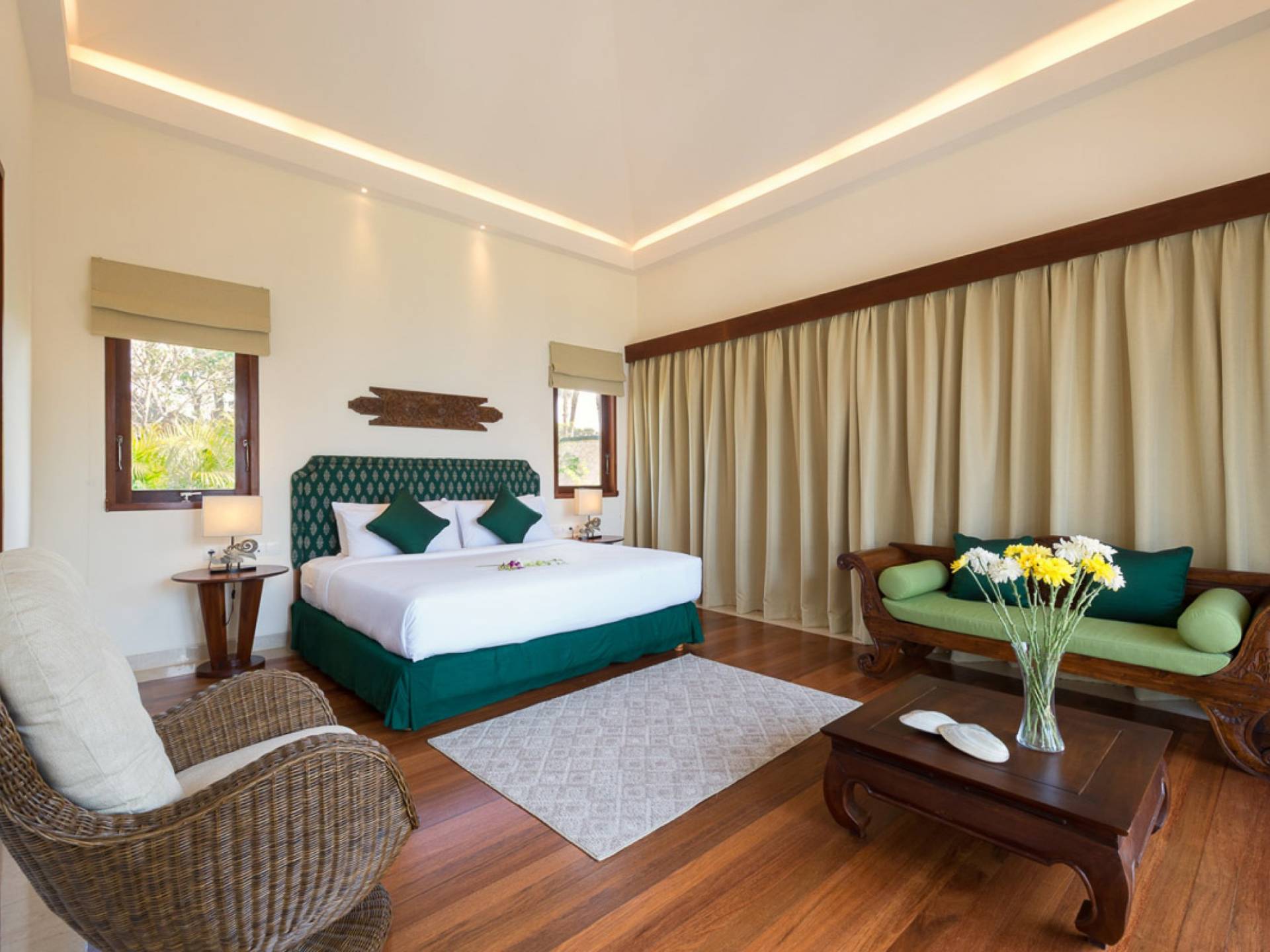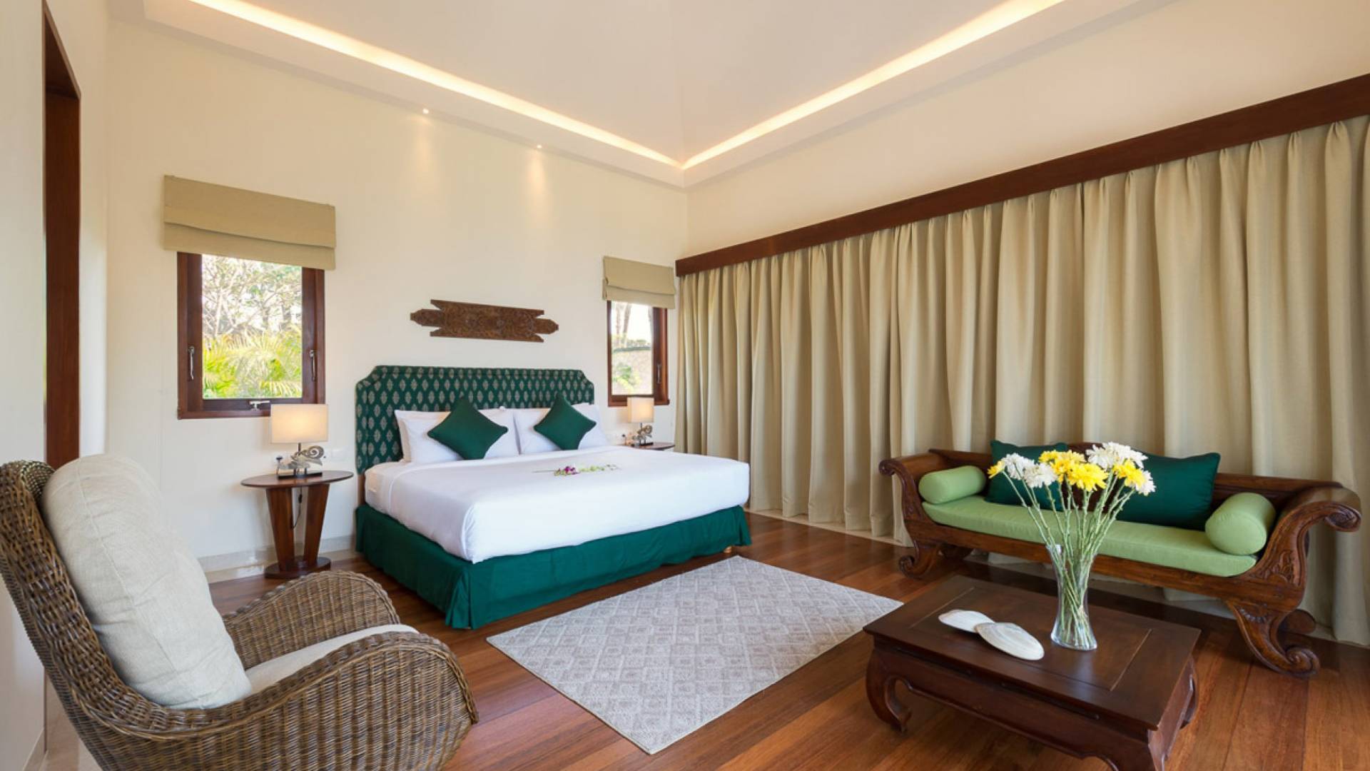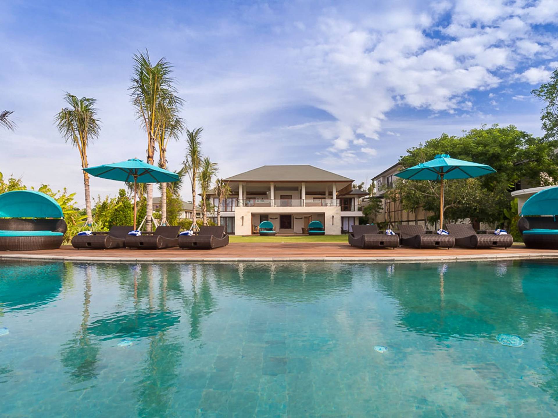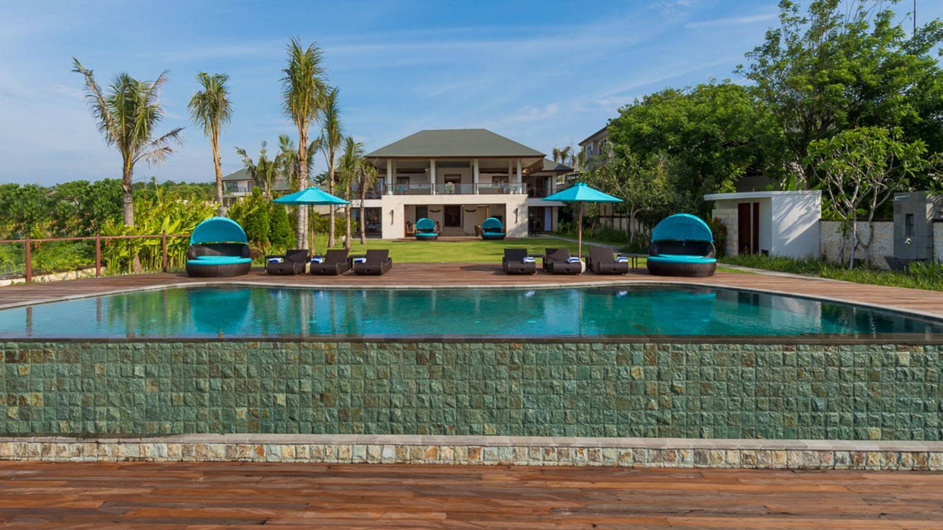 Abgesehen von einer Handvoll anderer Luxusvillen auf den Klippen und den Strandhütten und lokalen Cafés, die weit unten an den weißen Sandstrand von Pandawa Beach grenzen (benannt nach den fünf Kriegerbrüdern des Mahabharata-Epos, deren weiße Steinstatuen geschnitzt sind in Nischen entlang der Straße, die zum Strand hinunterführt), gibt es in dieser unberührten Ecke Balis wenig Entwicklung. Aber trotz seiner ruhigen, ländlichen Umgebung ist das Pandawa Cliff Estate weniger als 30 Autominuten vom internationalen Flughafen Balis entfernt und in der Nähe mehrerer herrlicher Surfstrände, des heiligen Meerestempels von Uluwatu und der vielen Restaurants und Strandbars von Jimbaran und Nusa Dua.